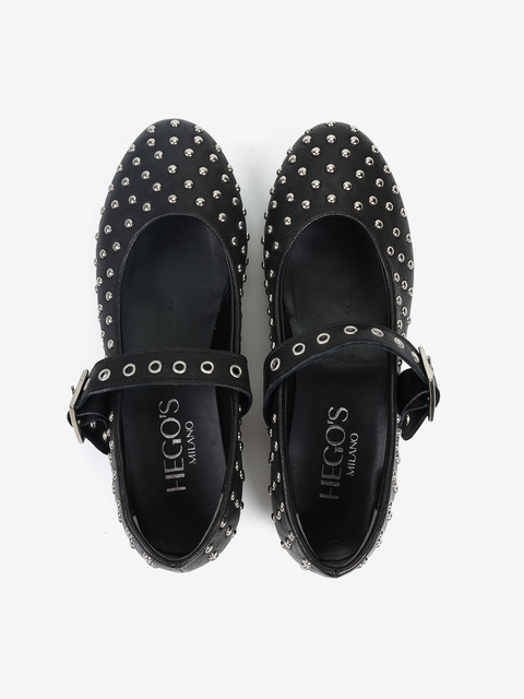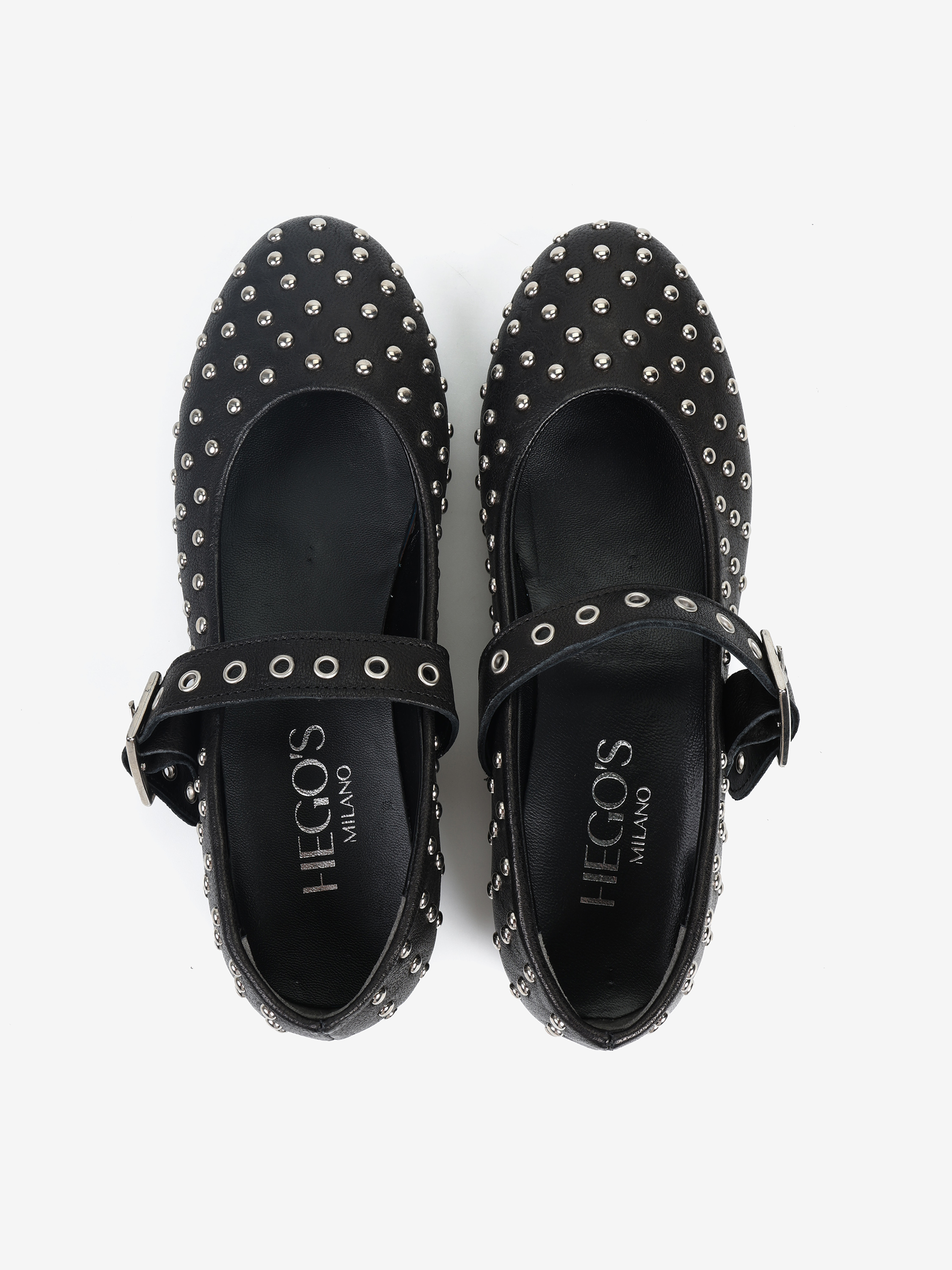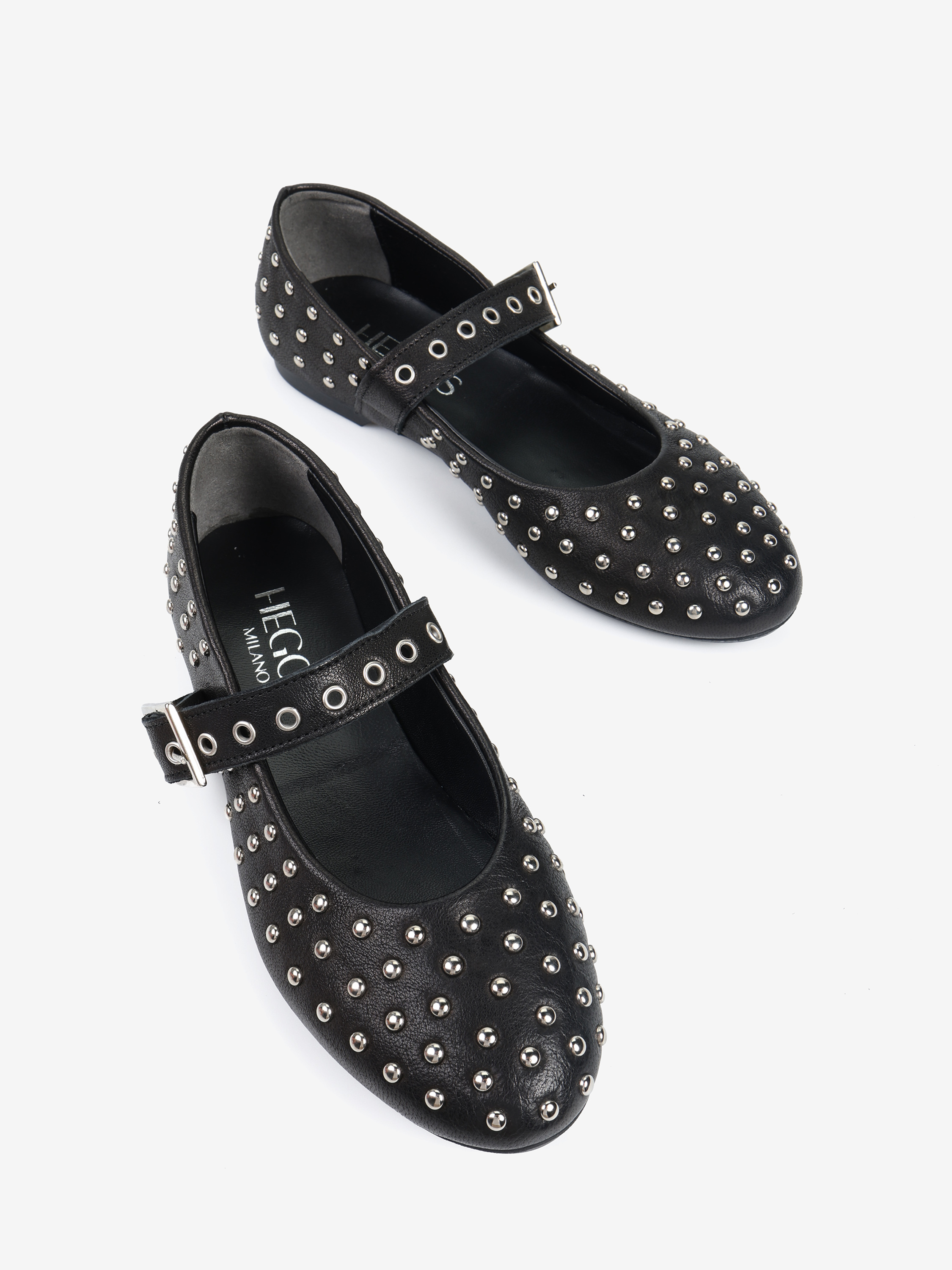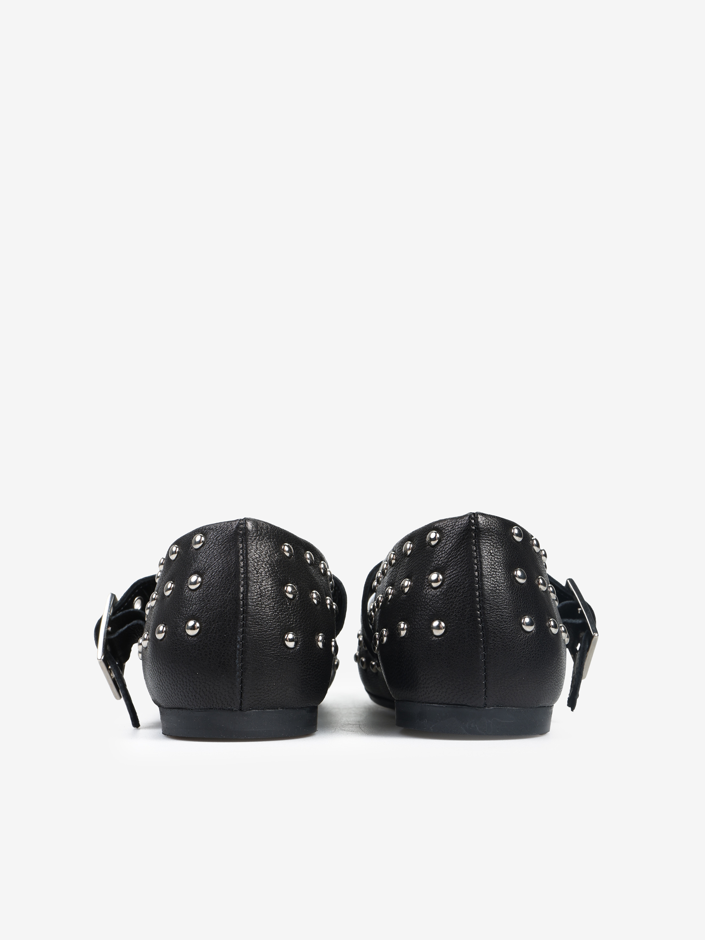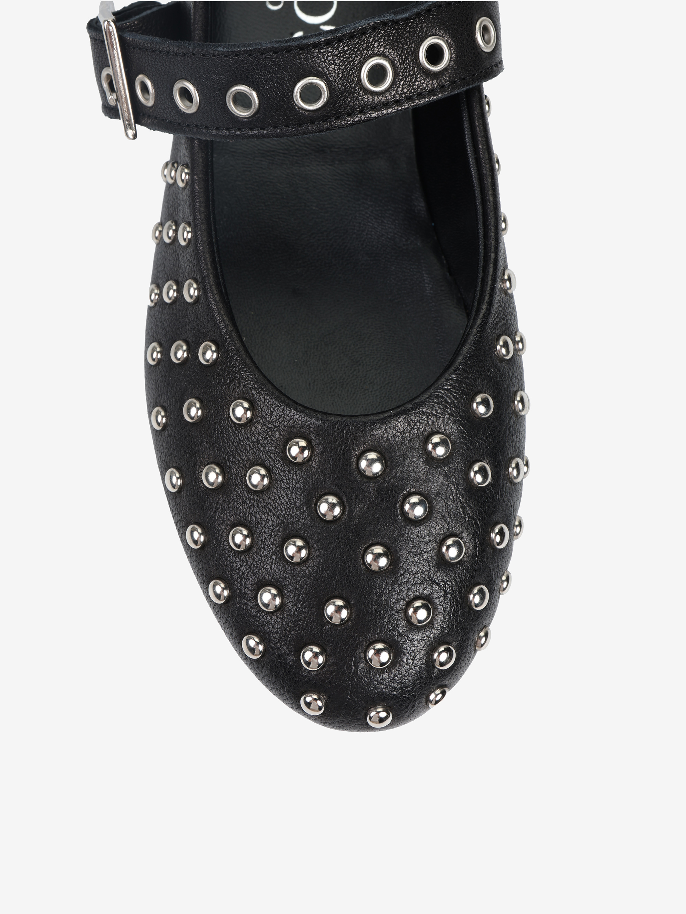 Skórzane baleriny Mary Jane z ozdobnymi ćwiekami. Regulowany pasek.