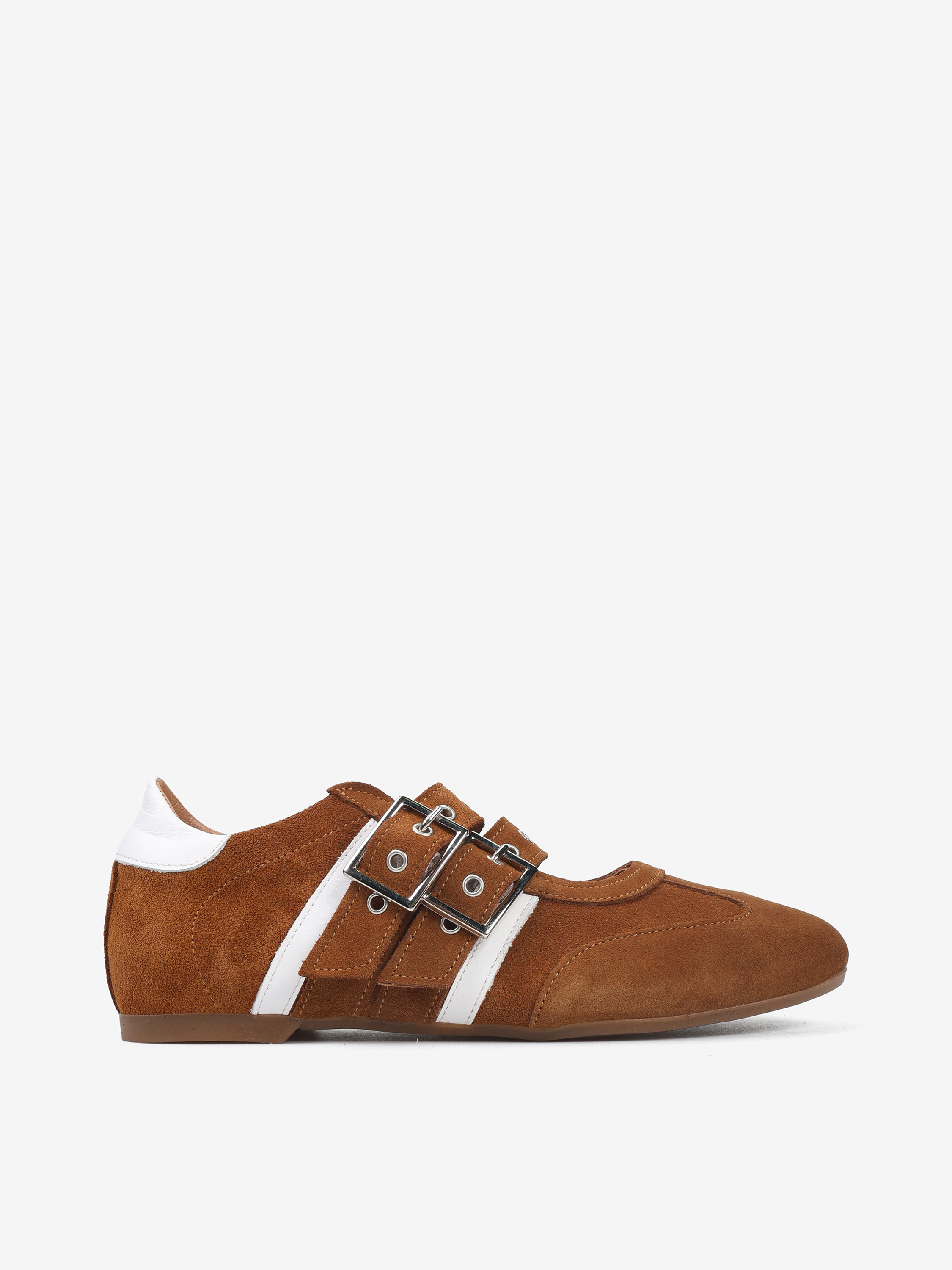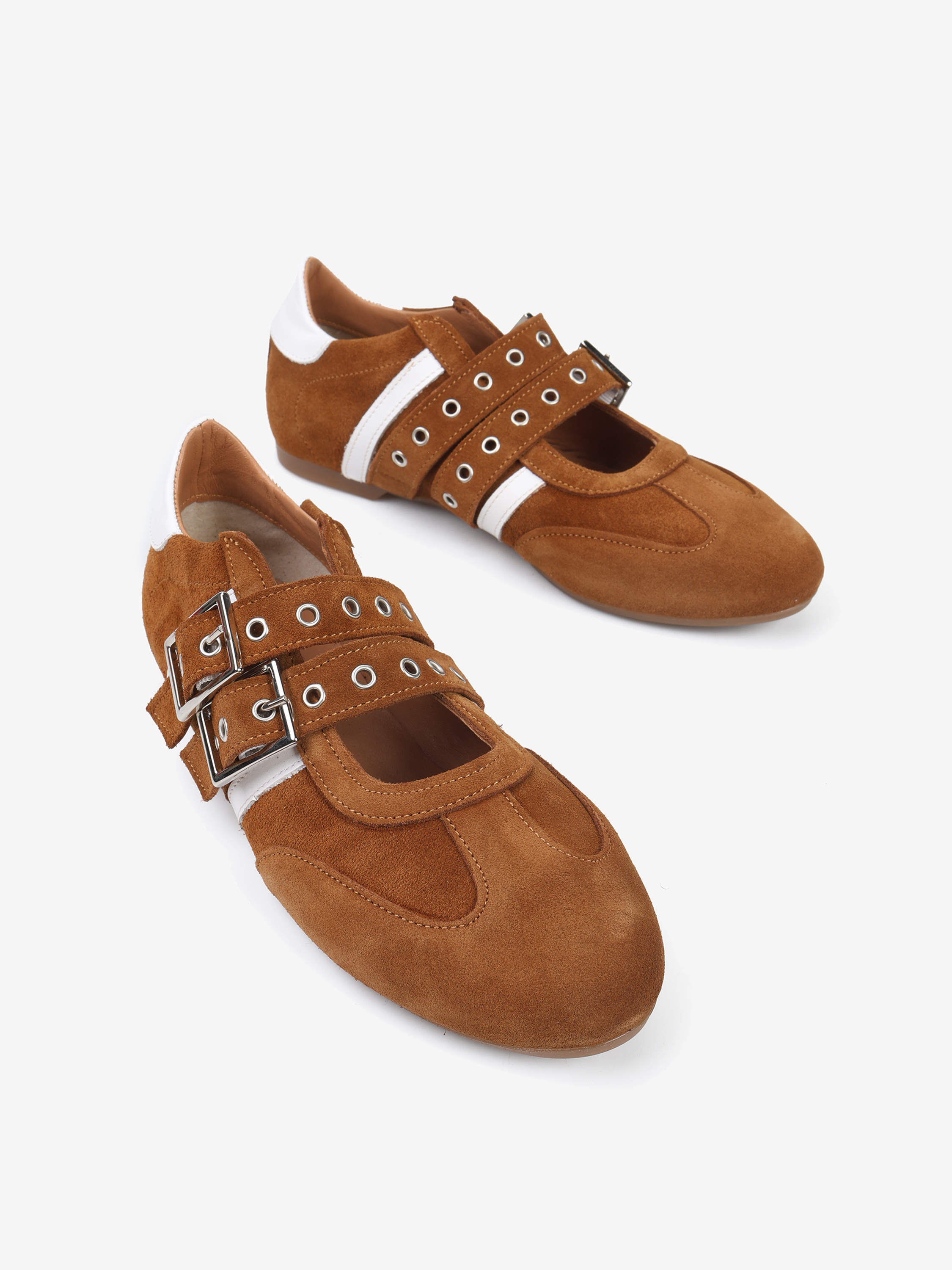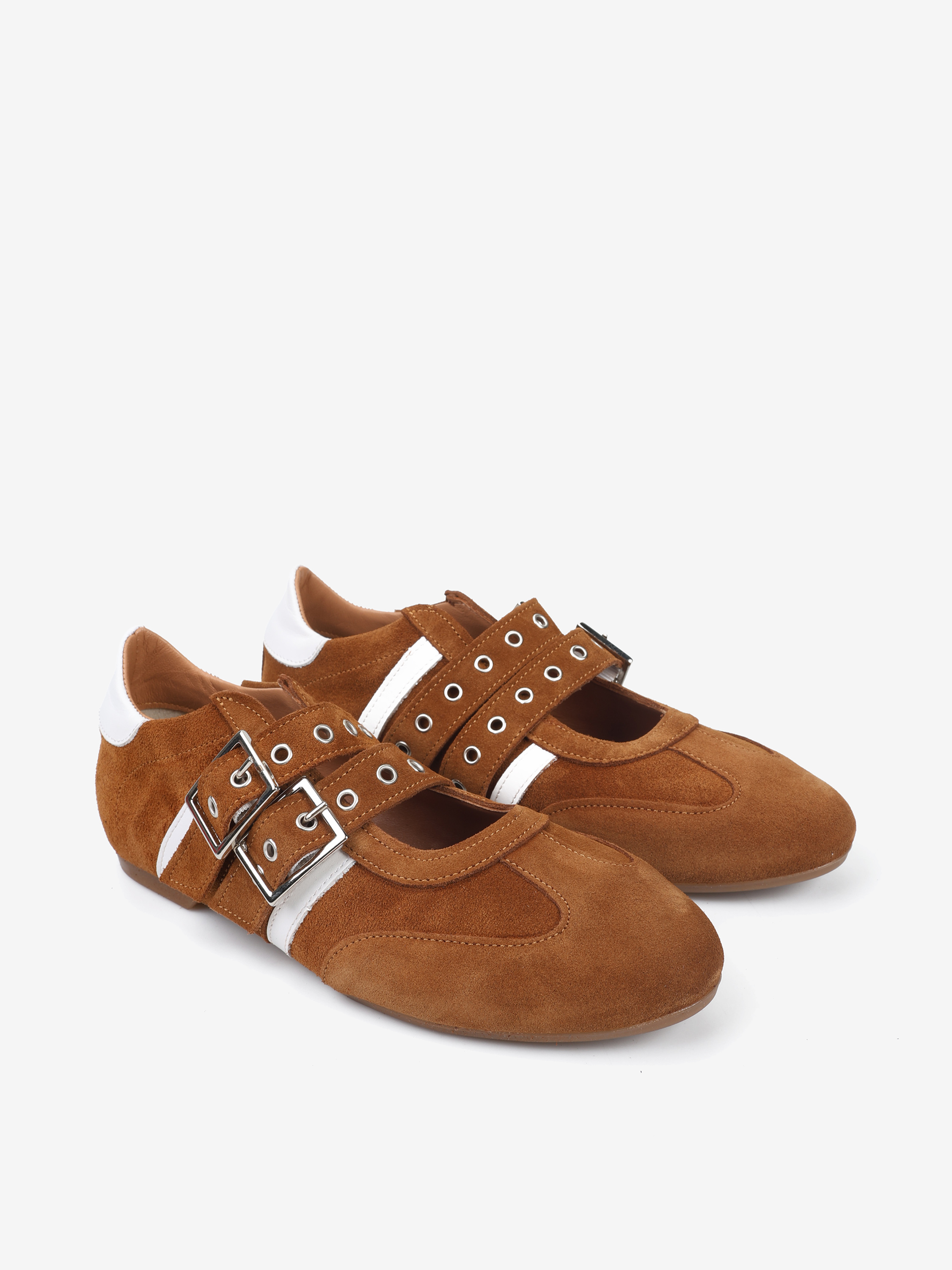 Zamszowe sneakersy z głębokim wycięciem i dwoma regulowanymi paskami. Białe przeszycia ze skóry licowej