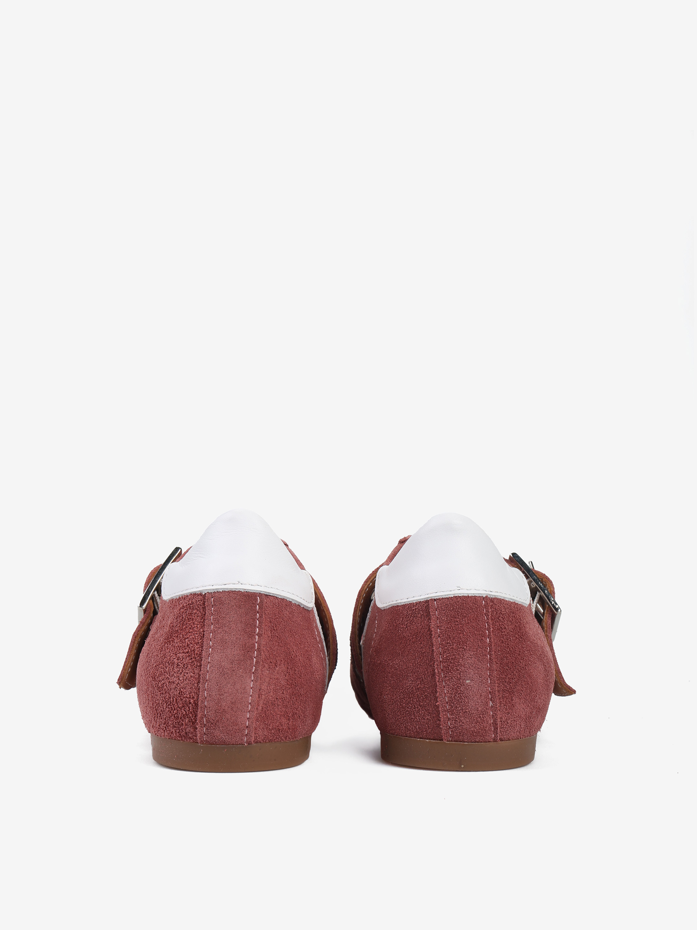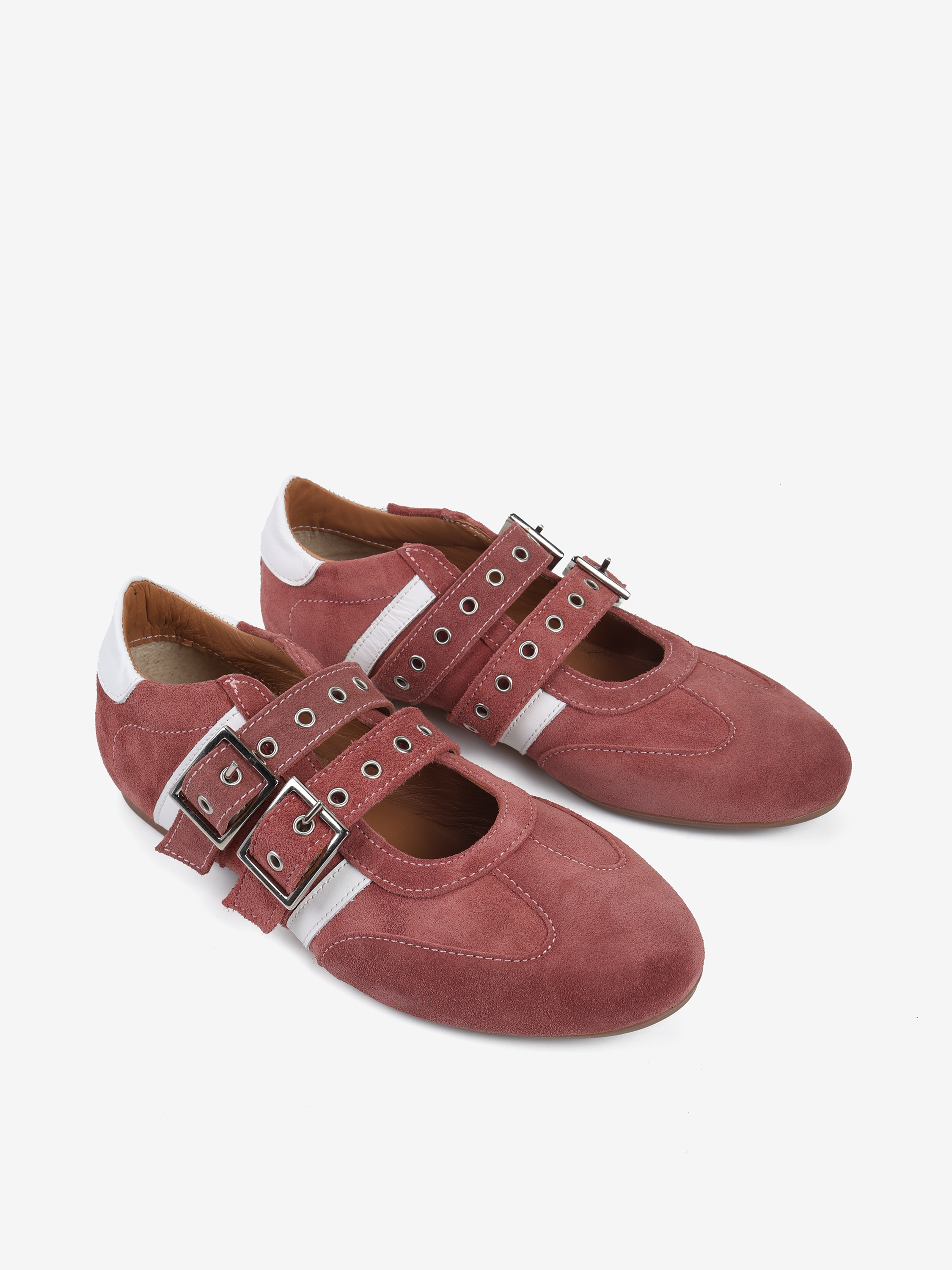 Zamszowe sneakersy z głębokim wycięciem i dwoma regulowanymi paskami. Białe przeszycia ze skóry licowej.