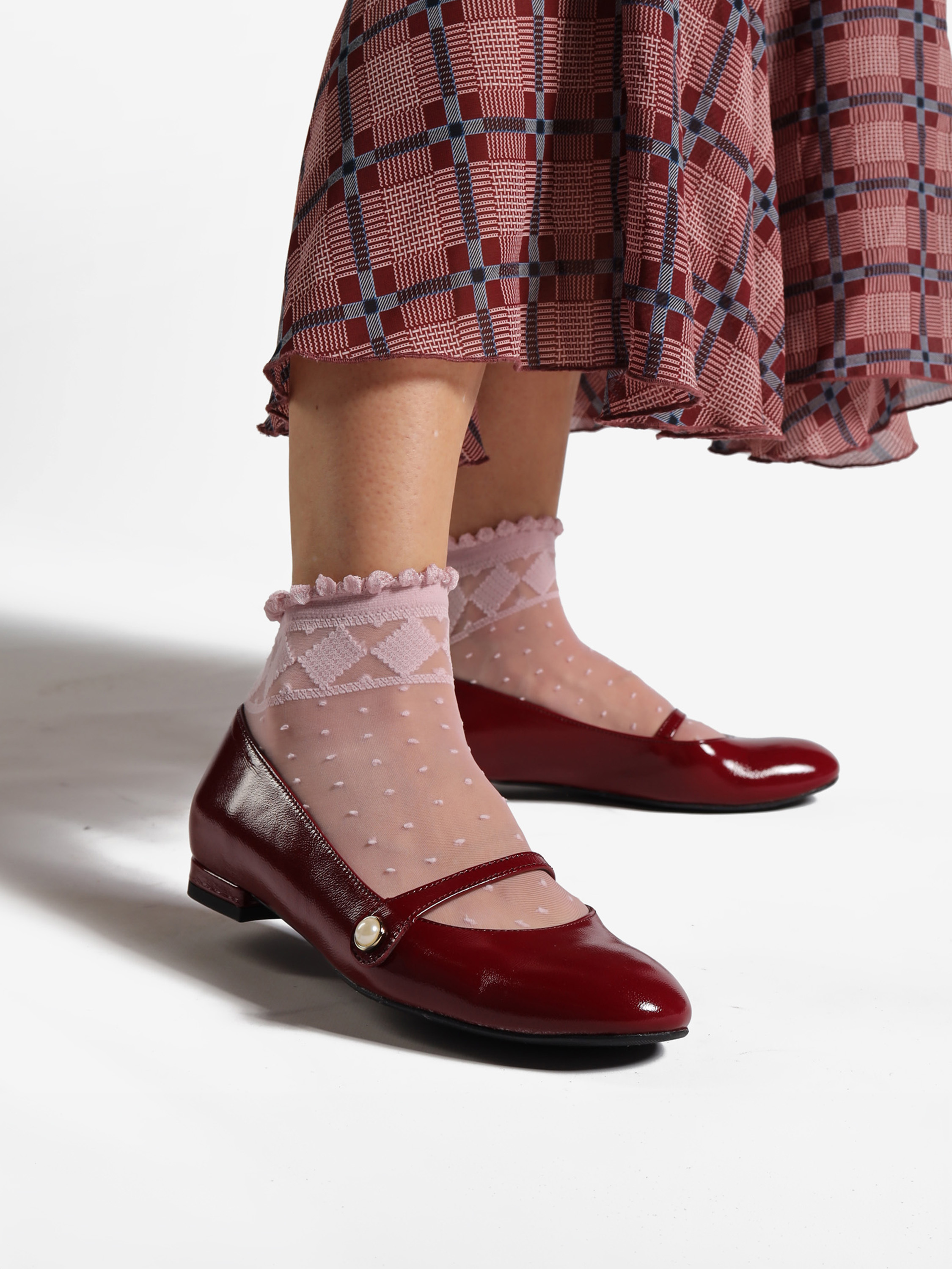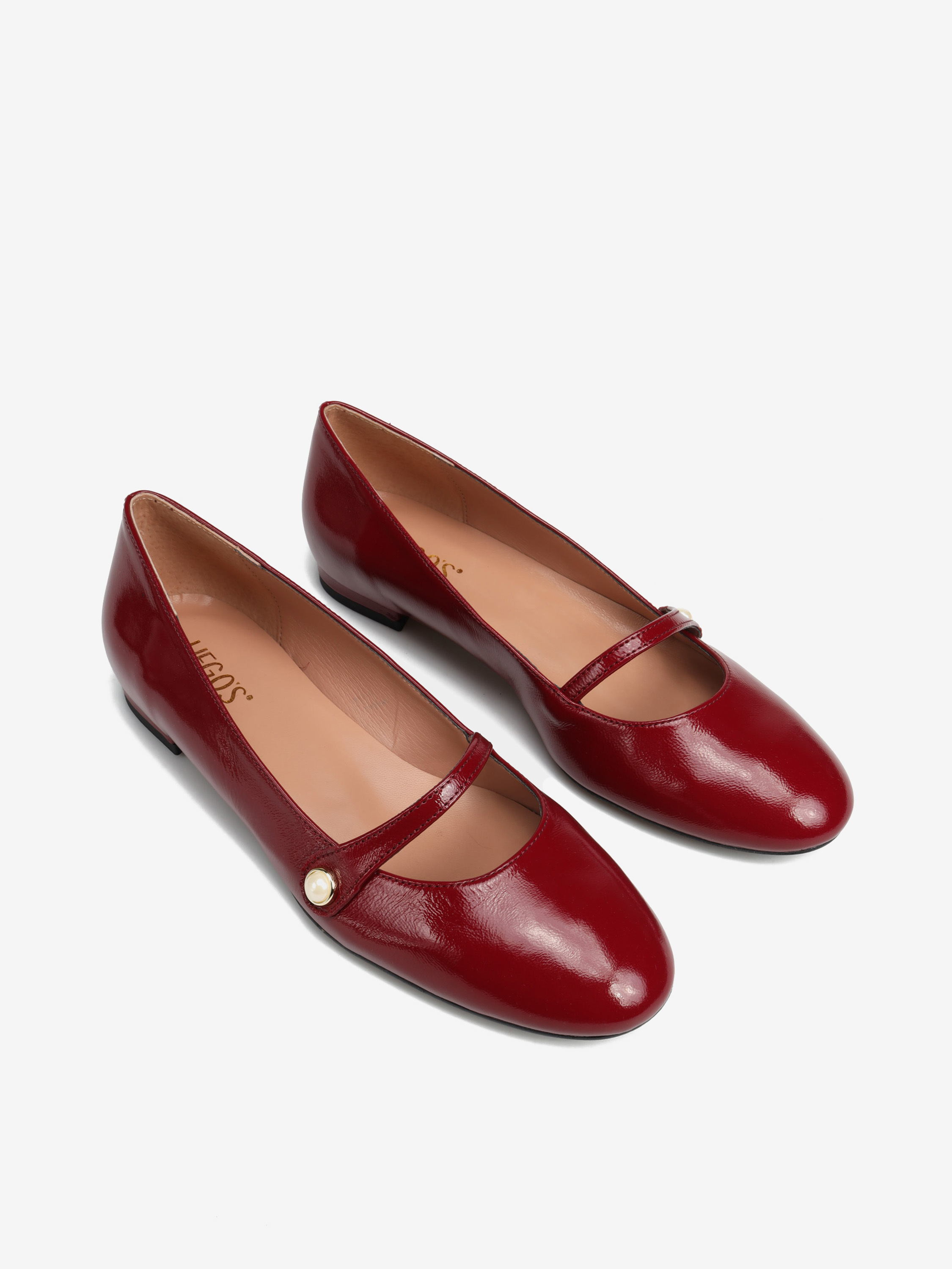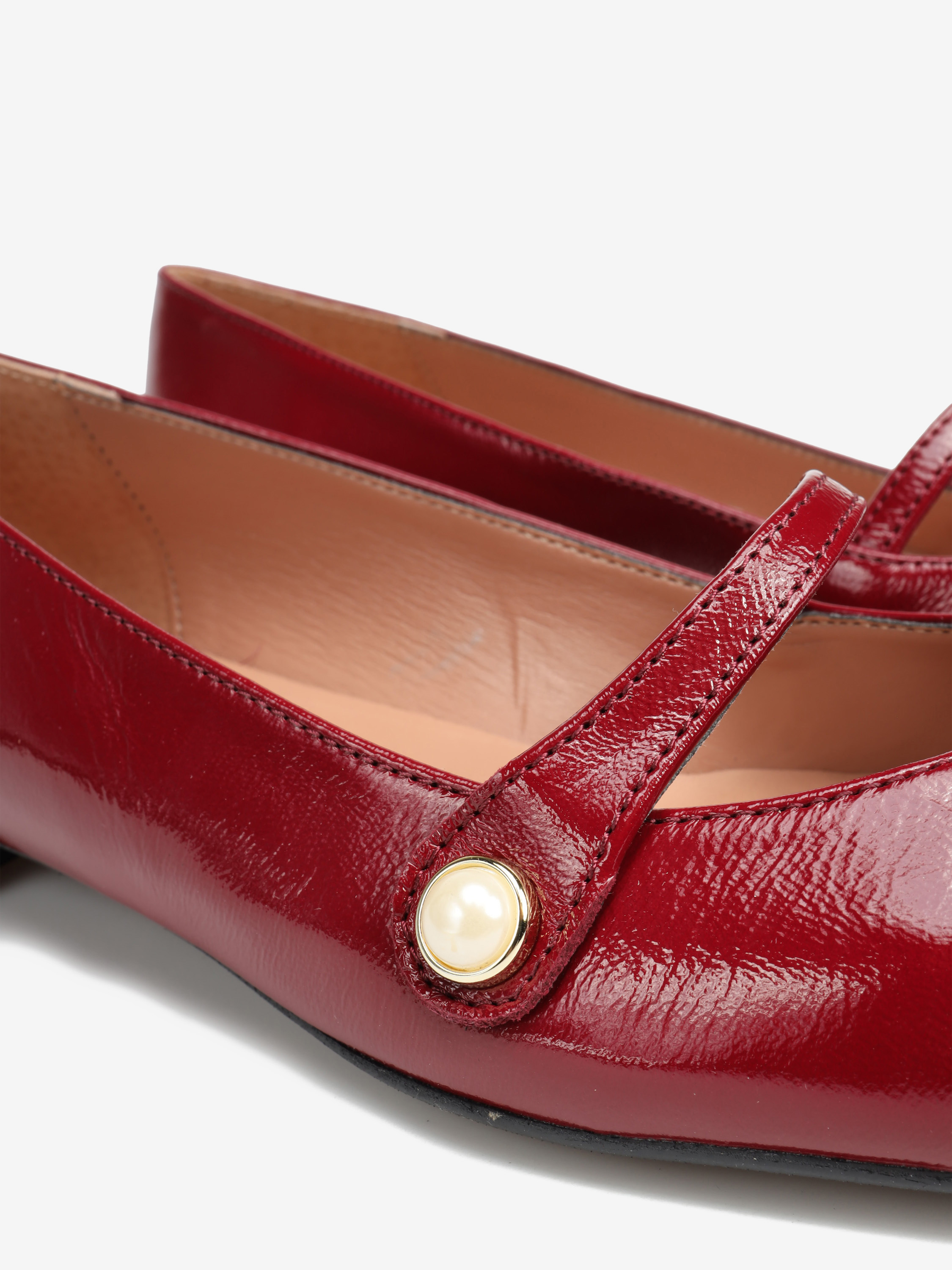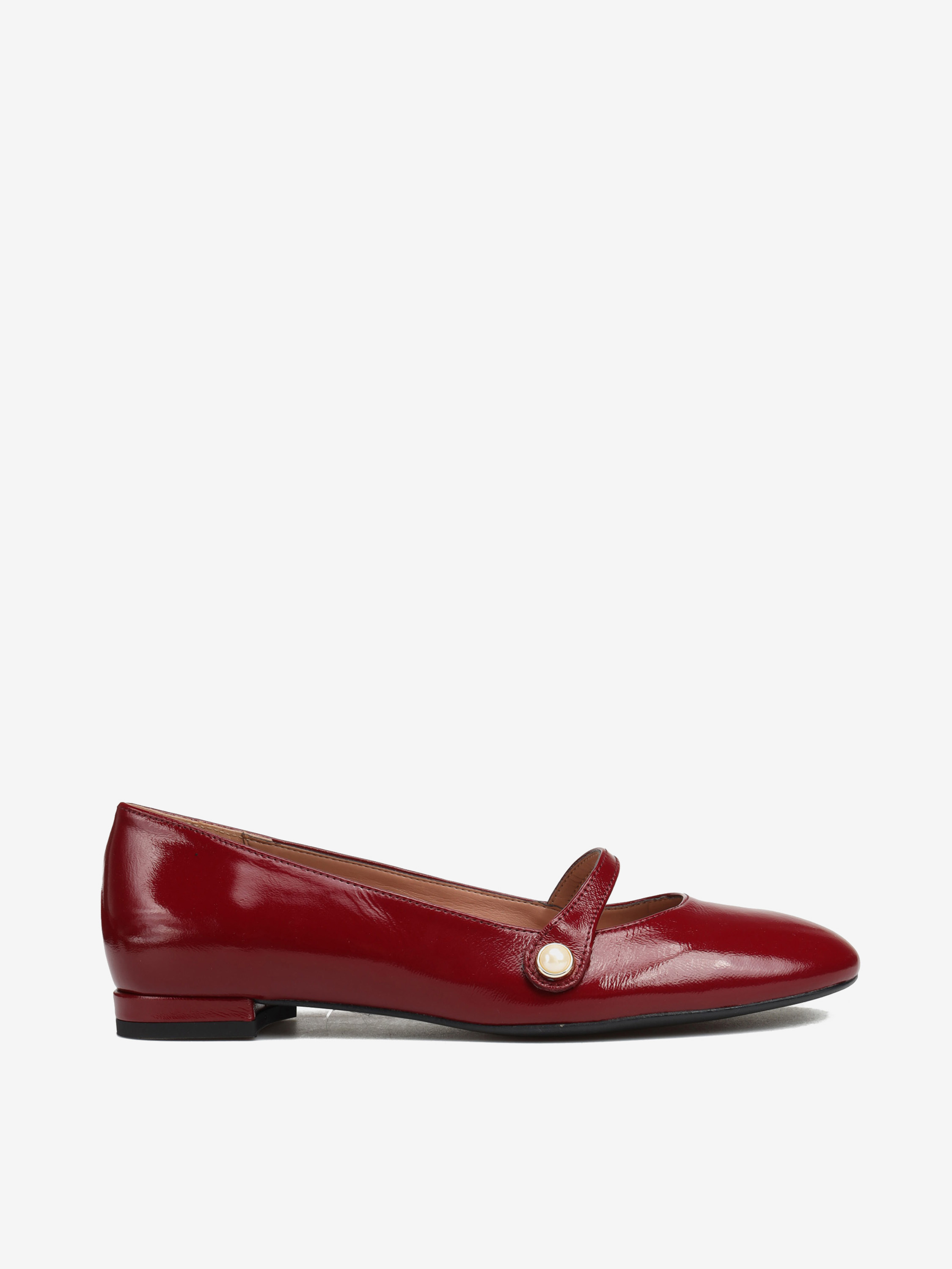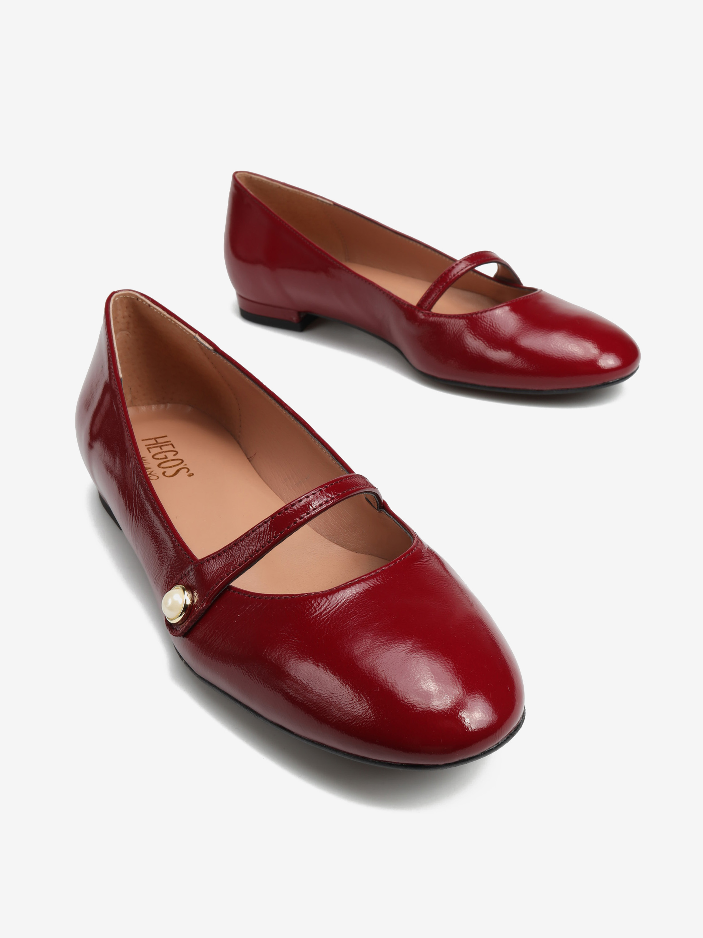 Baleriny wykonane ze skóry lakierowanej w kolorze rubinowym.