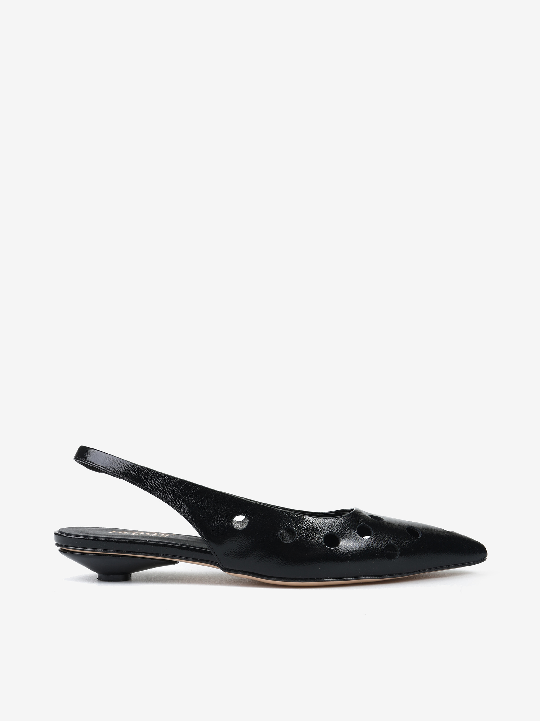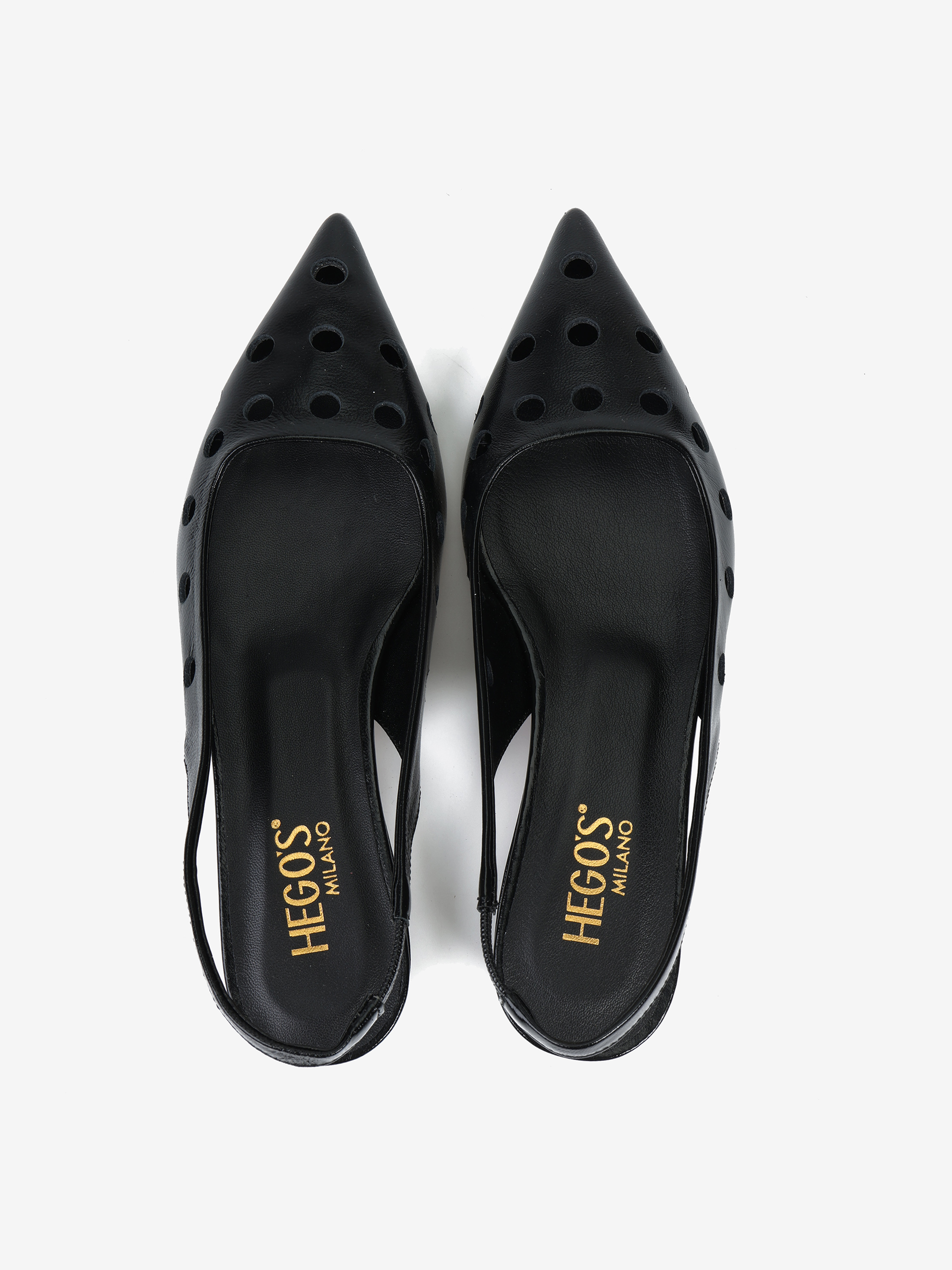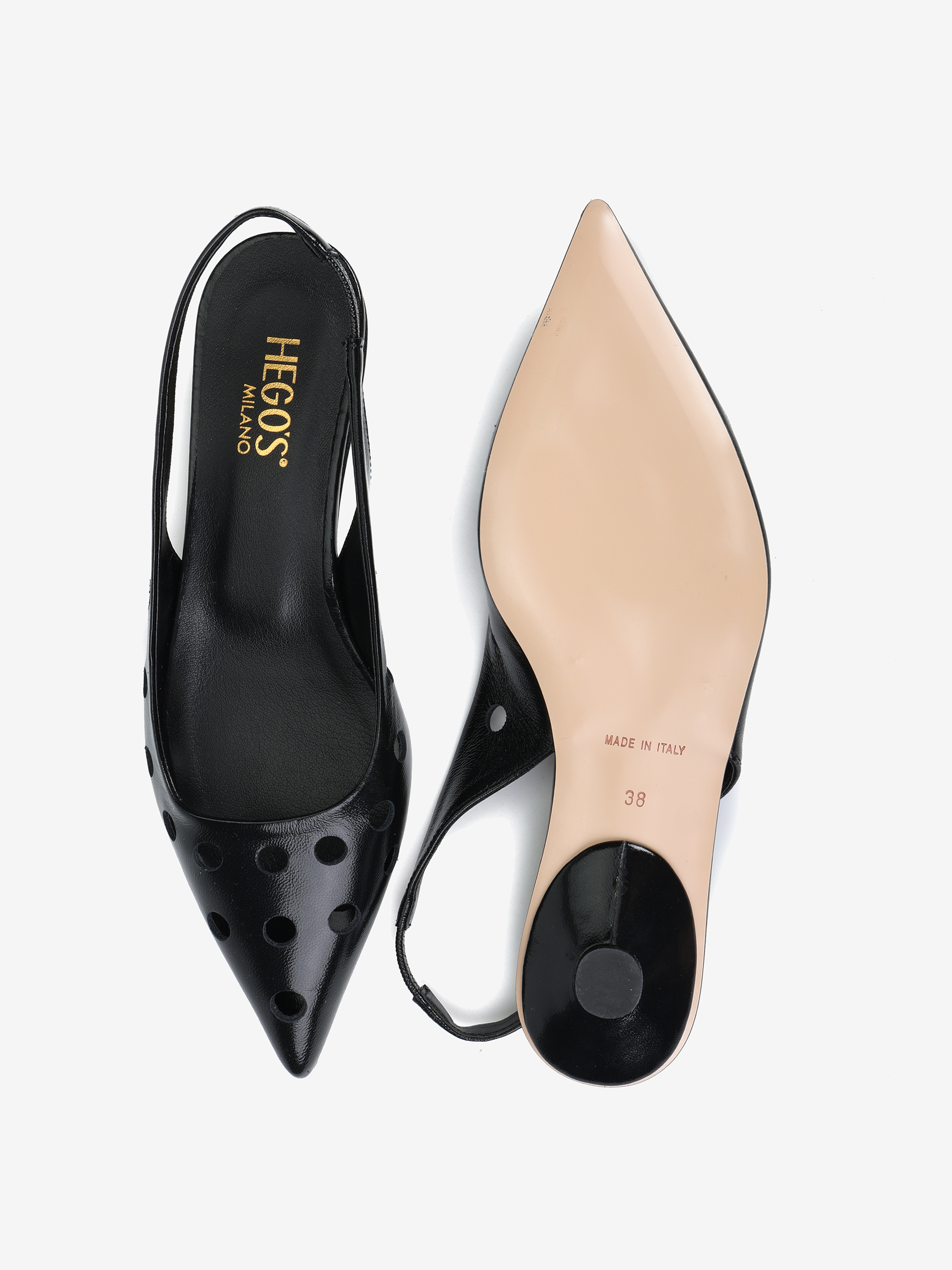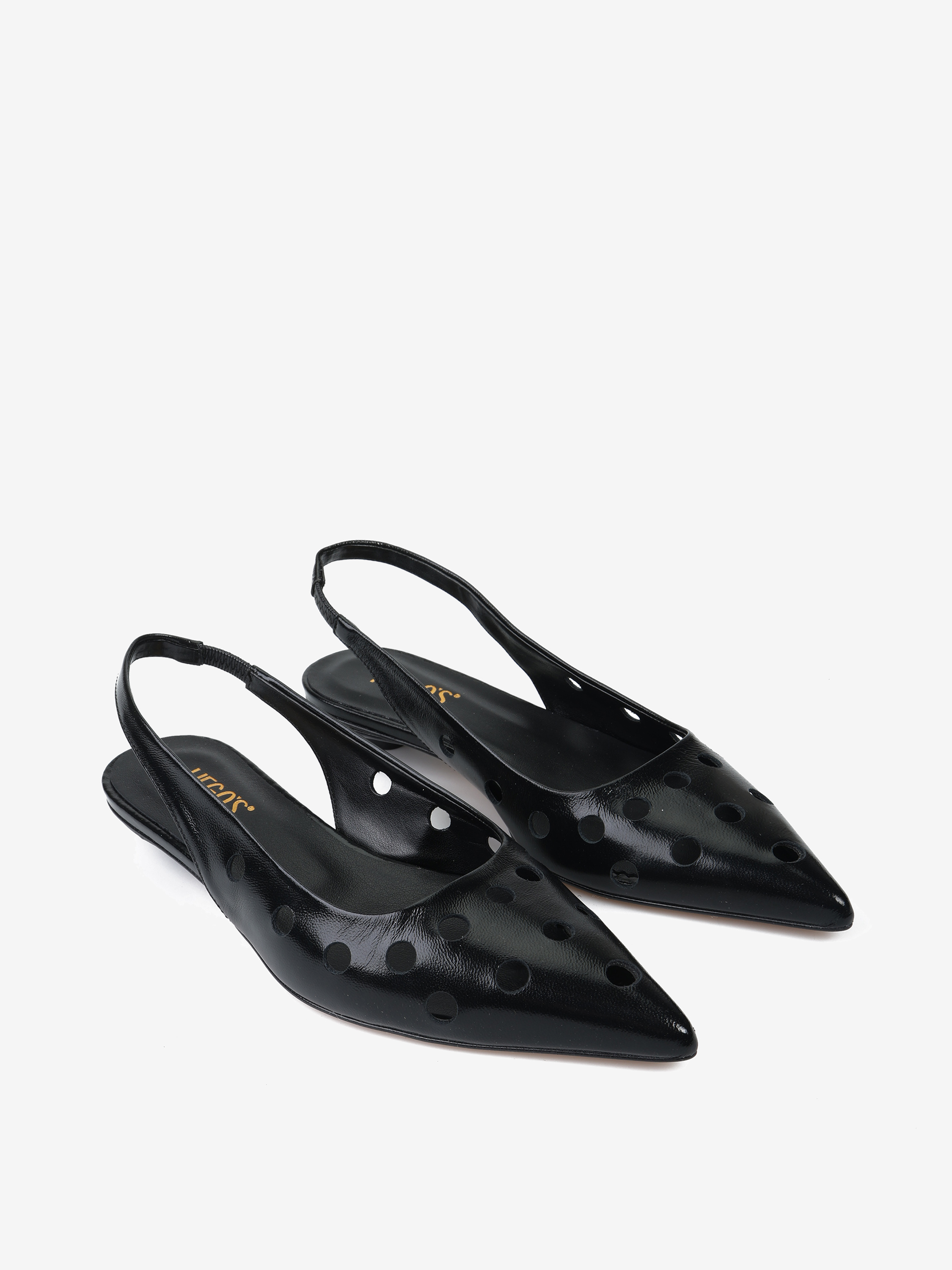 Ażurowe, lakierowane baleriny z noskiem w szpic. Odkryta pięta z paskiem dopasowującym się do stopy.