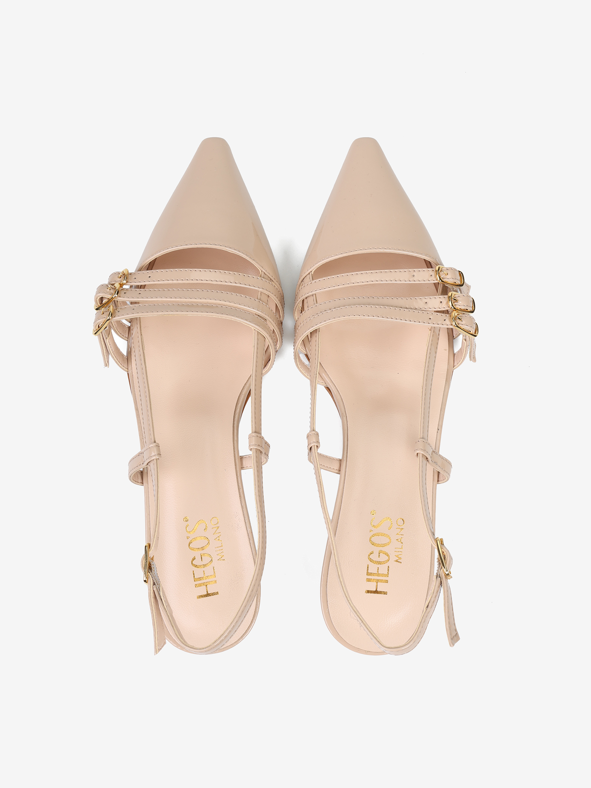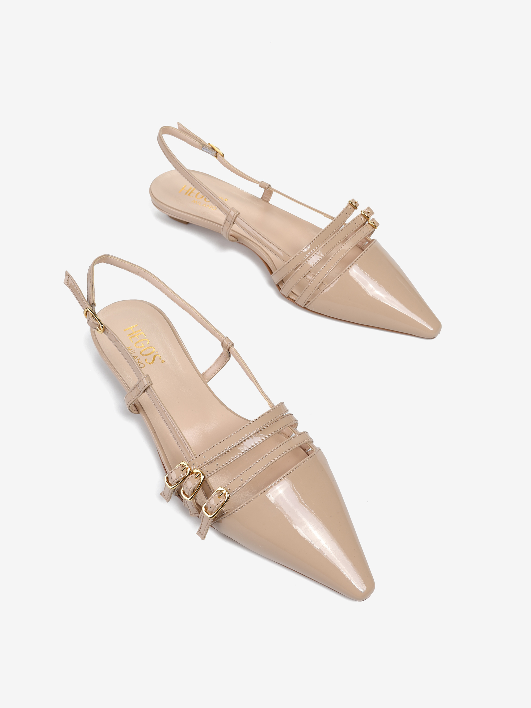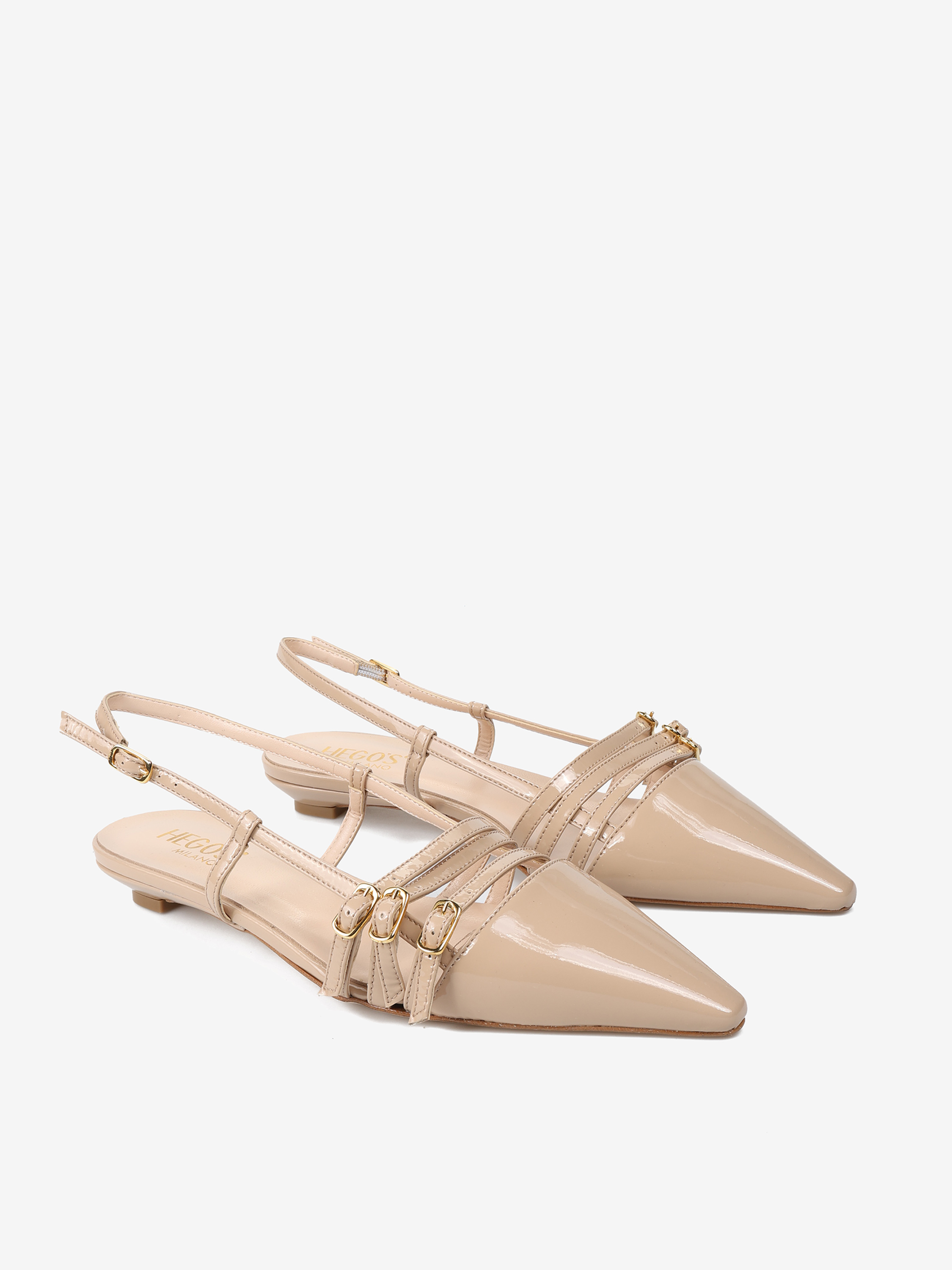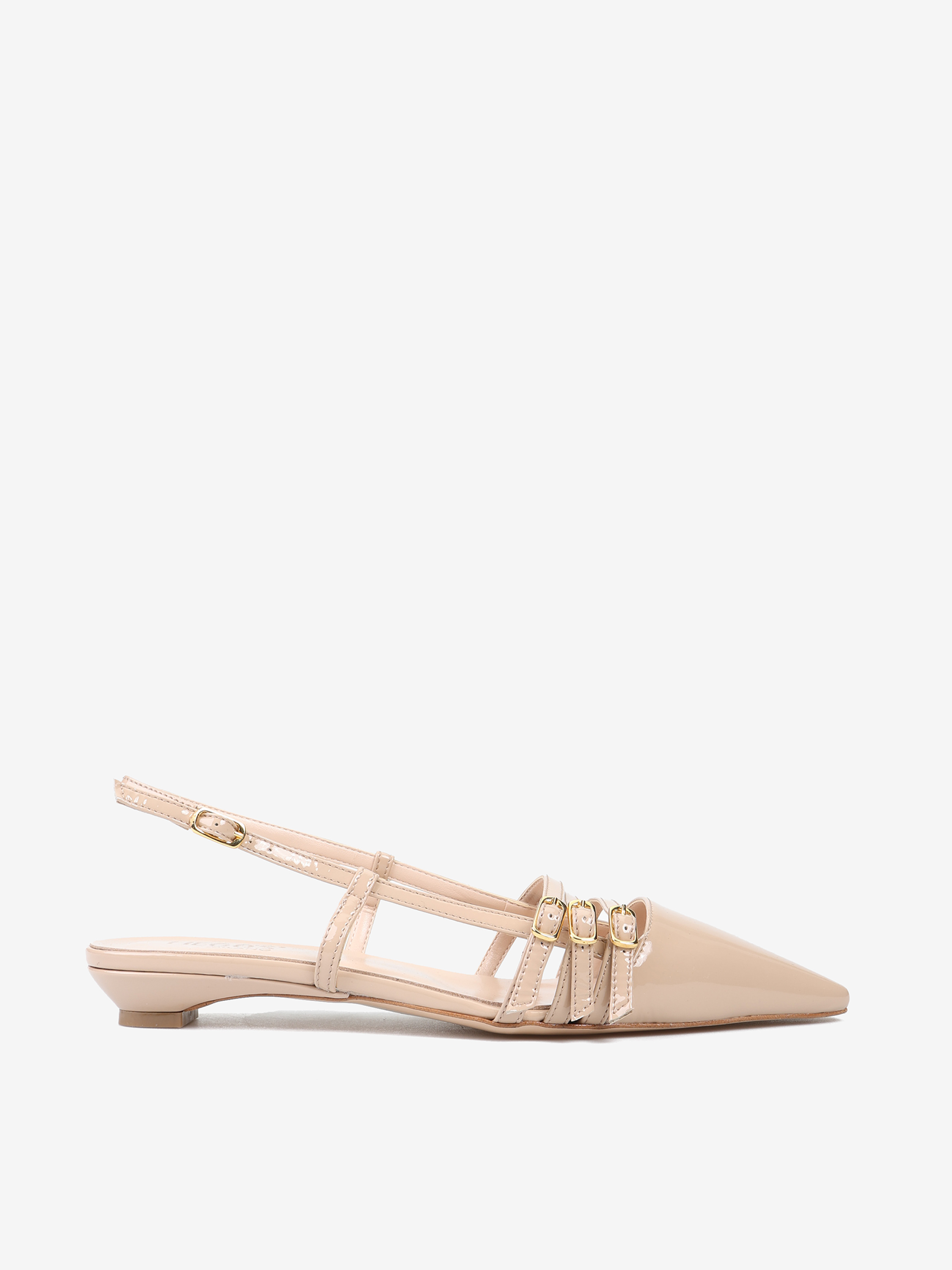 Baleriny z noskiem w szpic i odkrytą piętą z regulowanym paskiem. Ozdobne paseczki.