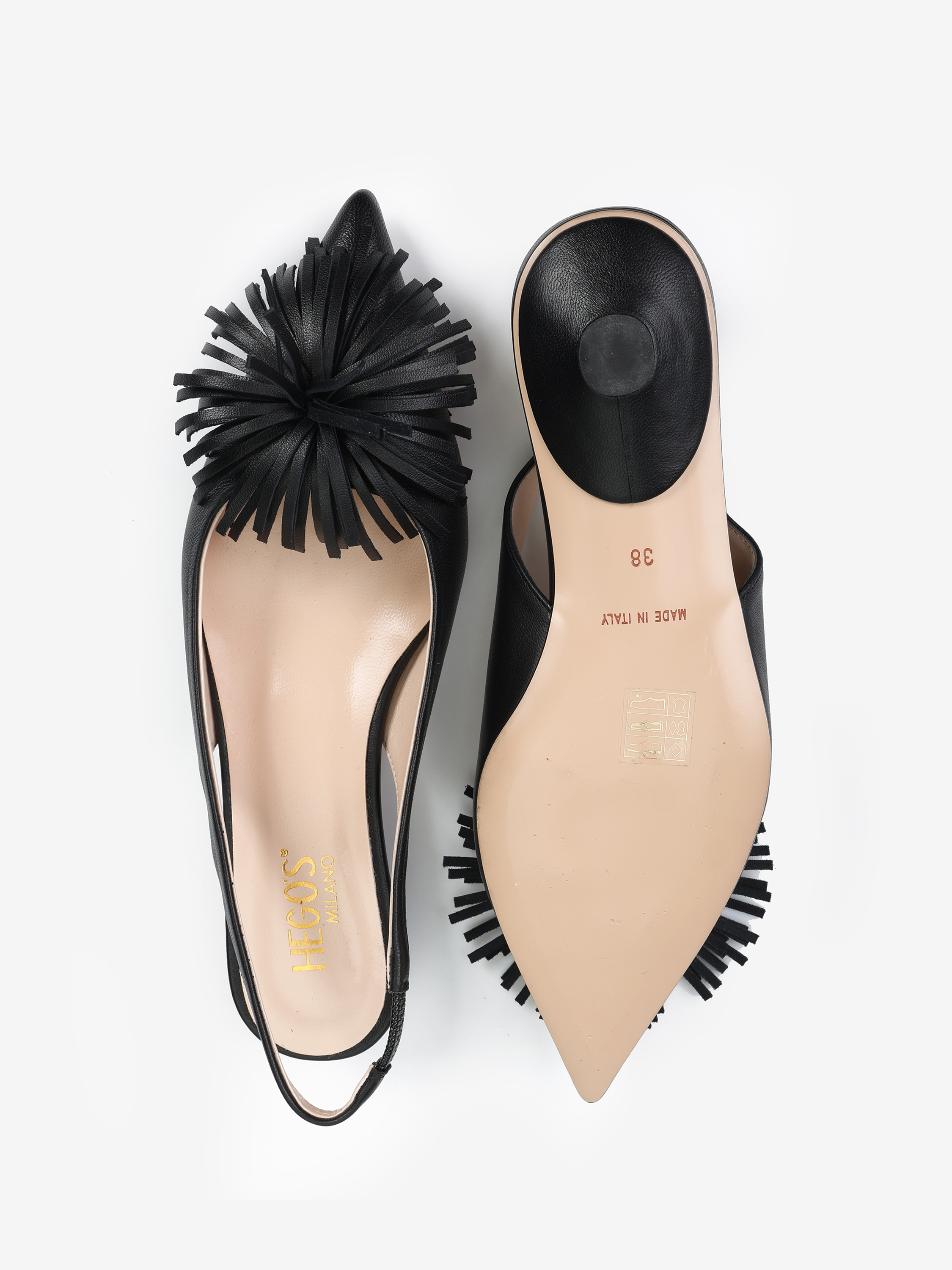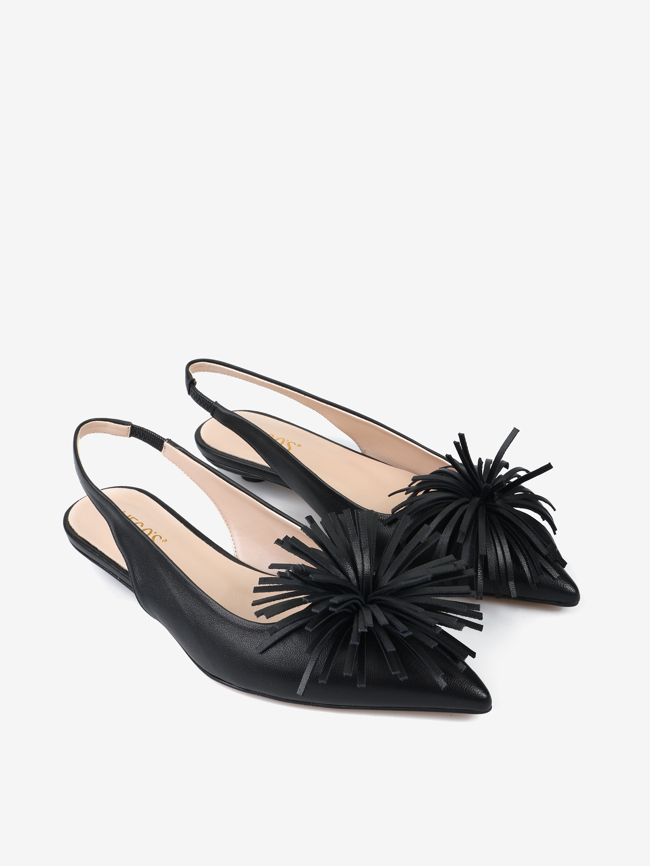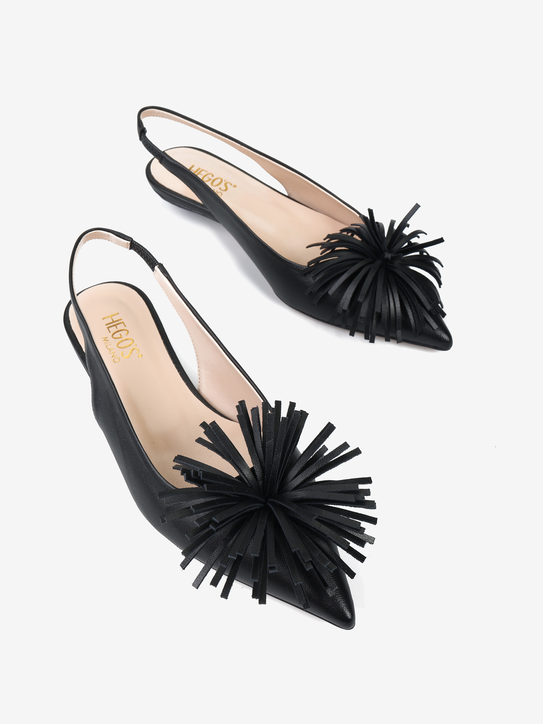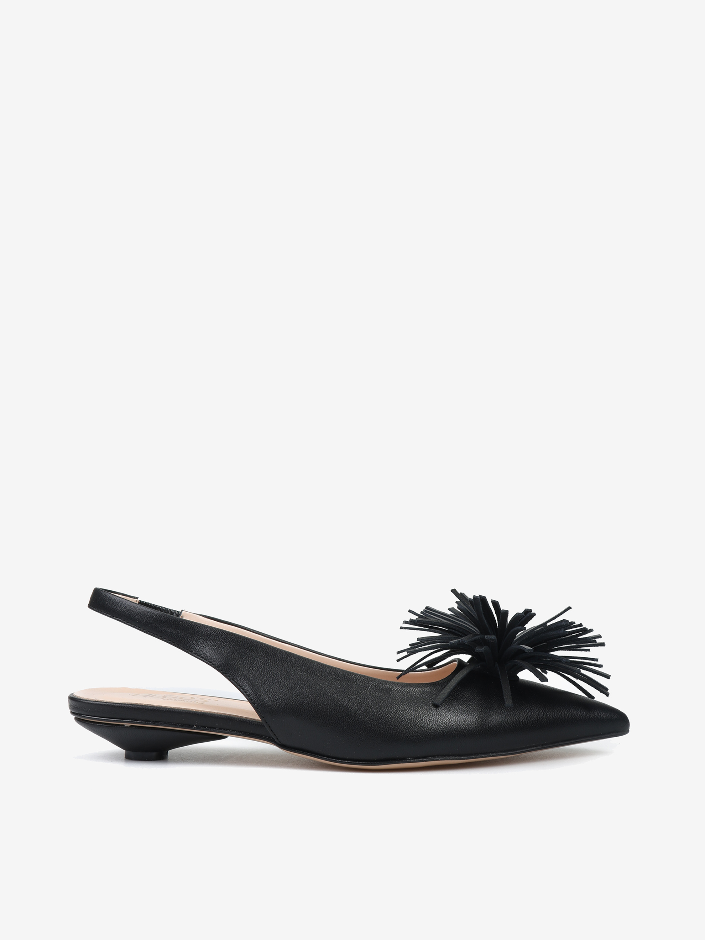 Baleriny z noskiem w szpic i ozdobnym, skórzanym pomponem. Odkryta pięta z paskiem dopasowującym się do stopy.