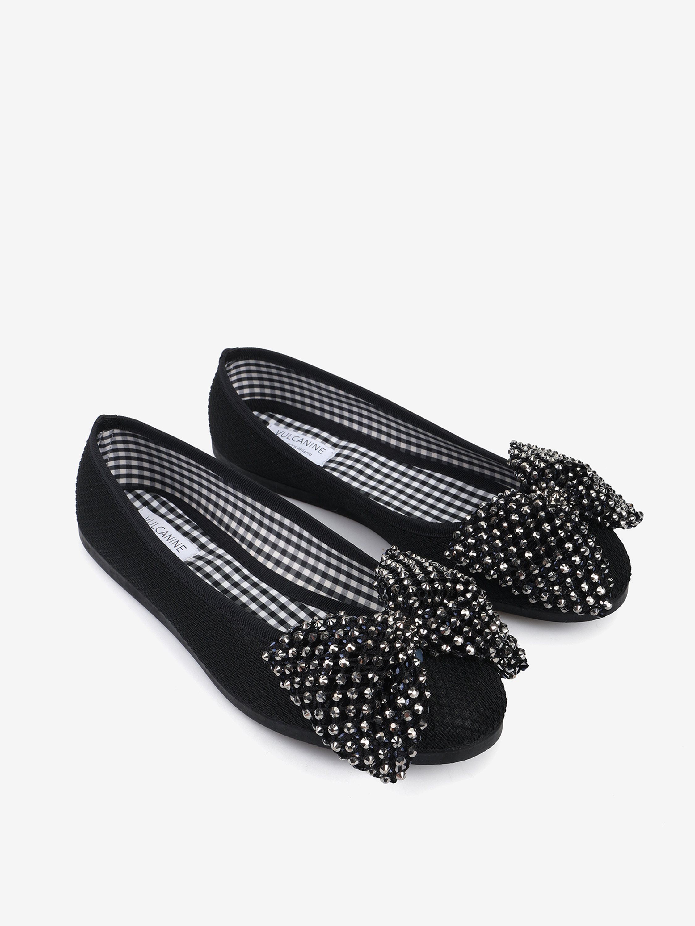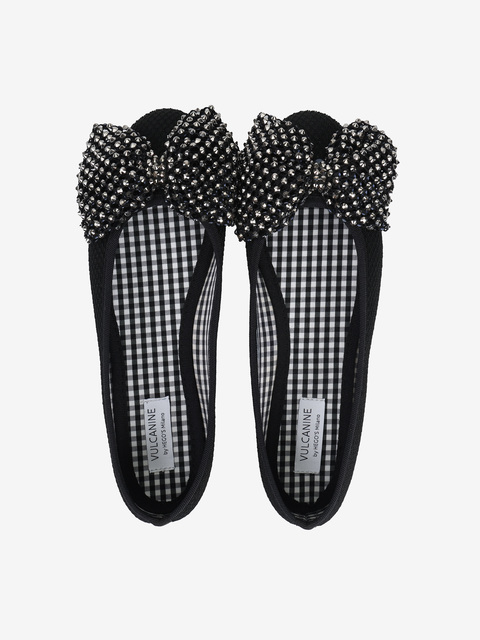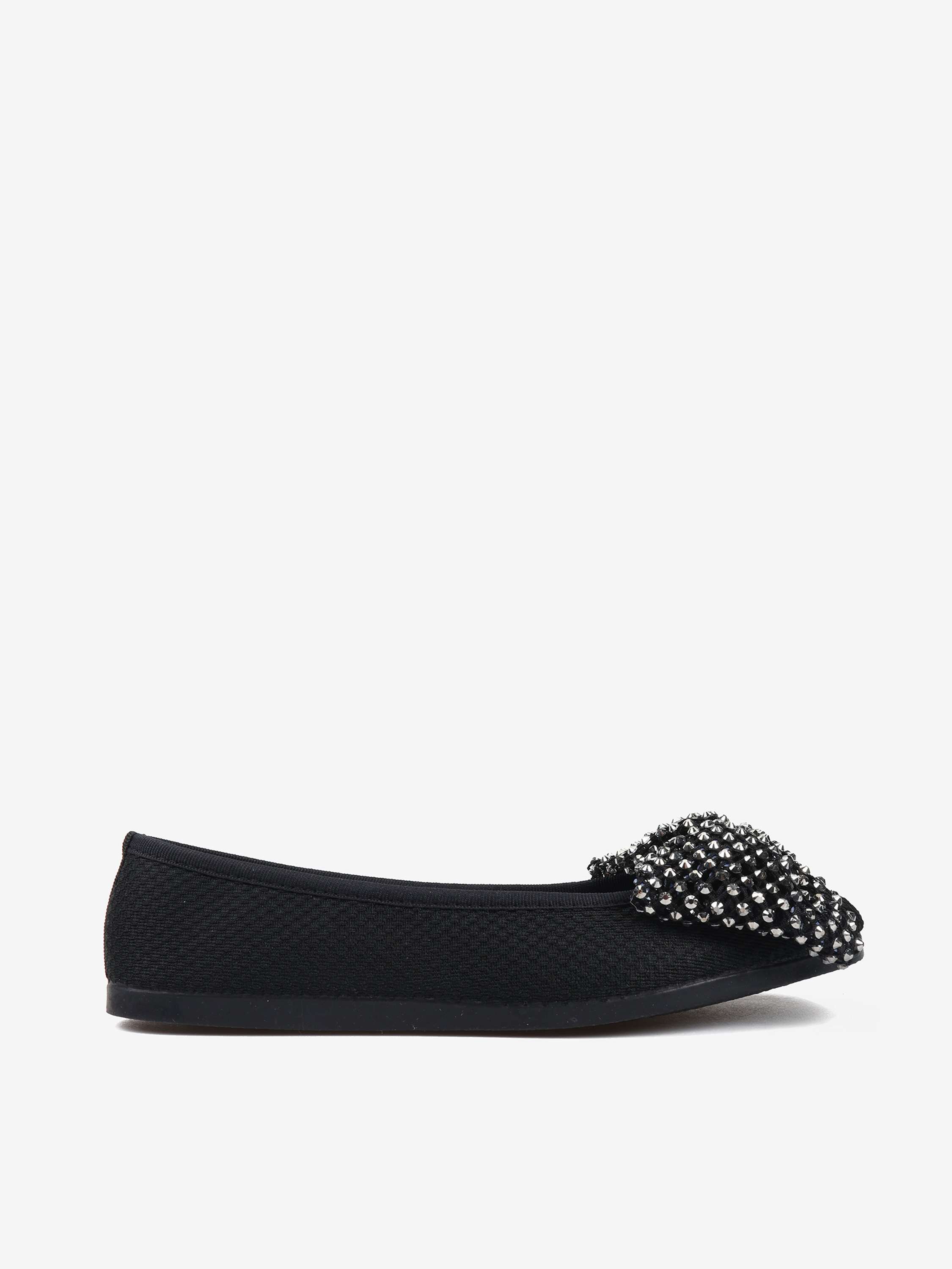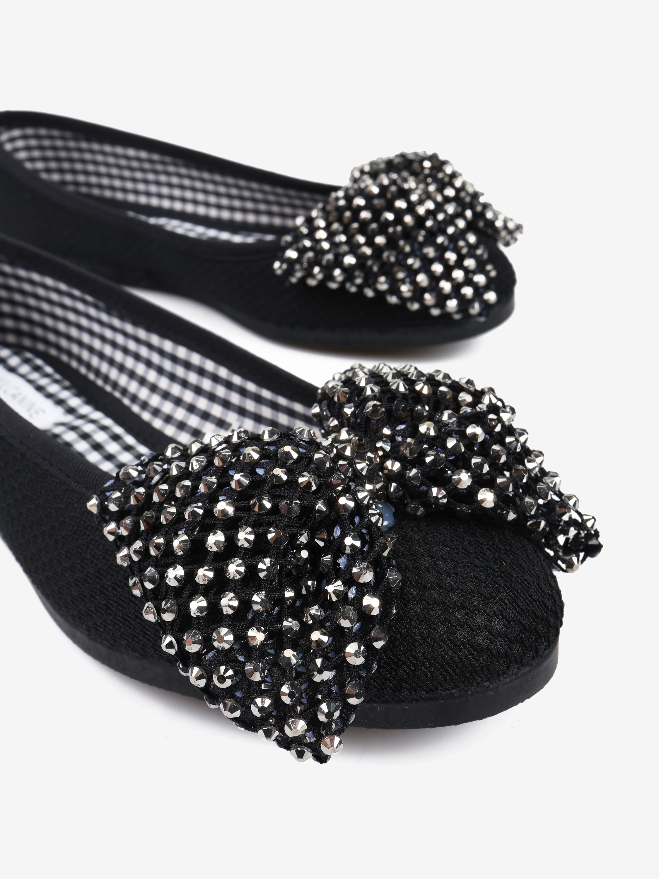 Tkaninowe baleriny z okrągłym noskiem. Ozdobna, siateczkowa kokarda z połyskującymi kamykami.