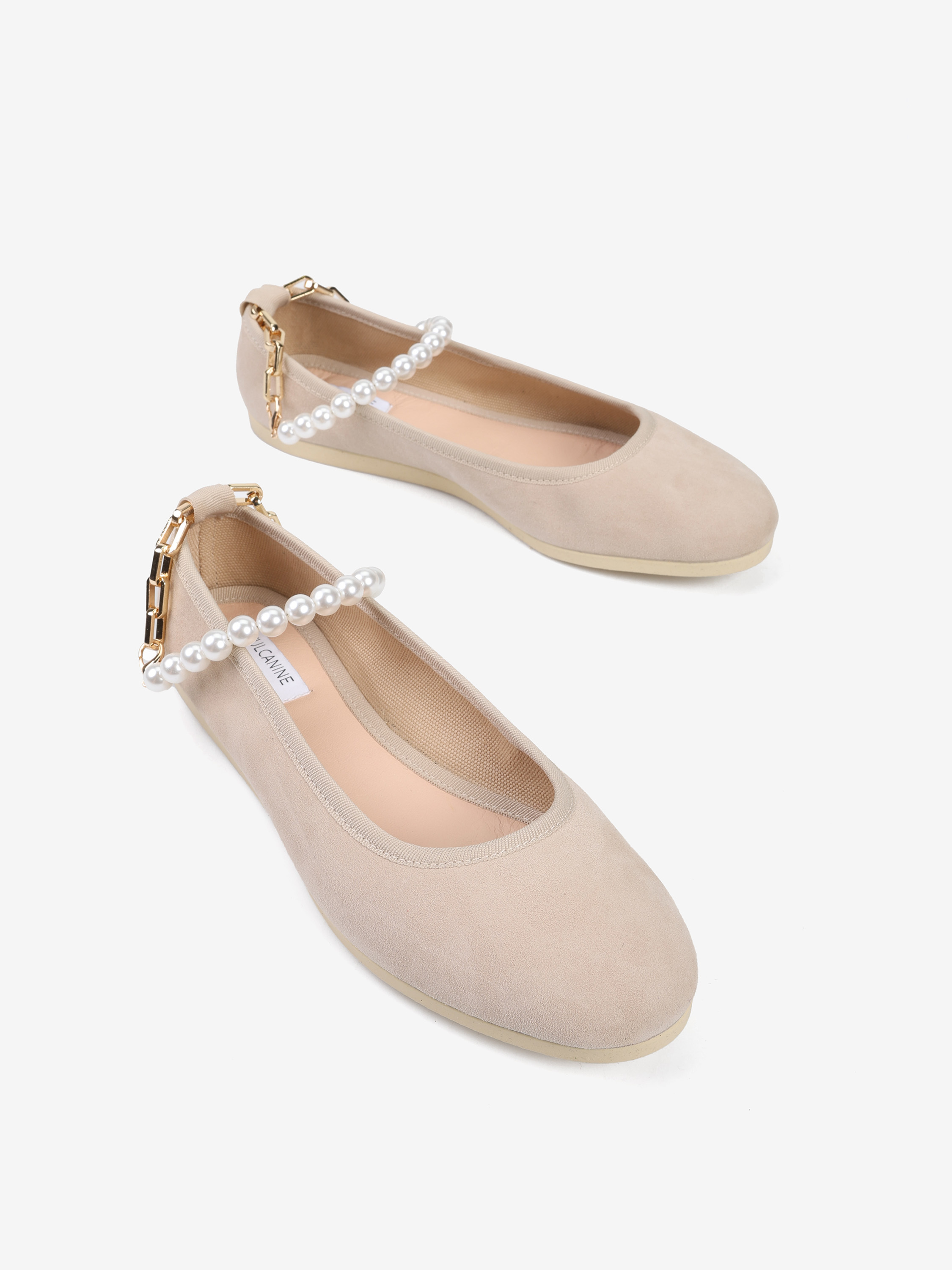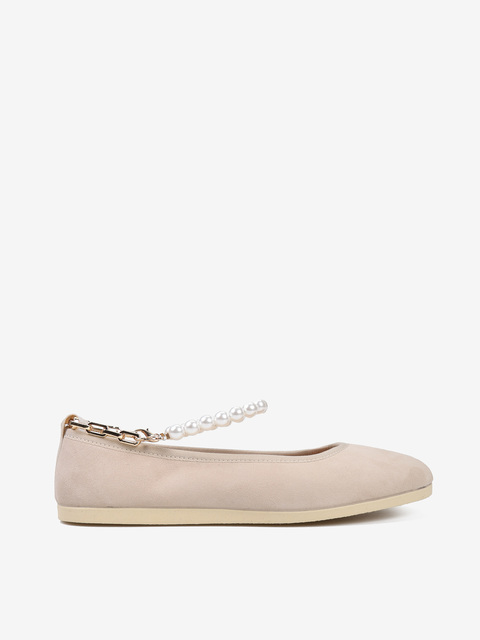 Zamszowe baleriny z paskiem z pereł na kostce.