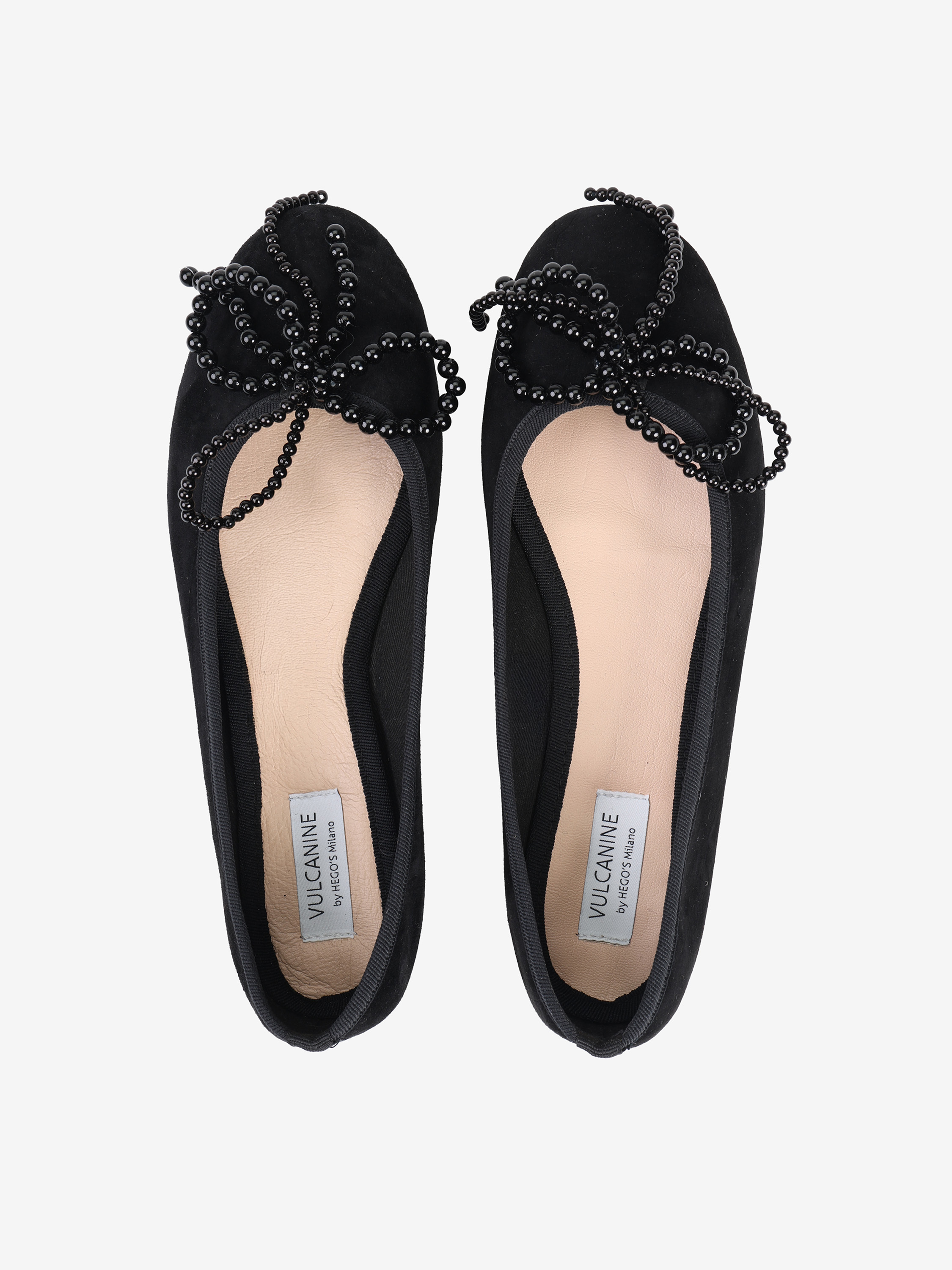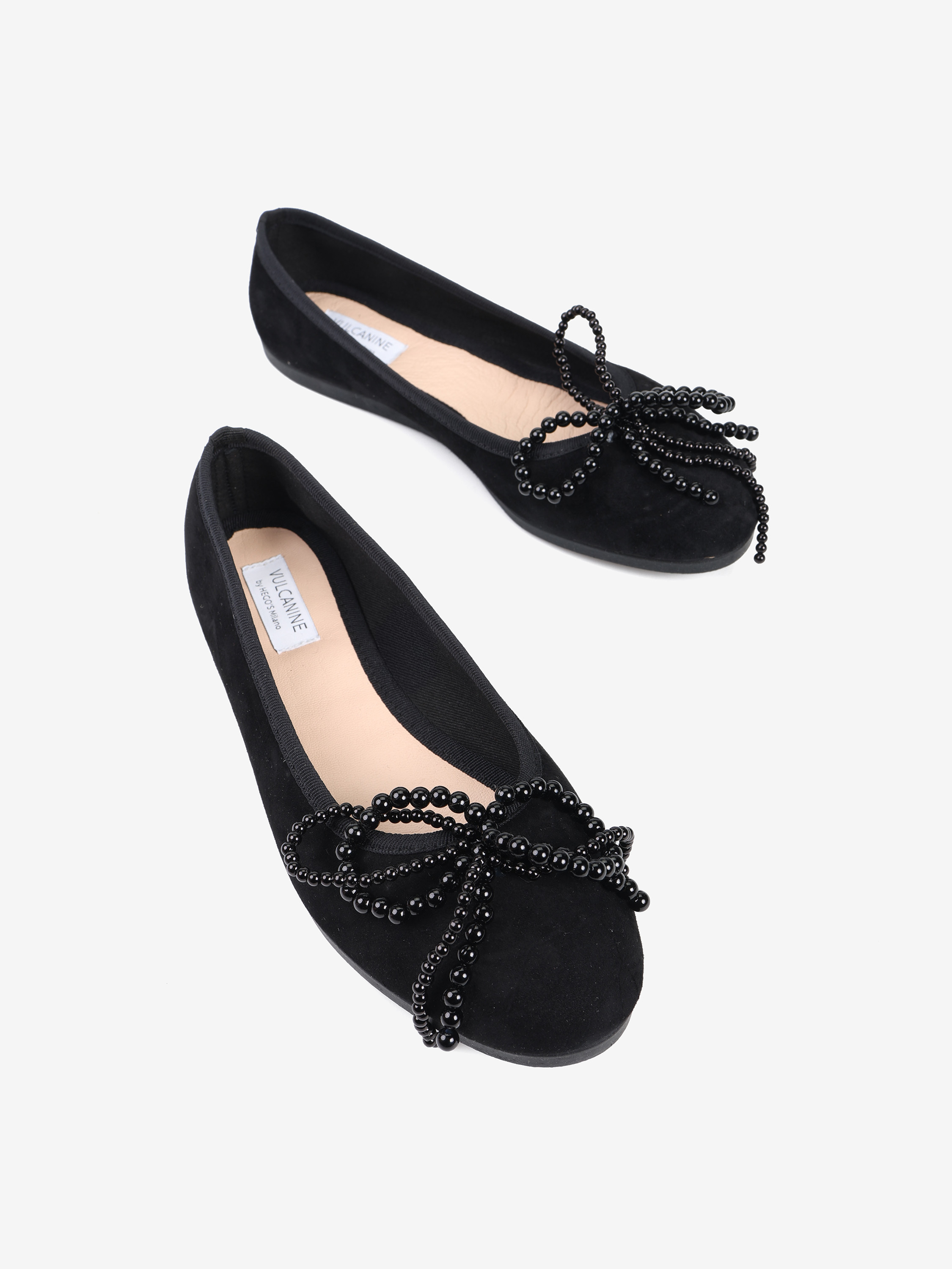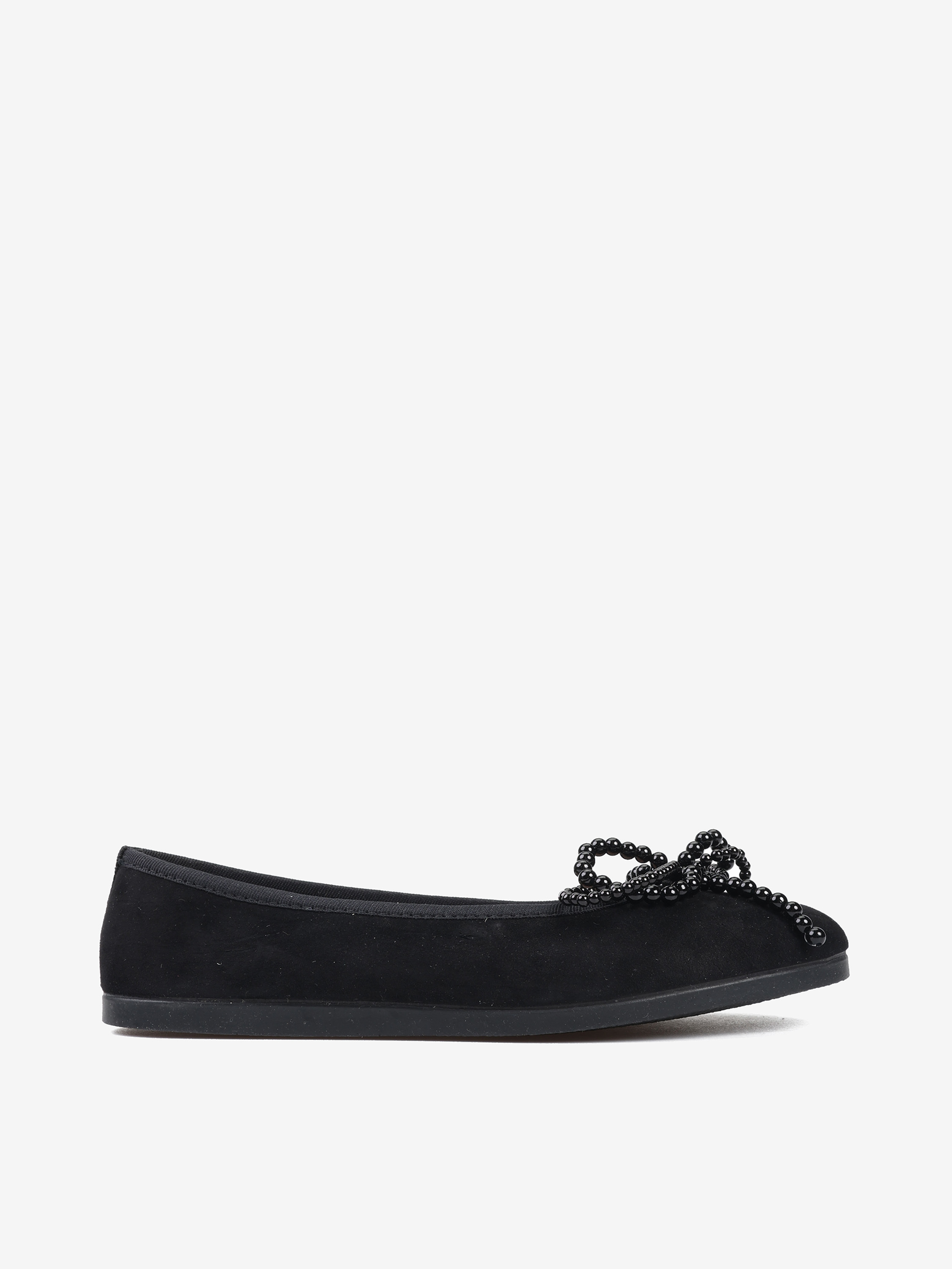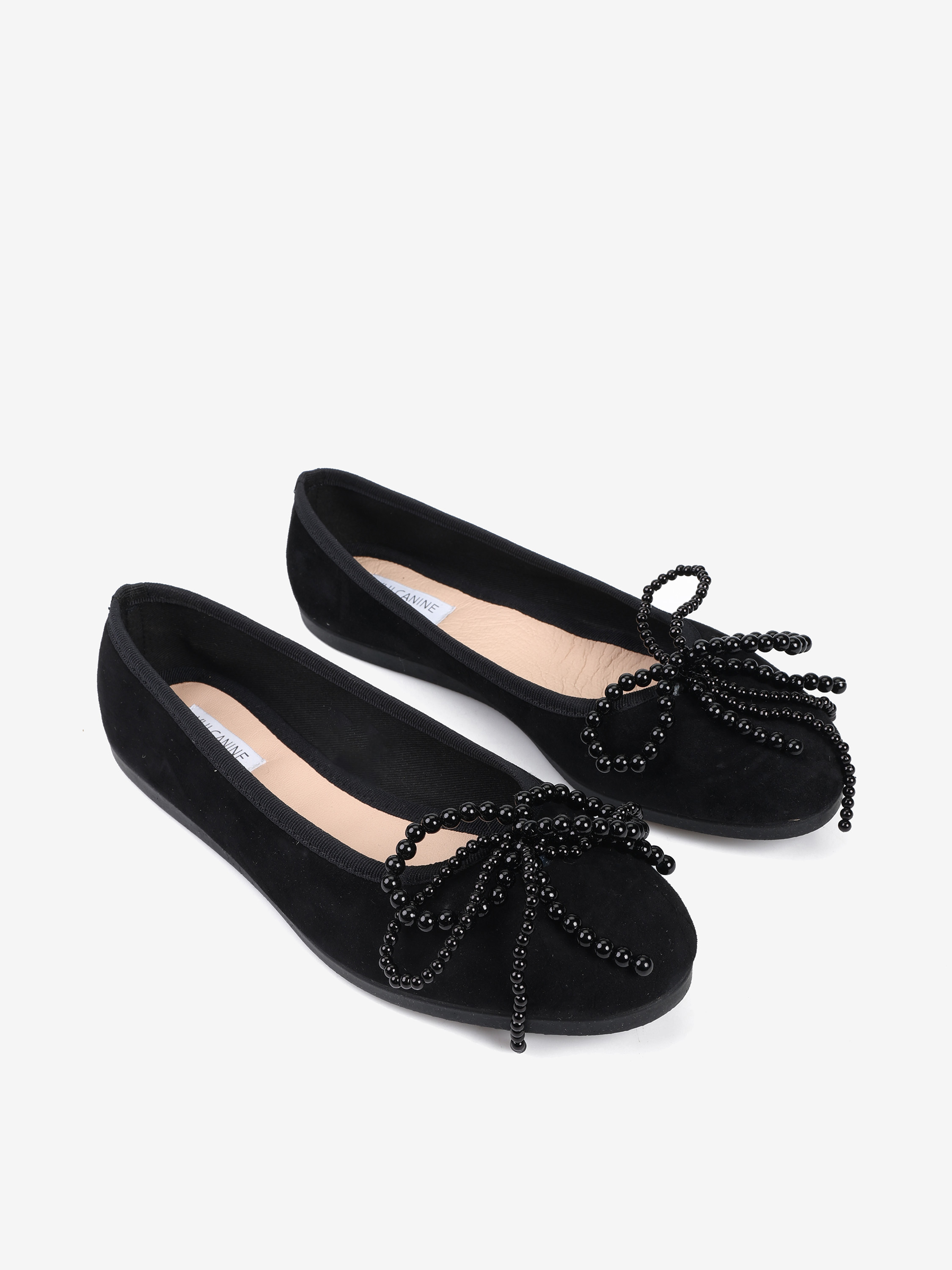 Zamszowe baleriny z regulowaną, wiązaną kokardką i kokardą z pereł.