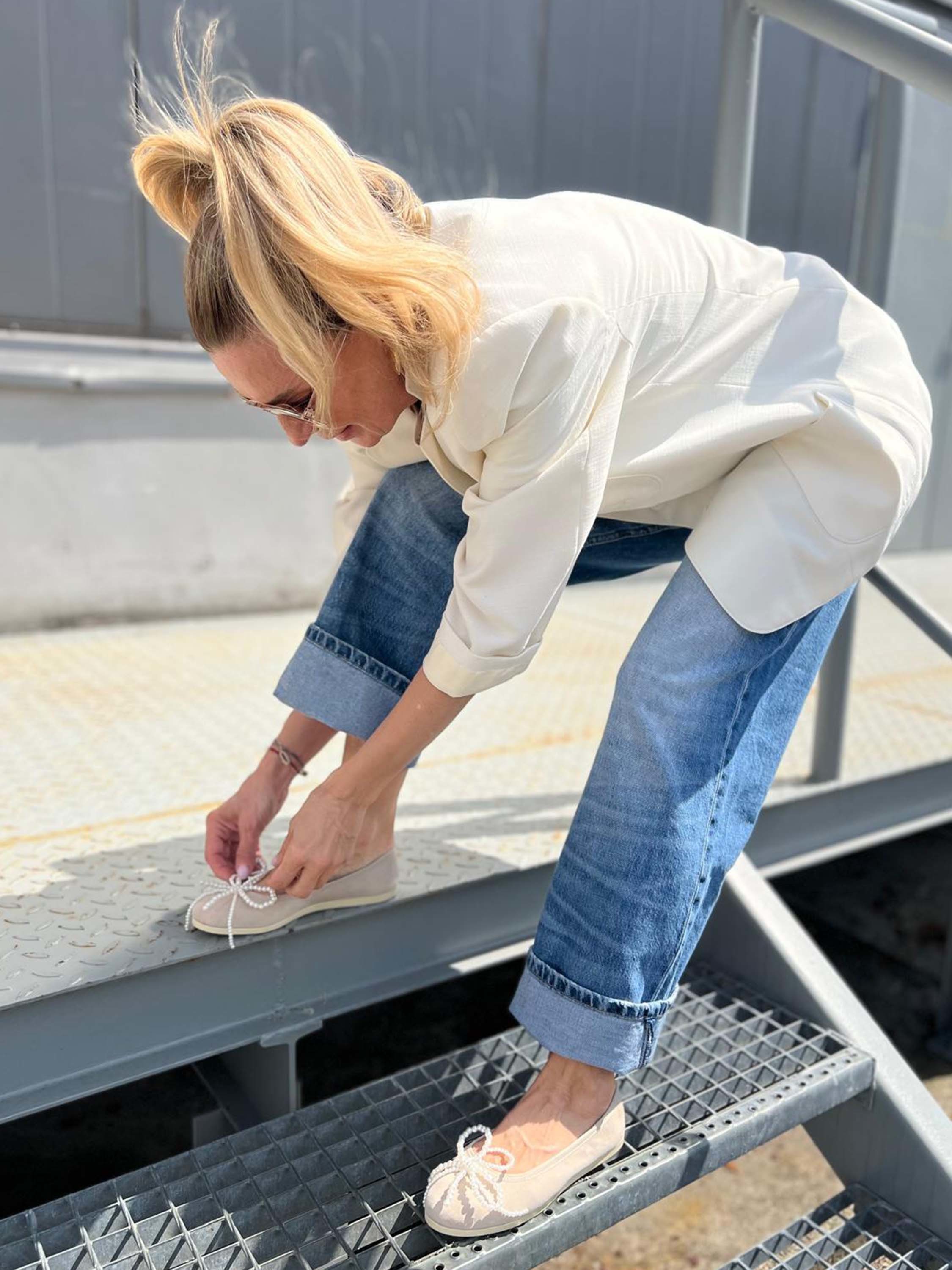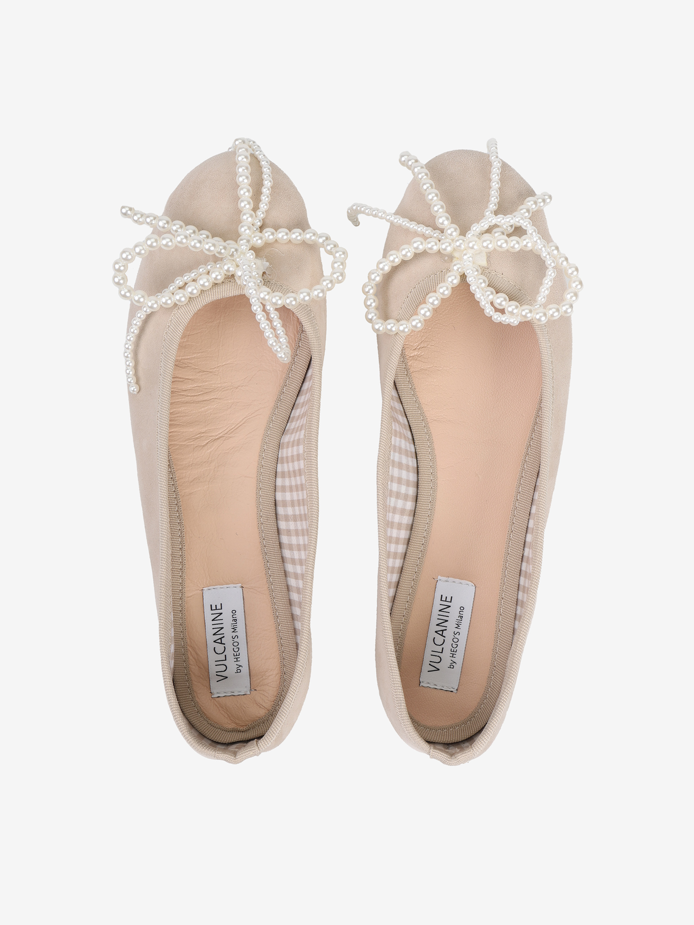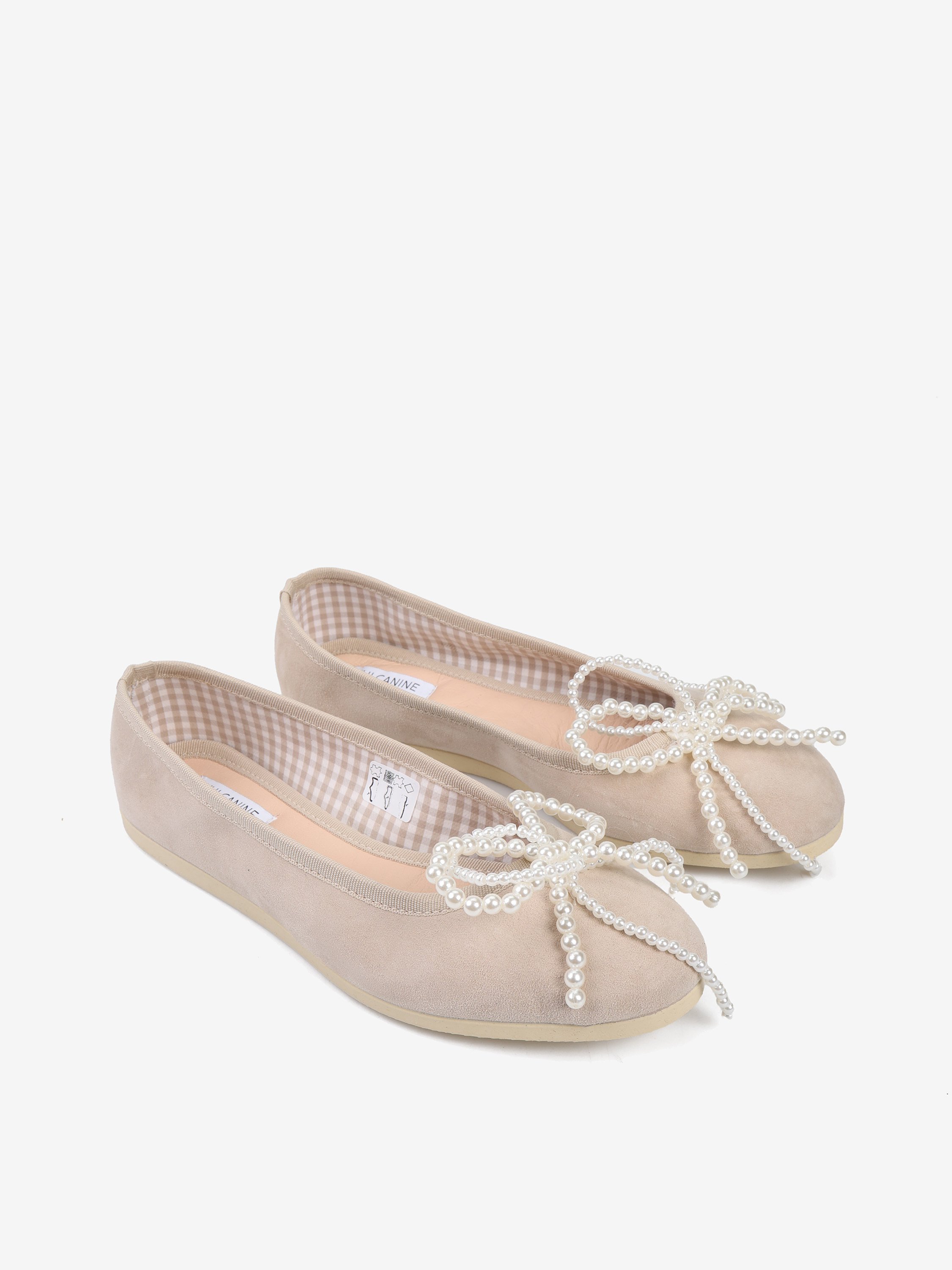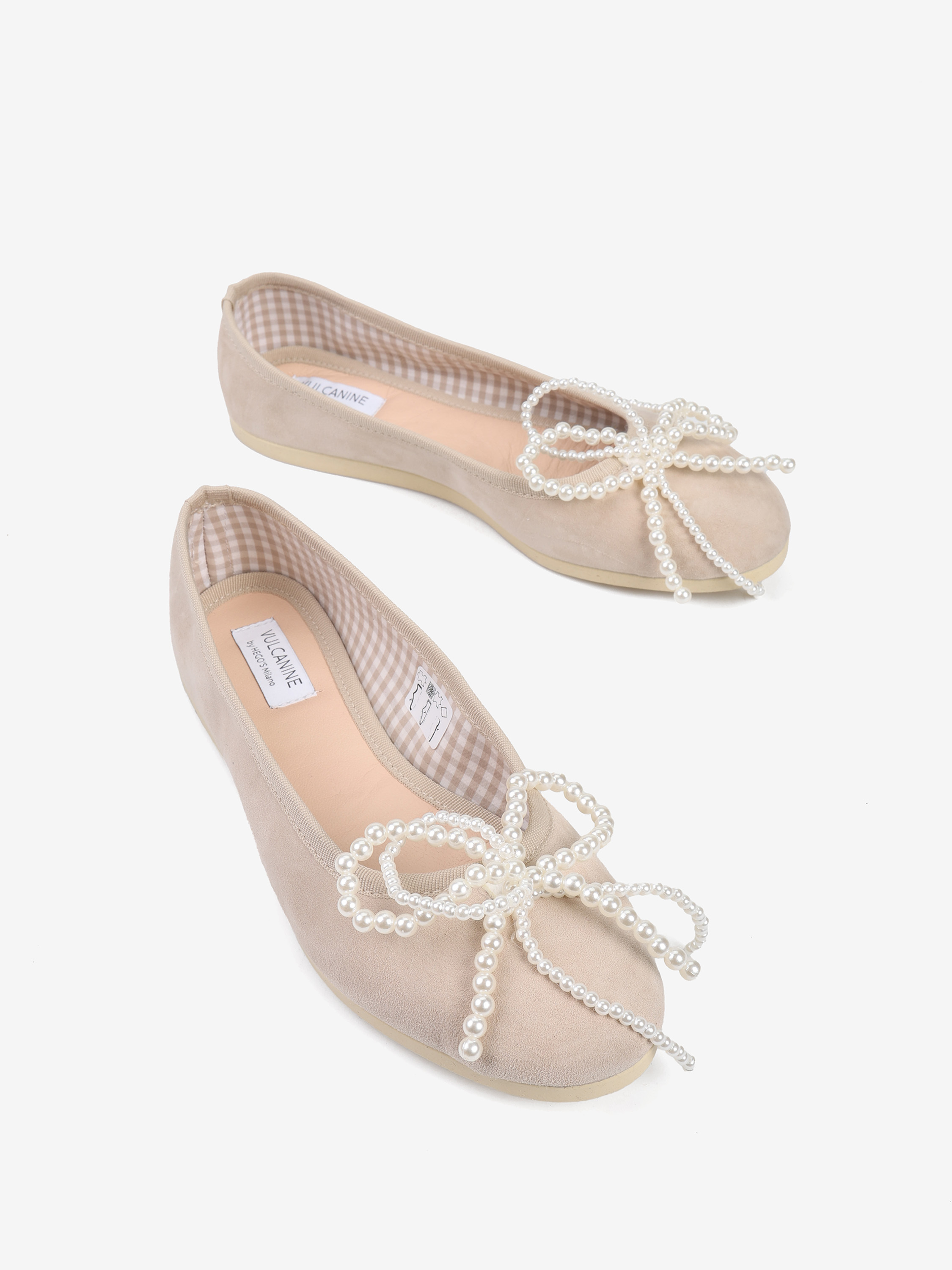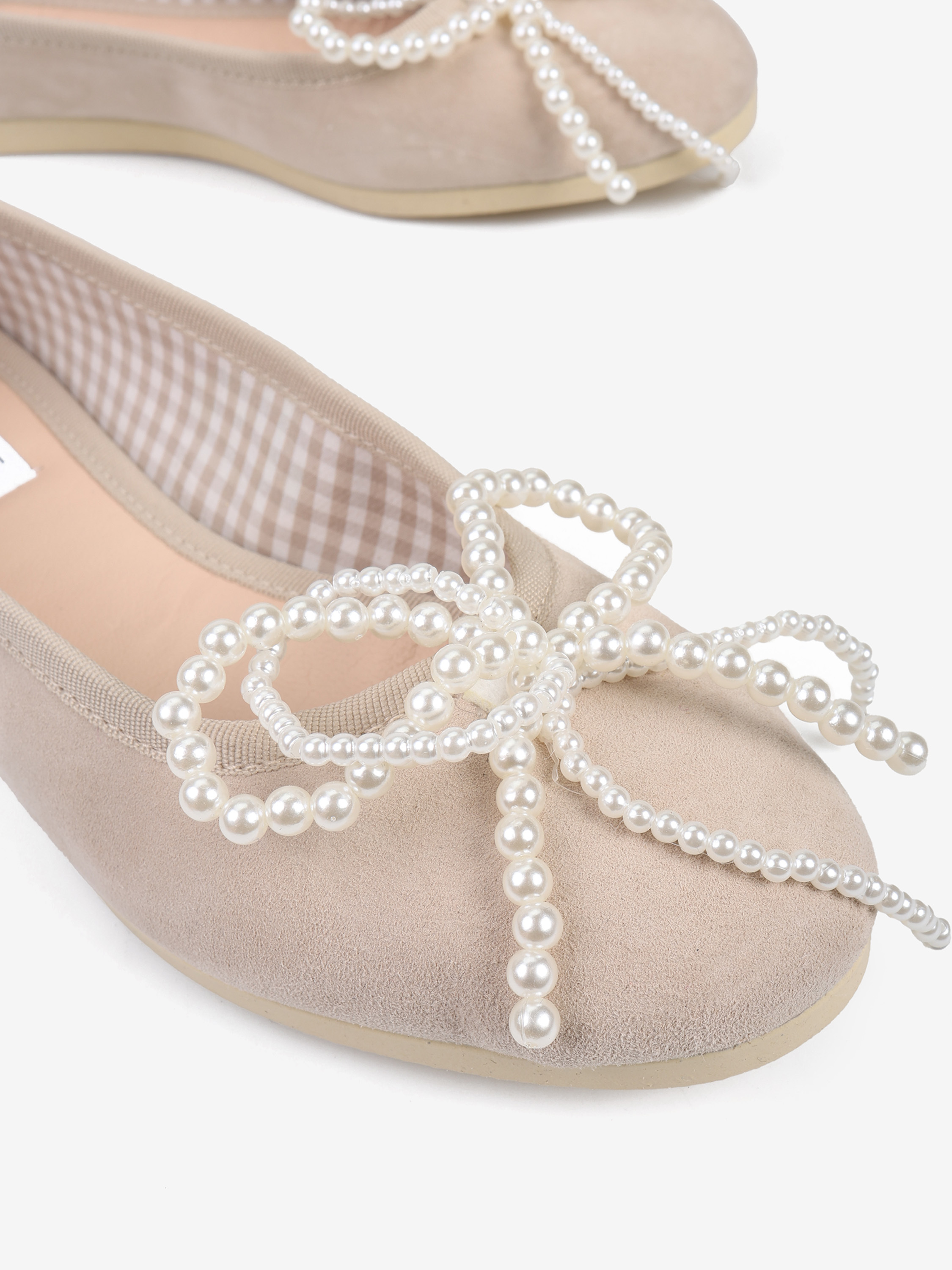 Zamszowe baleriny z regulowaną, wiązaną kokardką i kokardą z pereł.