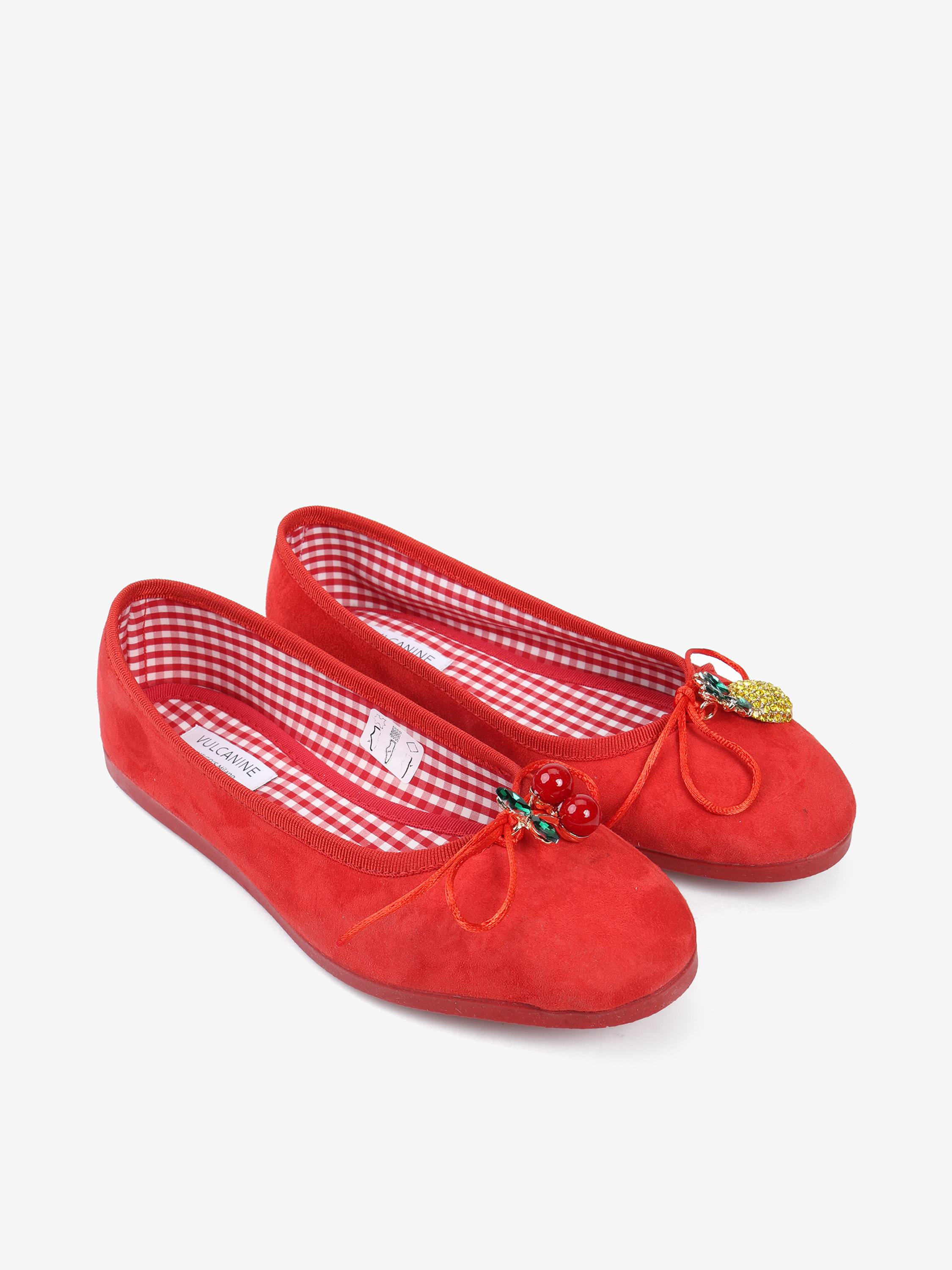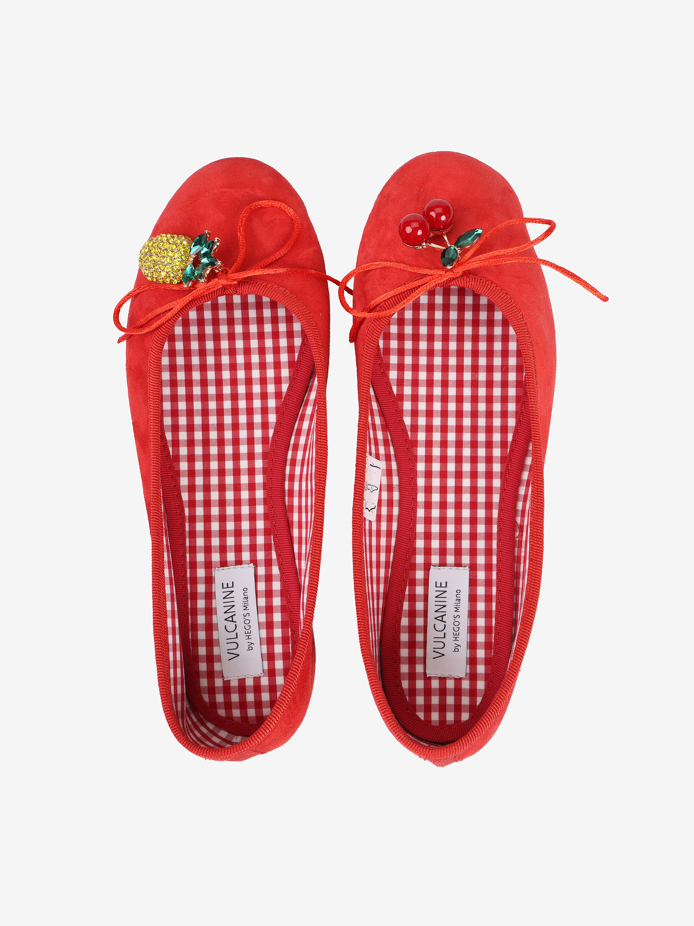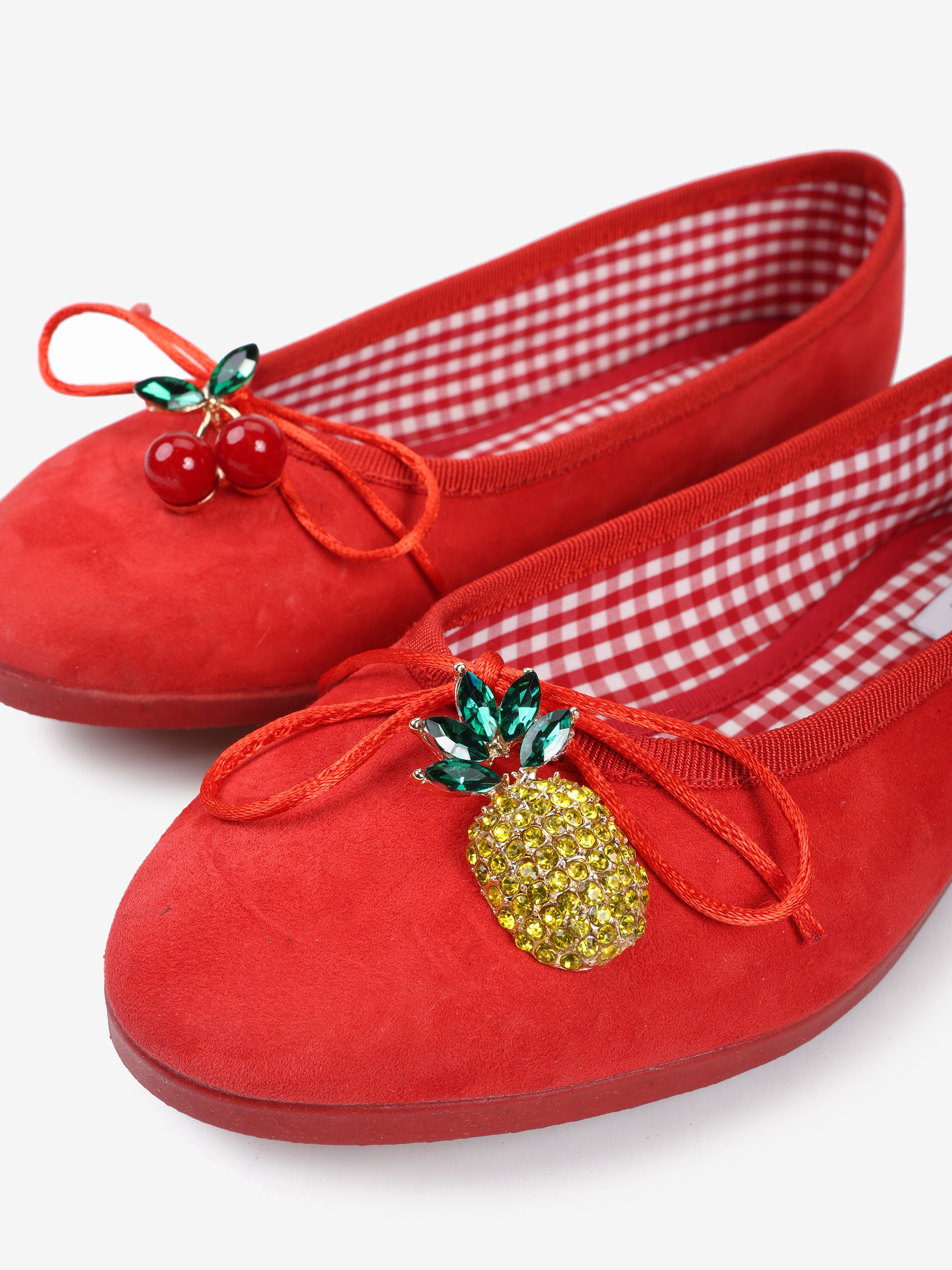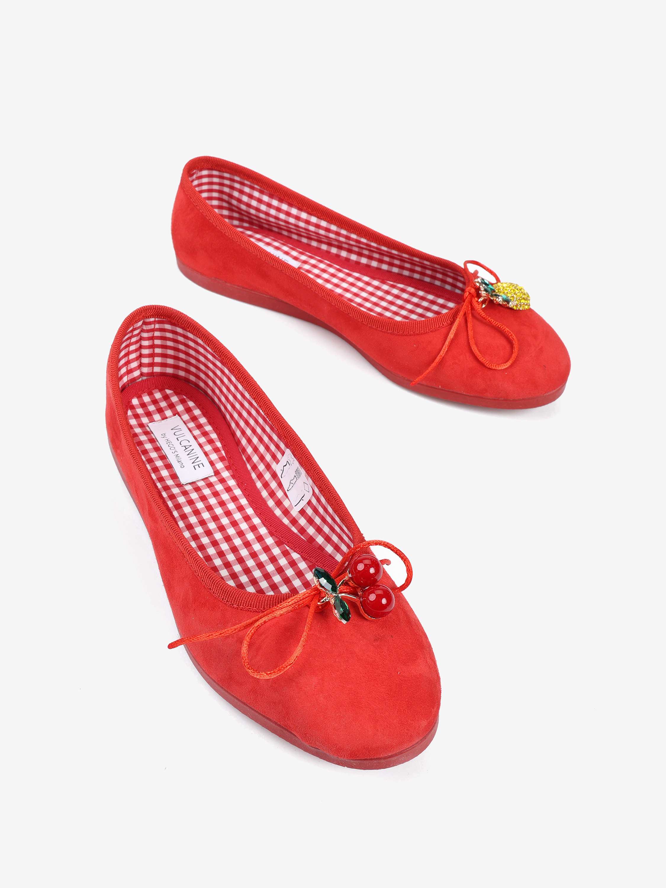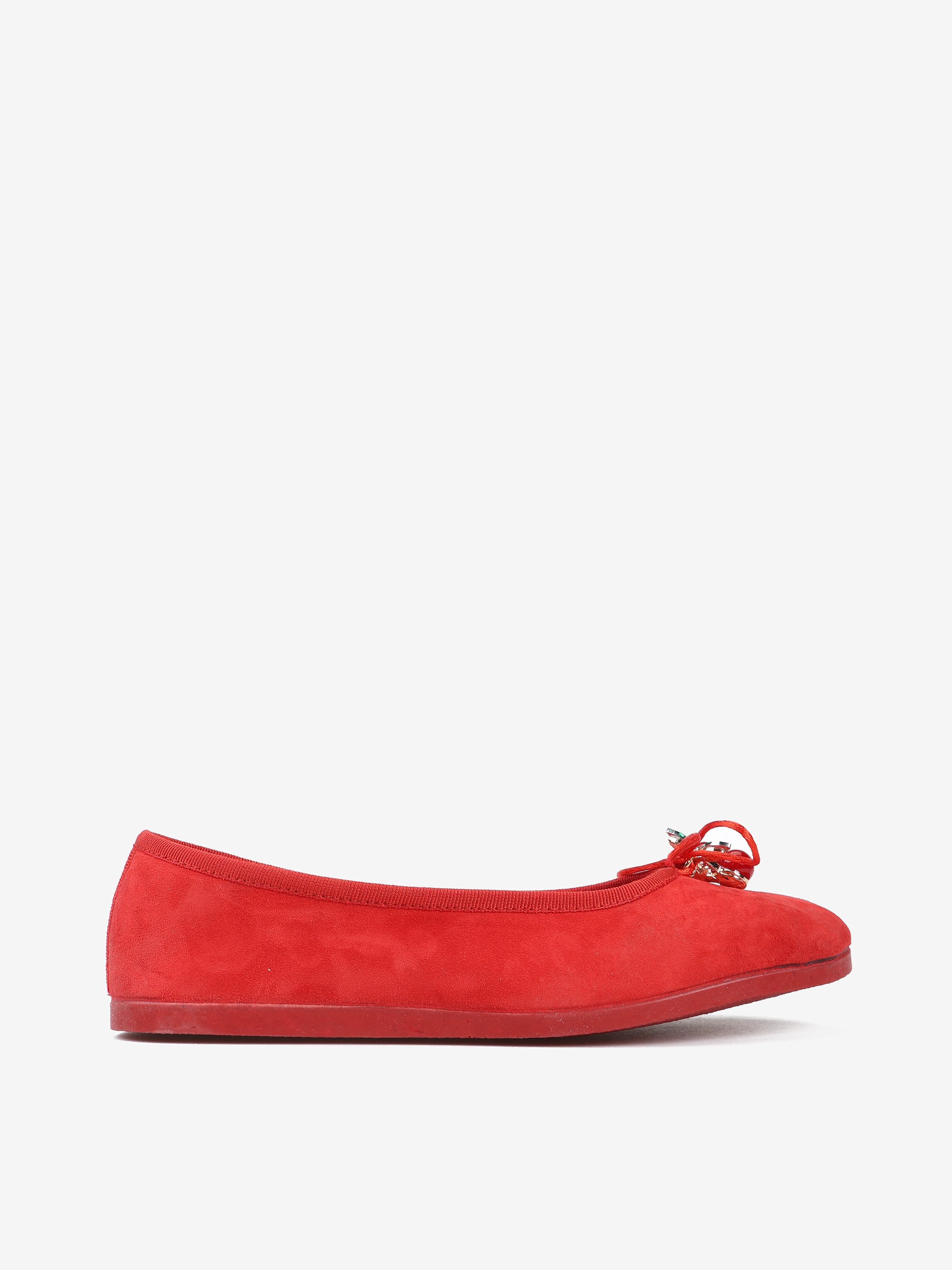 Zamszowe baleriny z regulowaną, wiązaną kokardką i ozdobnymi przywieszkami.