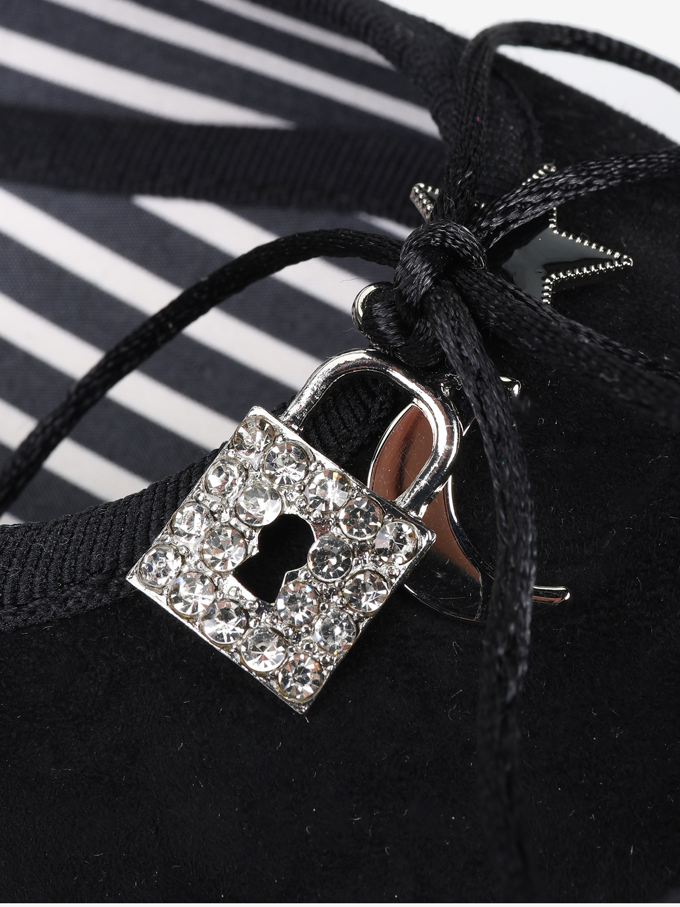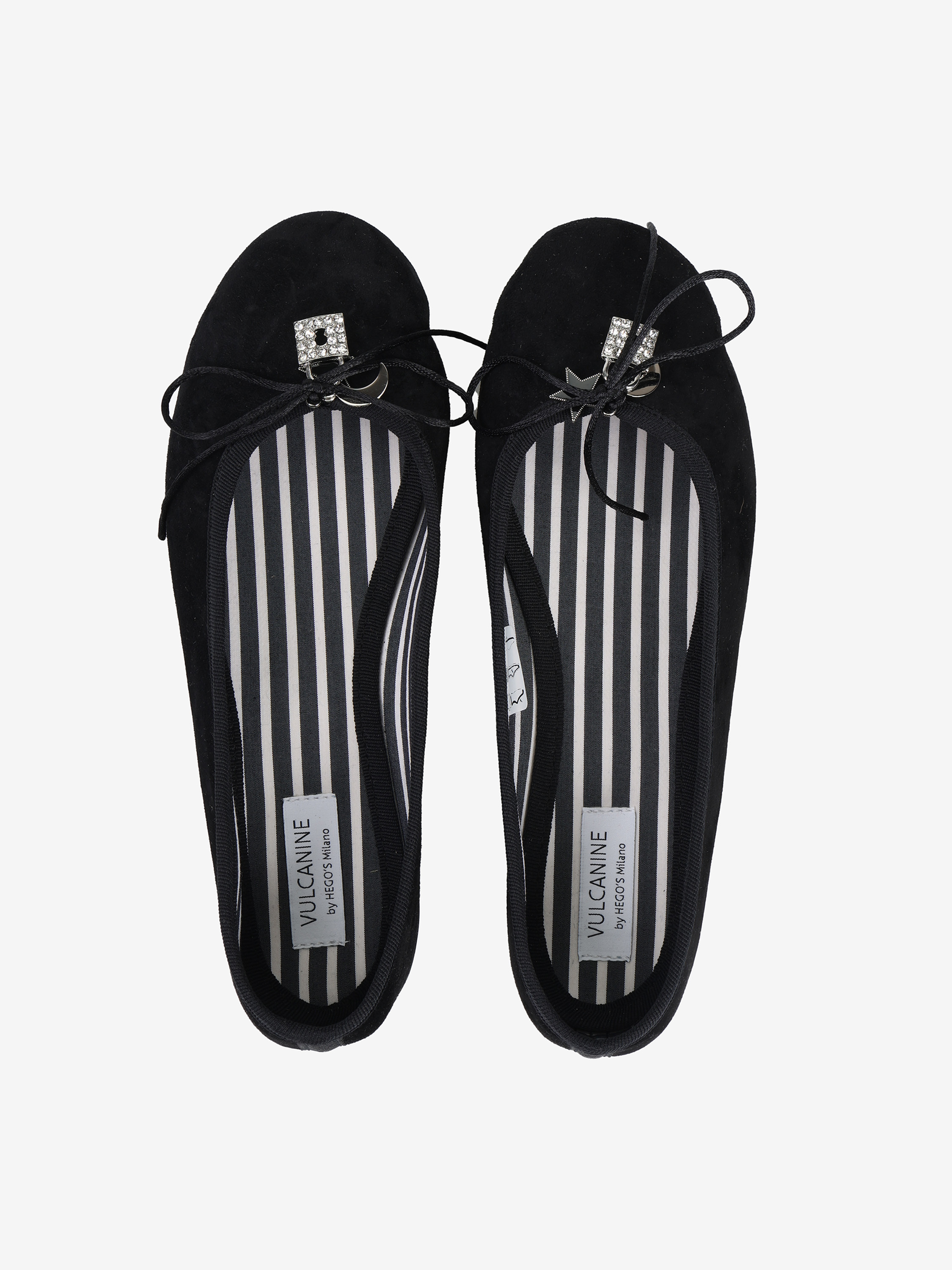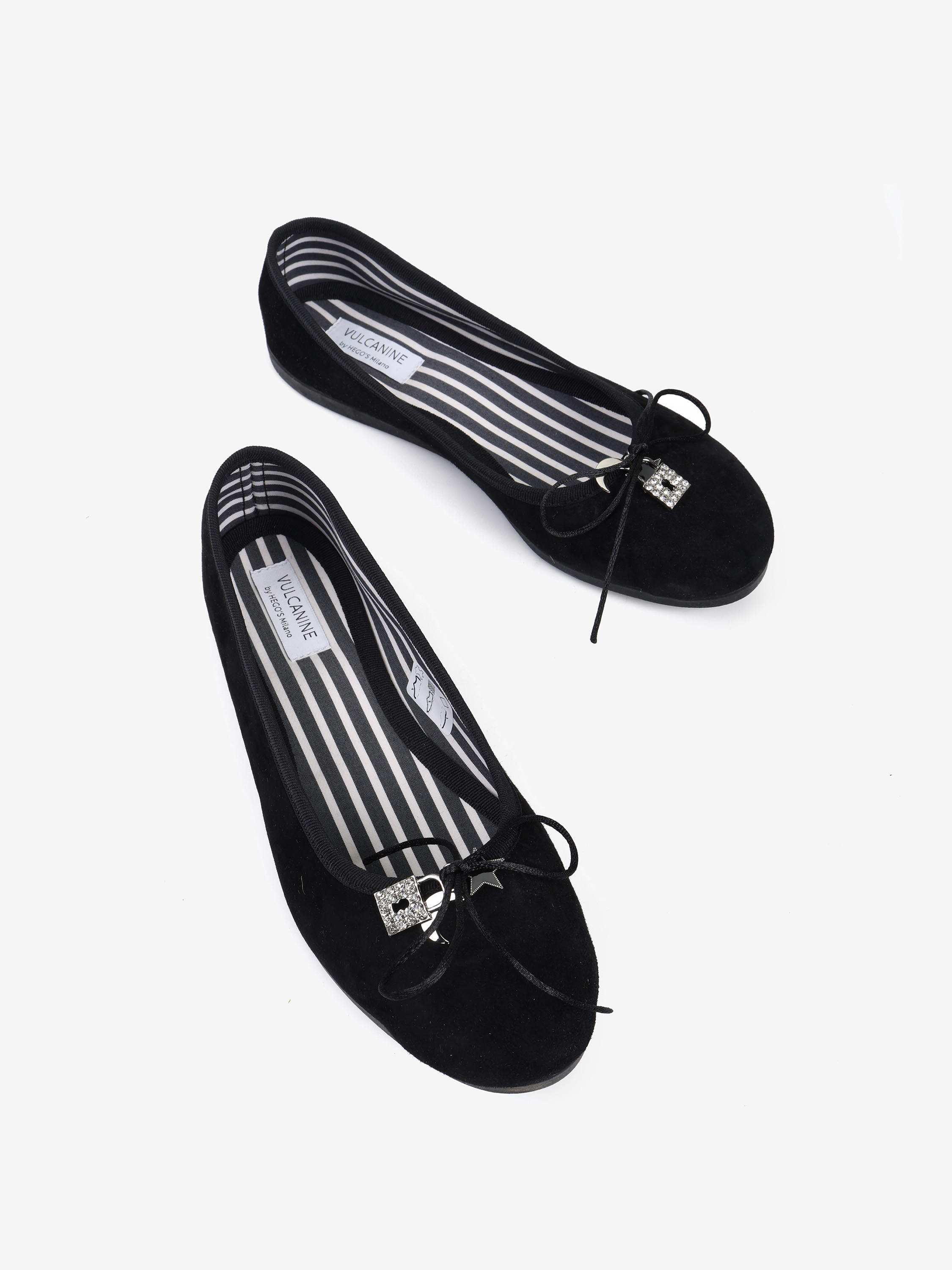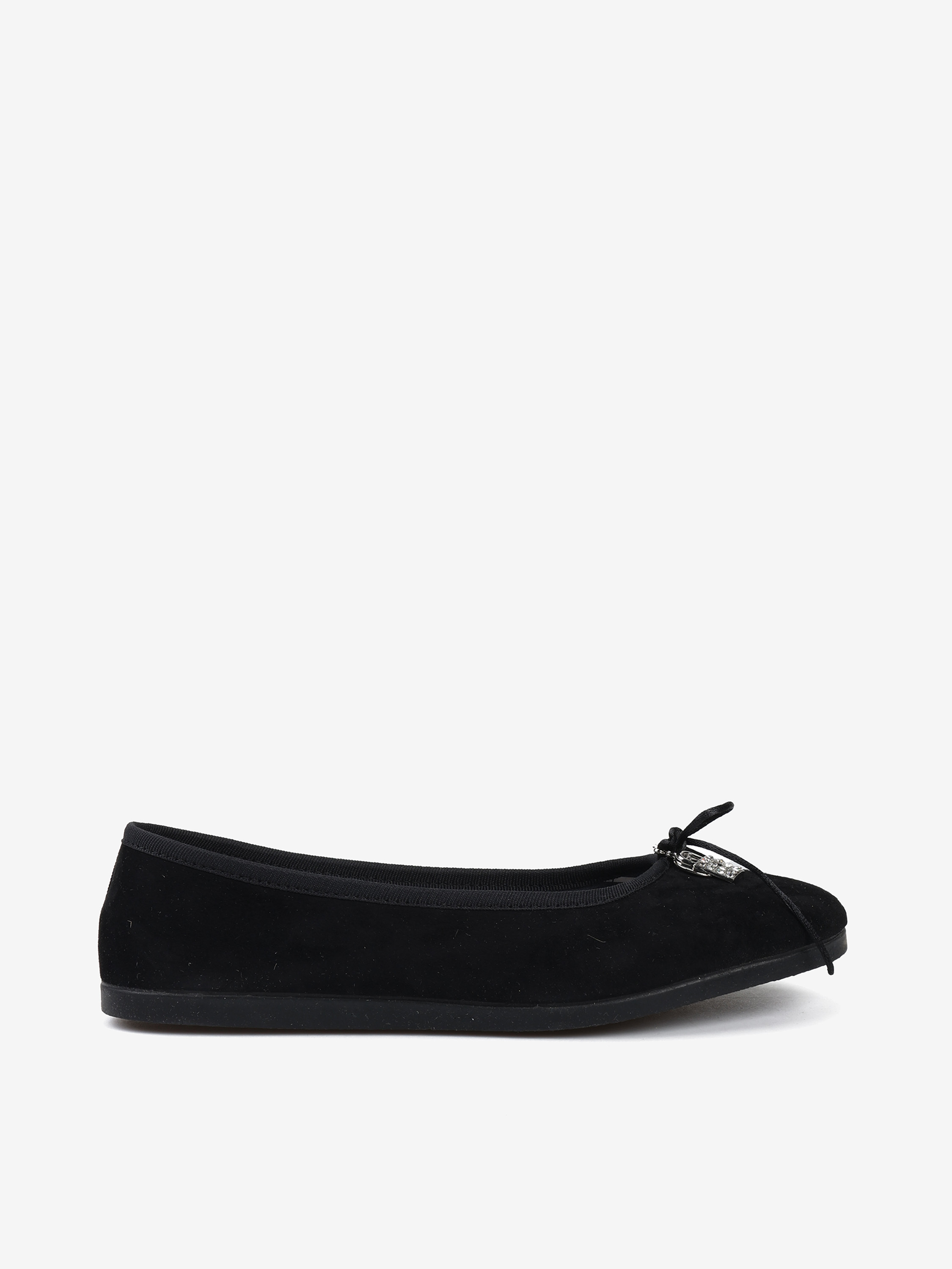 Zamszowe baleriny z regulowaną, wiązaną kokardką i ozdobnymi przywieszkami.