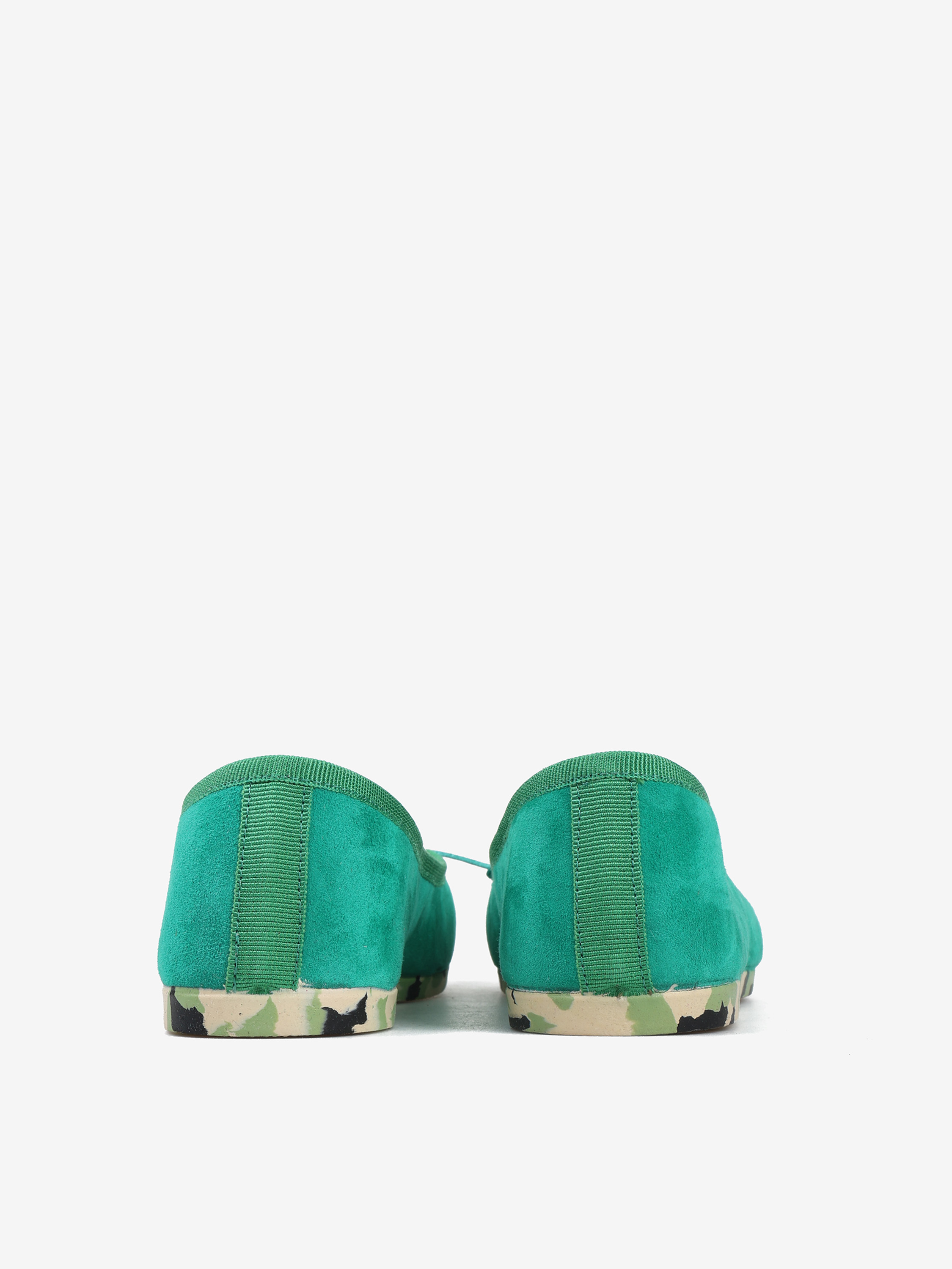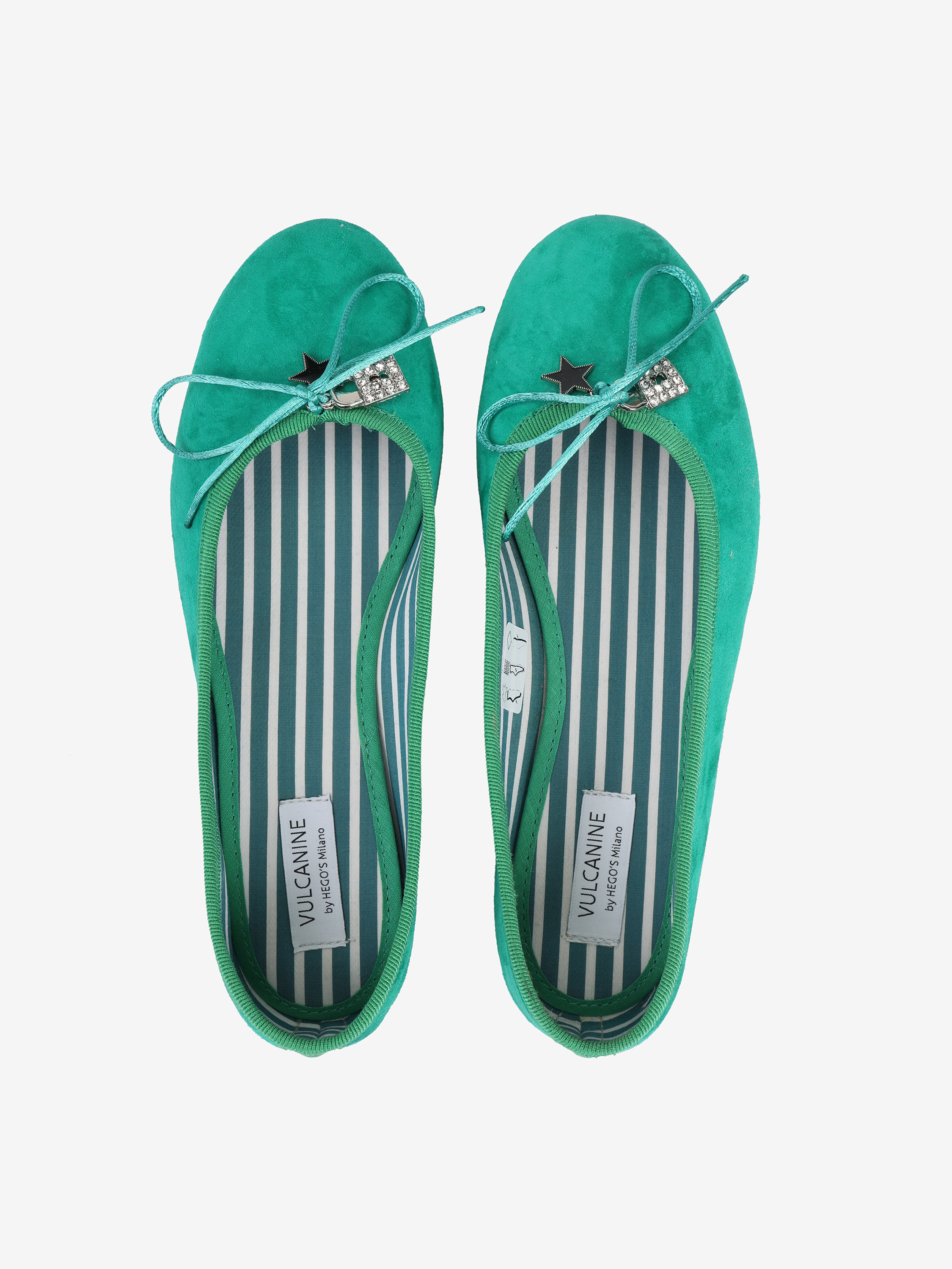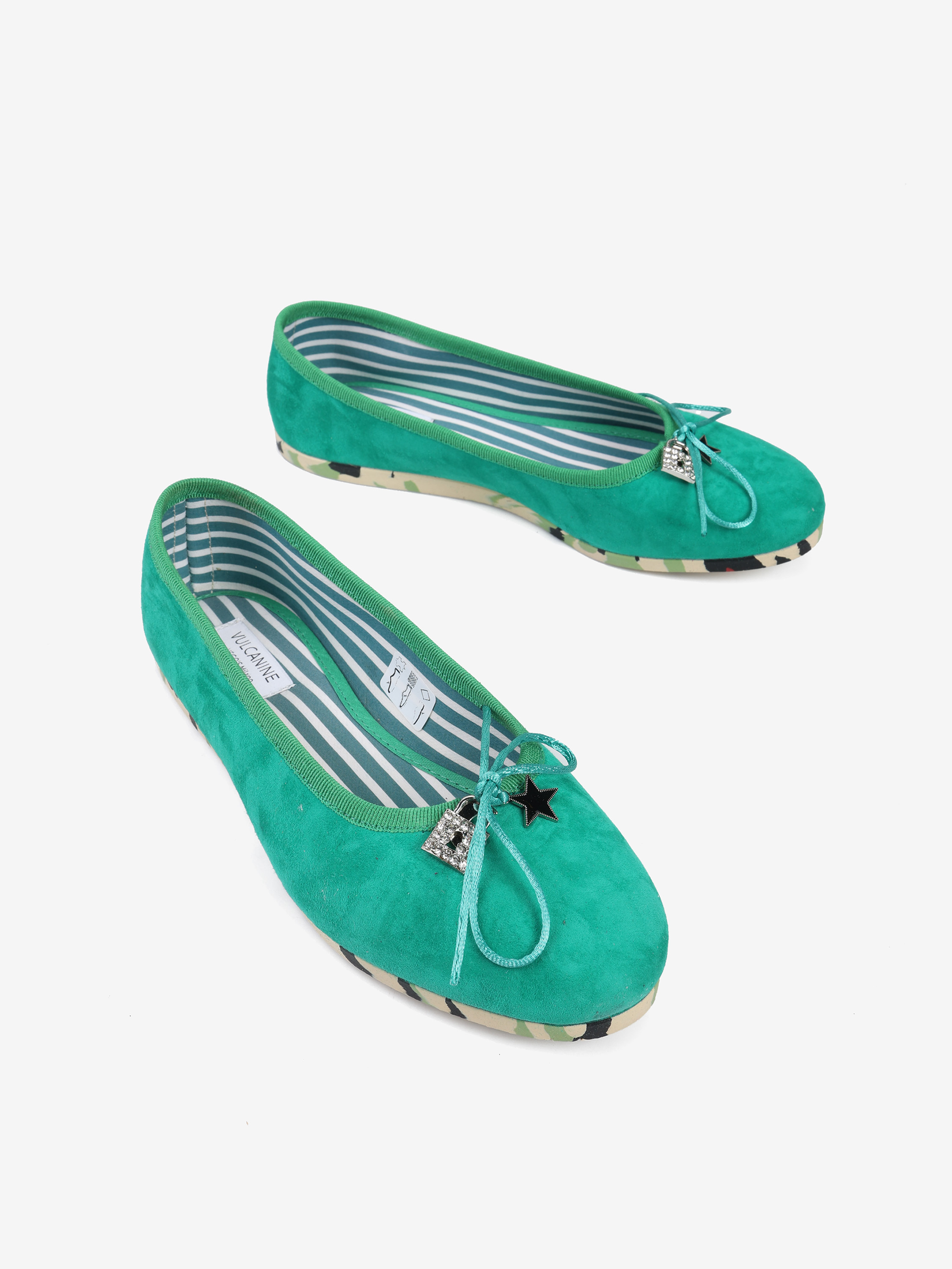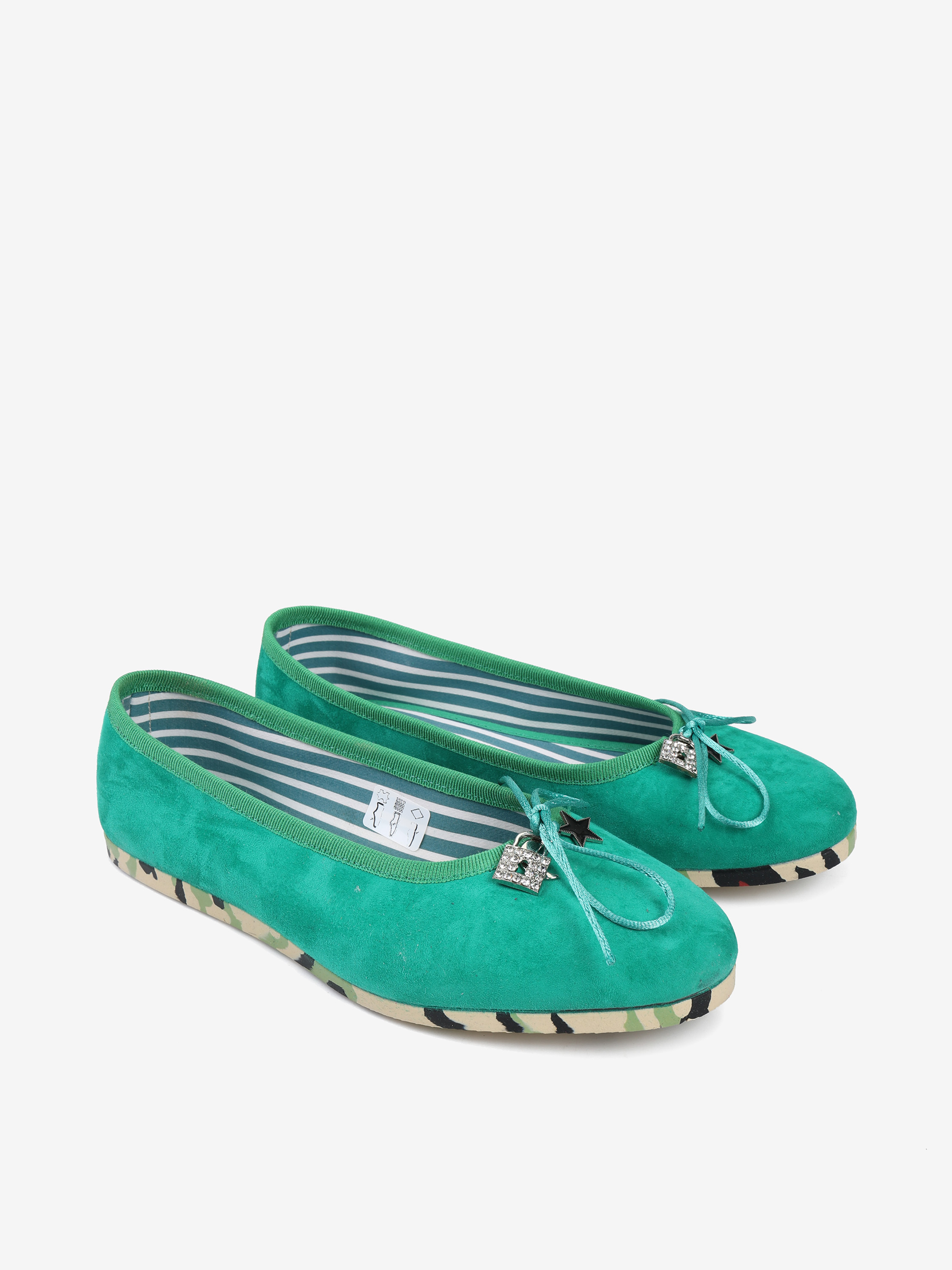 Zamszowe baleriny z regulowaną, wiązaną kokardką i ozdobnymi przywieszkami.