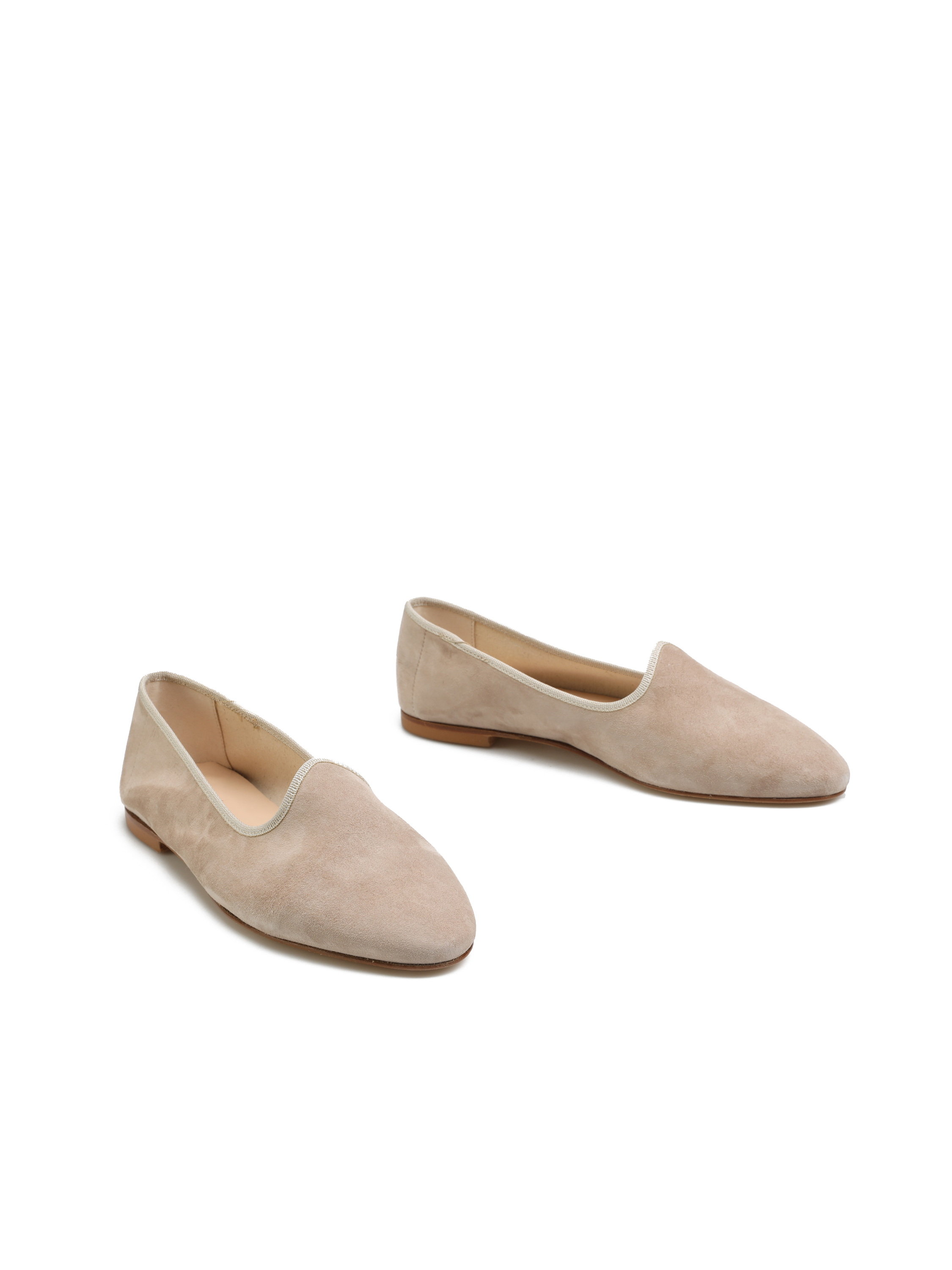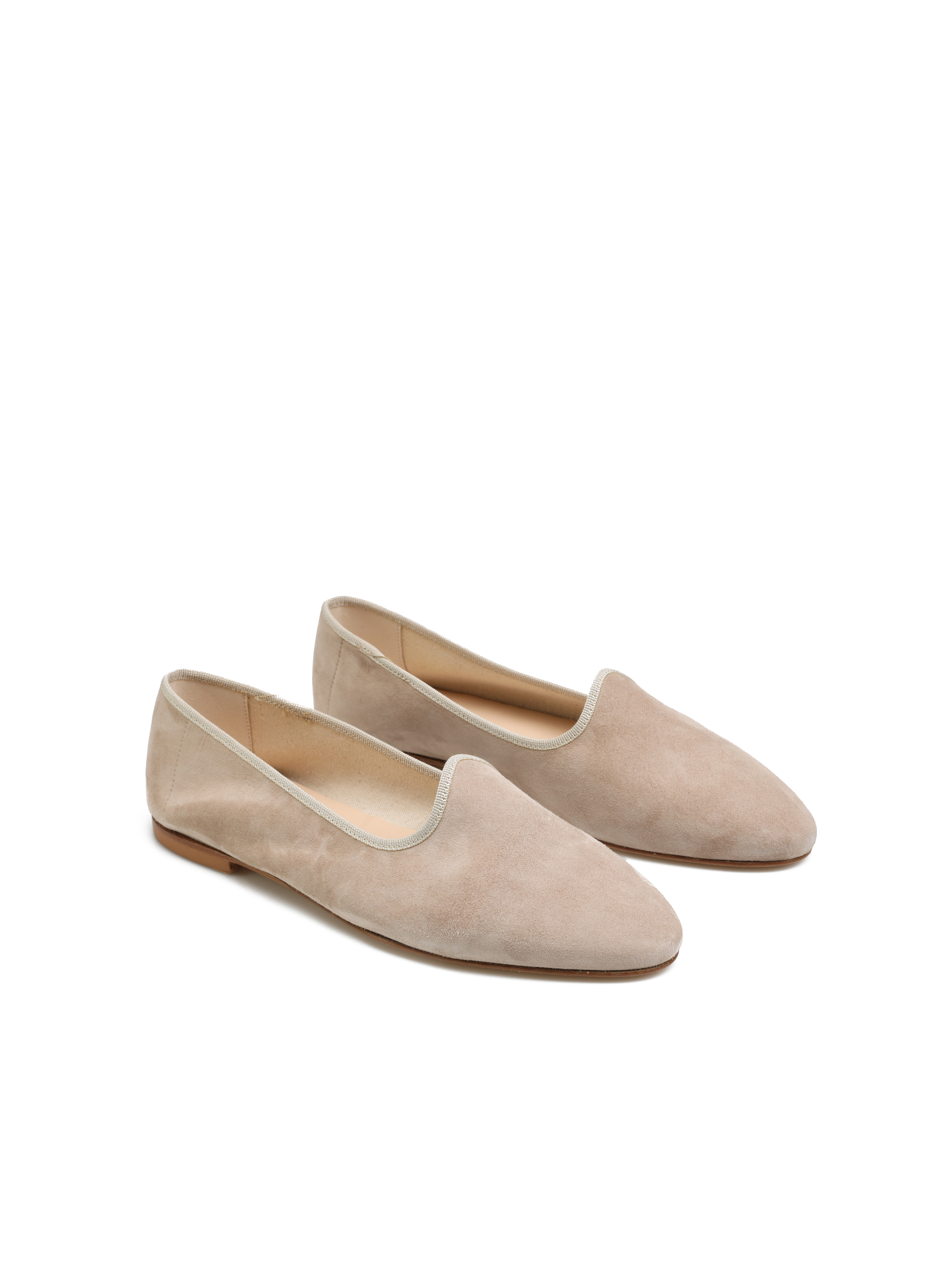 Baleriny na płaskim obcasie to model dla fanek wygodnego obuwia. Prosta, profilowana cholewka wykonana jest z naturalnej skóry zamszowej. Futrówka z tkaniny. Model uzupełniony został o materiałową lamówkę w kolorze cholewki. Less is more.