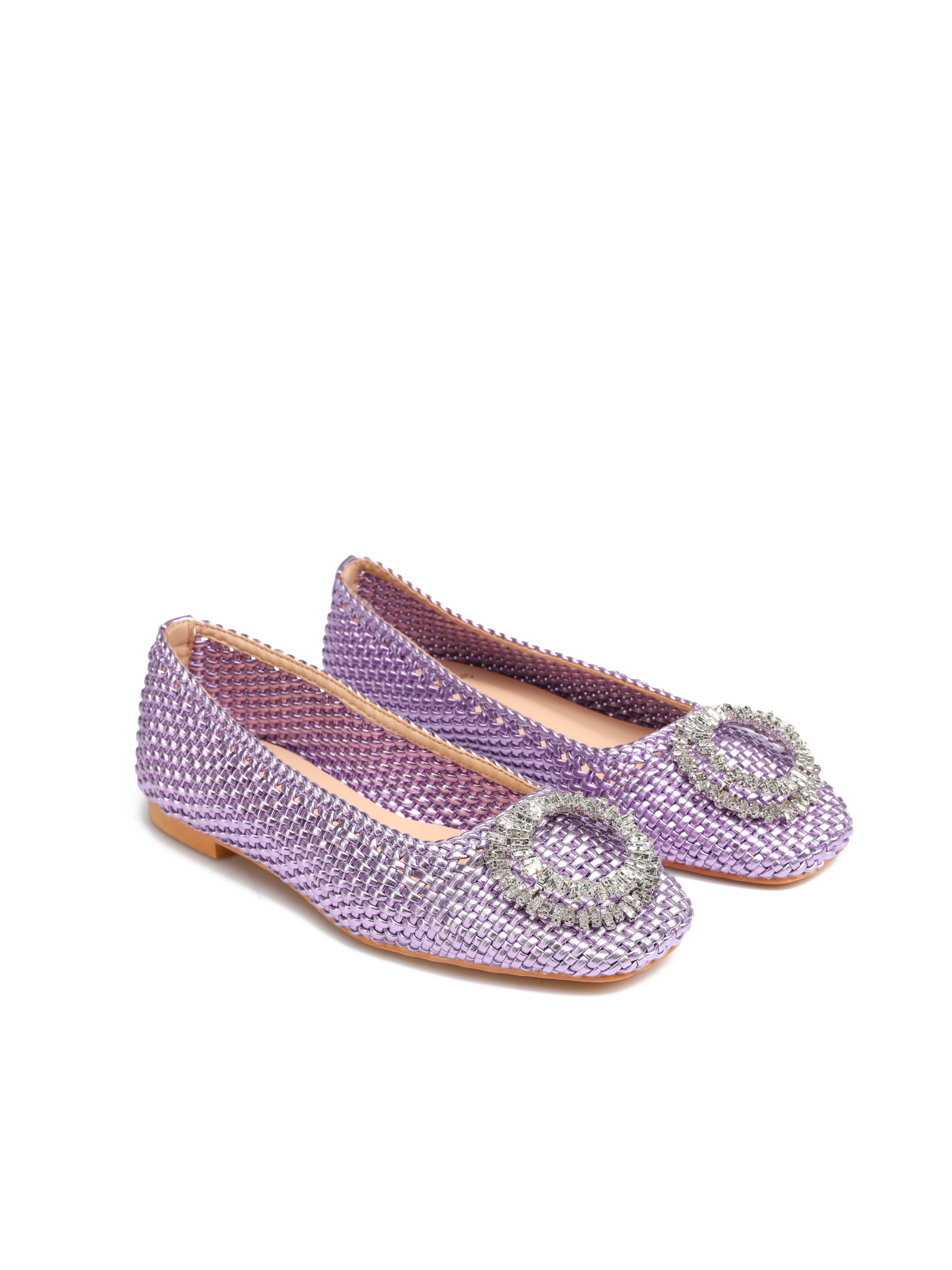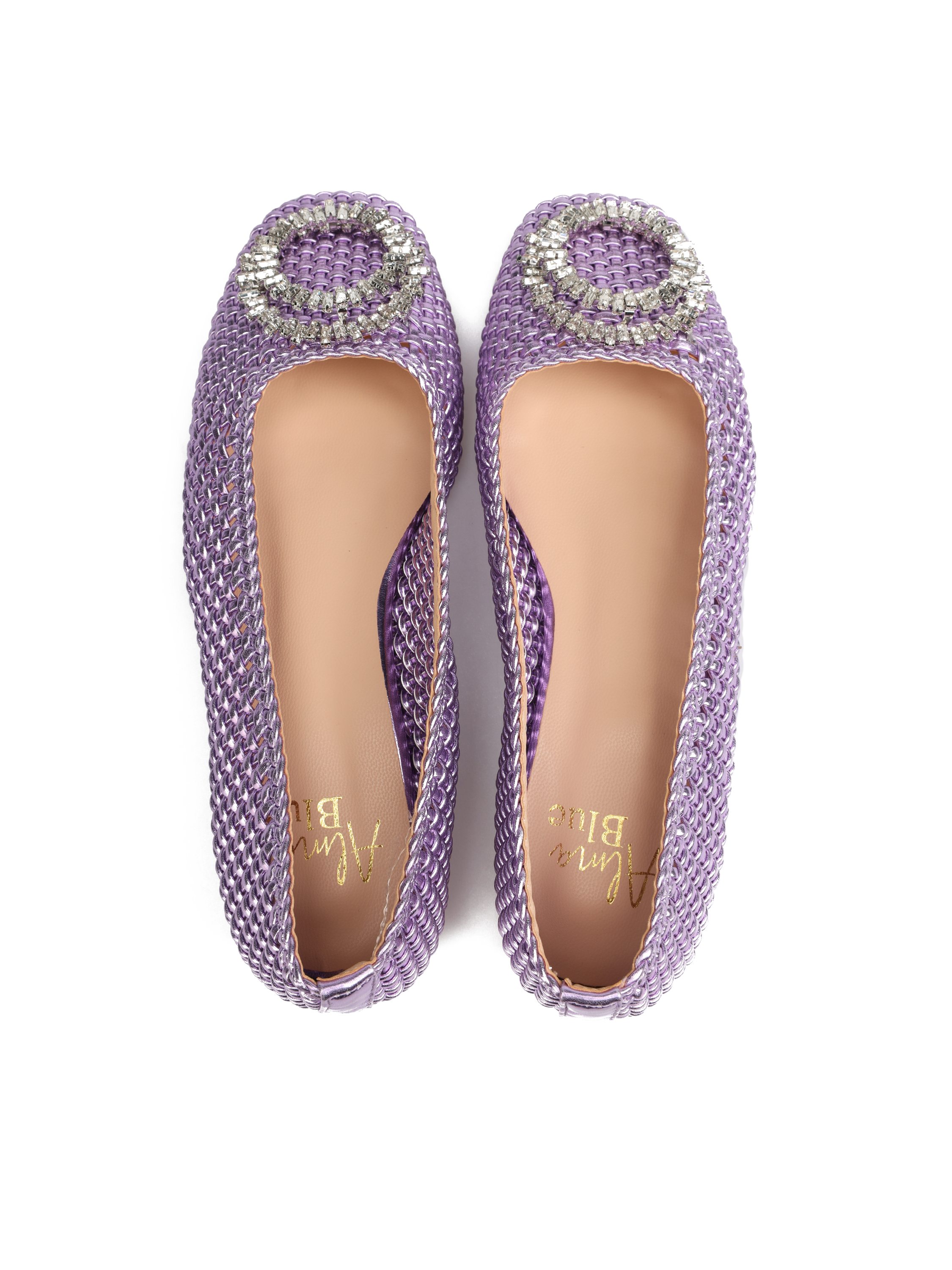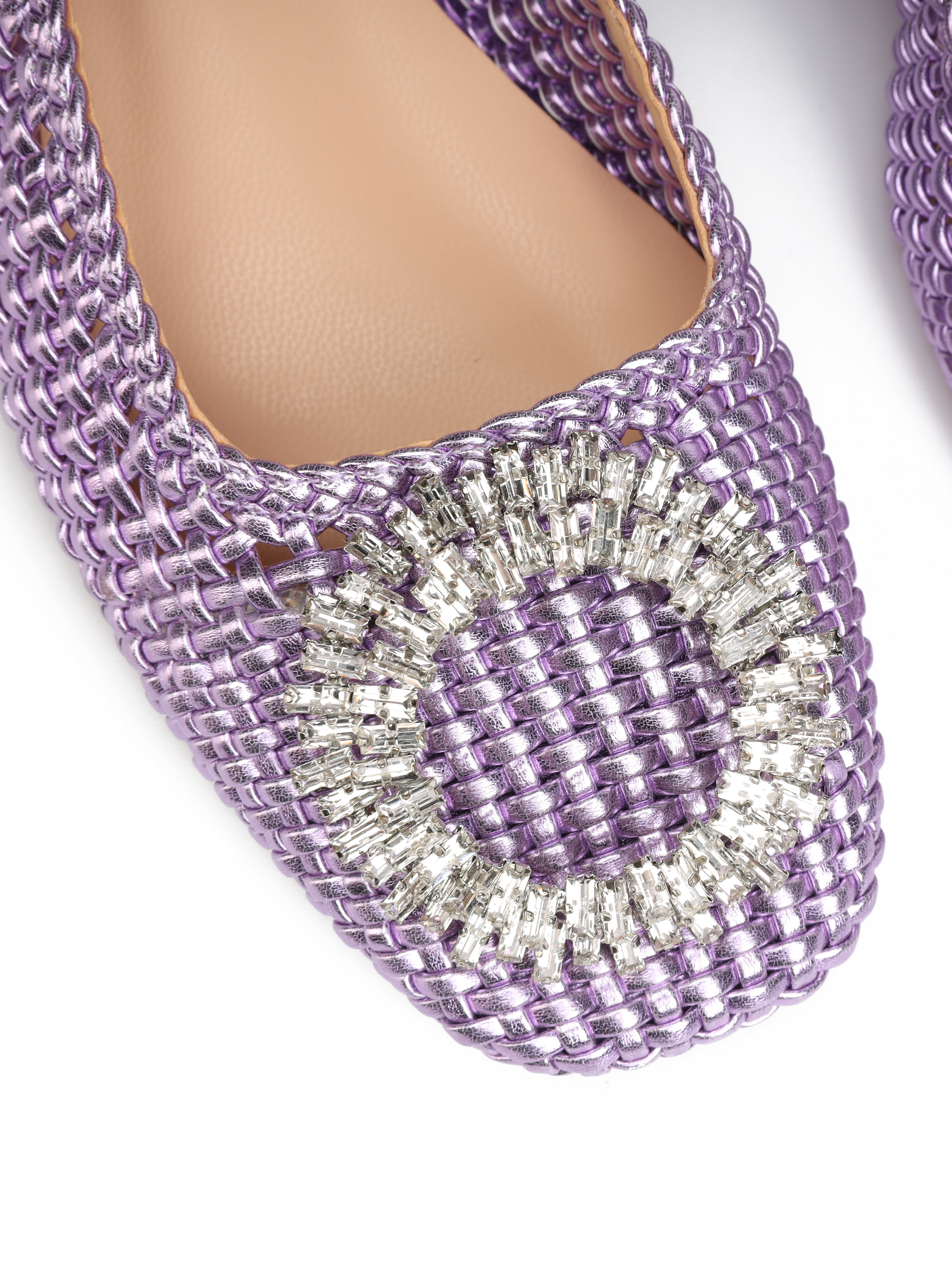 Baleriny damskie to HOT TREND sezonu. Zaprojektowane z najmodniejszej plecionki. Miękka wkładka i płaski obcas odpowiadają za wygodę i komfort noszenia butów przez cały dzień. Cholewka wzbogacona została o biżuteryjną broszkę z kamieni. Klasyczny fason w metalicznym odcieniu fioletu będzie ozdobą i dopełnieniem modnej garderoby kobiety.