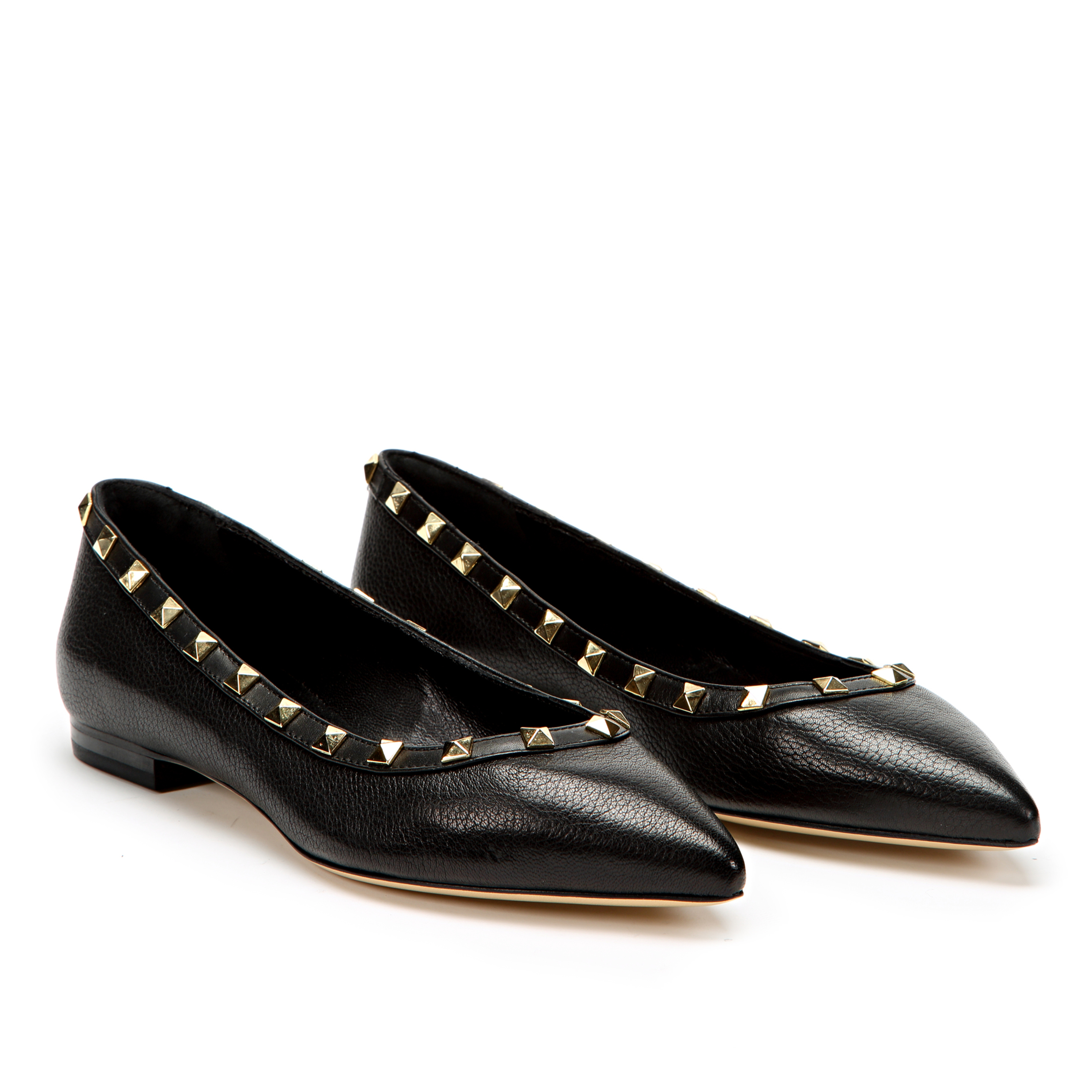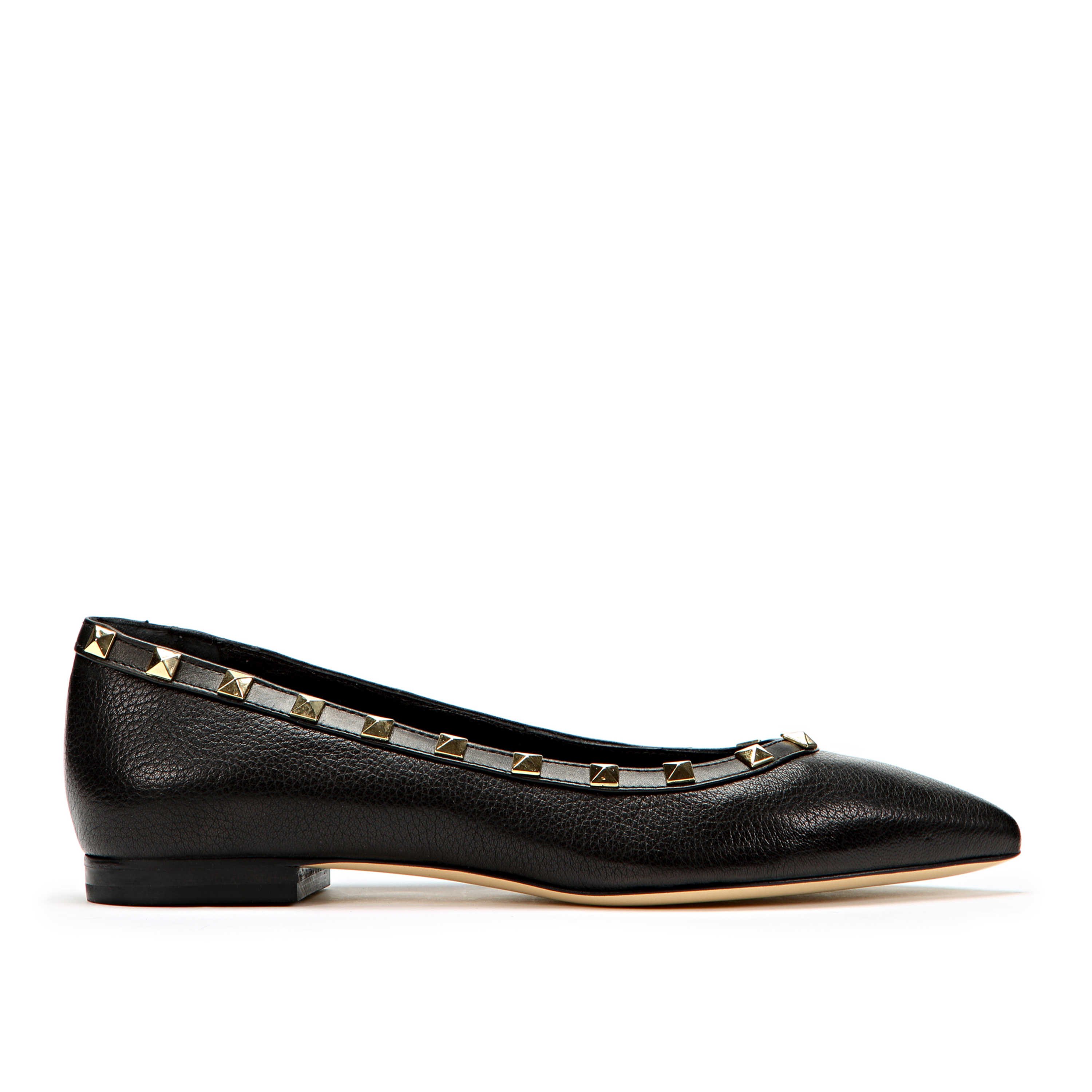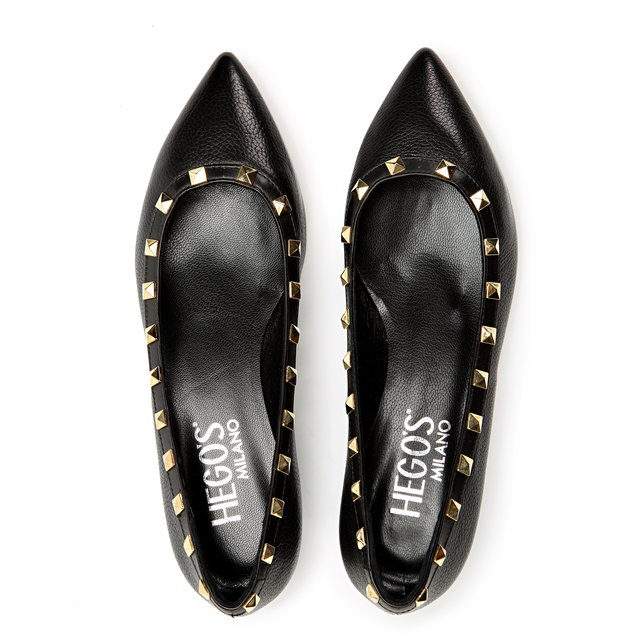 Czarne,szykowne baleriny wykonane ze skóry licowej.Lamówka wykończona ćwiekami w kolorze złota.