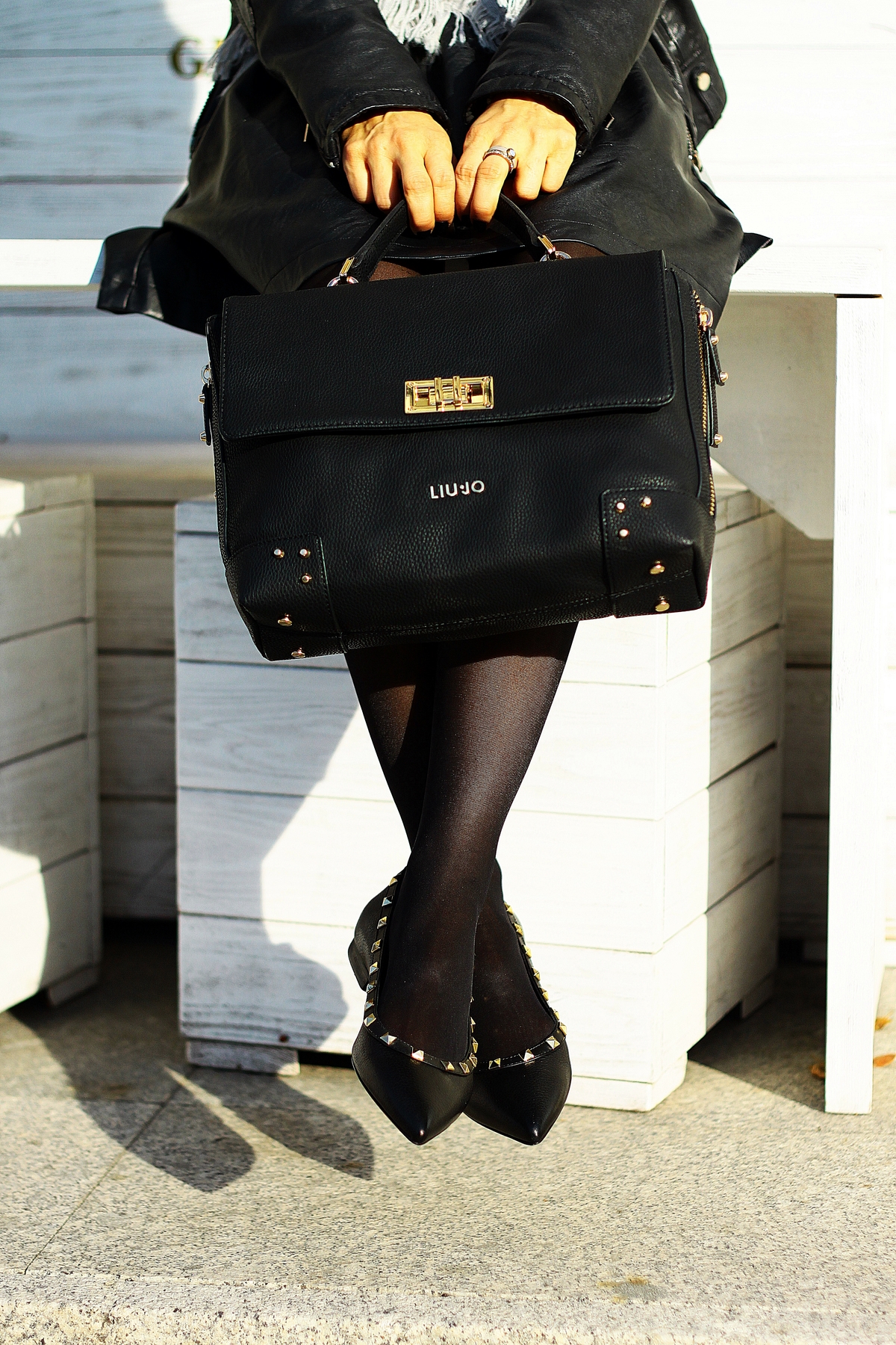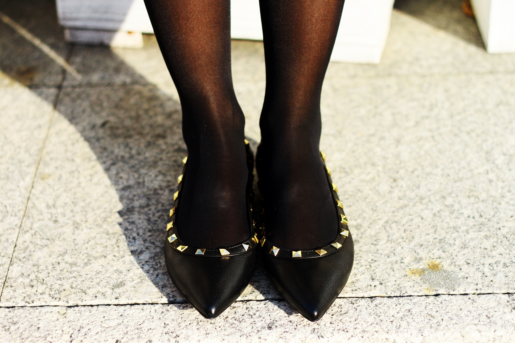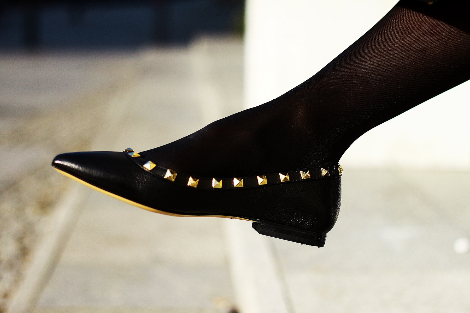Czarne,szykowne baleriny wykonane ze skóry licowej.Lamówka wykończona ćwiekami w kolorze złota.