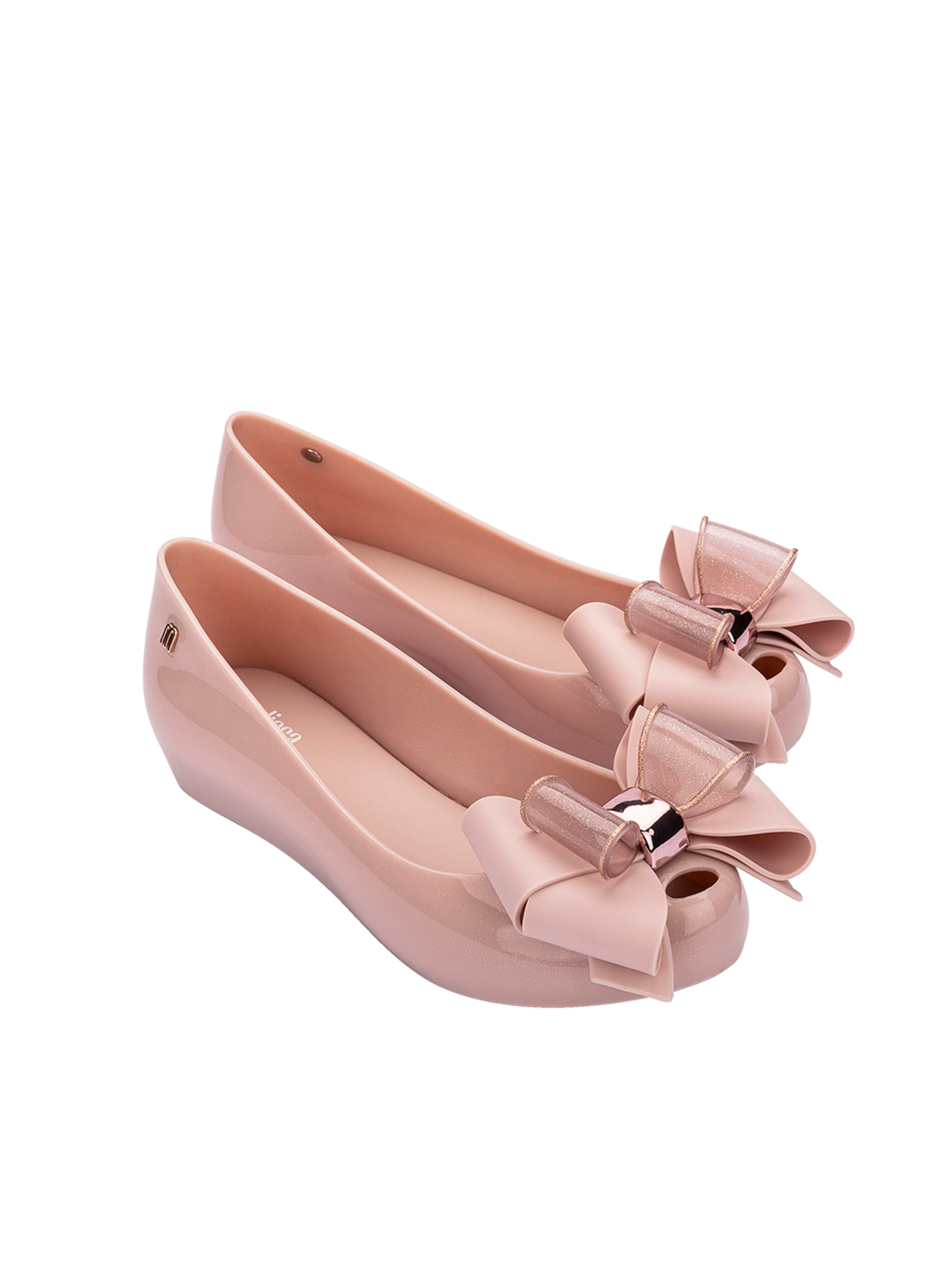 Baleriny Melissa Ultragirl wykonane są z aromatyzowanego, unikalnego tworzywa Mel-flex - mieszanki plastiku i kauczuku o charakterystycznym zapachu gumy balonowej. Buty na lekkim podwyższeniu na pięcie zapewniają komfort użytkowania i stabilizację. Baleriny Melissa są wykonane bez materiałów pochodzenia zwierzęcego, kauczuk pod wpływem ciepła dopasowuje się do stopy. Buty nie obcierają i nie odparzają, są bardzo wygodne i wodoodporne. Model wzbogacony został o dużą kokardę na przodzie.
