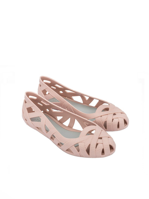 Kultowy model balerin Melissa Jason Wu. Wykonane w całości z wodoodpornego materiału Mel-Flex - mieszanki plastiku i kauczuku o charakterystycznym zapachu gumy balonowej. Miękkie, lekkie i wygodne. Plecione paski przylegają i dopasowują się do stopy. Profilowana, elastyczna wkładka odpowida za komfort użytkowania obuwia przez cały dzień.