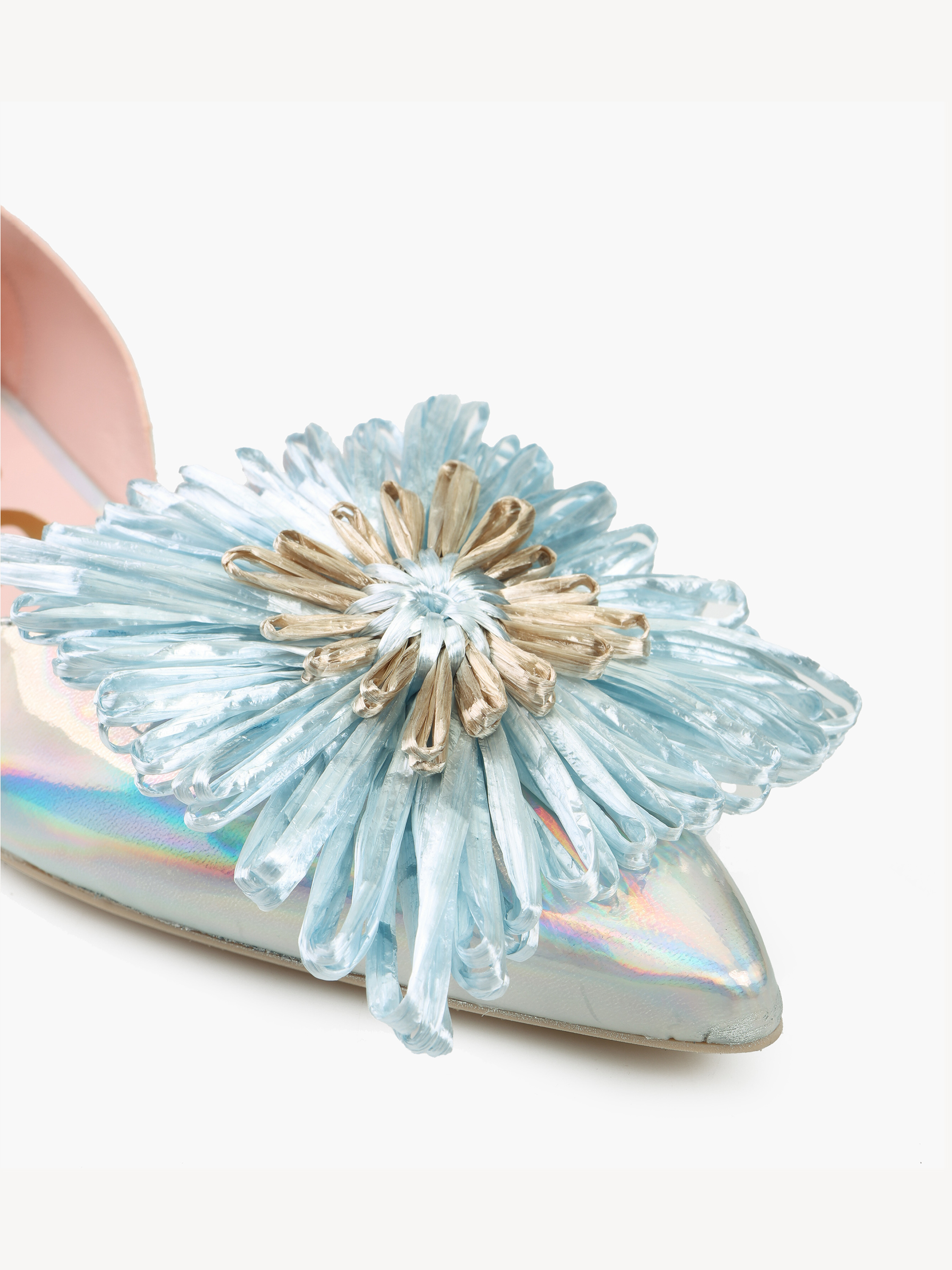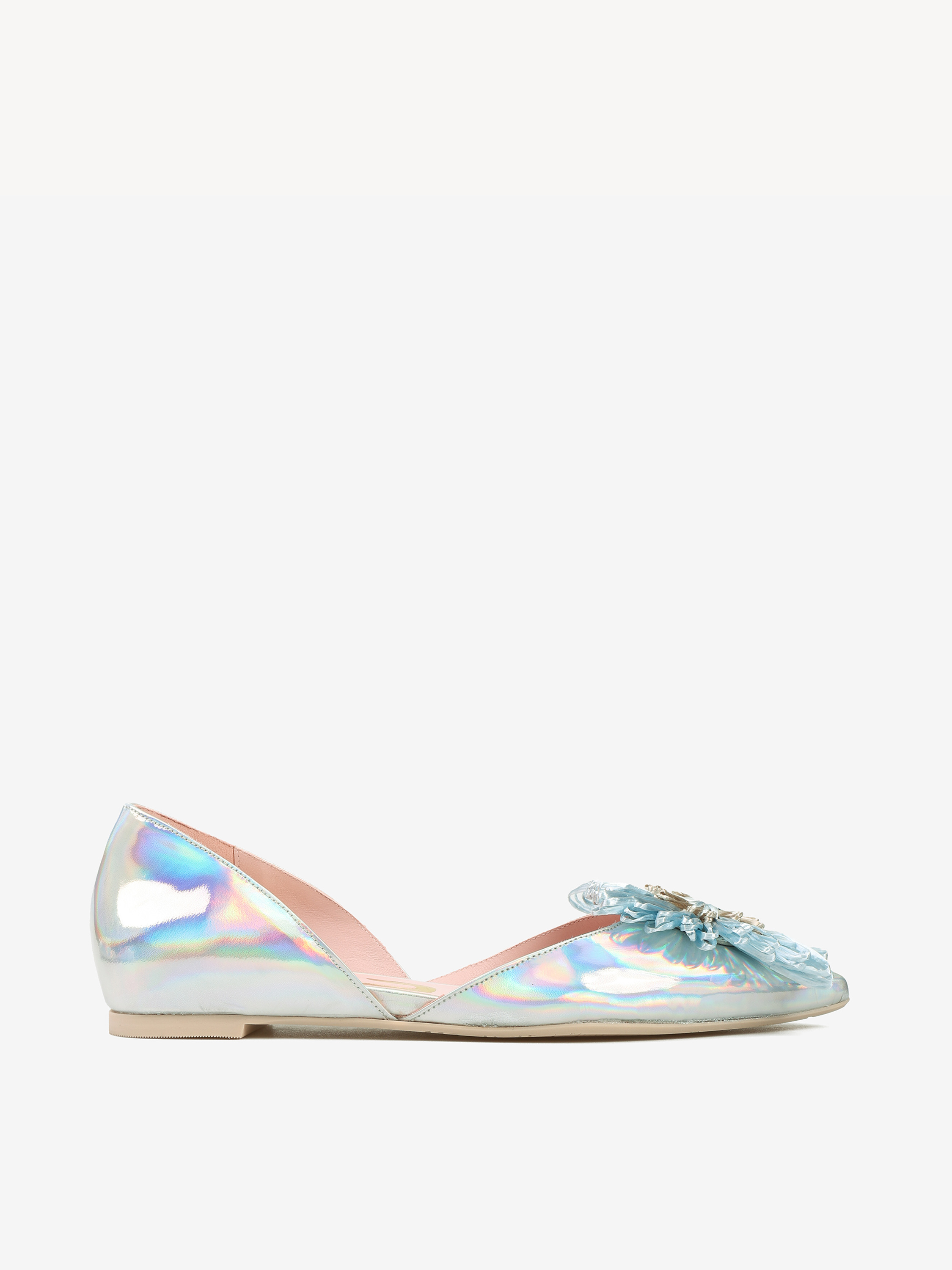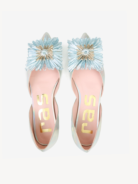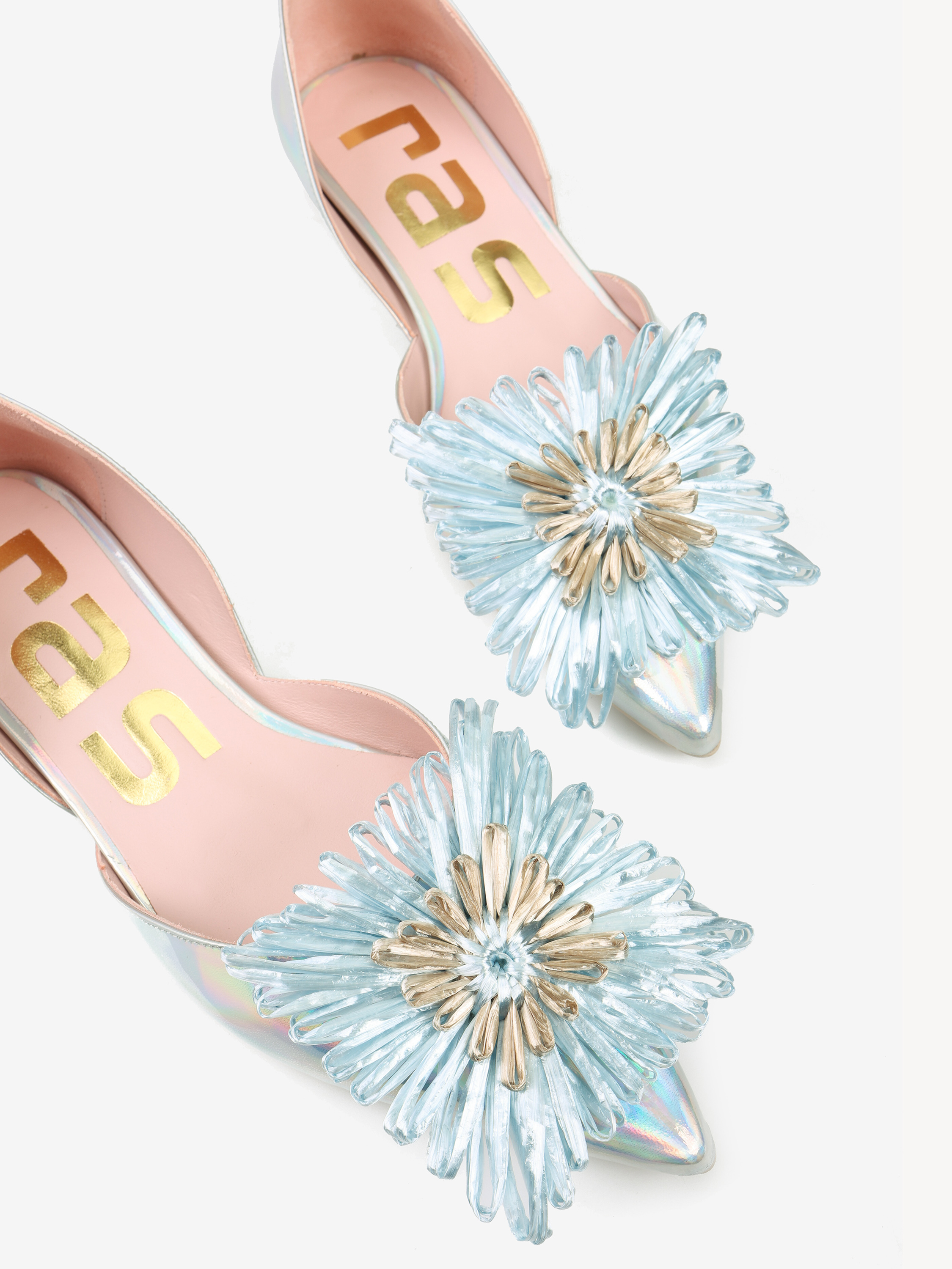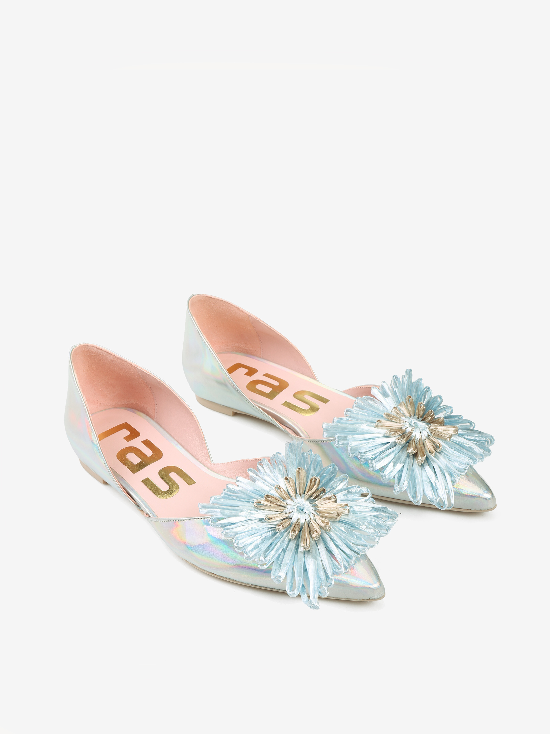 Metaliczne baleriny RAS z noskiem w szpic i głębokim wycięciem. Ozdobny kwiat.