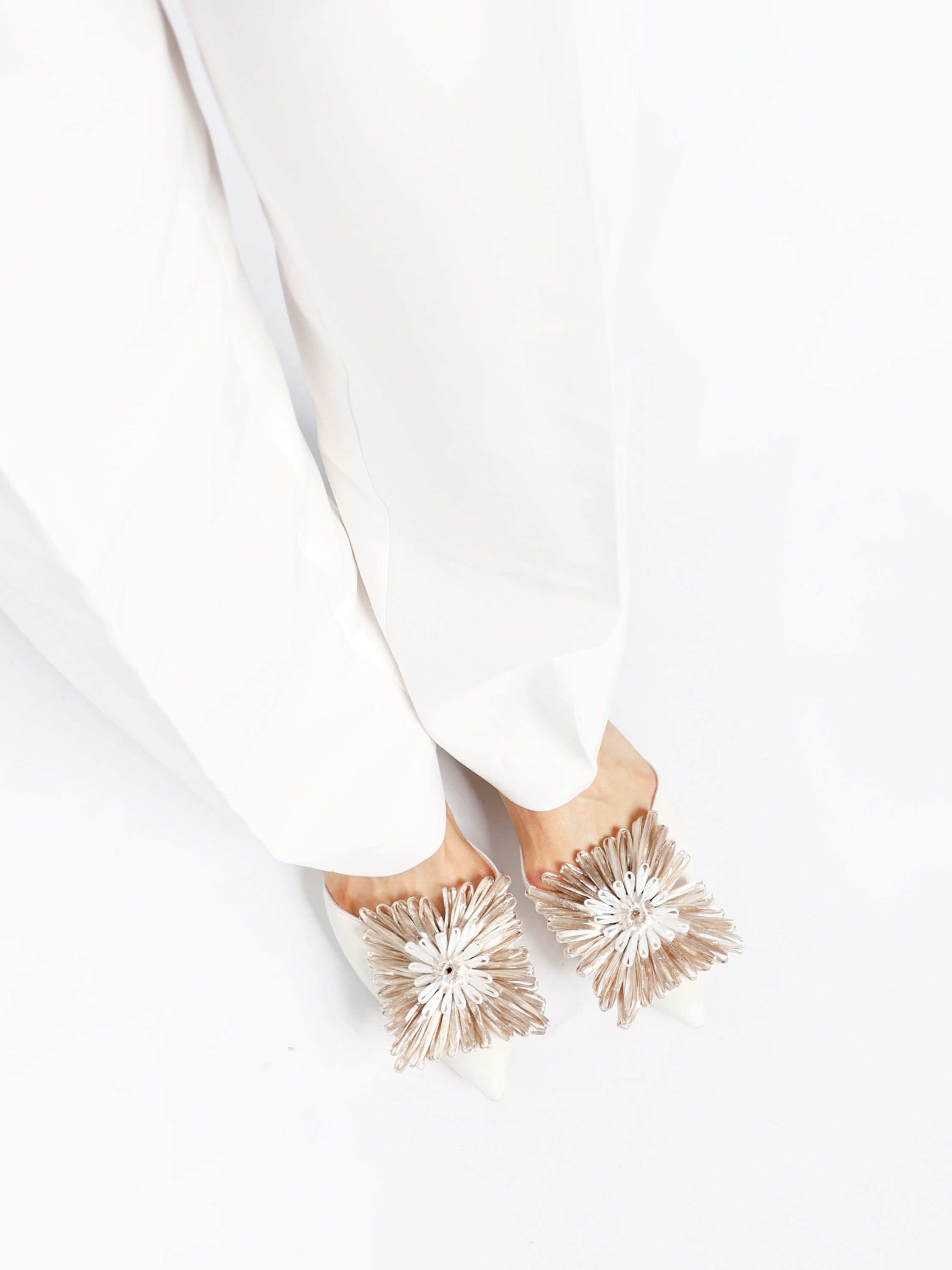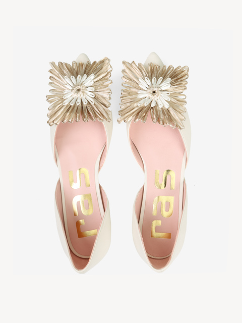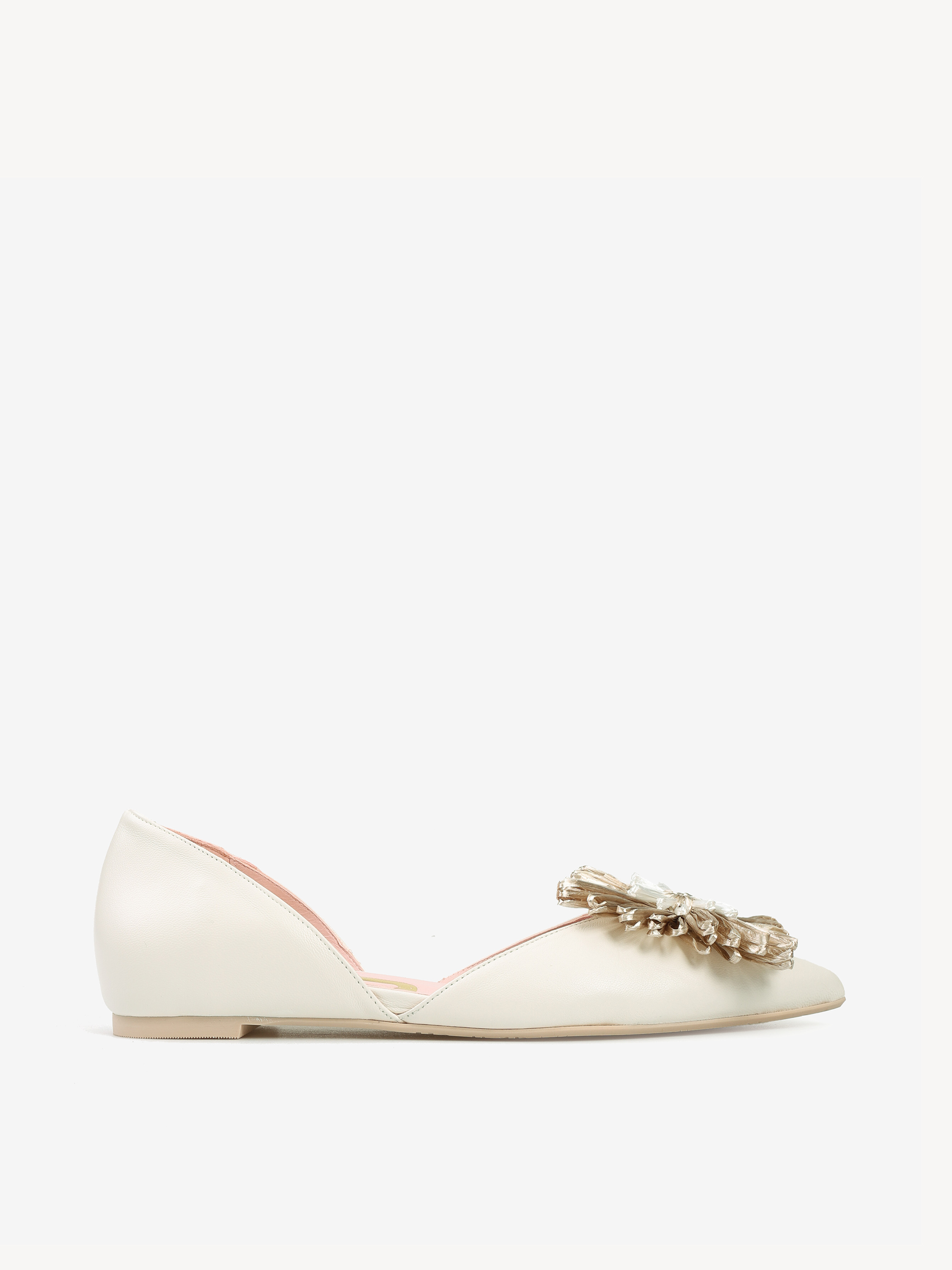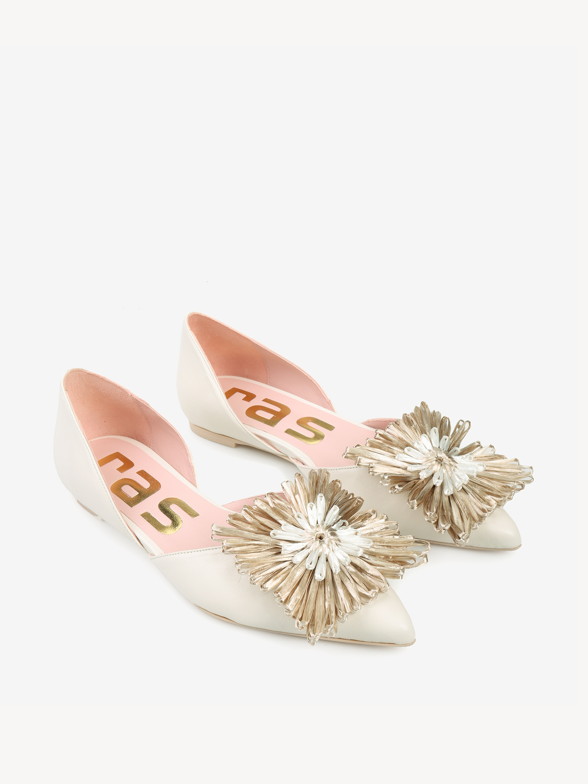 Baleriny RAS z noskiem w szpic i głębokim wycięciem. Ozdobny kwiat.