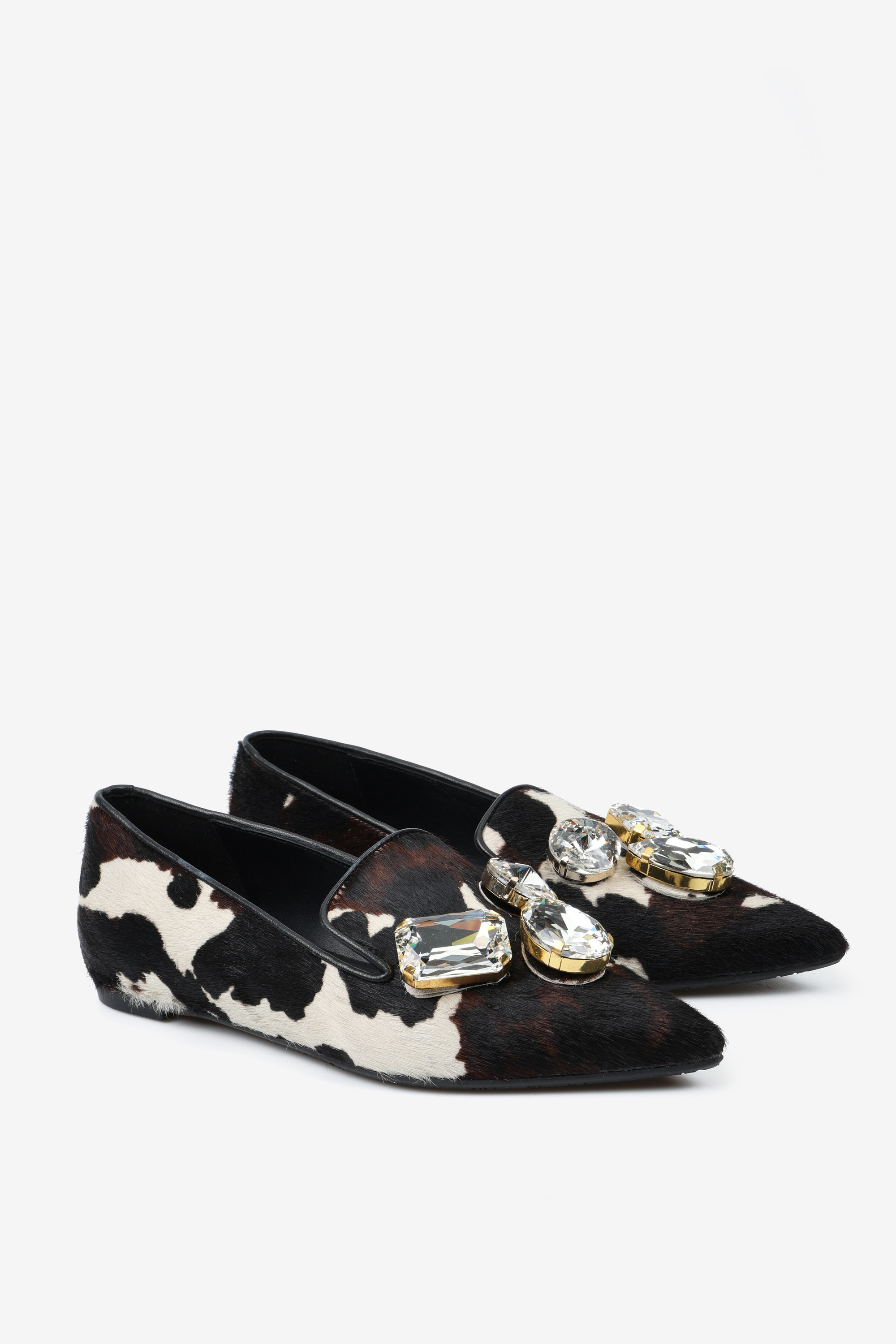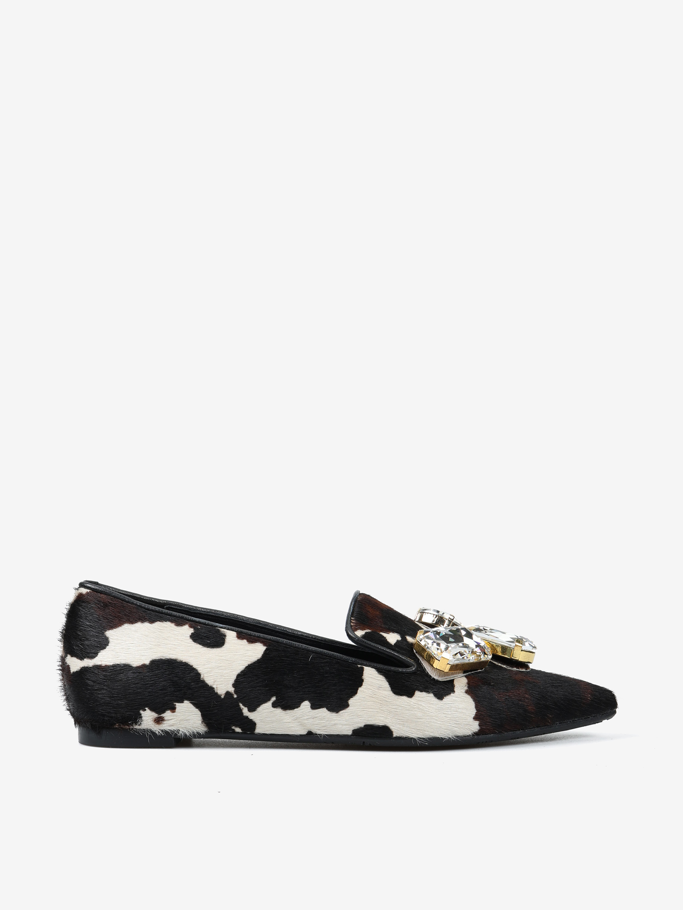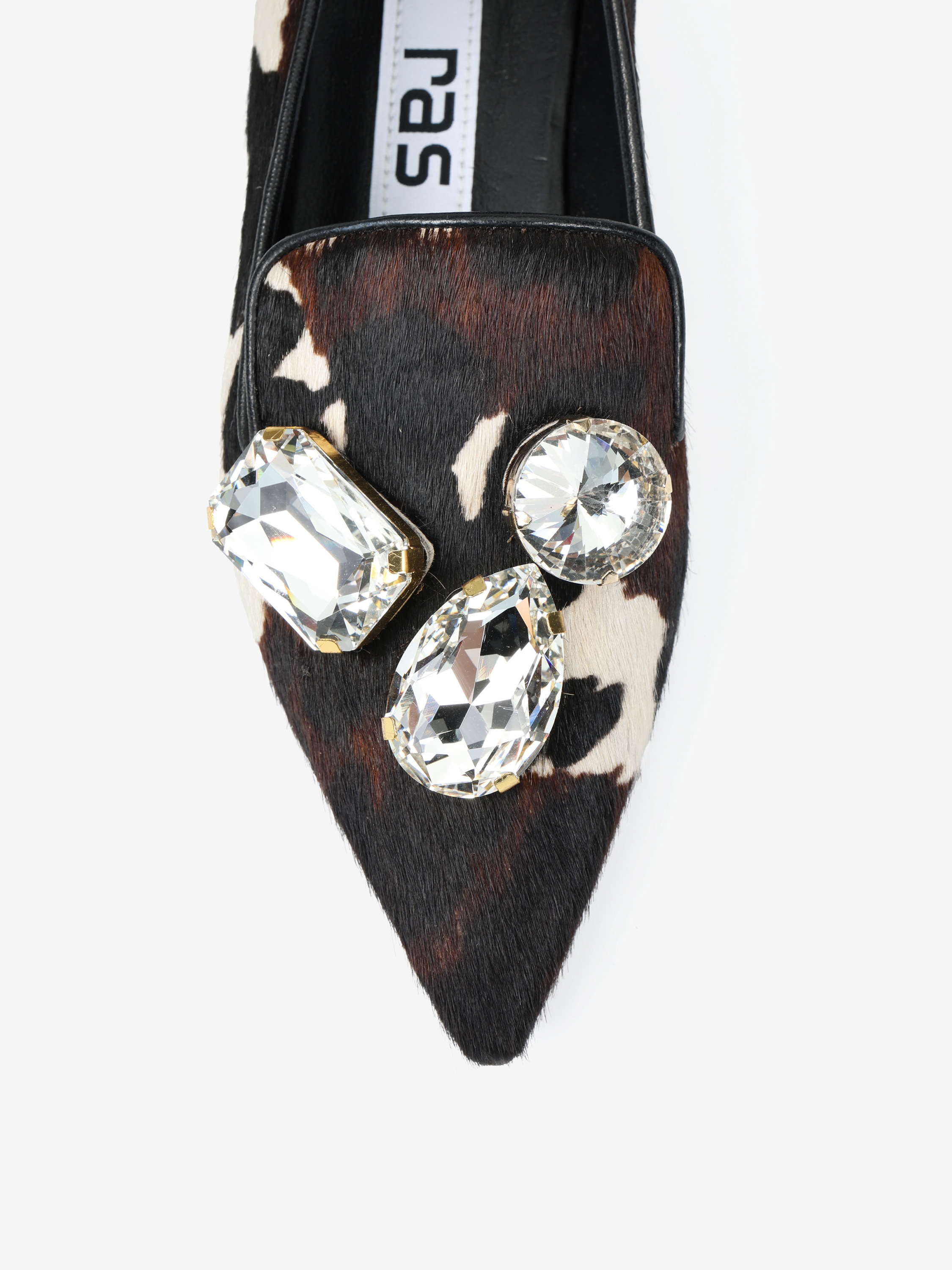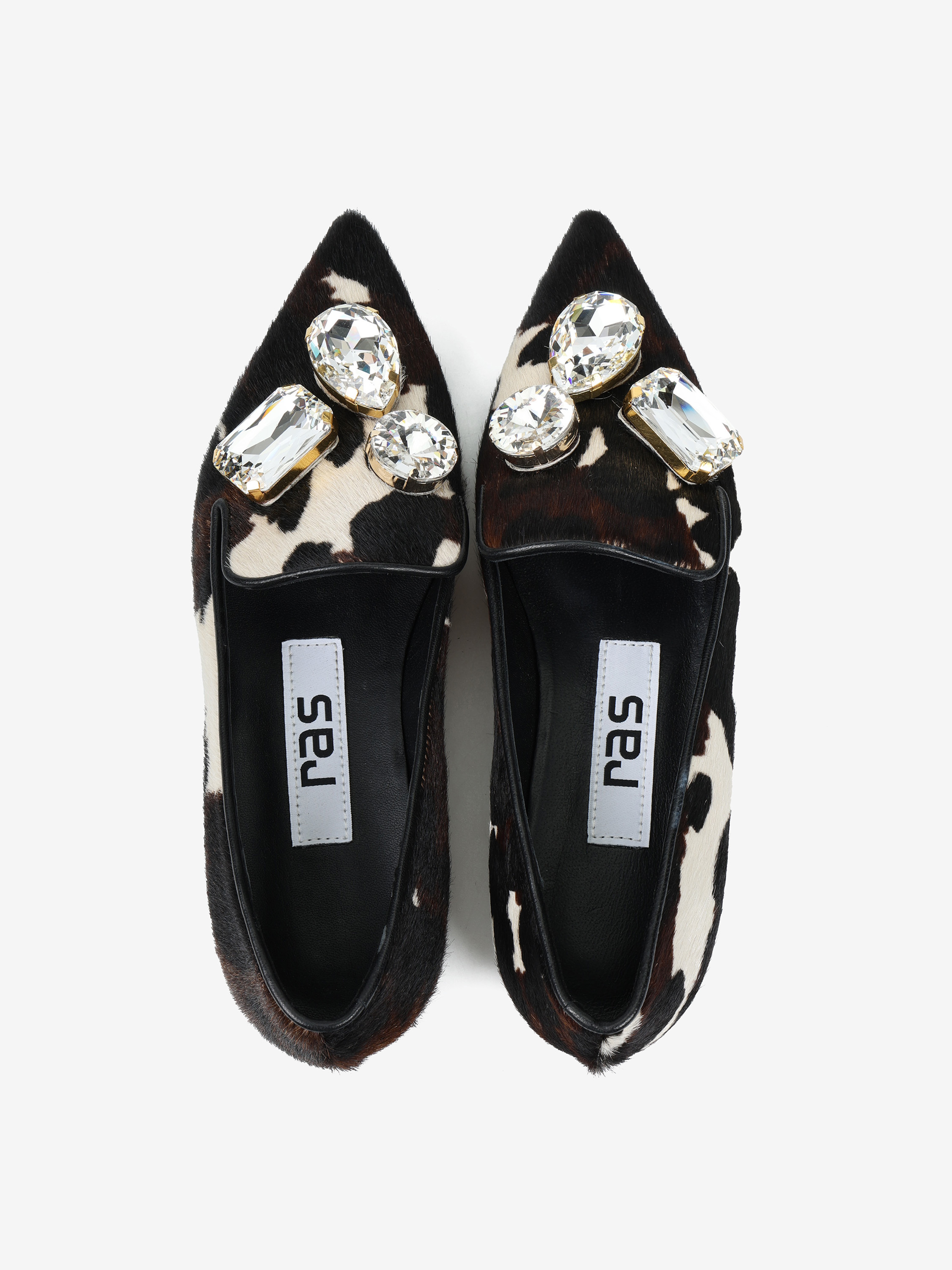 Baleriny RAS wykonane z naturalnej skóry z włosiem w zwierzęcy wzór. Nosek w szpic z ozdobnymi kamieniami.