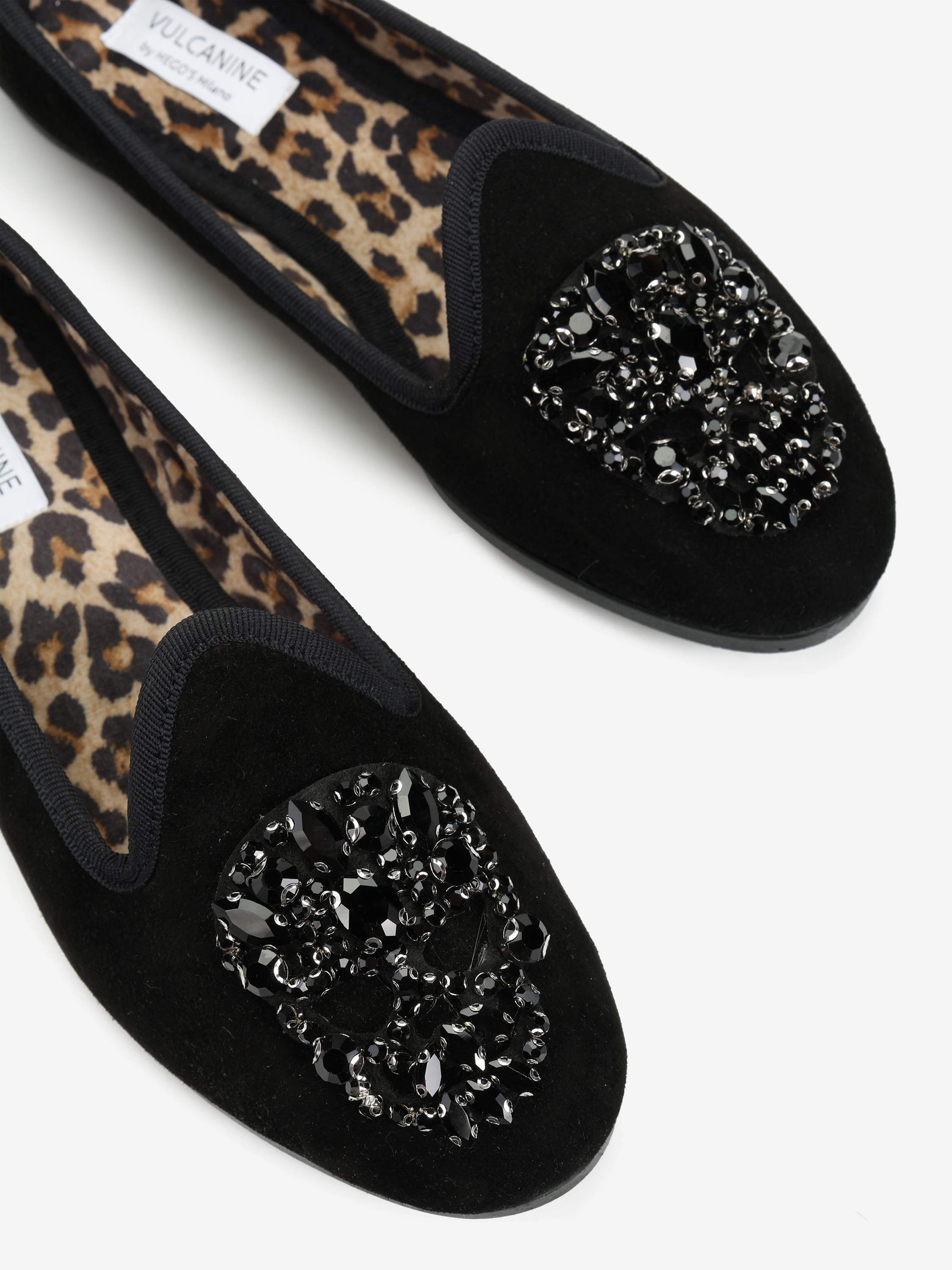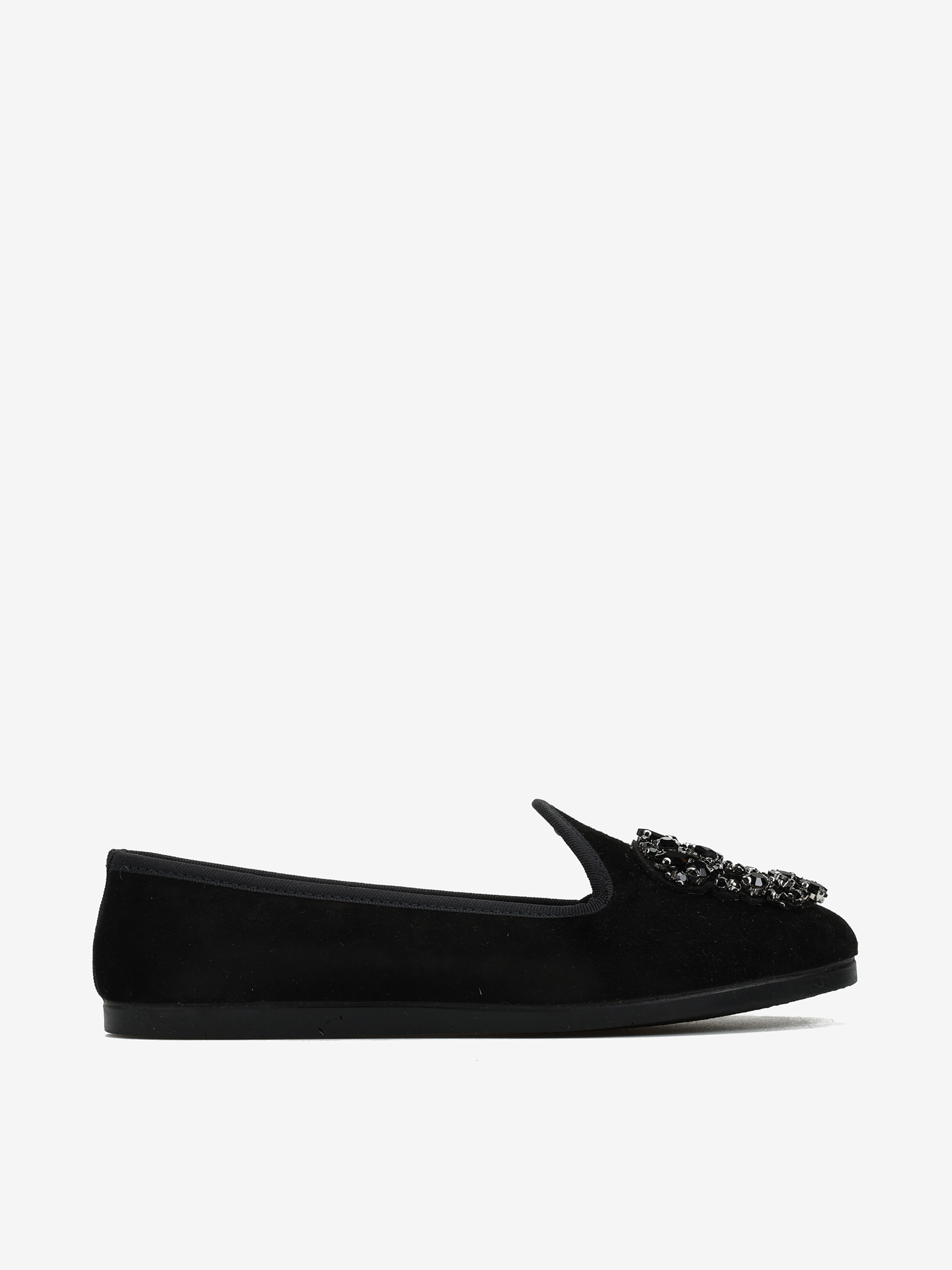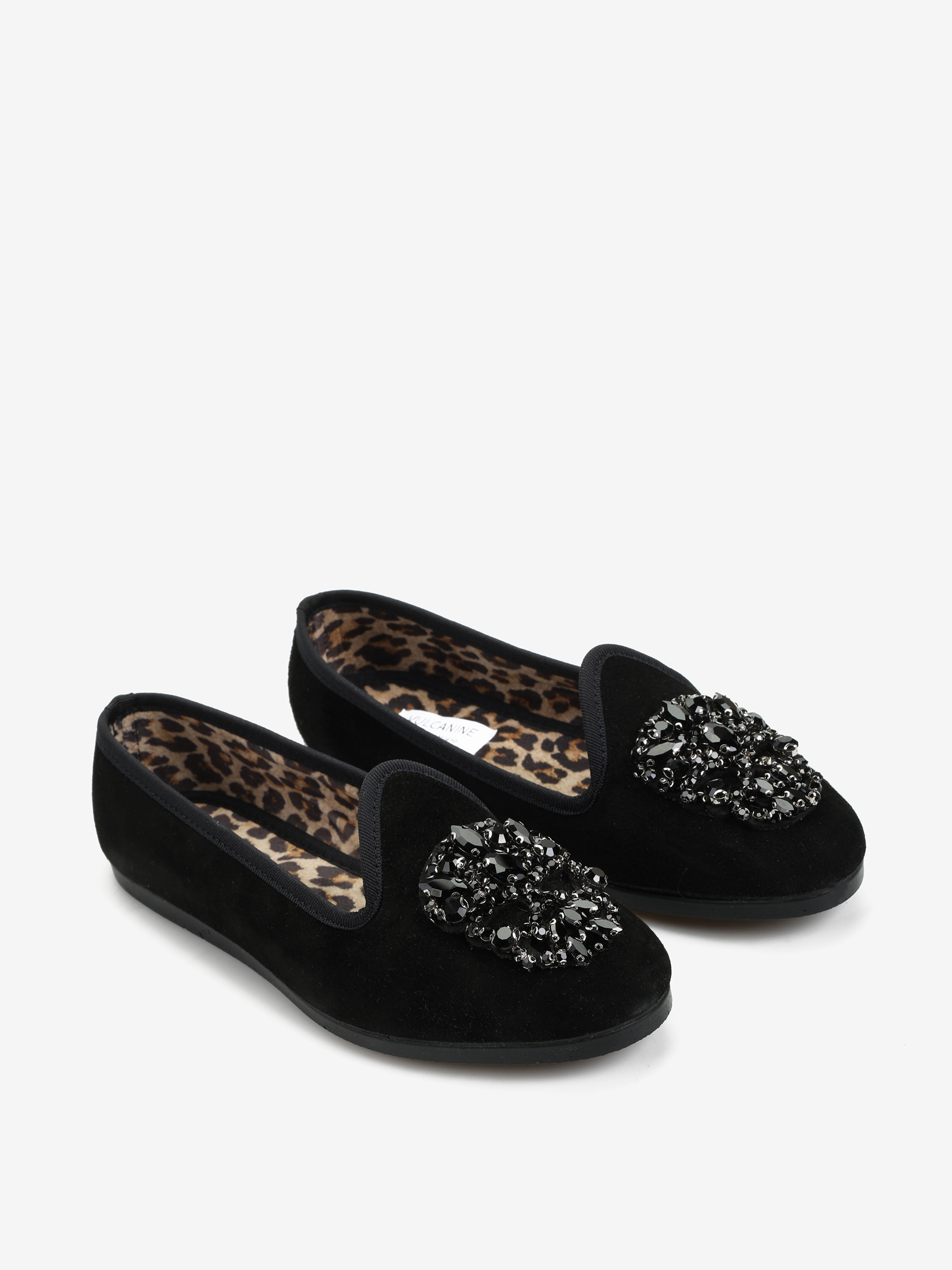 Miękkie, zamszowe baleriny z biżuteryjną aplikacją.