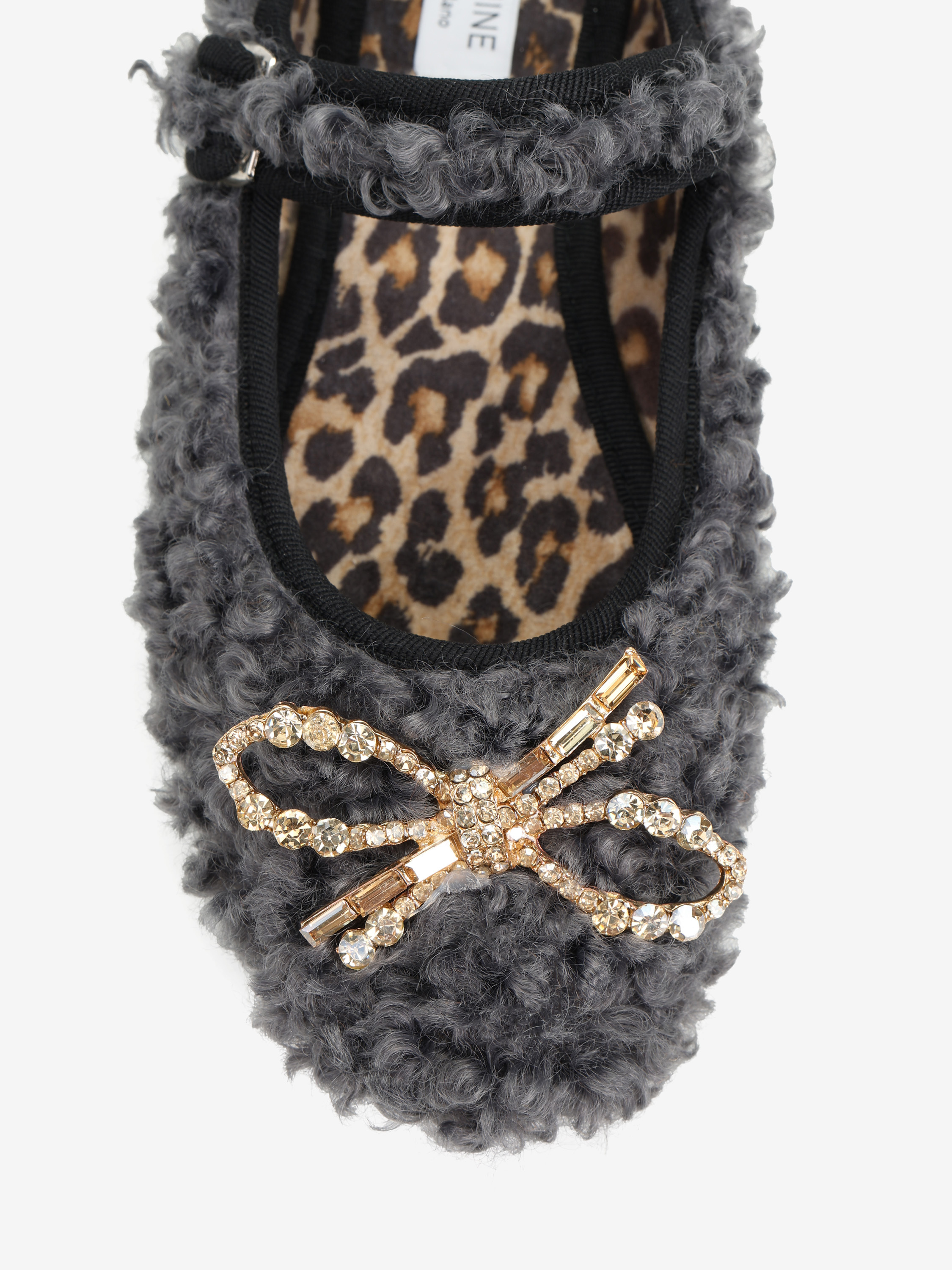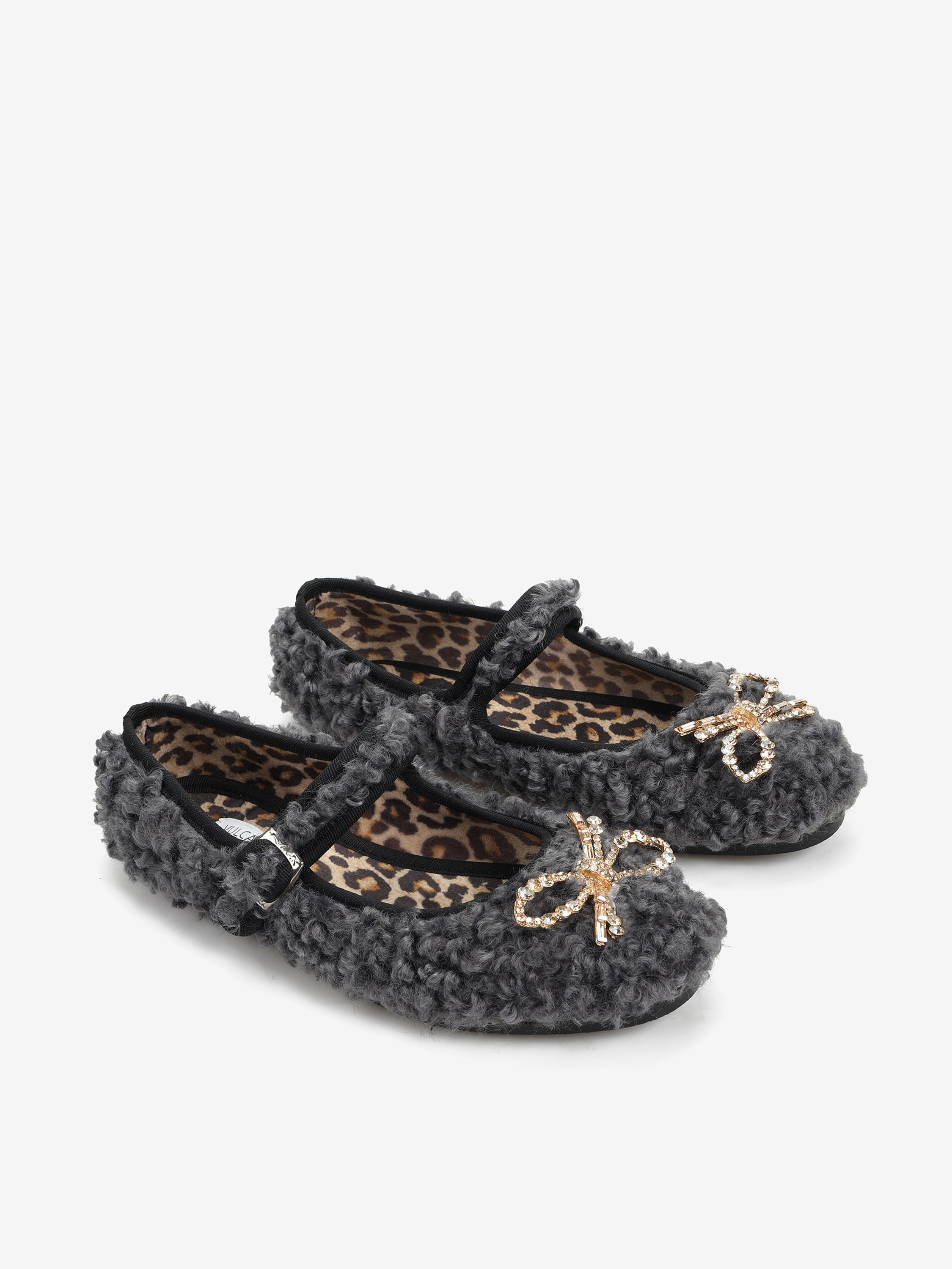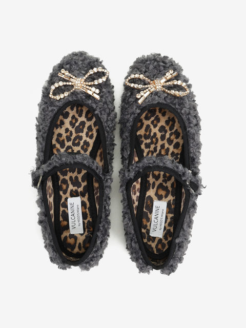 Baleriny wykonane z miękkiej tkaniny imitujacej futro baranka. Ozdobna kokarda z kryształkami i regulowany pasek.