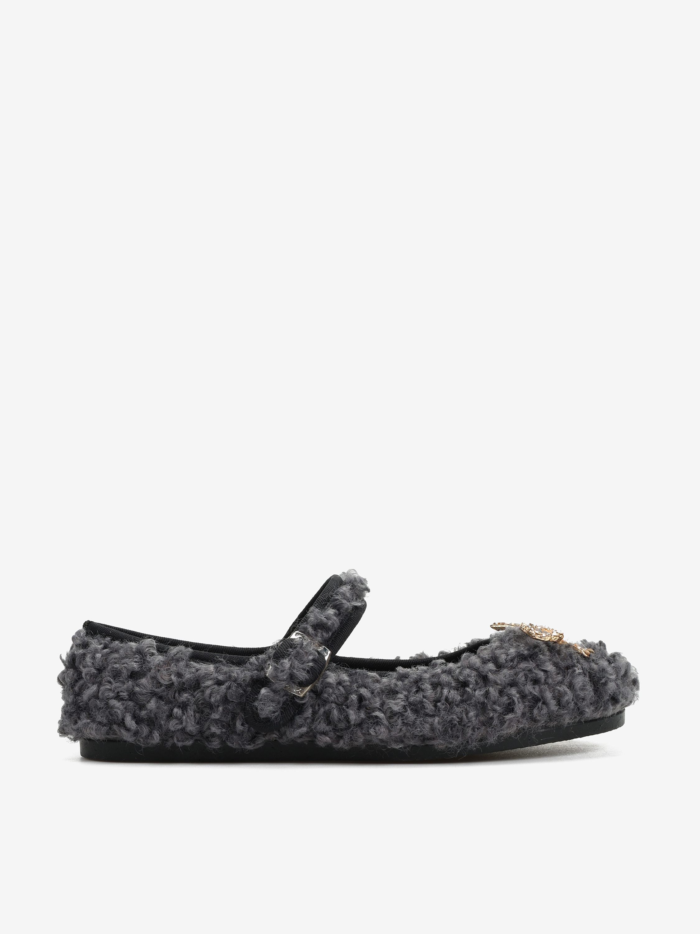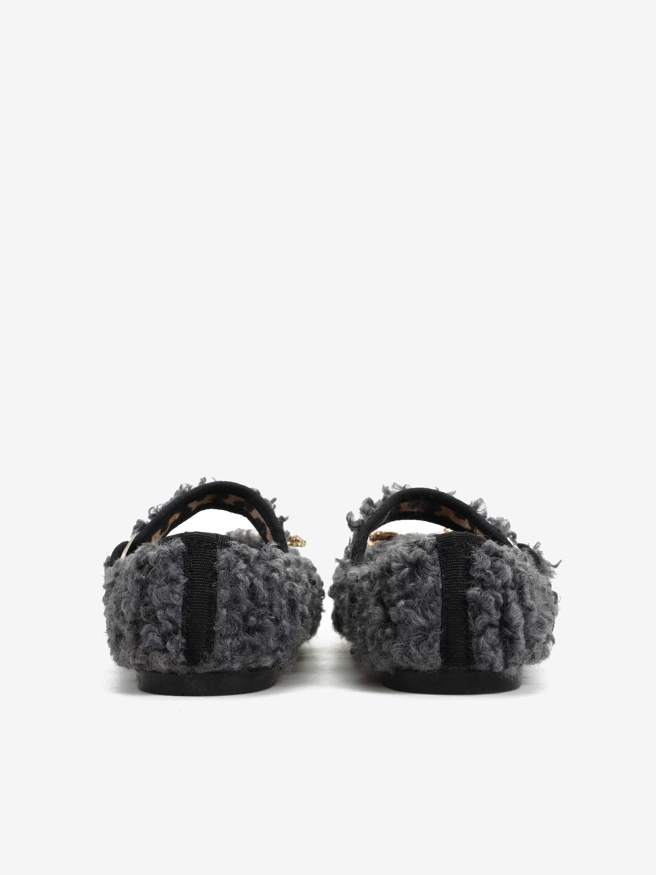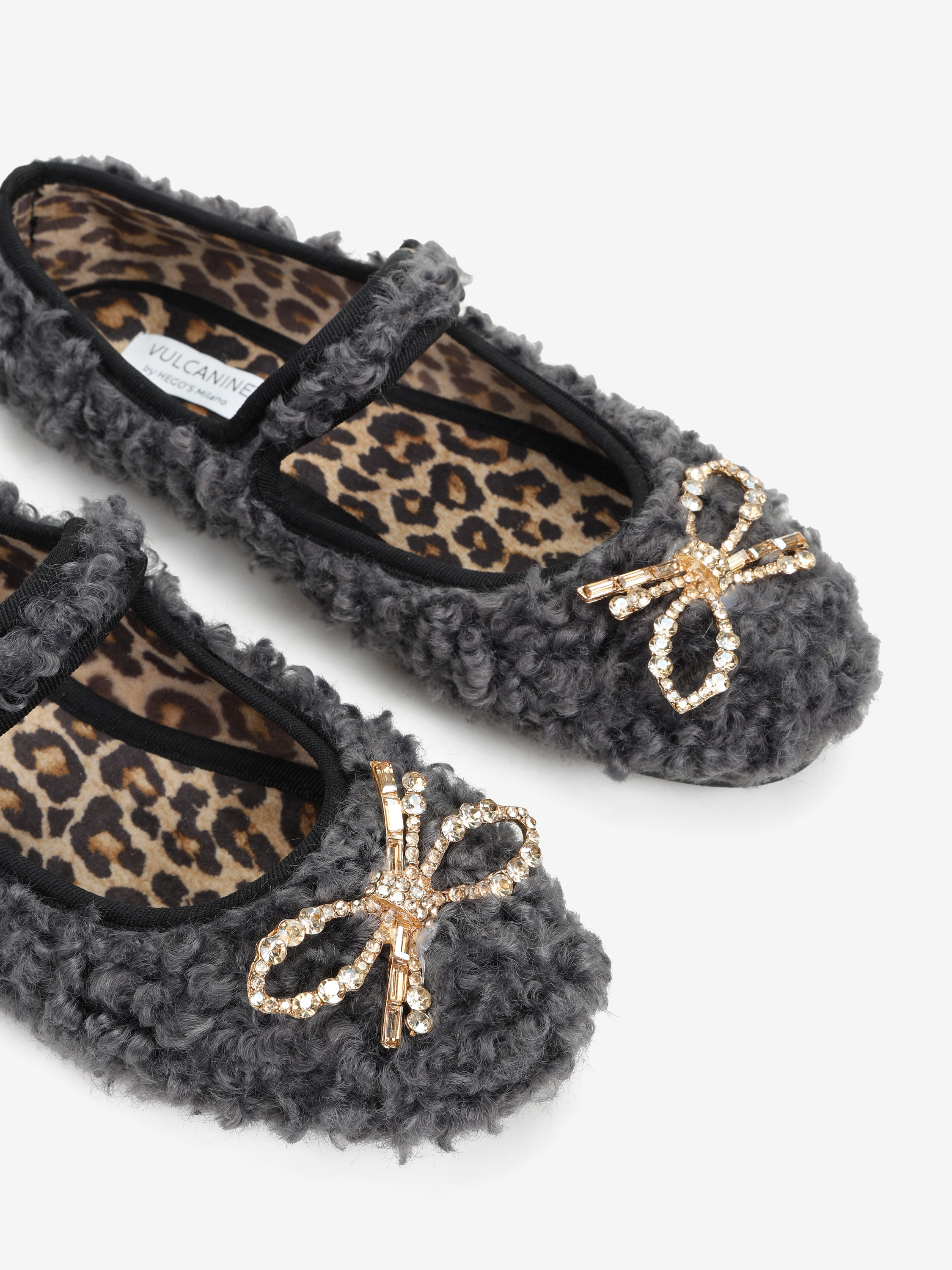 Baleriny wykonane z miękkiej tkaniny imitujacej futro baranka. Ozdobna kokarda z kryształkami i regulowany pasek.