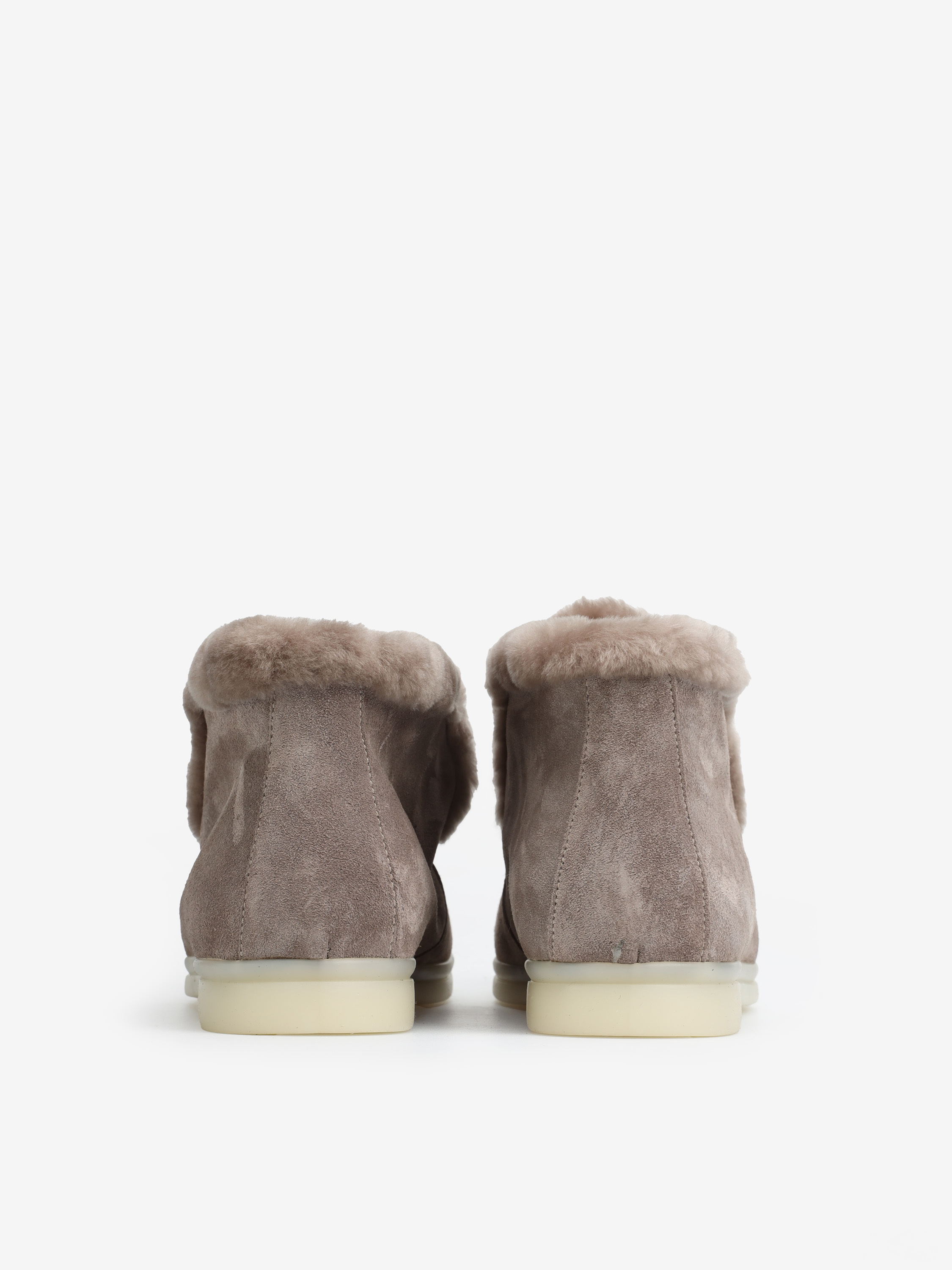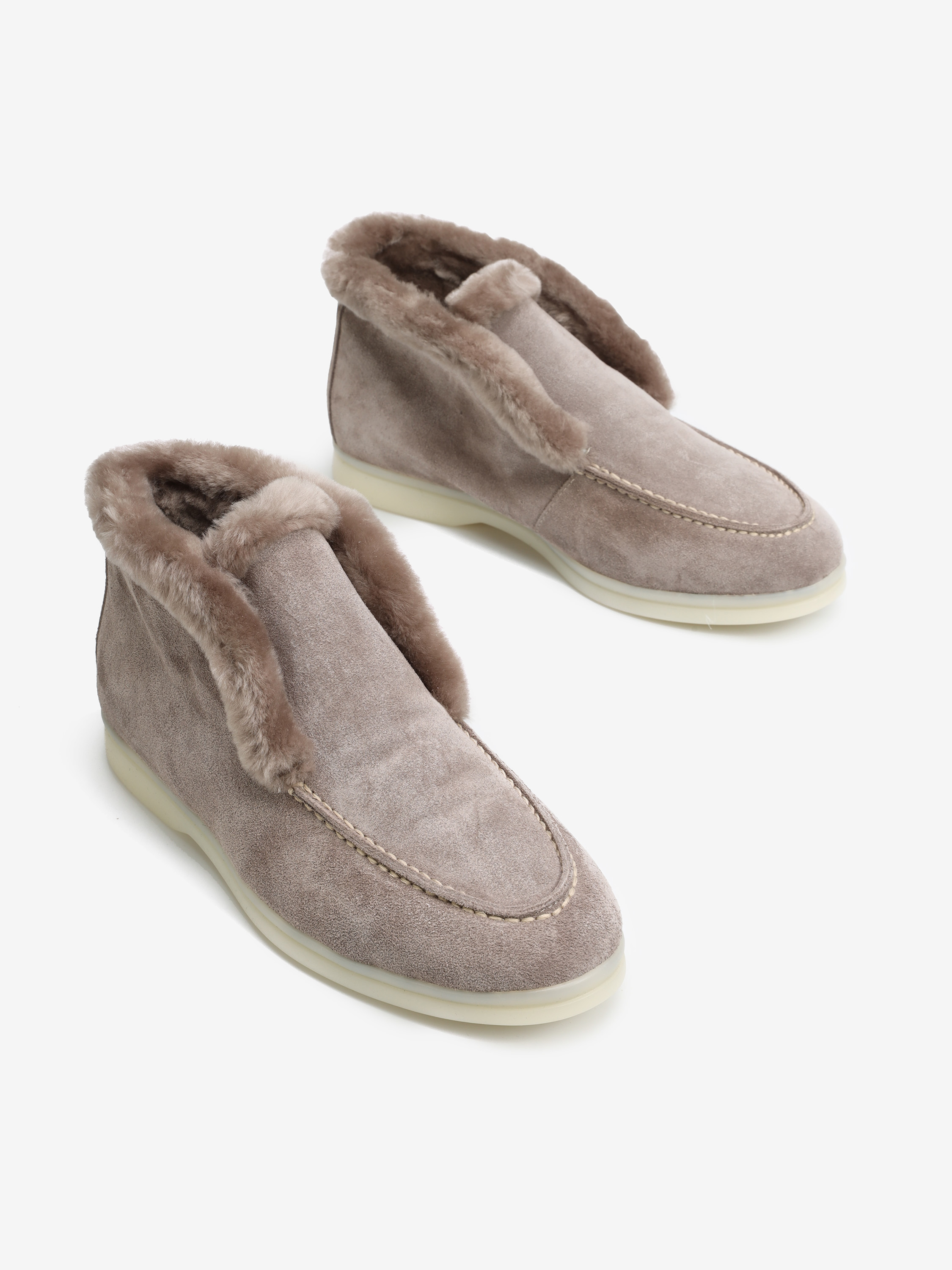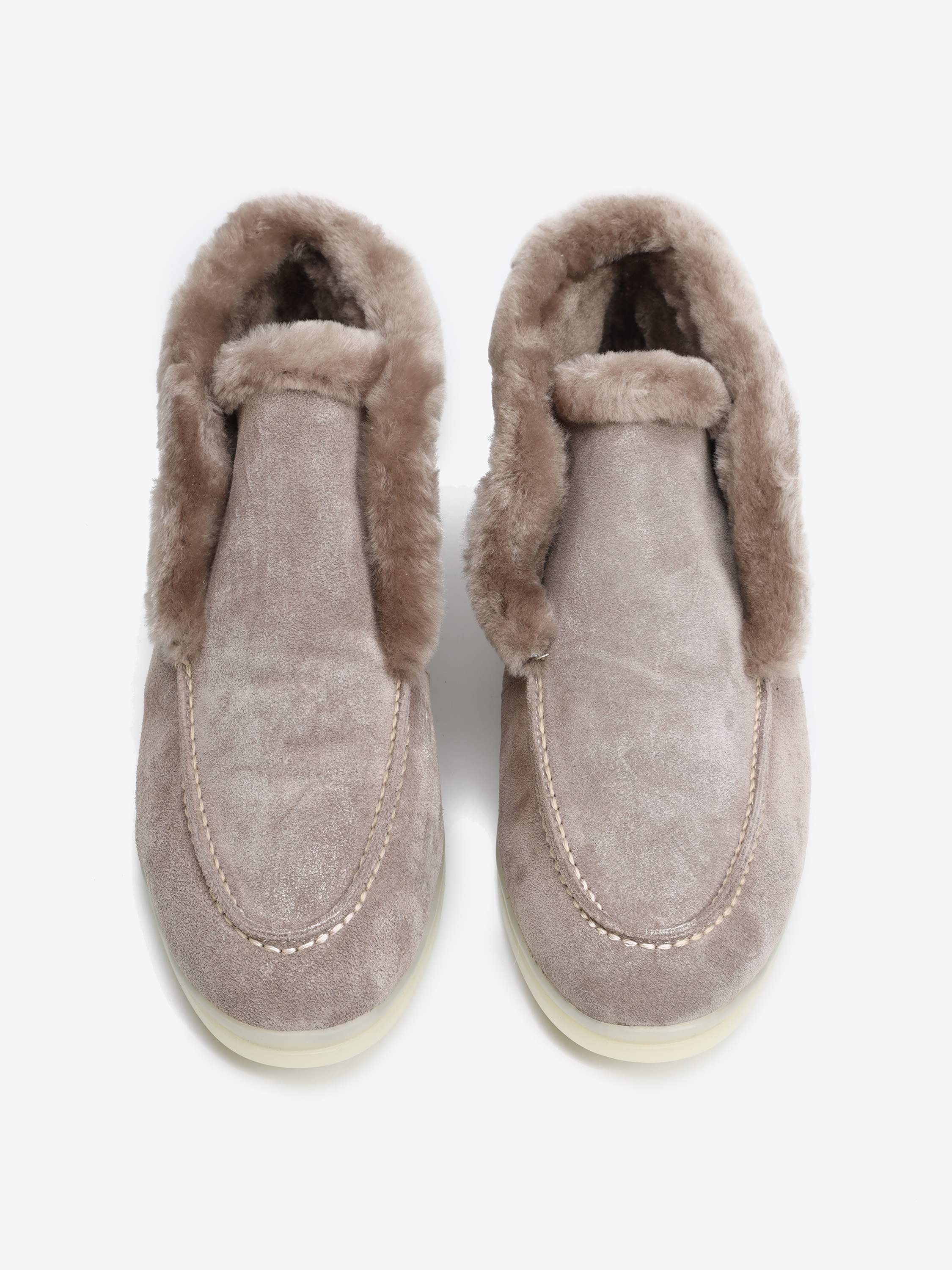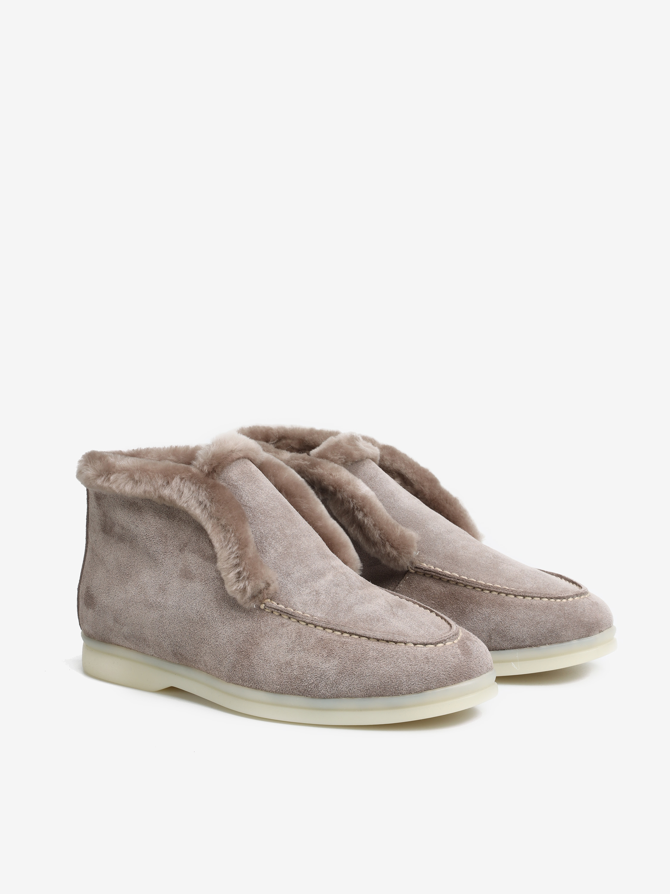 Wsuwane botki z futrem to Trend sezonu. Cholewka w szarym kolorze wykonana jest z naturalnej skóry zamszowej. Wyściółka obszyta została modnym futrem. Ciepłe i wygodne. Dostępne w kilku kolorach do wyboru.