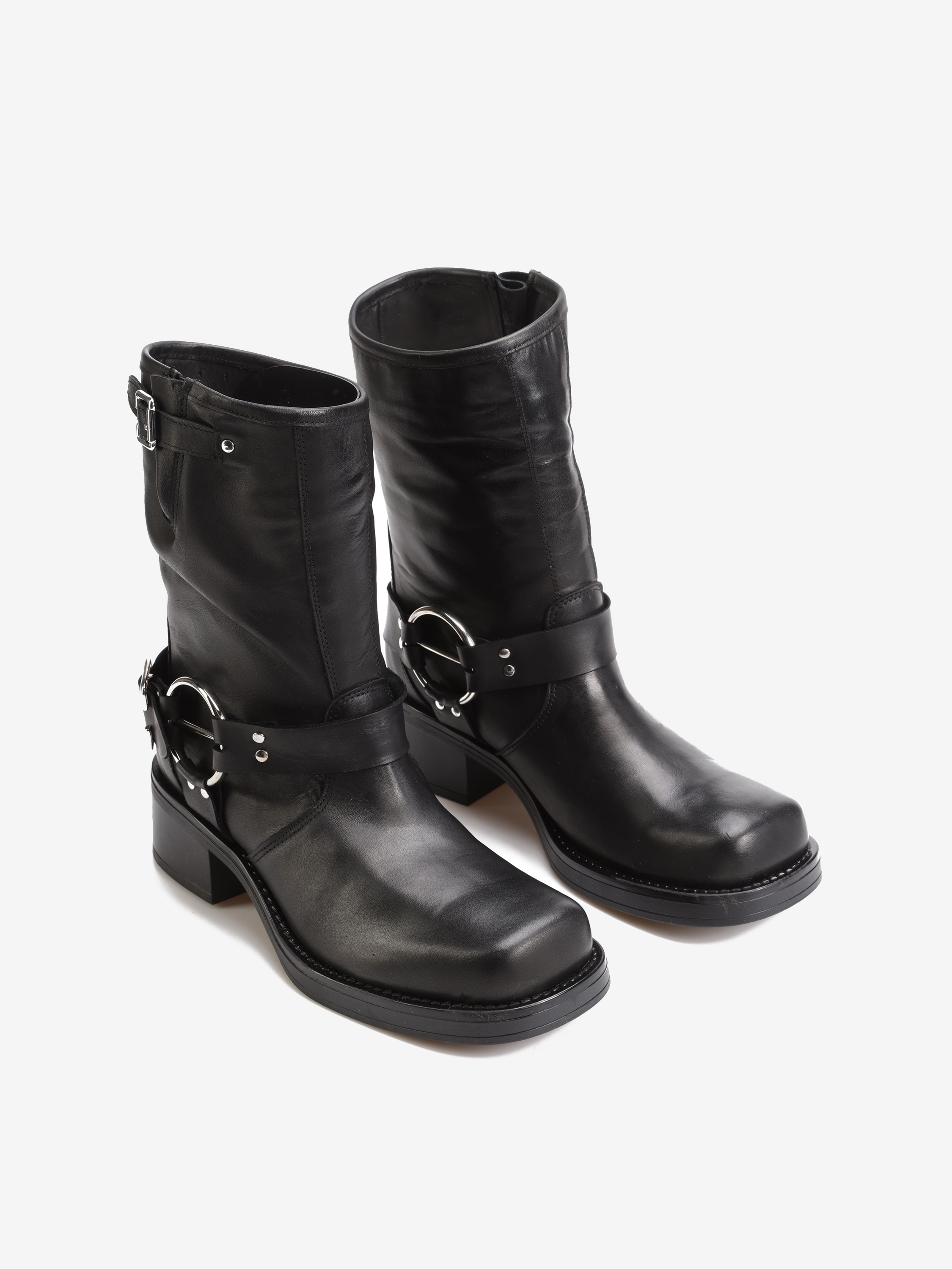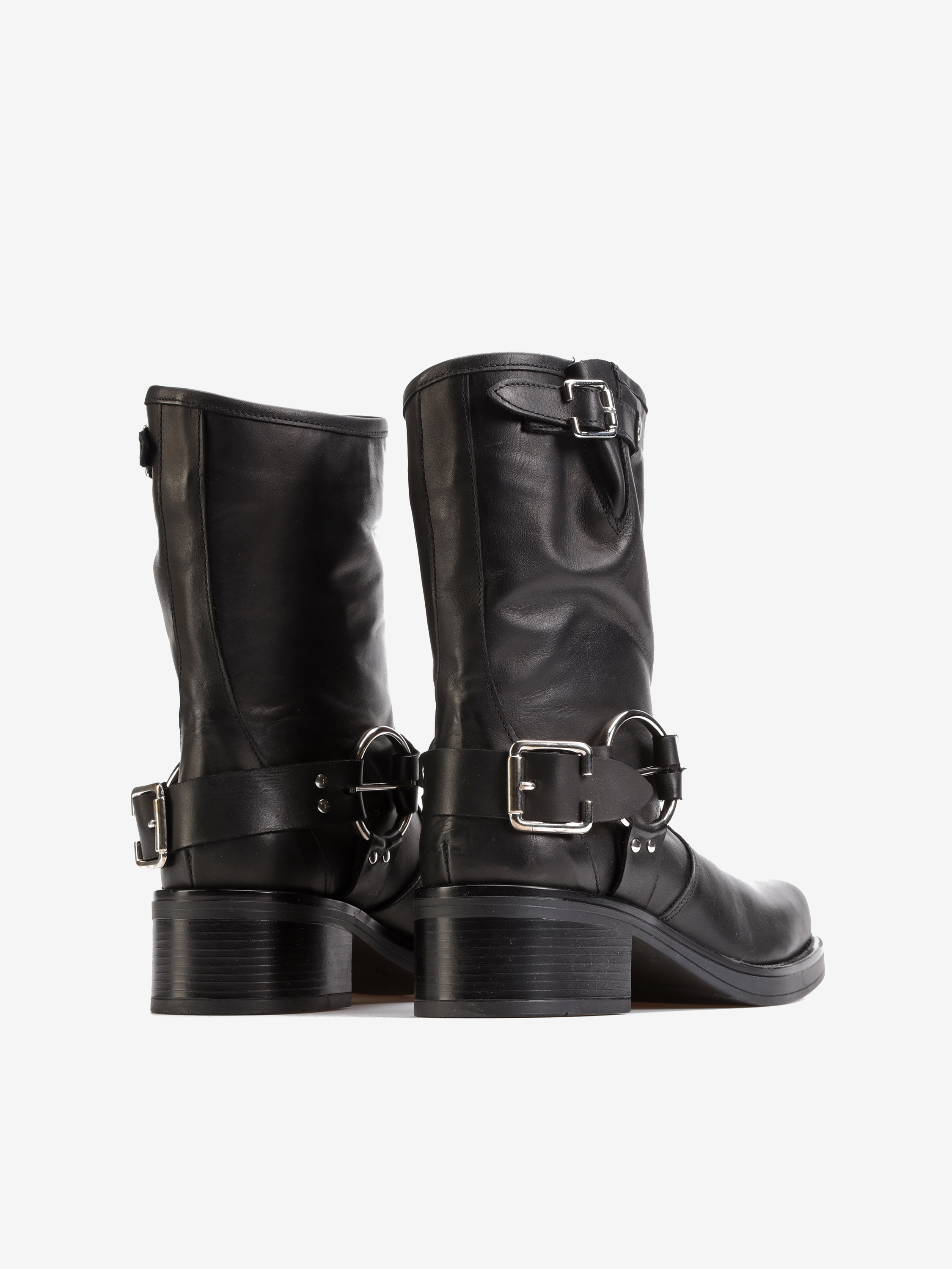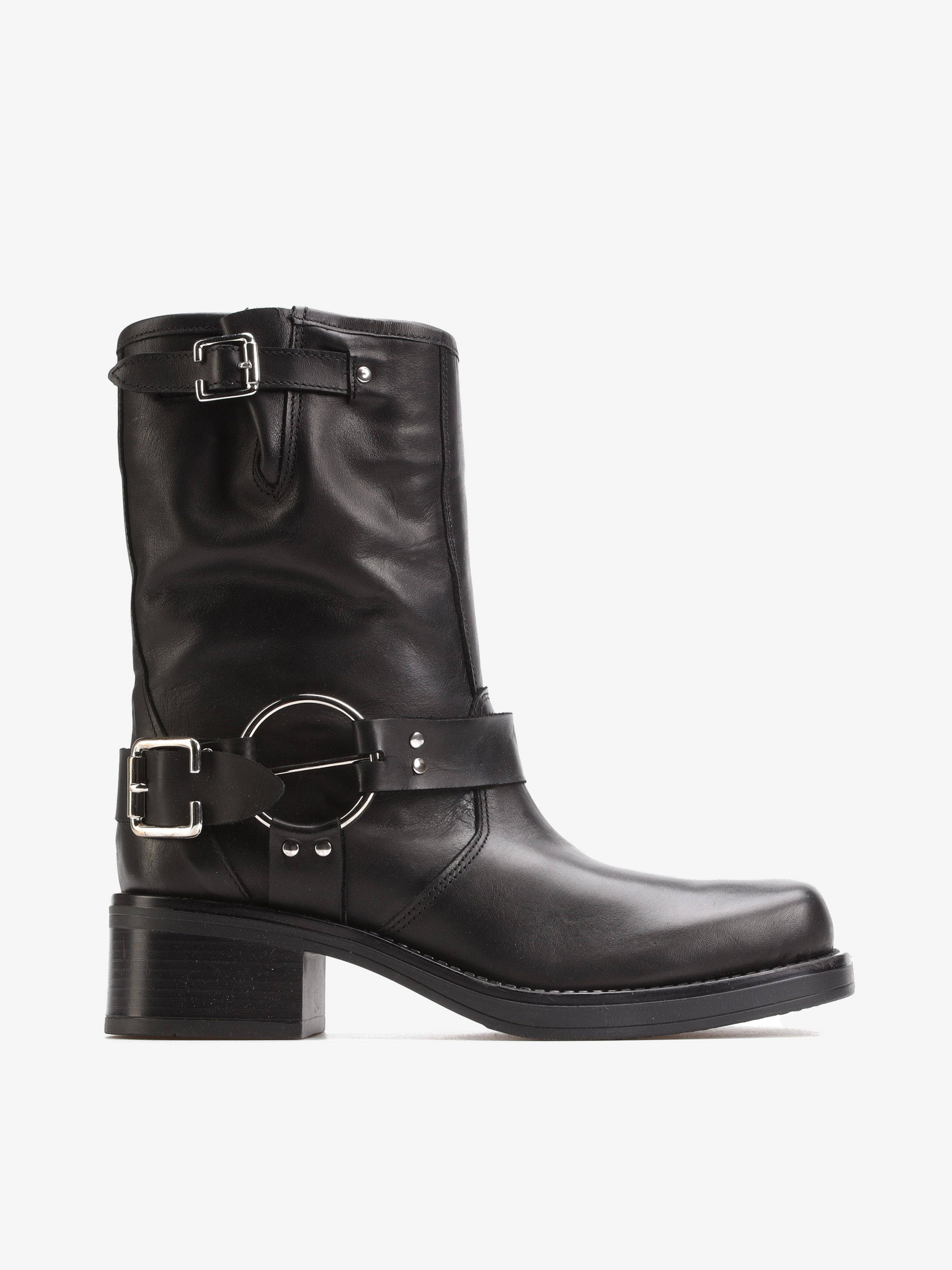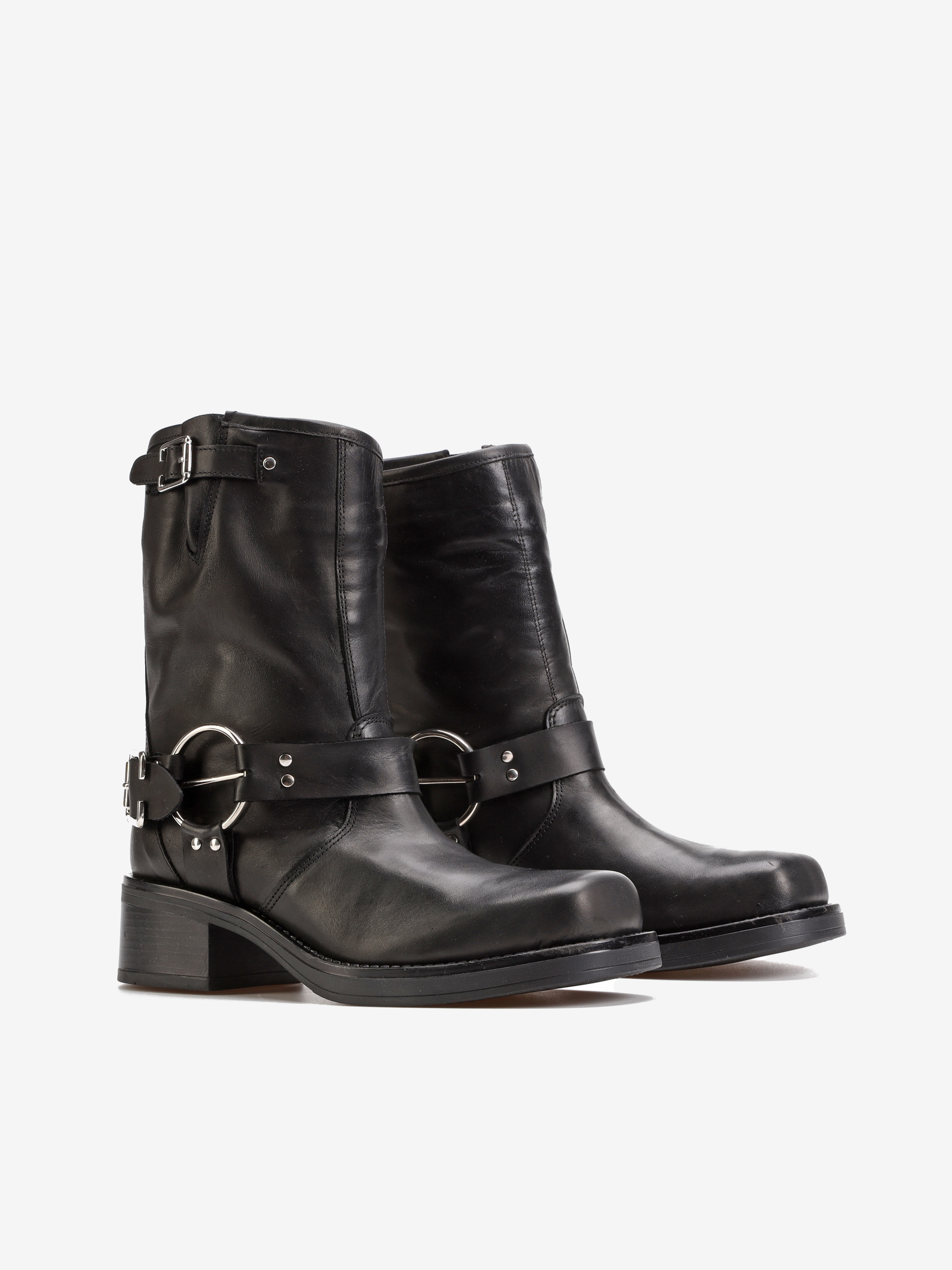 Wsuwane botki na słupku wykonane z naturalnej, włoskiej skóry. Klasyczny fason w czarnym kolorze posiada skórzany pasek wykończony srebrną klamrą. Model z kwadratowym noskiem i wystającą poza obrys buta podeszwą.