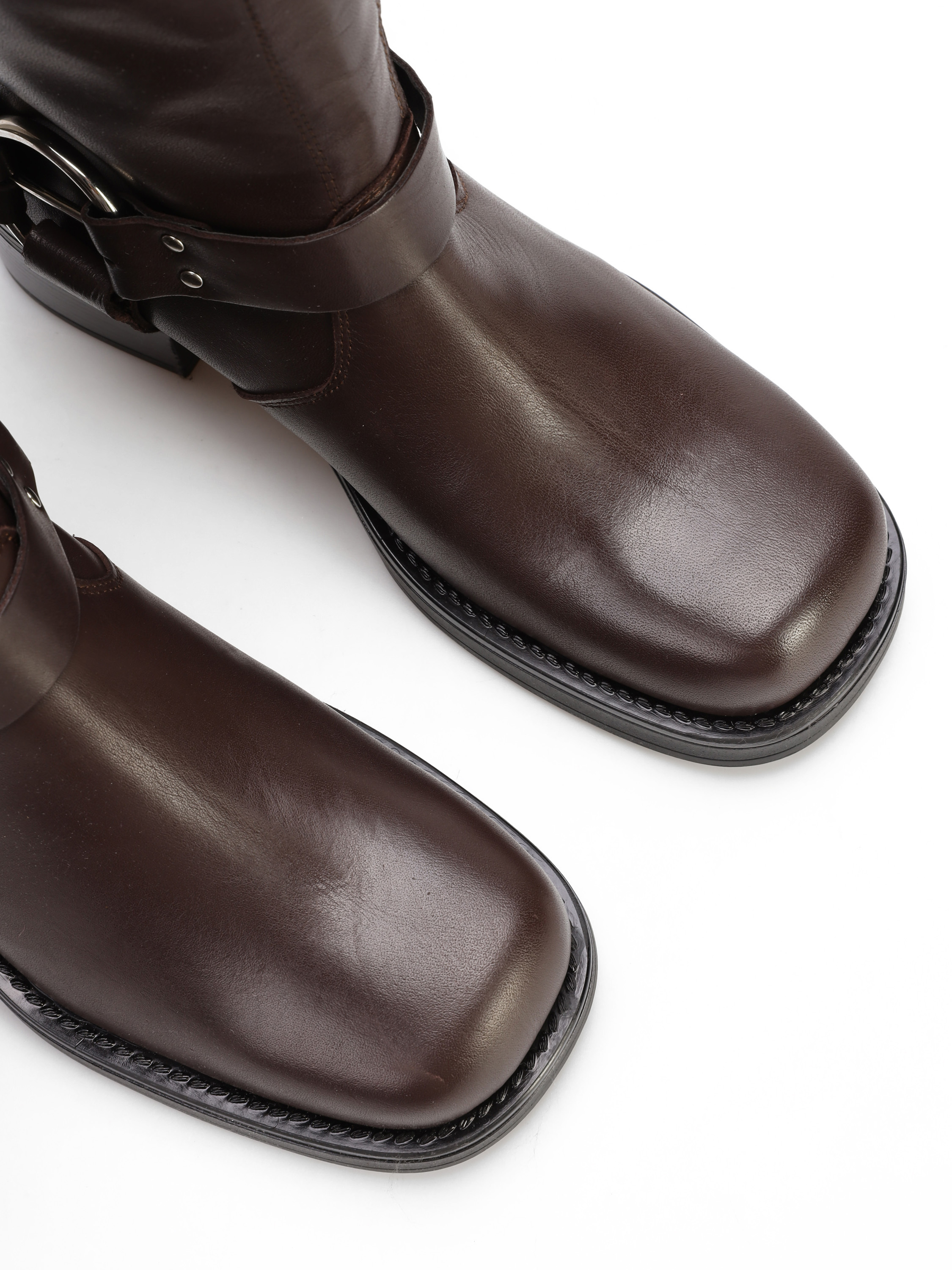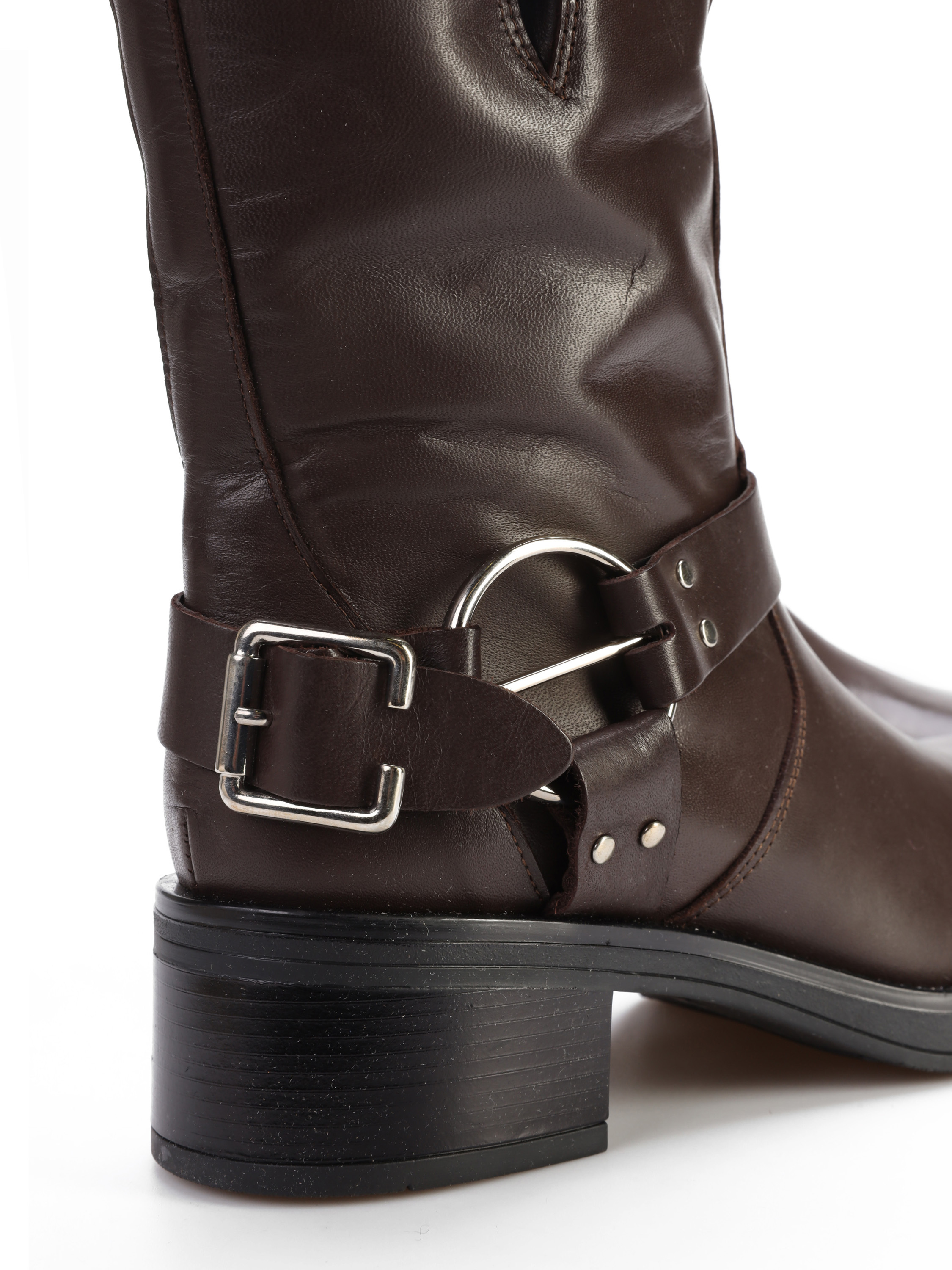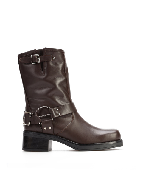 Wsuwane botki na słupku wykonane z naturalnej, włoskiej skóry. Klasyczny fason w czekoladowym kolorze posiada skórzany pasek wykończony srebrną klamrą. Model z kwadratowym noskiem i wystającą poza obrys buta podeszwą.