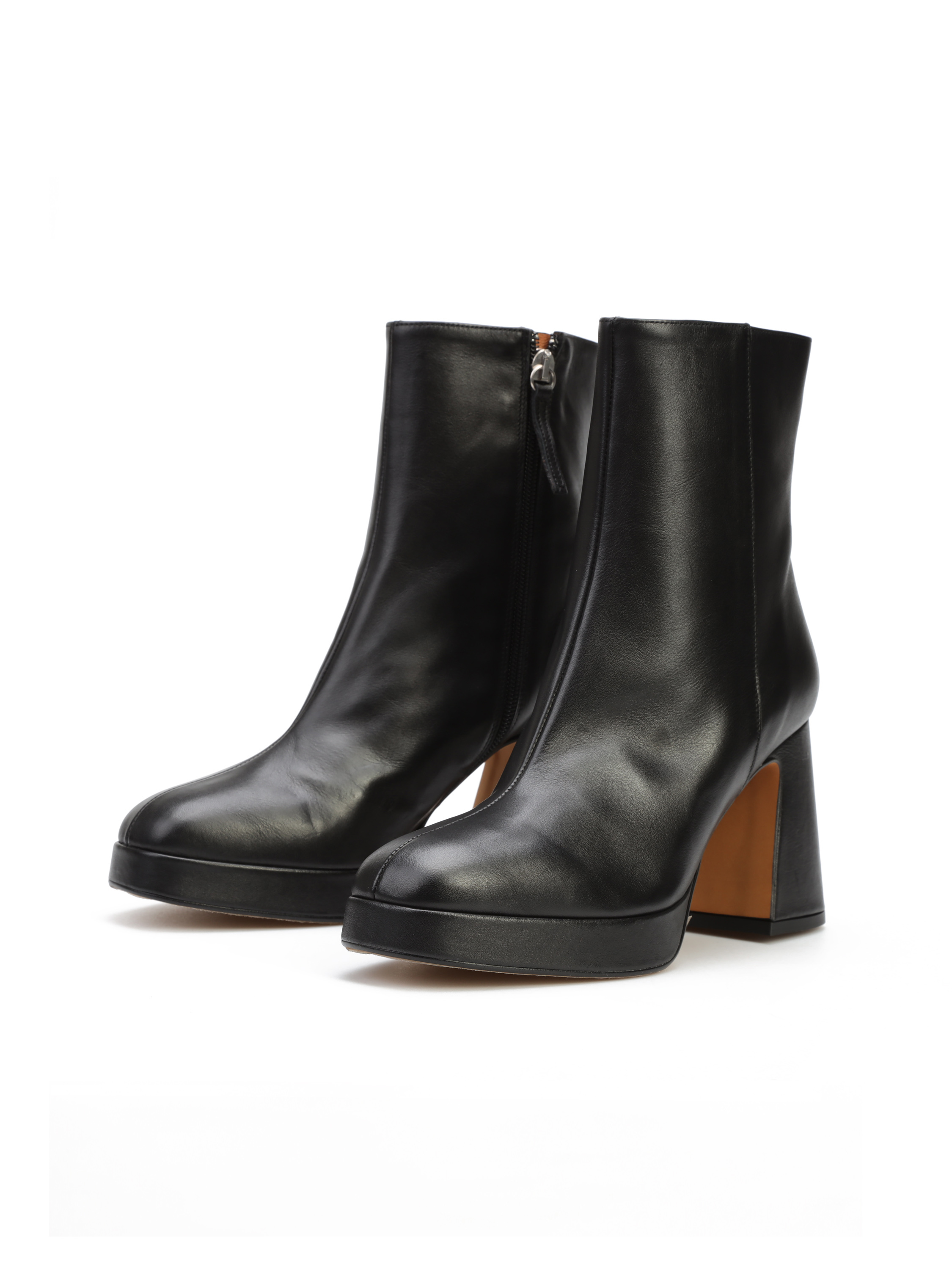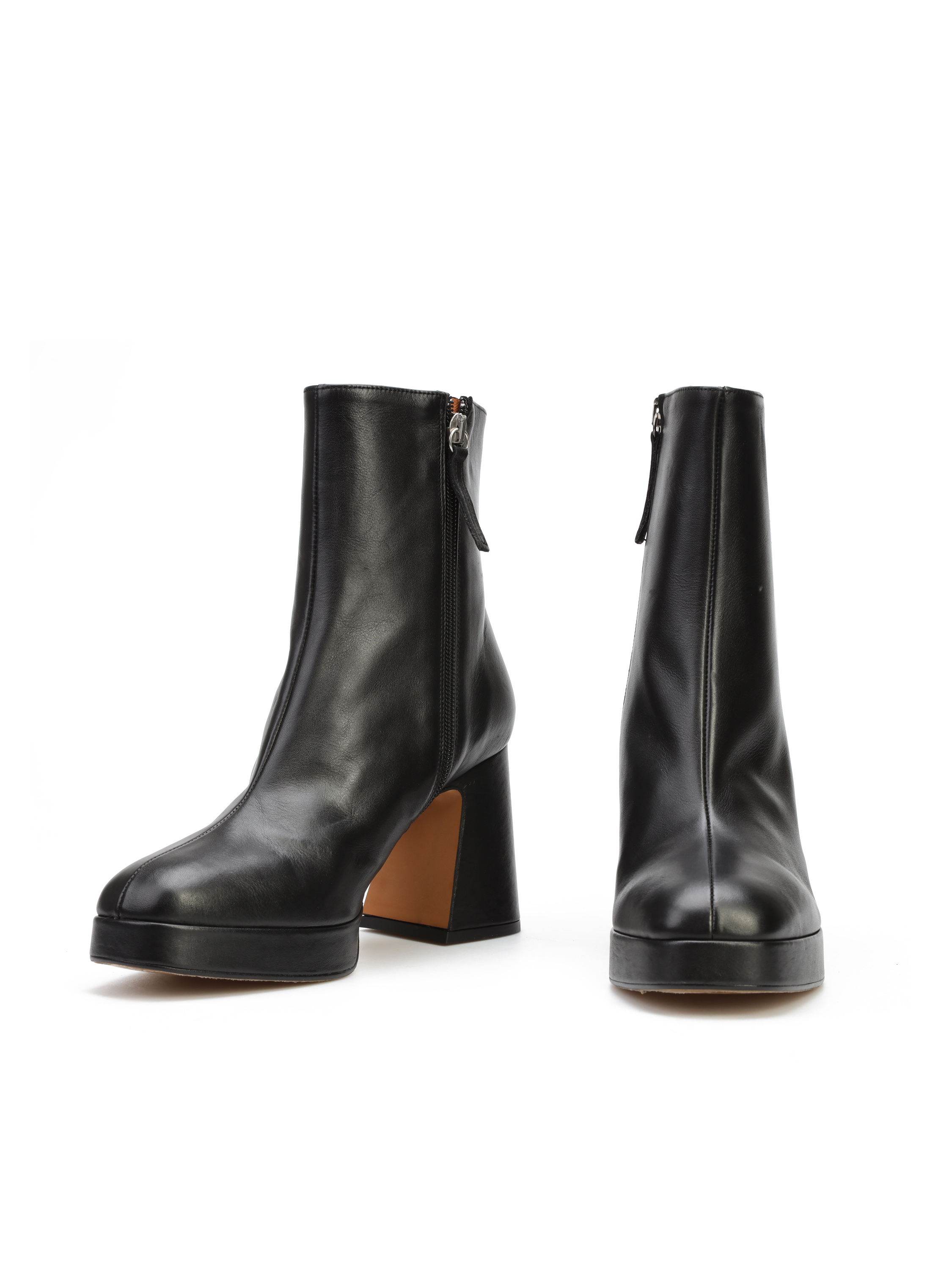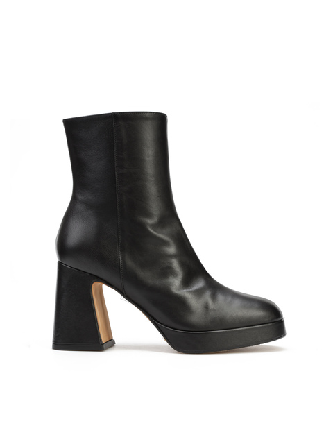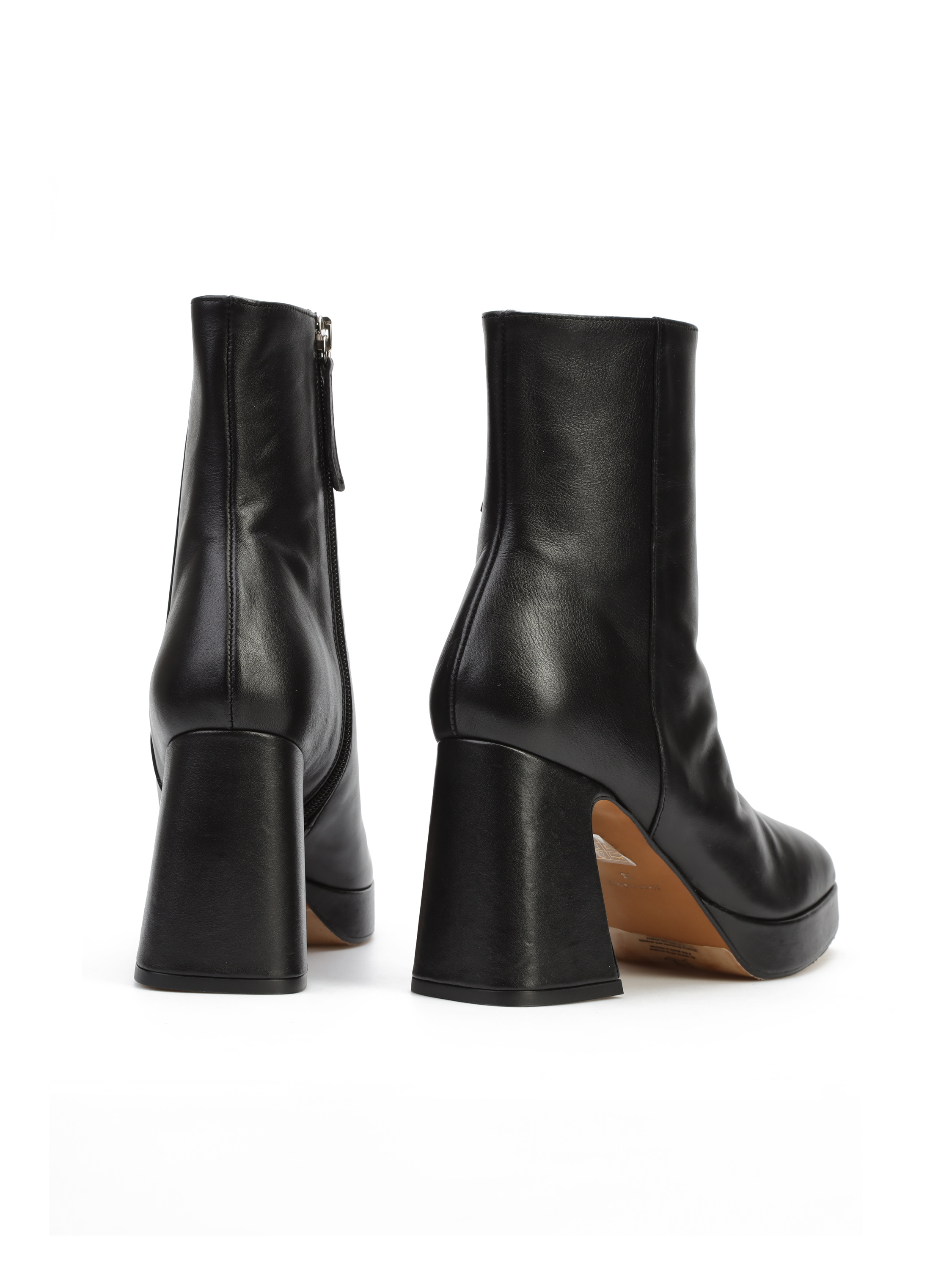 Botki na platformie wykonane są z naturalnej skóry. Cholewka za kostkę w klasycznym, czarnym kolorze posiada zamek błyskawiczny. Ułatwia on zakładanie i zdejmowanie obuwia. Model osadzony na stabilnym obcasie na słupku.