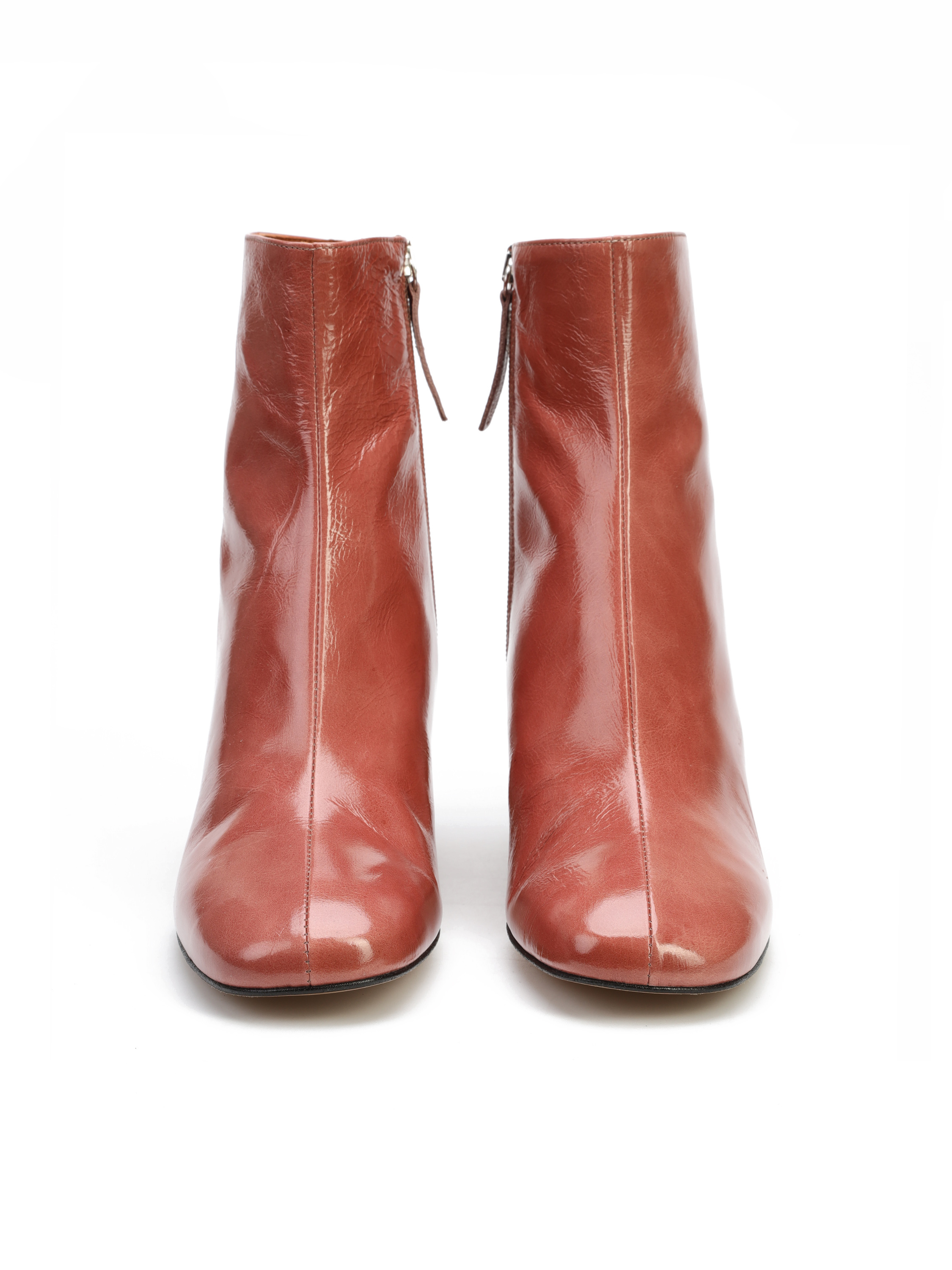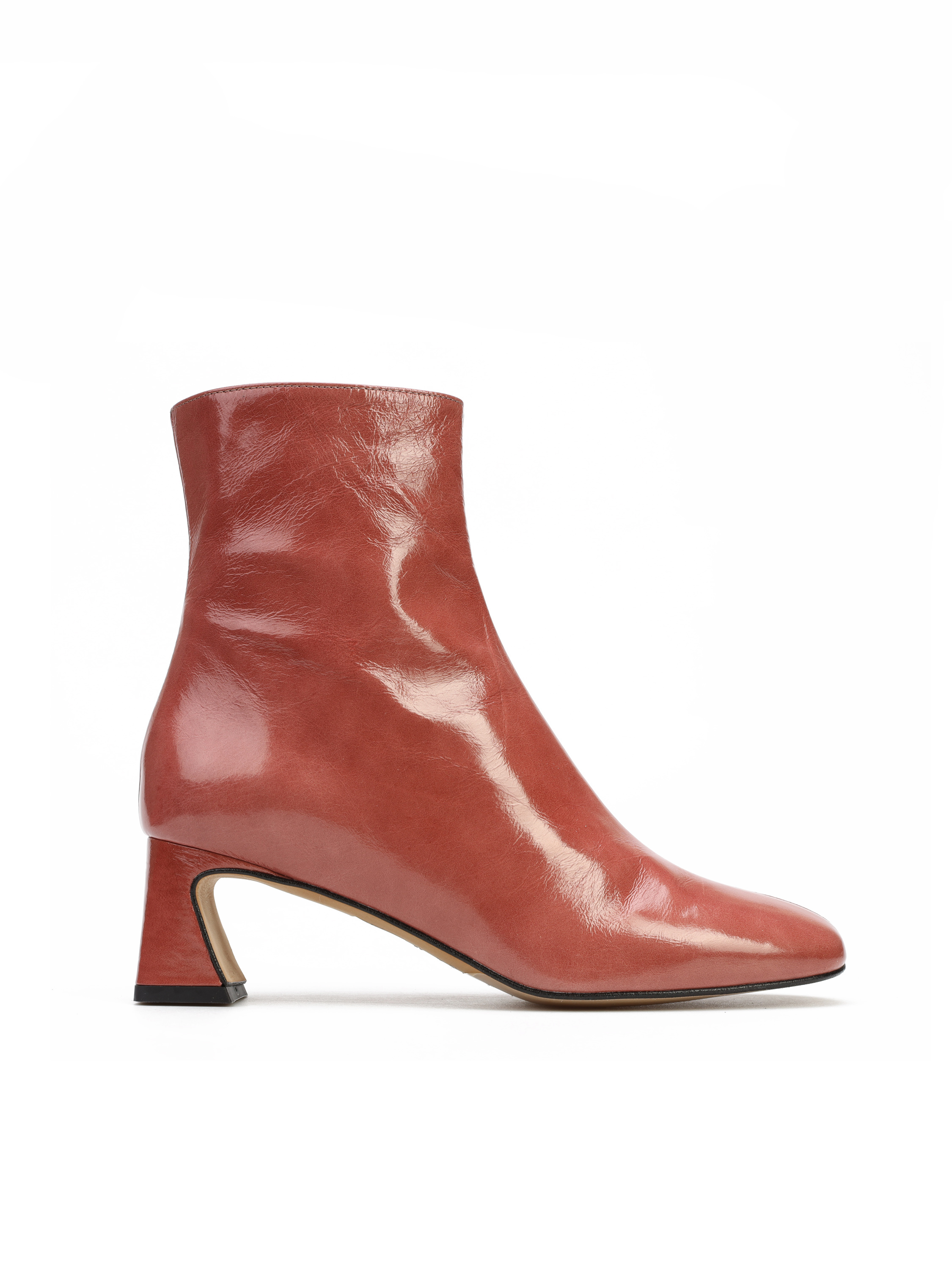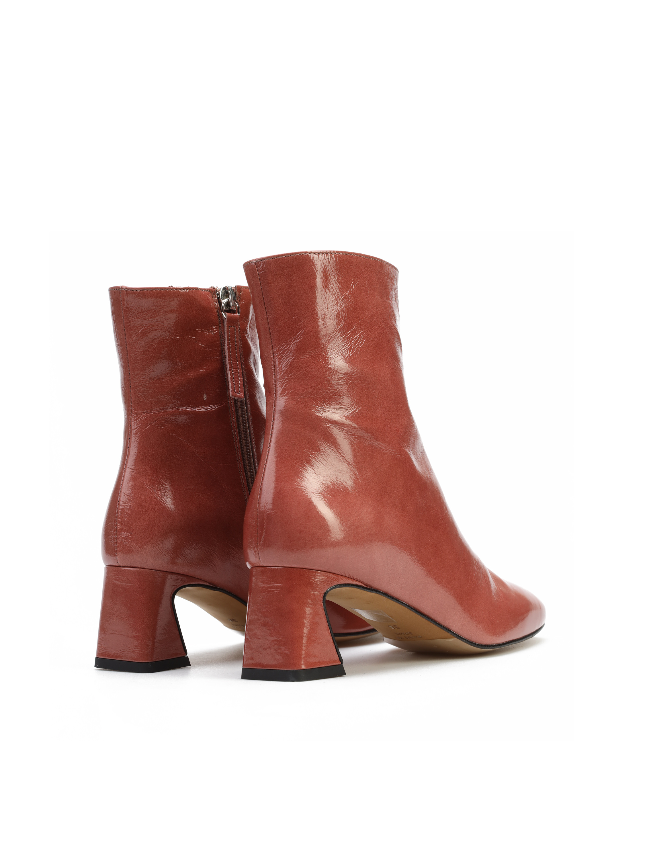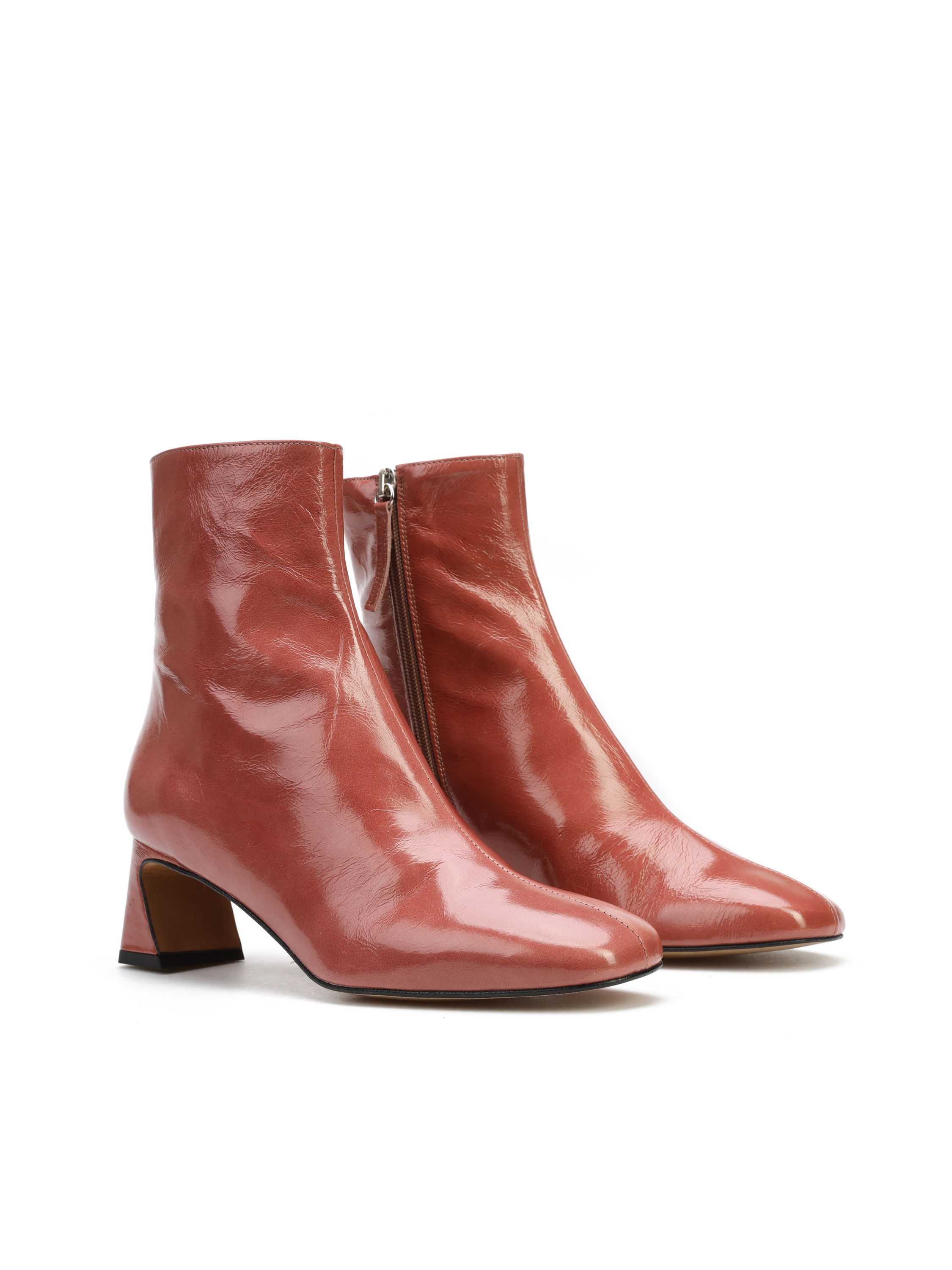 Botki za kostkę wykonane są z lakierowanej skóry. Cholewka w modnym kolorze zapinana jest na zamek błyskwiczny, który ułatwia zakładanie i zdejmowanie obuwia. Model osadzony na stabilnym, geometrycznym obcasie na słupku.