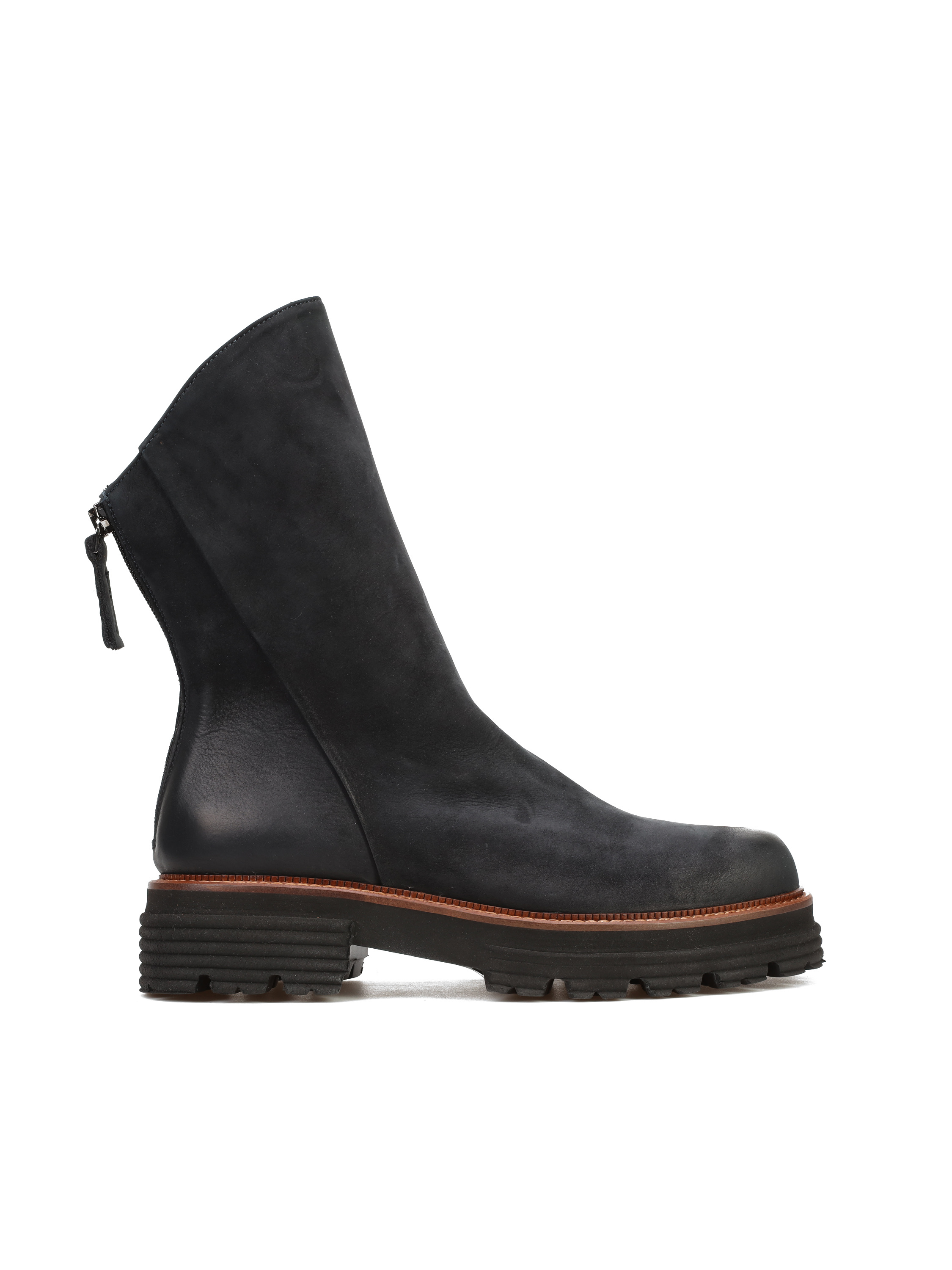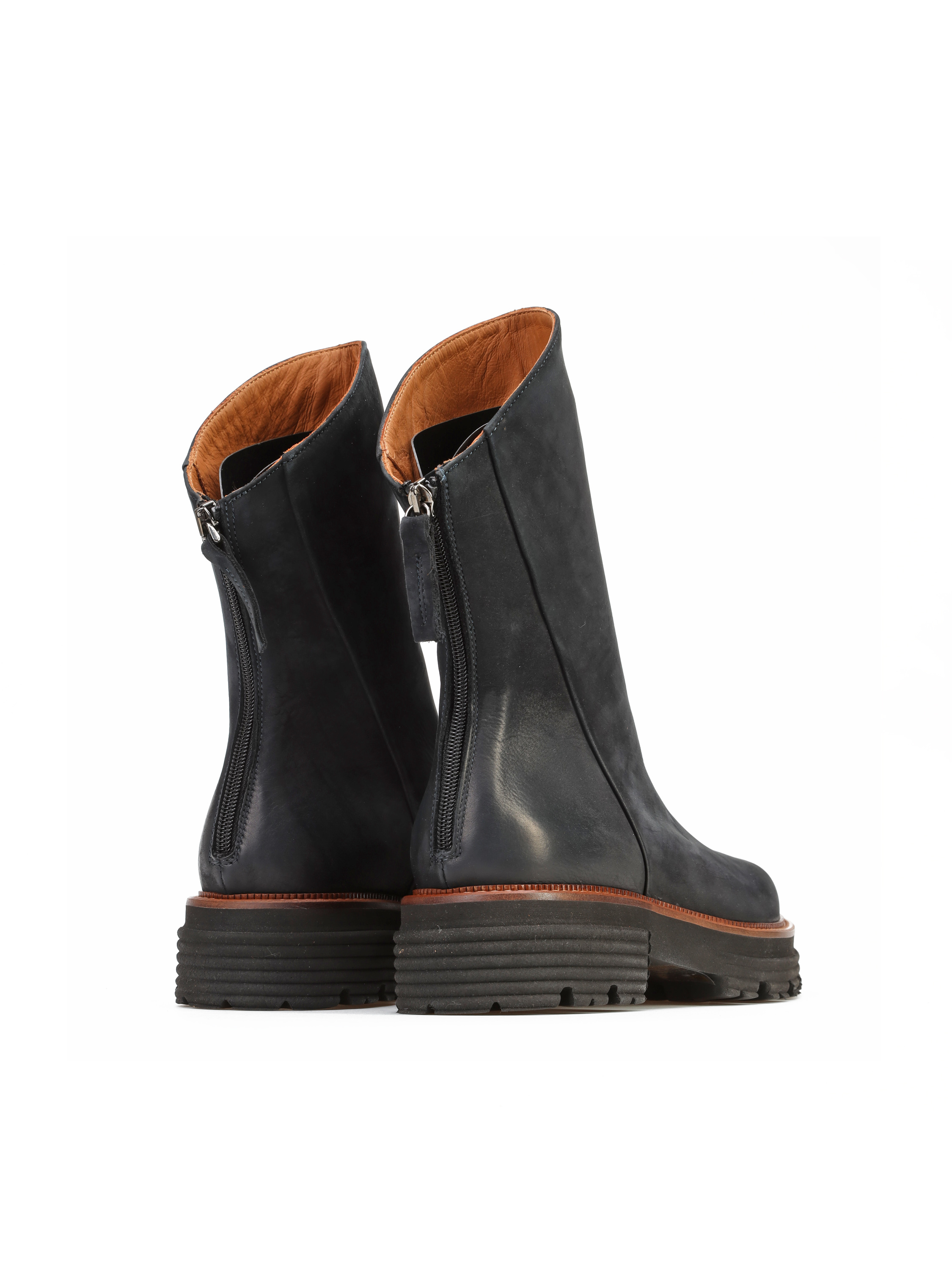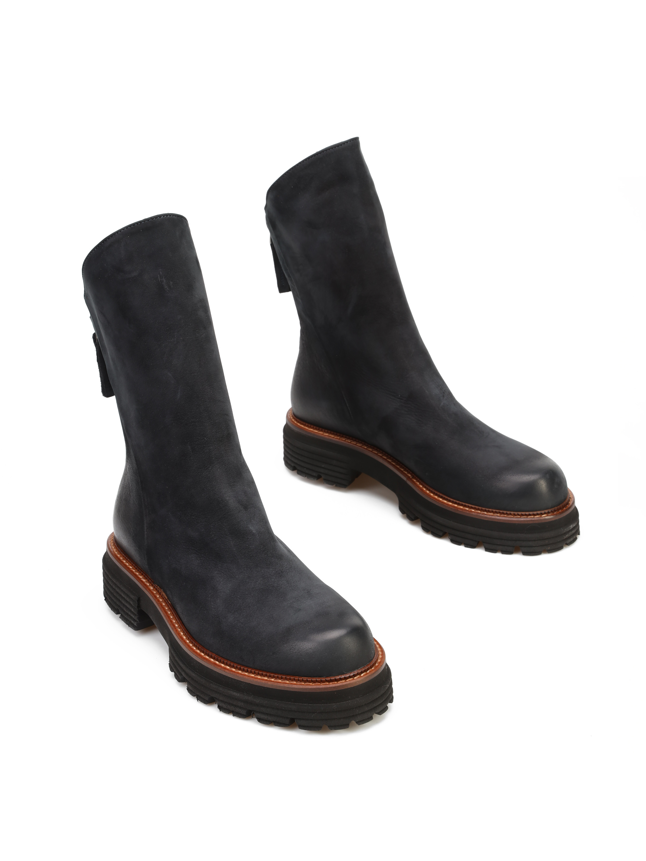 Botki na grubej podeszwie to must have sezonu. Cholewka za kostkę w granatowym kolorze wykonana jest z nubuku. Posiada zamek błyskawiczny. Gruba podeszwa z wyraźnie zaznaczonym bieżnikiem odpowiada za stabilny krok. Jest niezwykle lekka. Charakterystyczna lamówka w rudym kolorze, to detal wyróżniający ten model.
