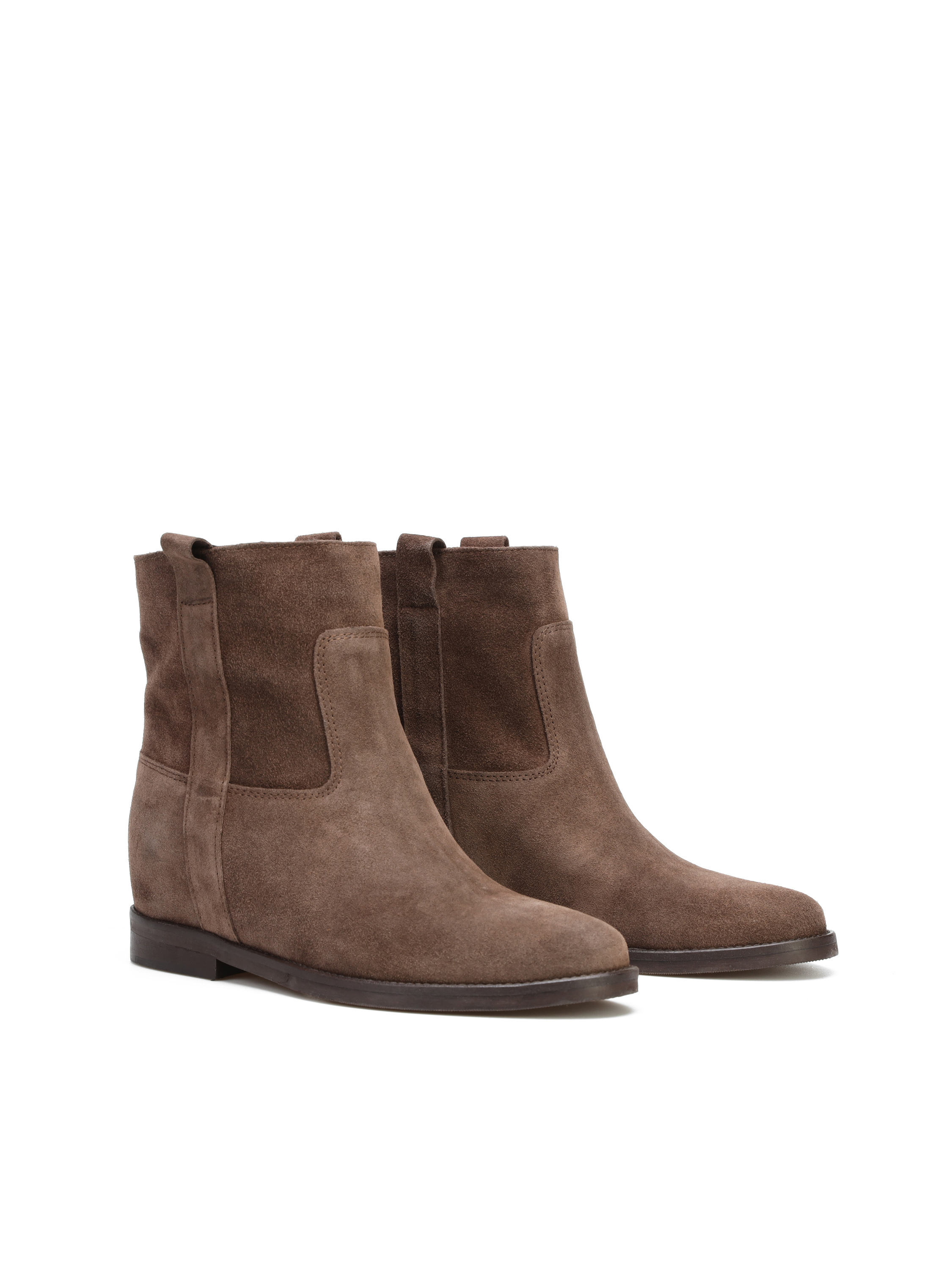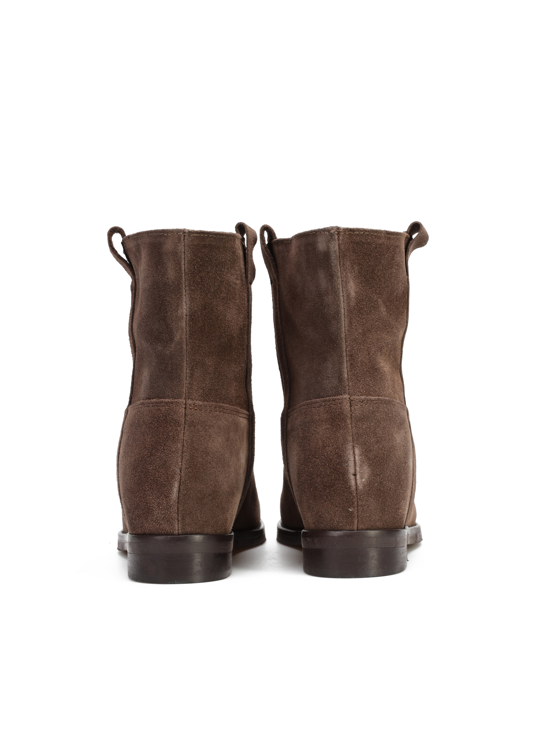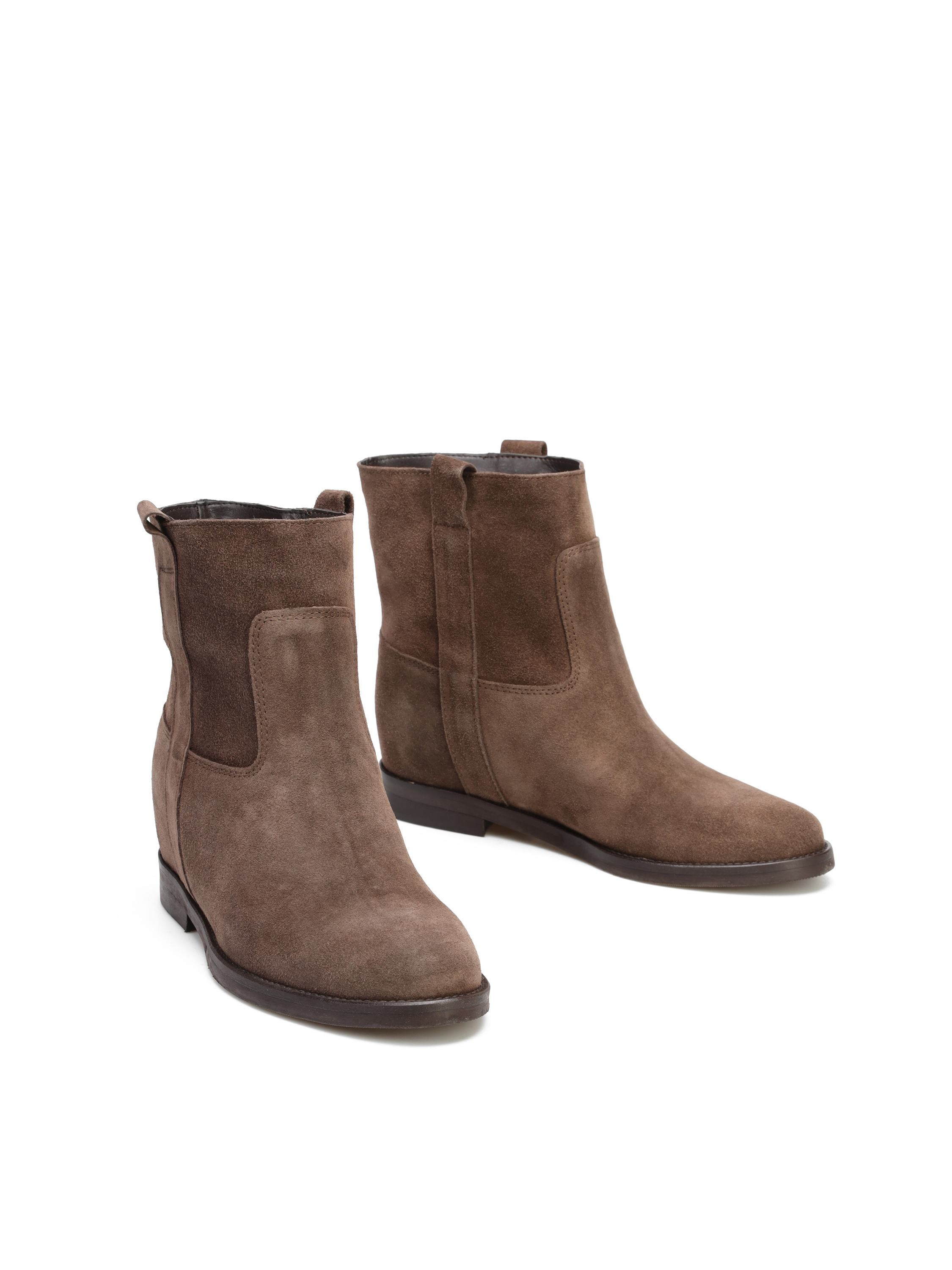 Krótke botki za kostkę wykonane są z włoskiej, zamszowej skóry. Prosta, wsuwana cholewka w najmodniejszym, brązowym kolorze. Model posiada ukryty koturn. Klasyczny fason będzie uzupełnieniem modnej garderoby kobiety.