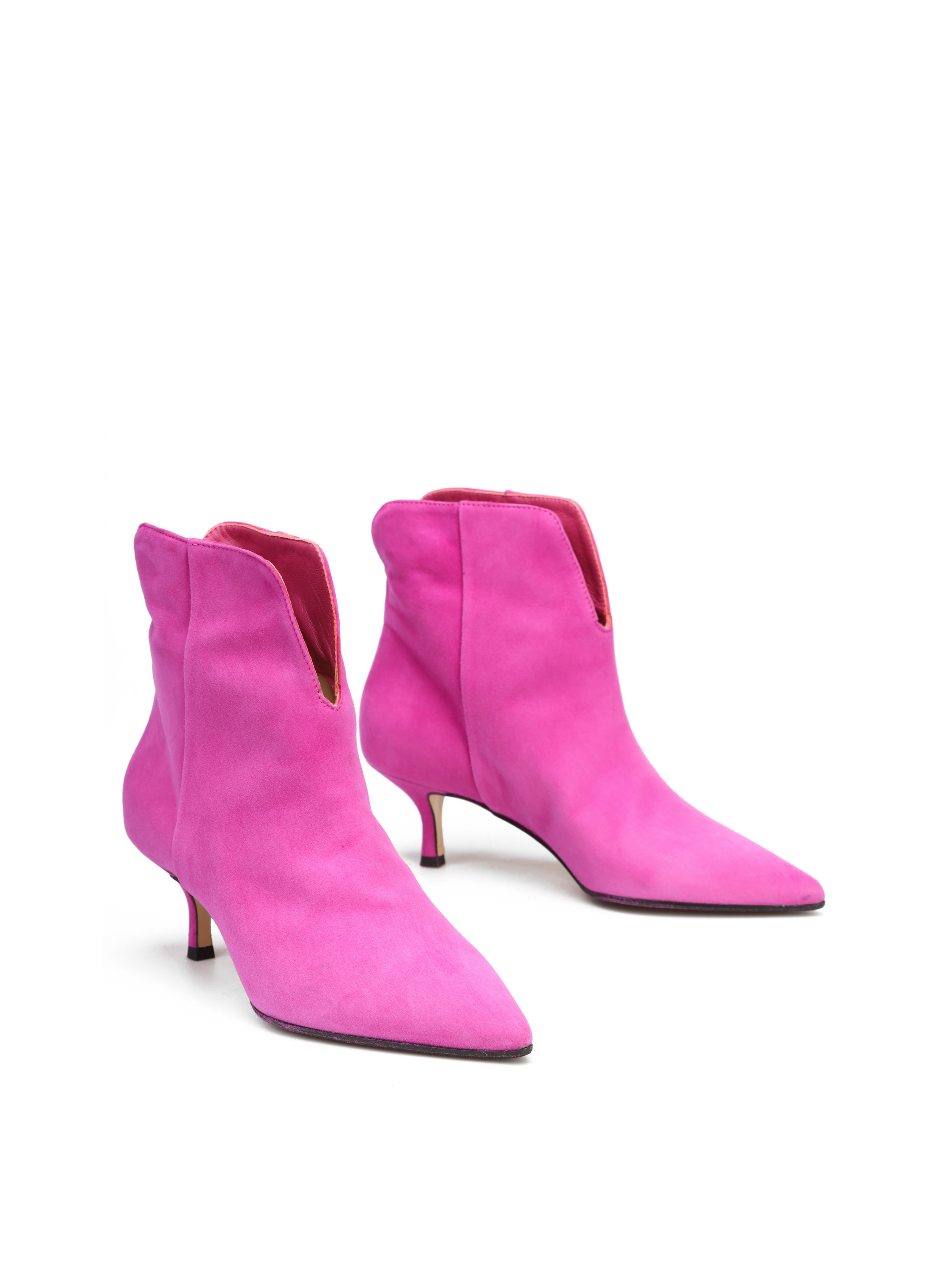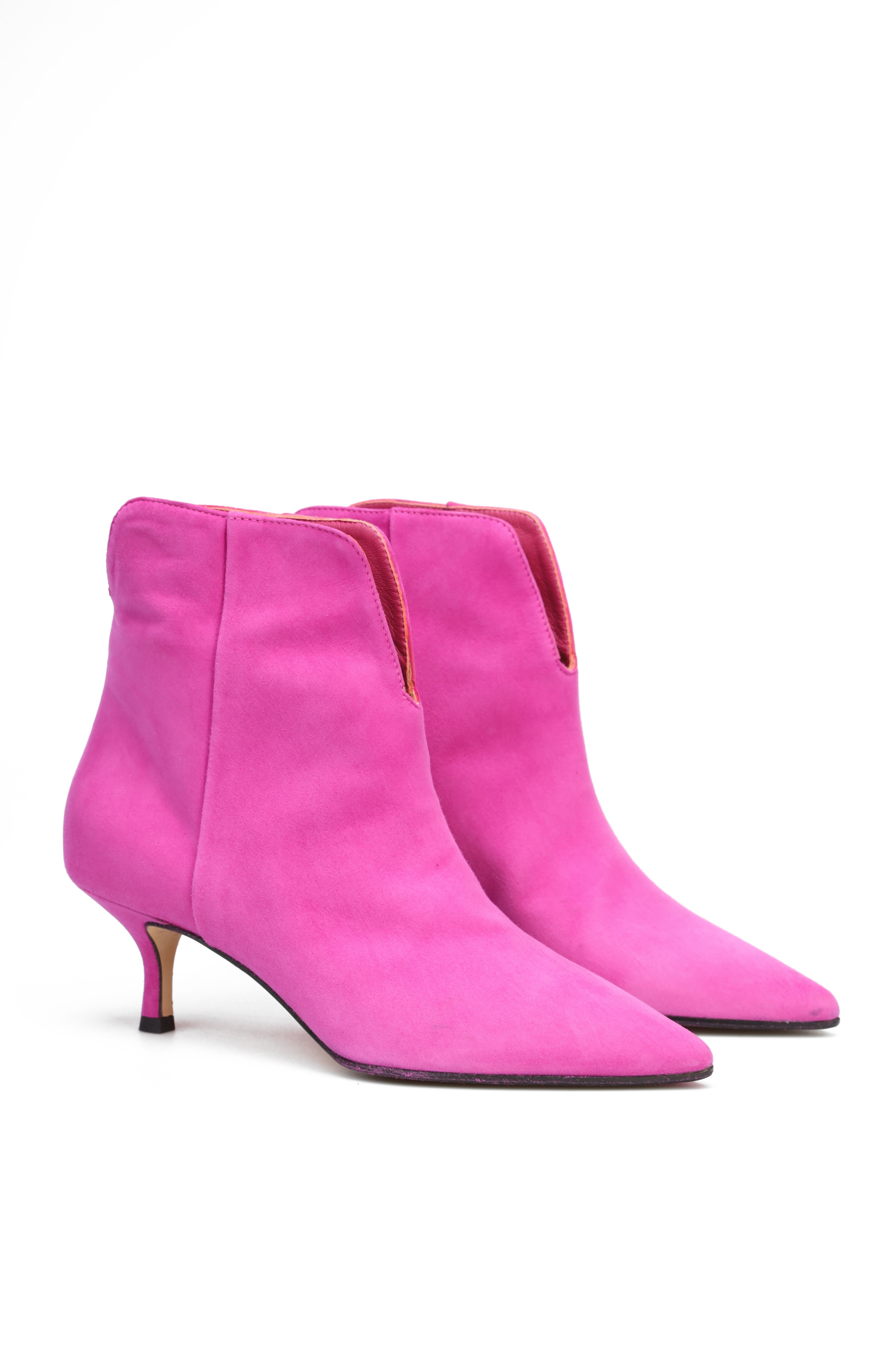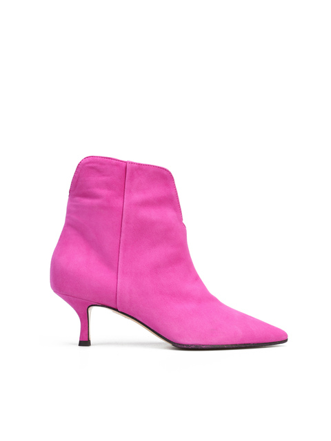 Botki na niskim obcasie to minimalistczny model dla eleganckich kobiet. Wsuwana cholewka w modnym, różowym kolorze wykonana jest z zamszowej skóry. Model z noskiem w szpic oraz wygodnym obcasem na szpilce. Botki damskie będą uzupełnieniem nie tylko casualowych stylizacji.