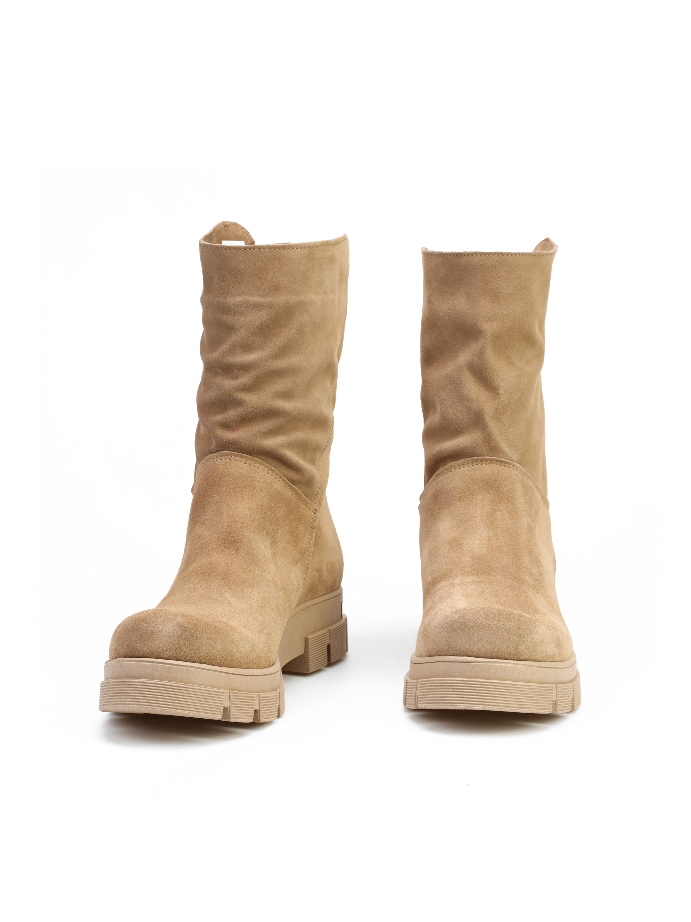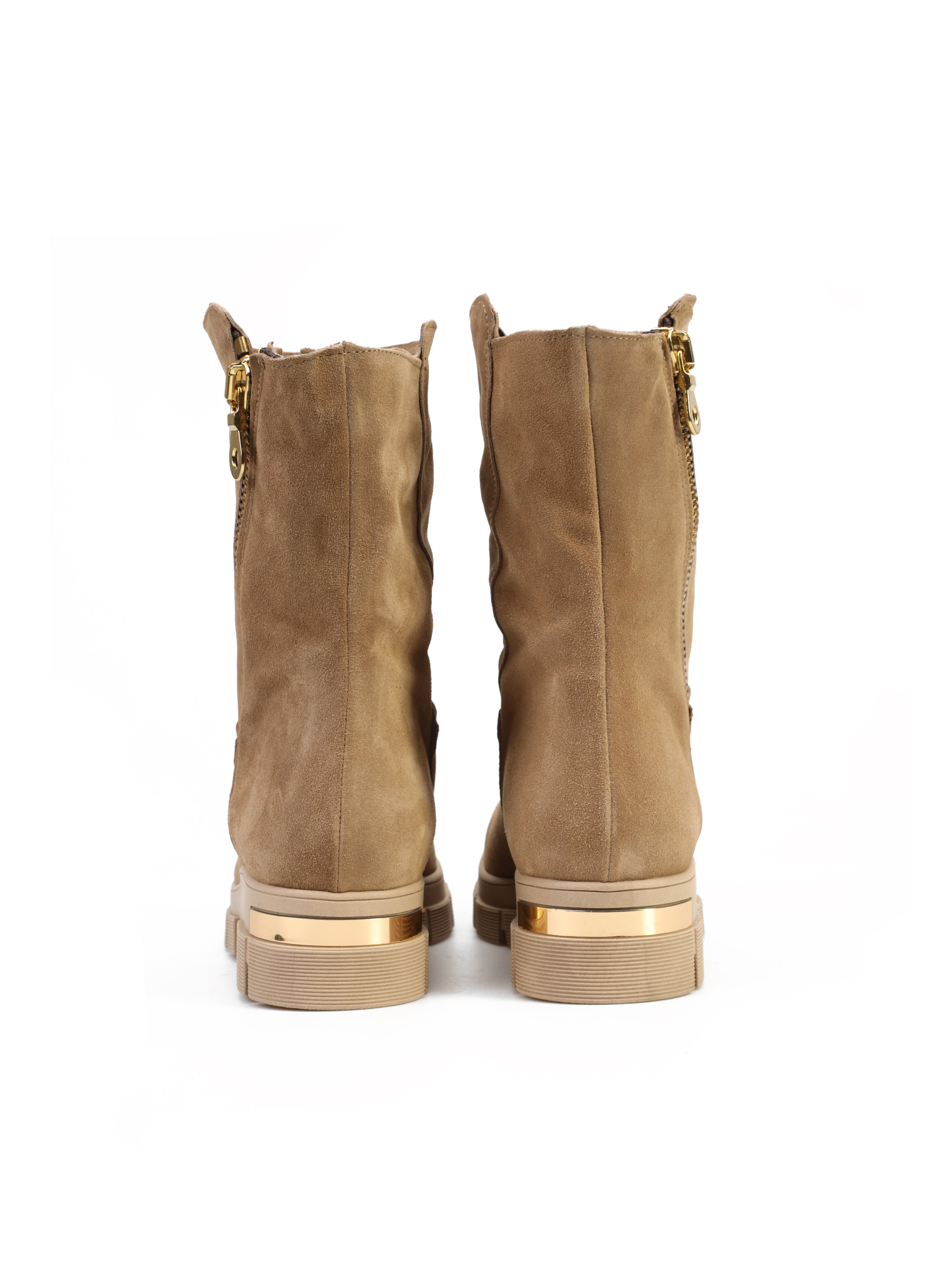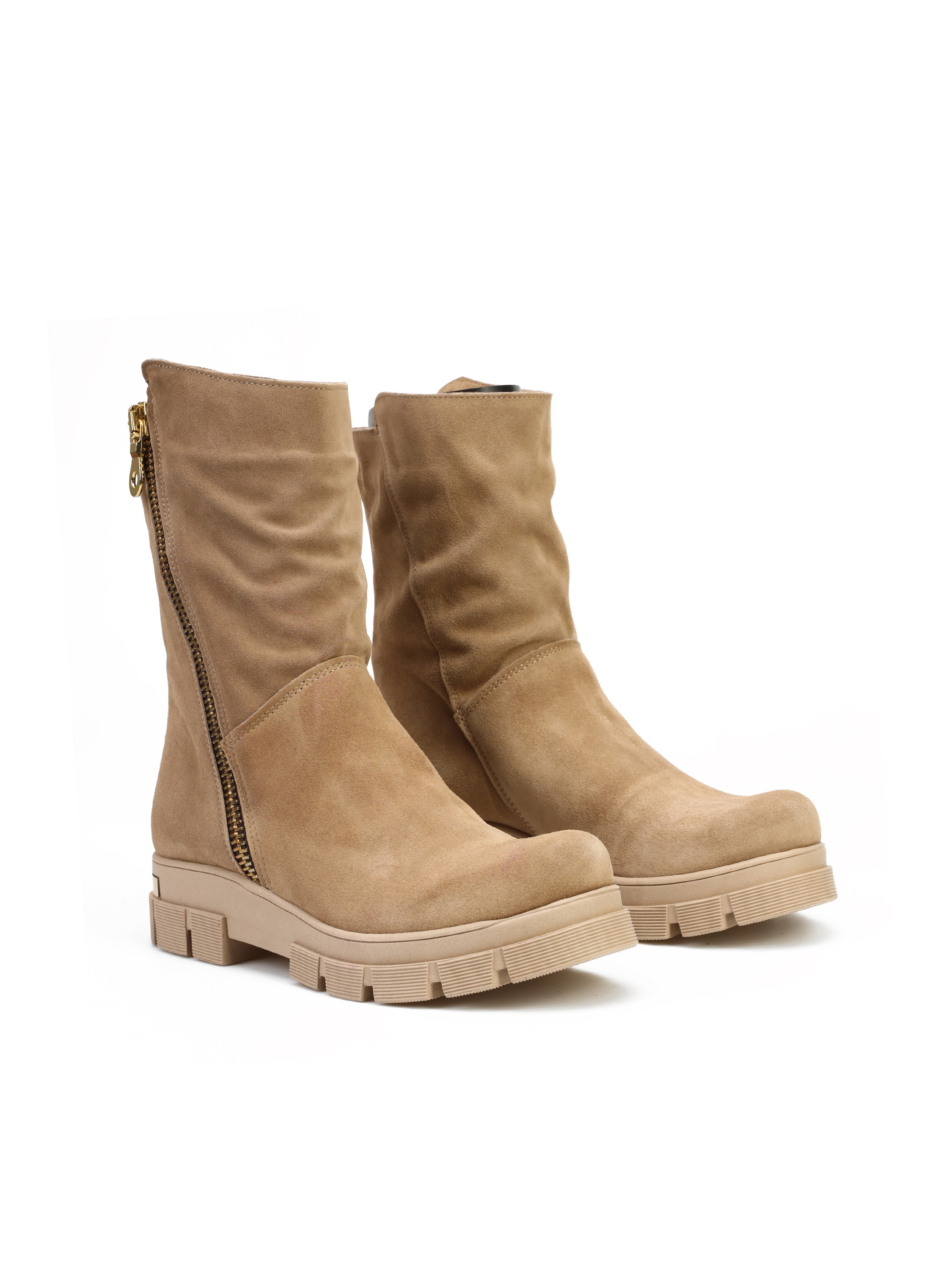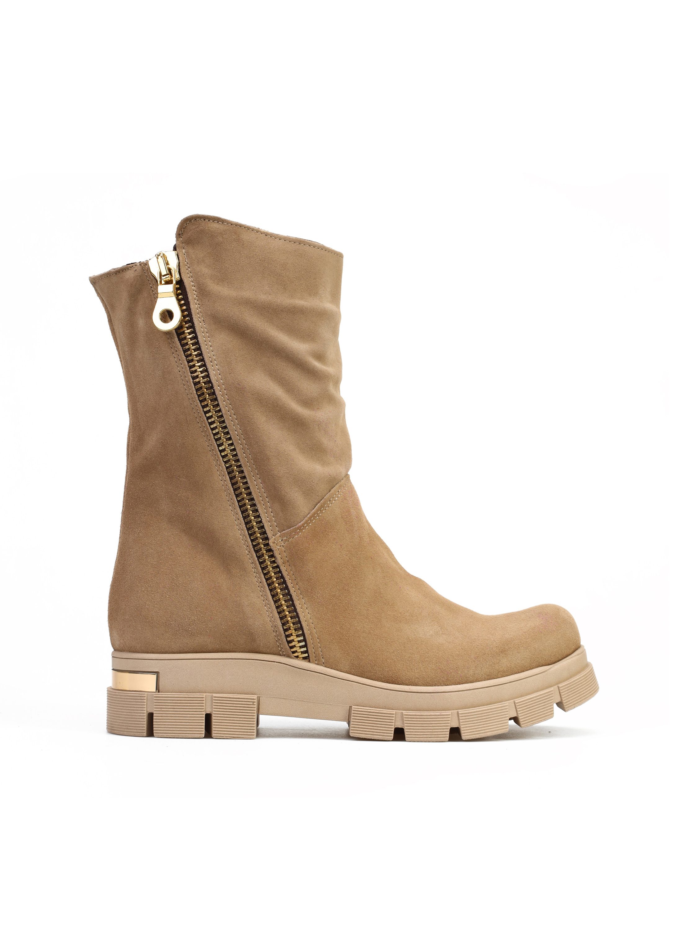 Botki na grubej podeszwie wykonane są z naturalnej skóry zamszowej. Cholewka za kostkę w beżowym kolorze zasuwana jest na zamek błyskawiczny. Złota blaszka z nazwą marki to detal, który wyróżnia ten model.