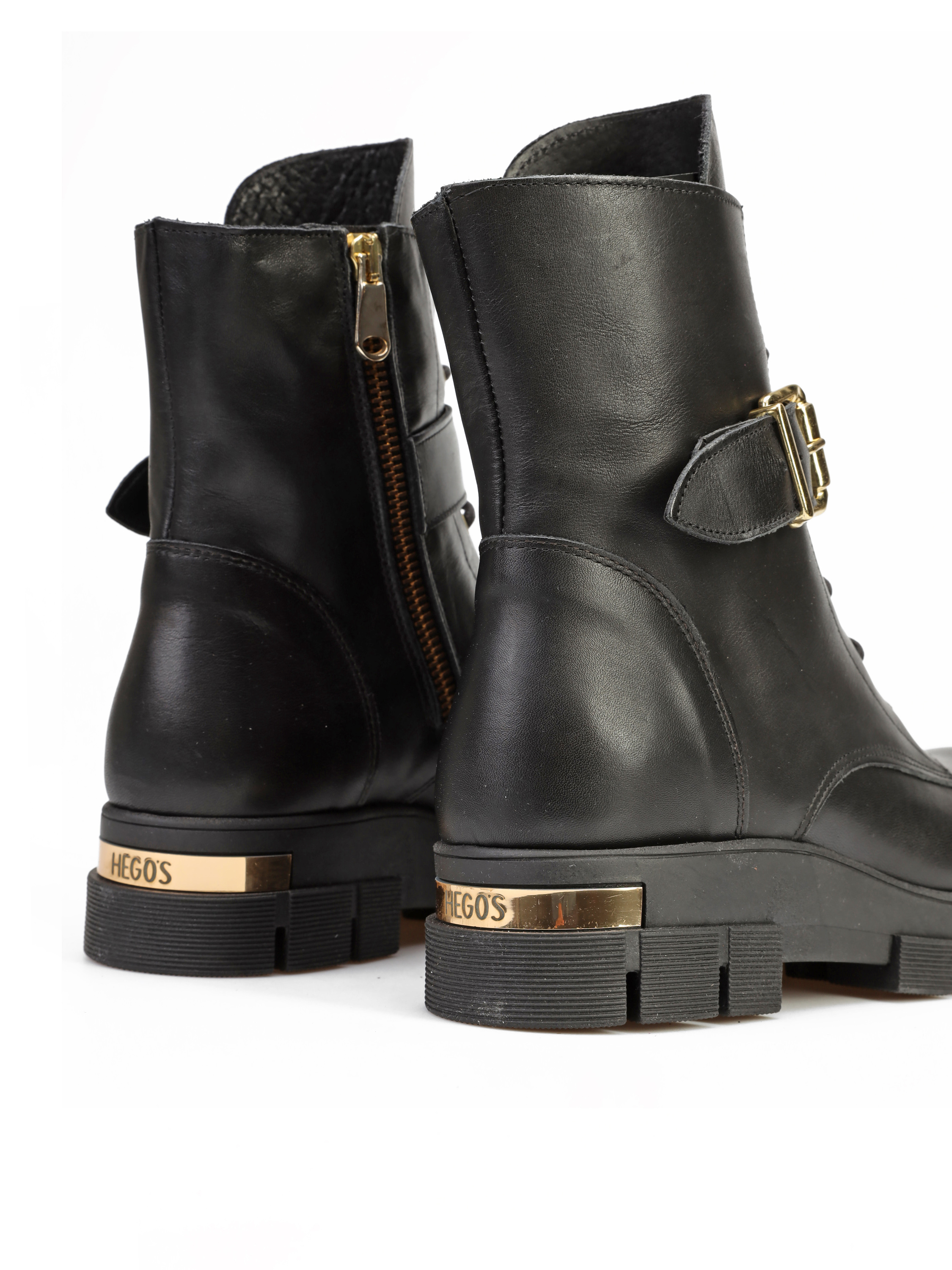 Botki na grubej podeszwie wykonane są z naturalnej skóry. Cholewka za kostkę w czarnym kolorze zapinana jest na zamek błyskawiczny. Dodatkowo posiada wiązanie, które pozwala dopasować obuwie do nogi. Detale w postaci złotej, metalowej blaszki oraz złota klamra wyróżniają ten model.