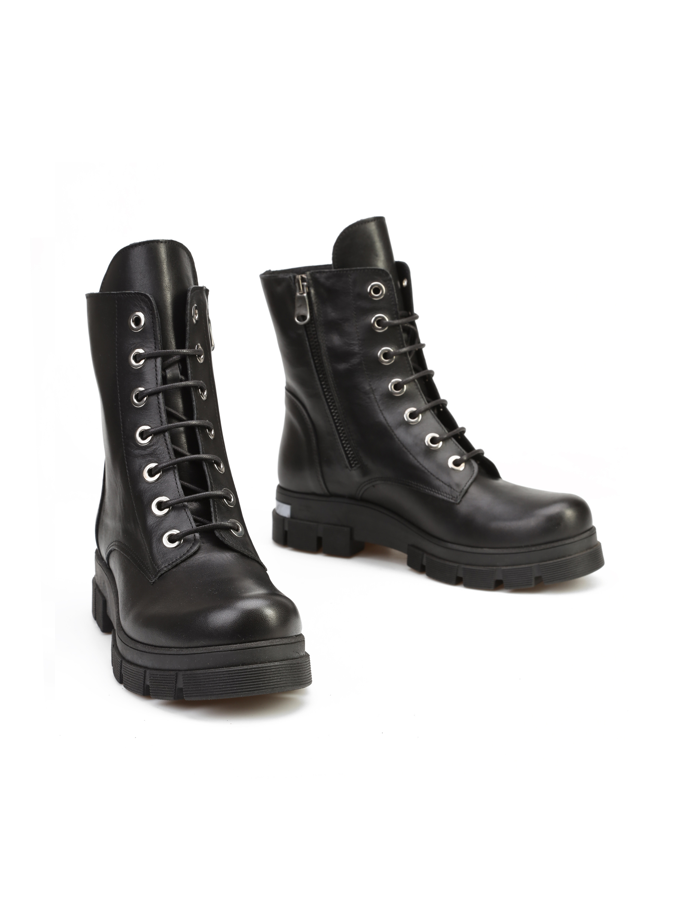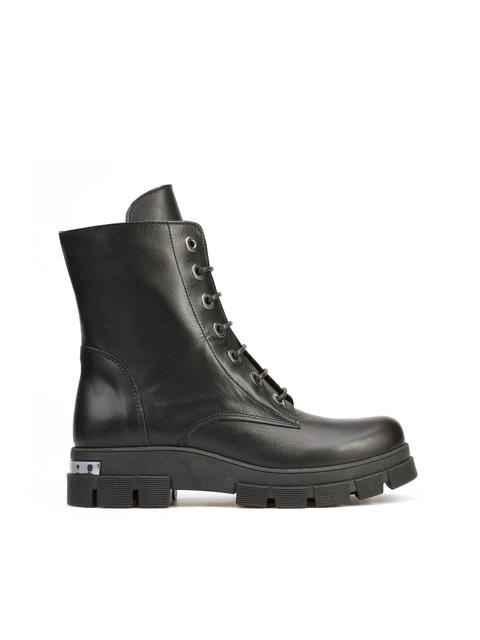 Botki na grubej podeszwie wykonane są z naturalnej skóry. Cholewka za kostkę w czarnym kolorze zapinana jest na zamek błyskawiczny. Dodatkowo posiada wiązanie, które pozwala dopasować obuwie do nogi. Detale w postaci srebrnej, metalowej blaszki oraz klamry wyróżniają ten model.