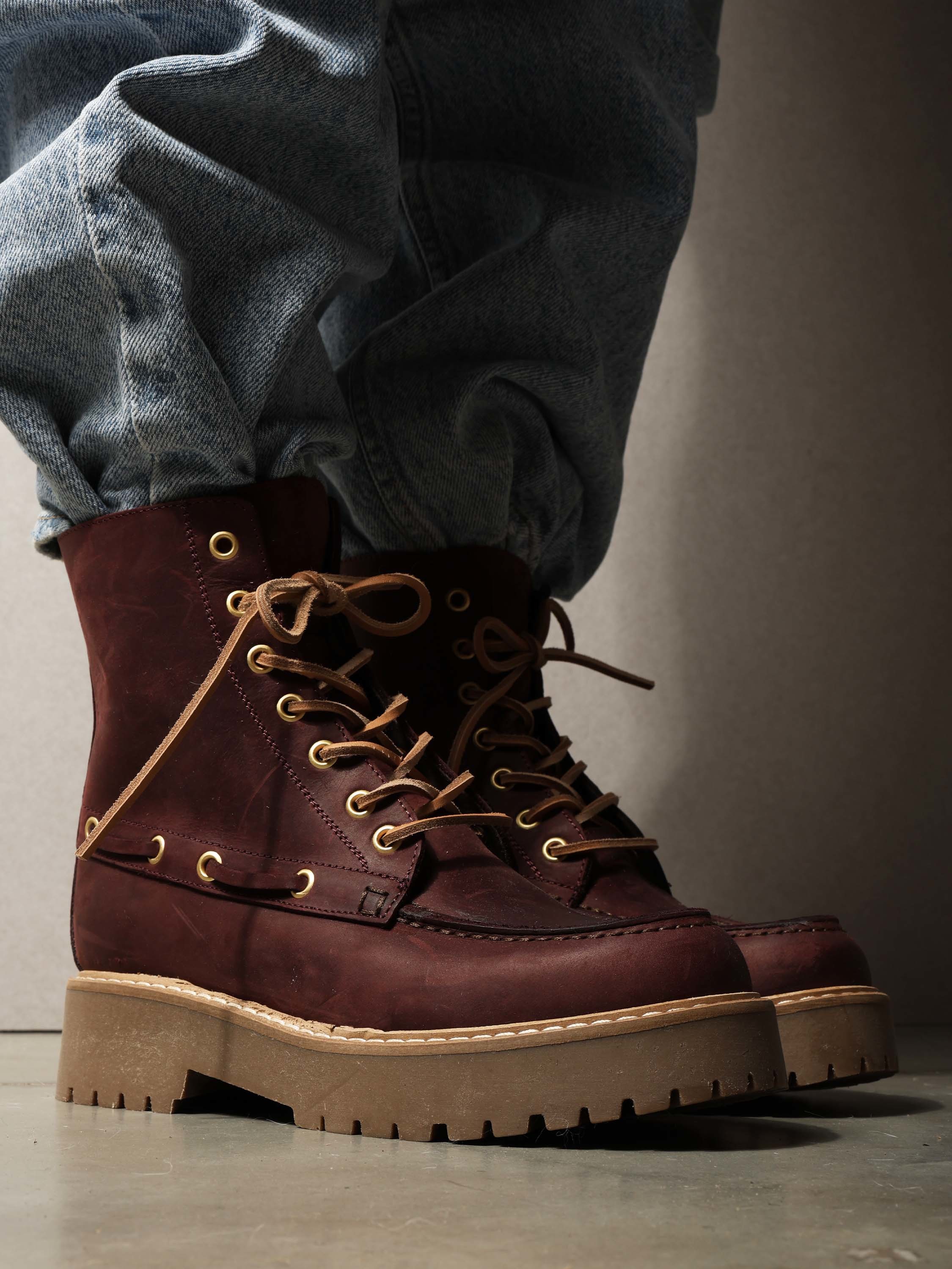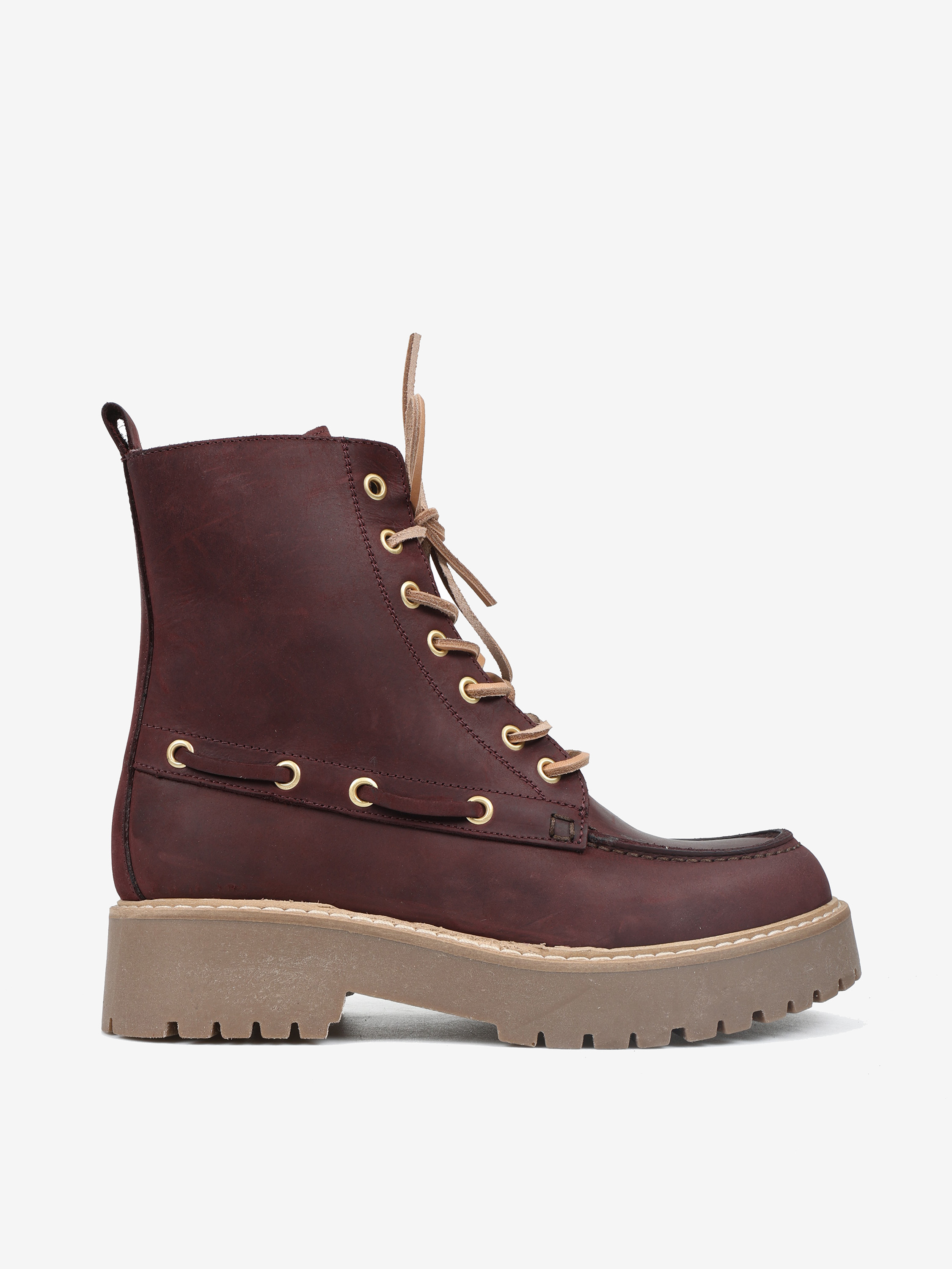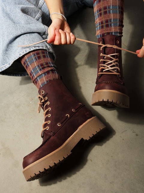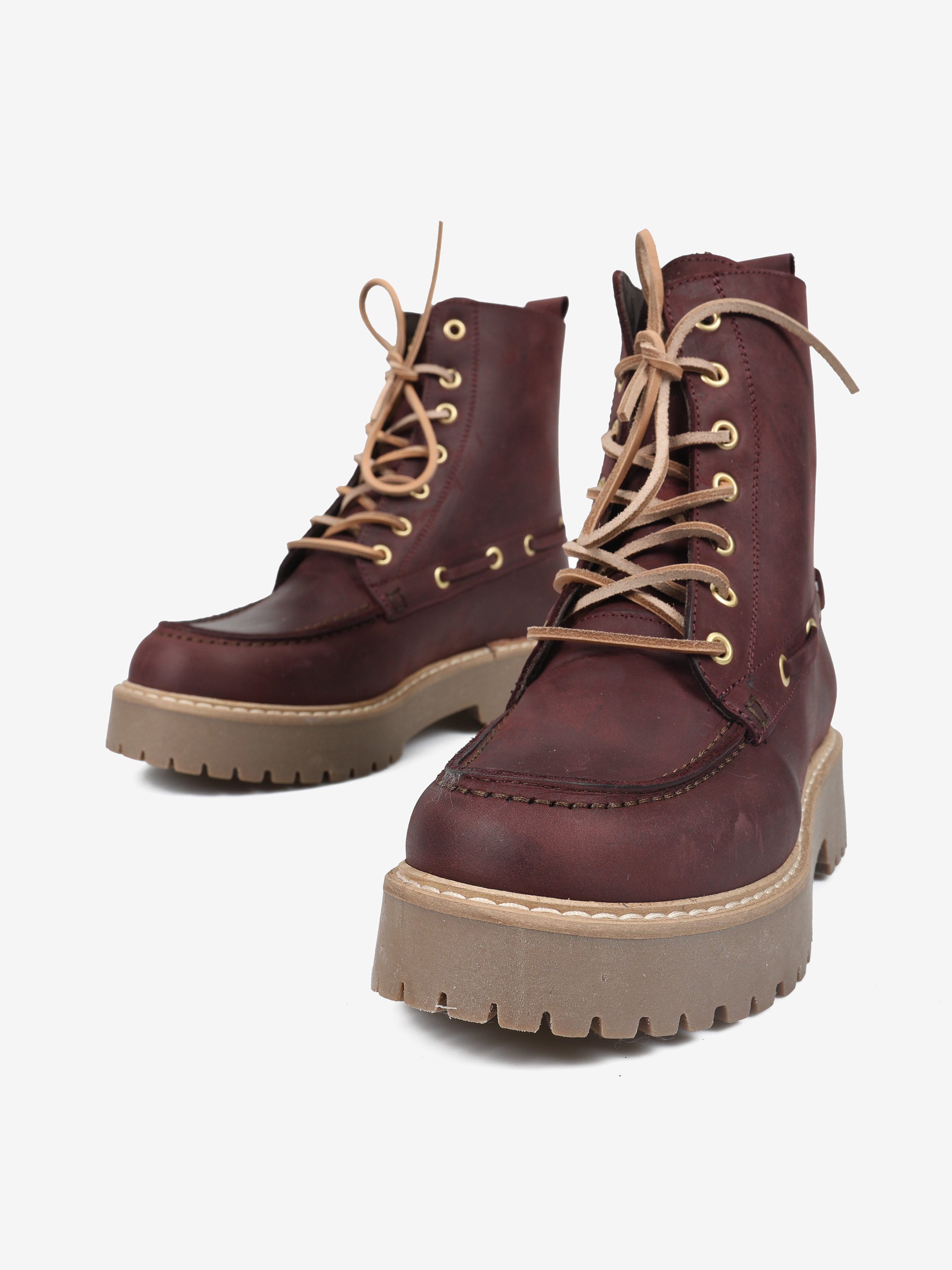 Botki na platformie w stylu boat shoe. Wykonane z bordowego nubuku i szurowane na rzemyk.