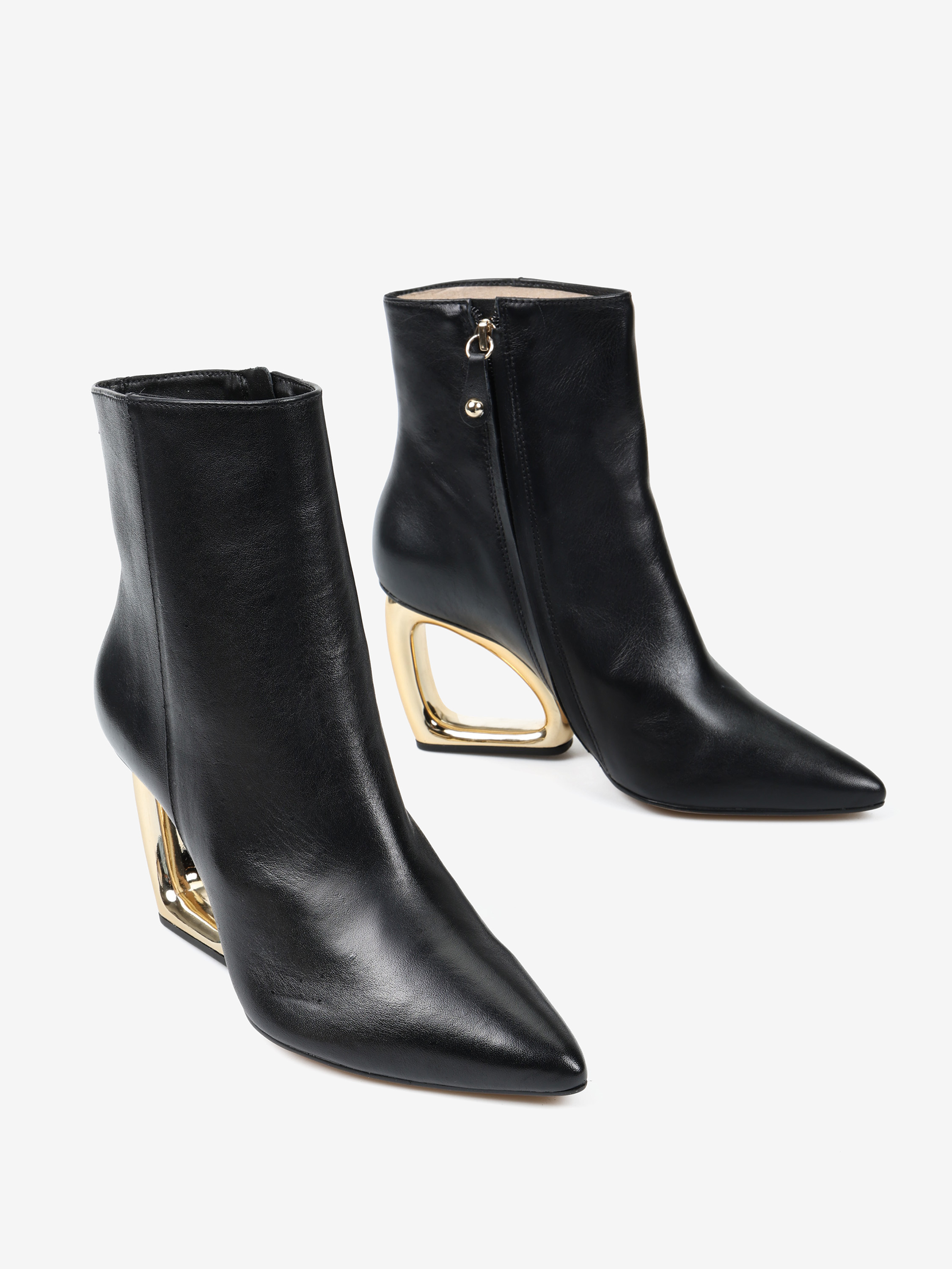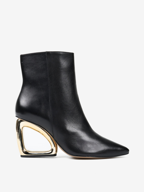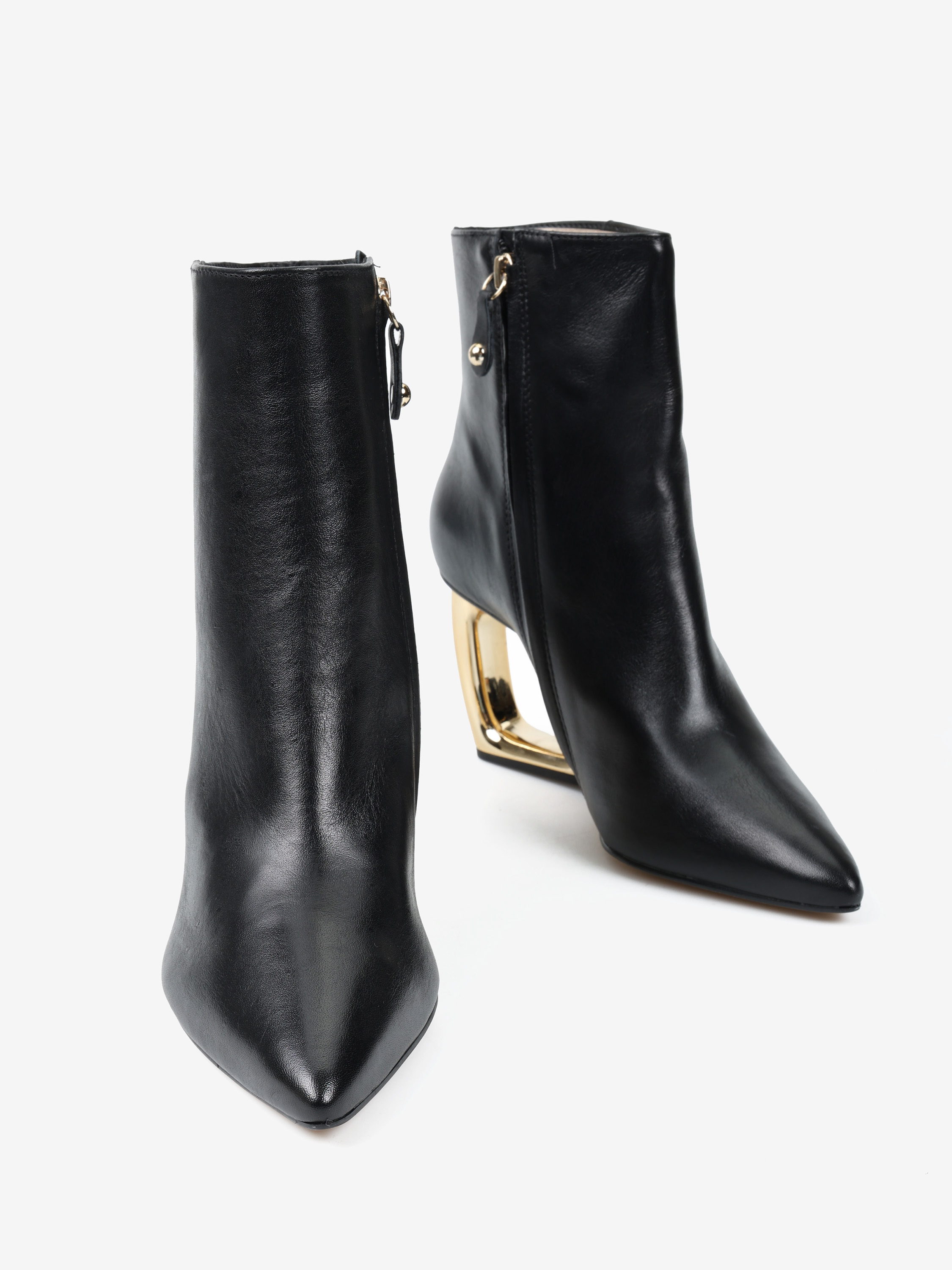 Eleganckie botki z zapięciem na zamek, wykonane z miękkiej i delikatnej skóry. Geometryczny, złoty obcas i nosek w szpic.
