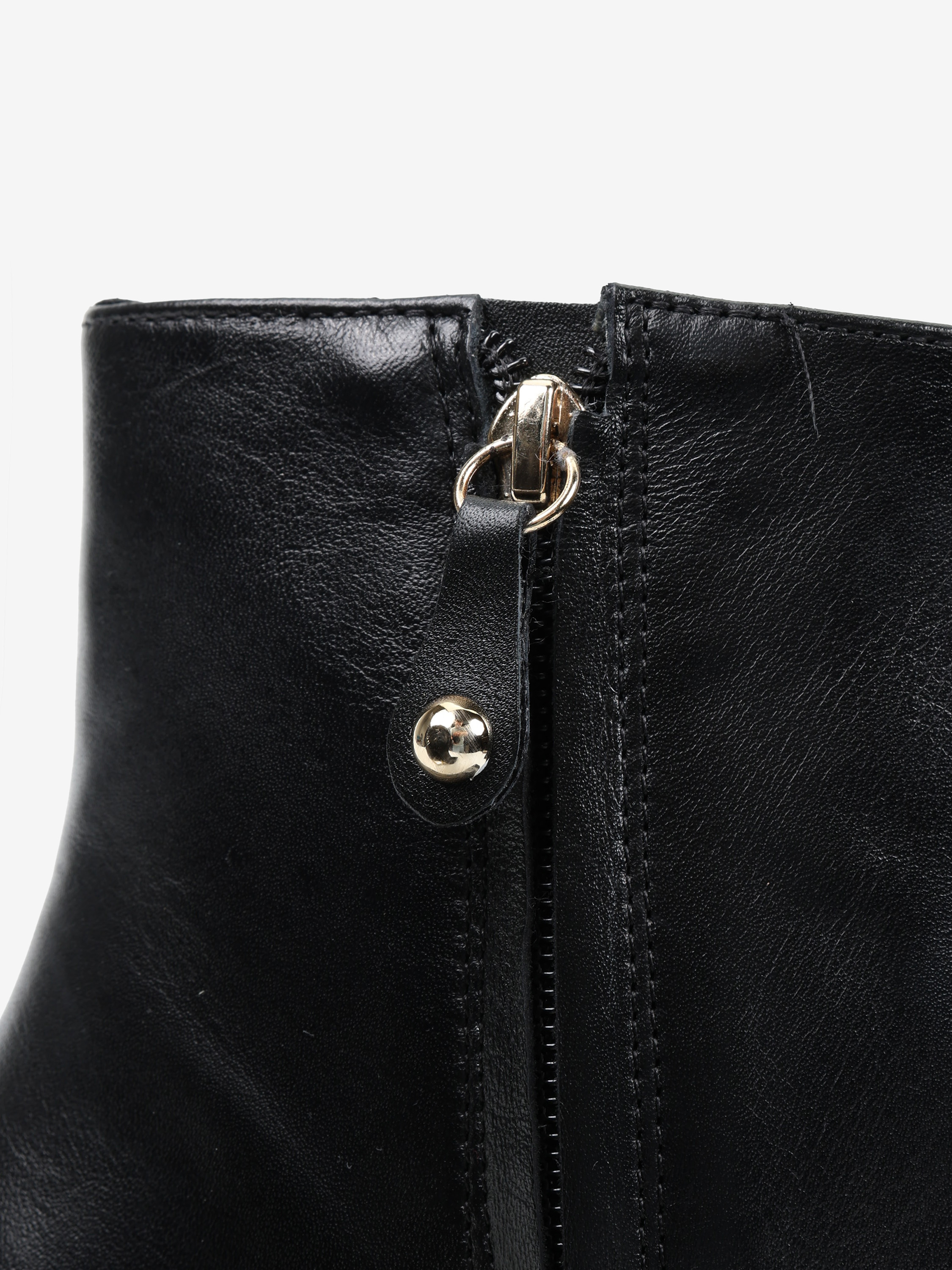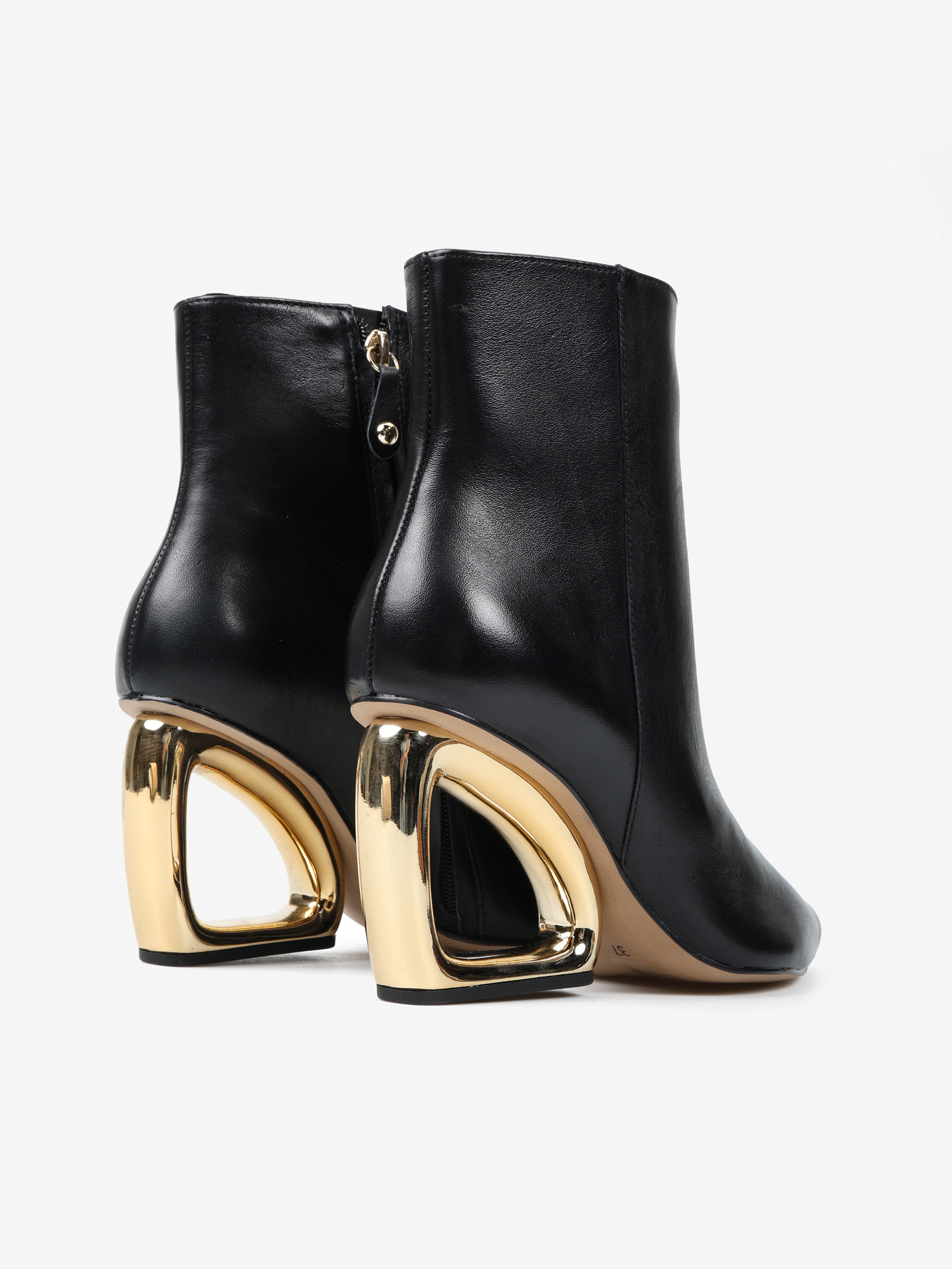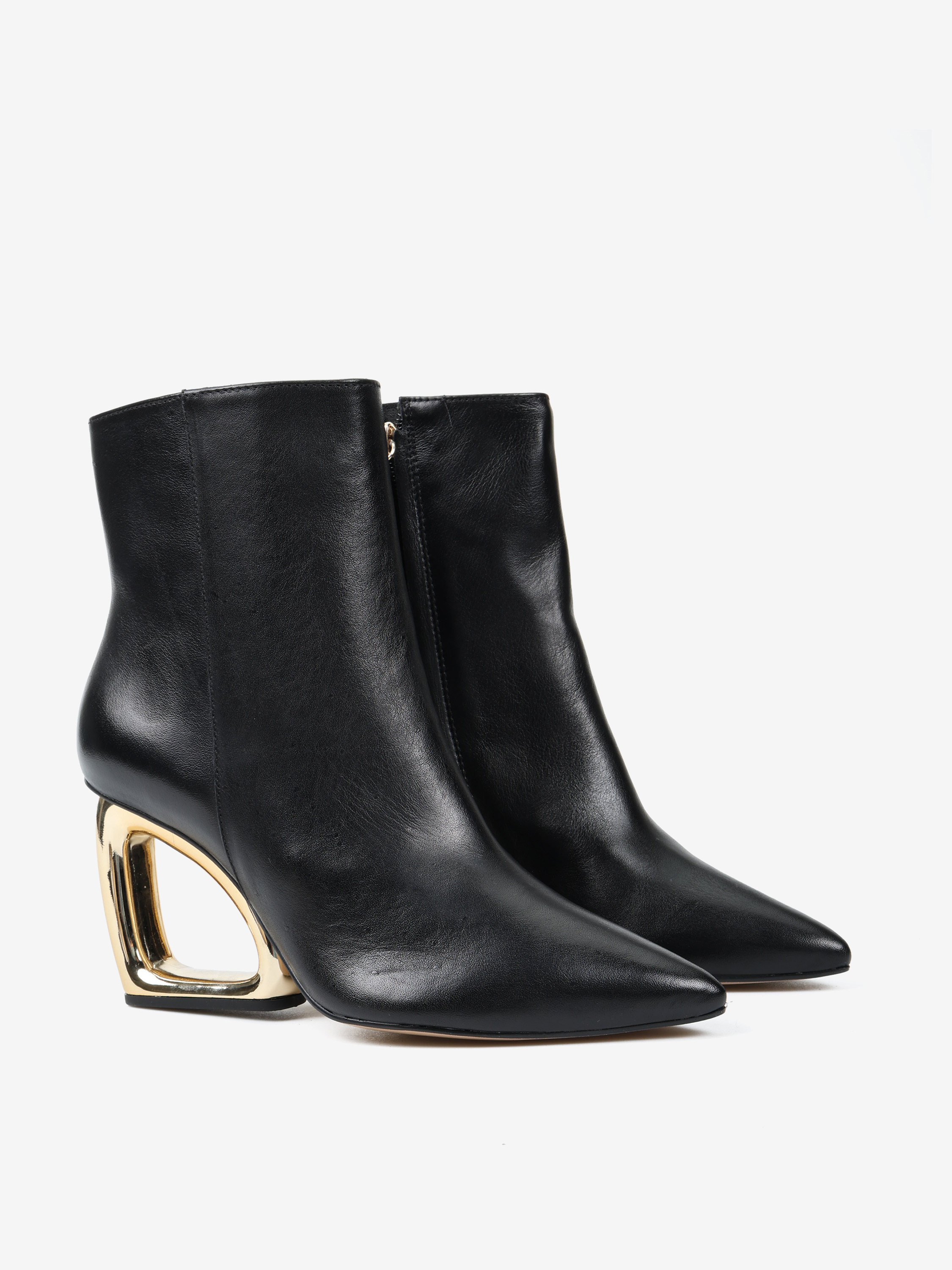 Eleganckie botki z zapięciem na zamek, wykonane z miękkiej i delikatnej skóry. Geometryczny, złoty obcas i nosek w szpic.