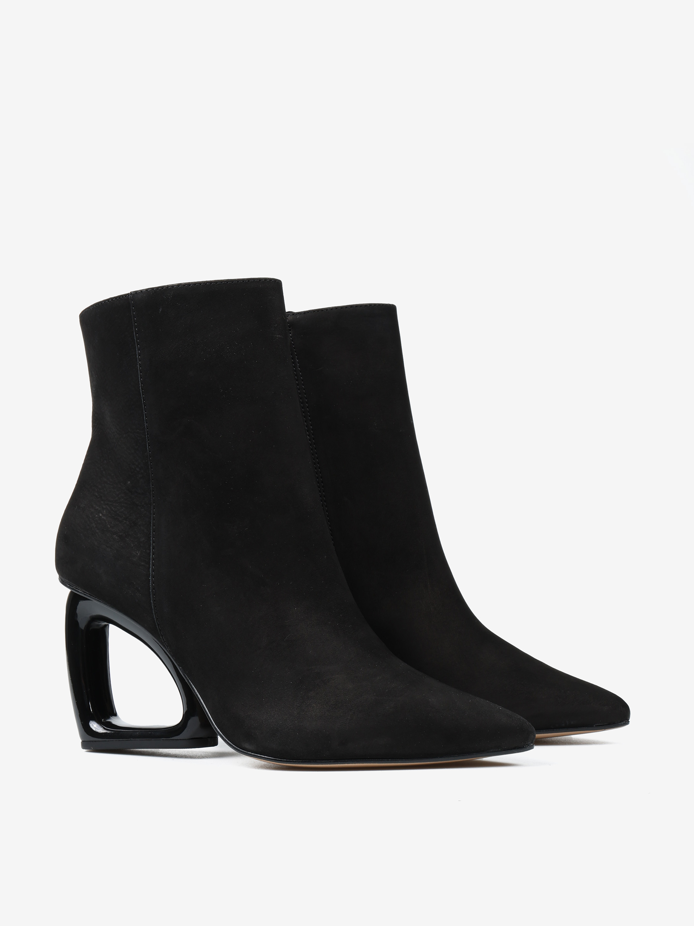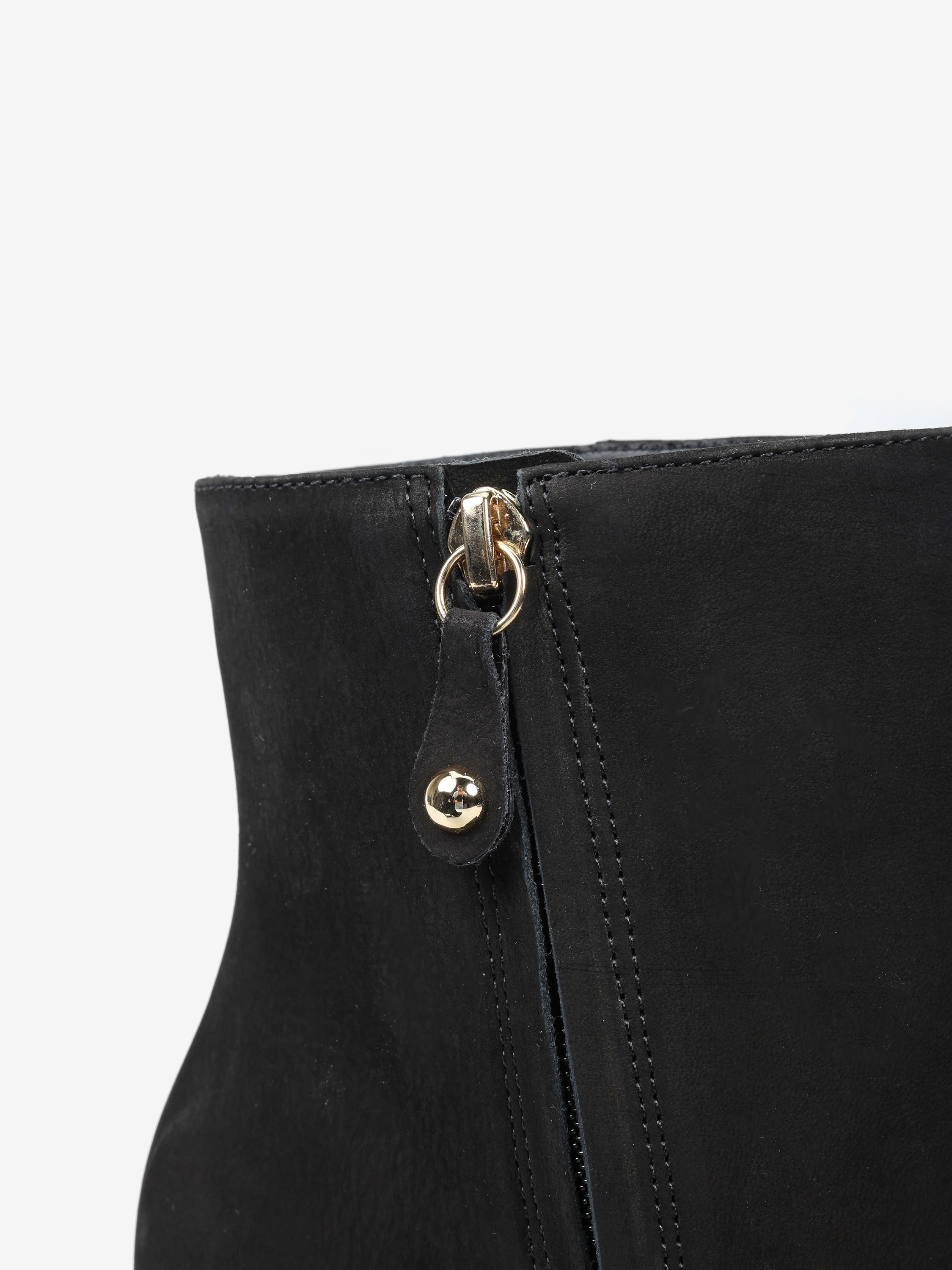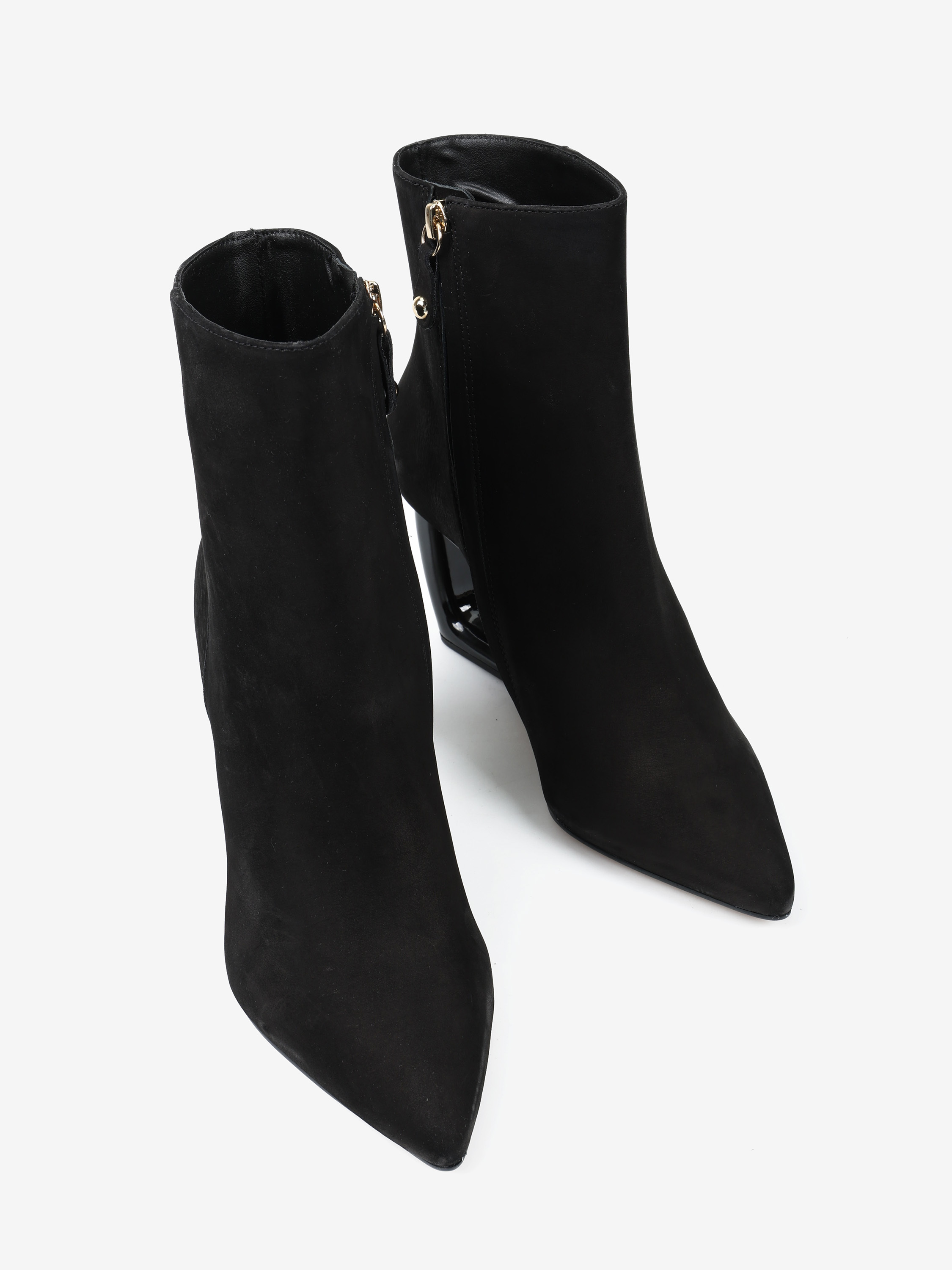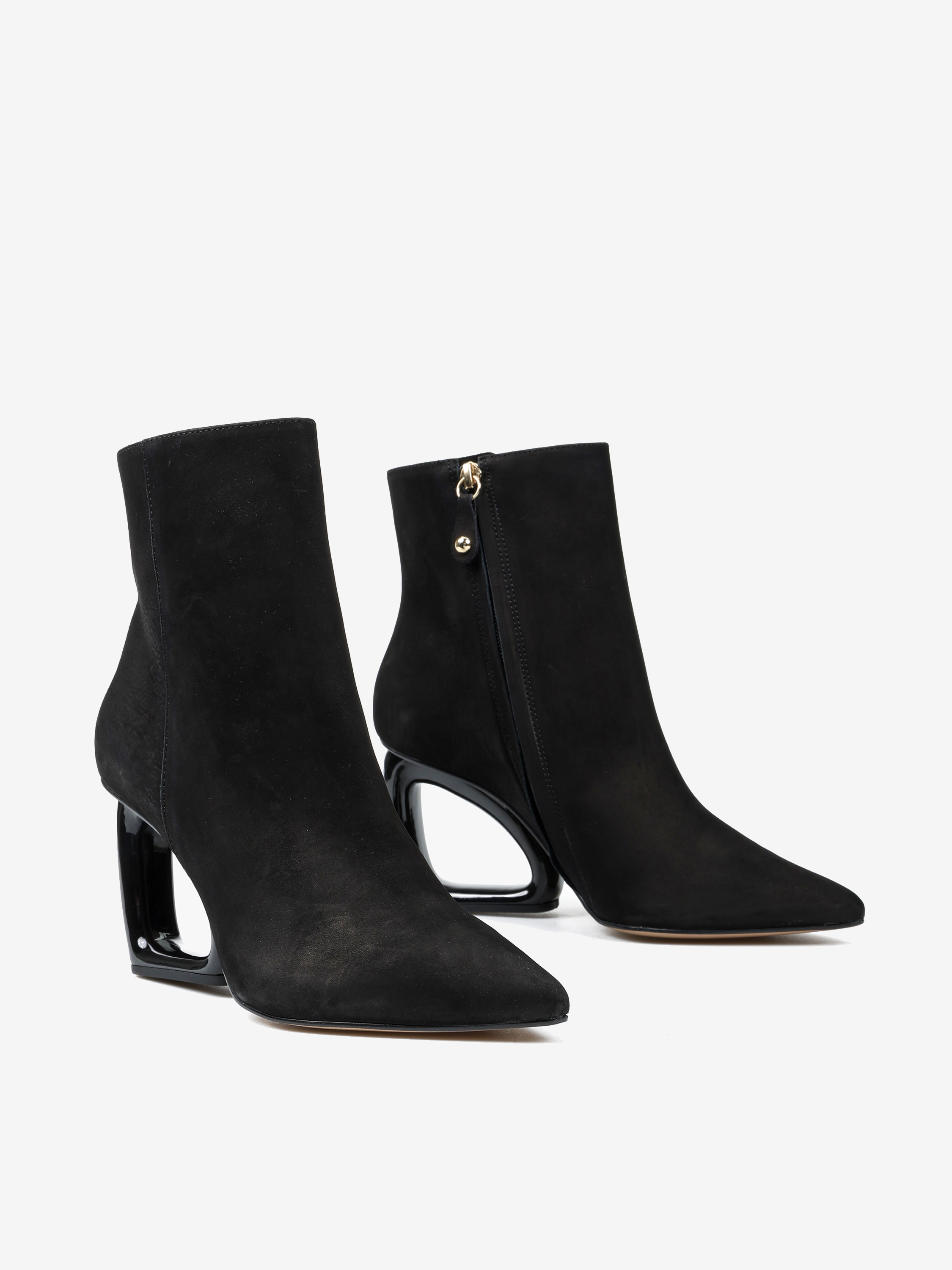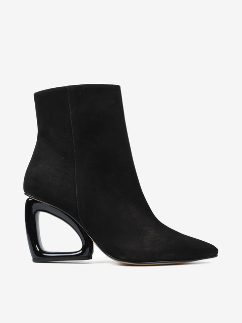 Eleganckie nubukowe botki z zapięciem na zamek. Geometryczny, czarny obcas i nosek w szpic.