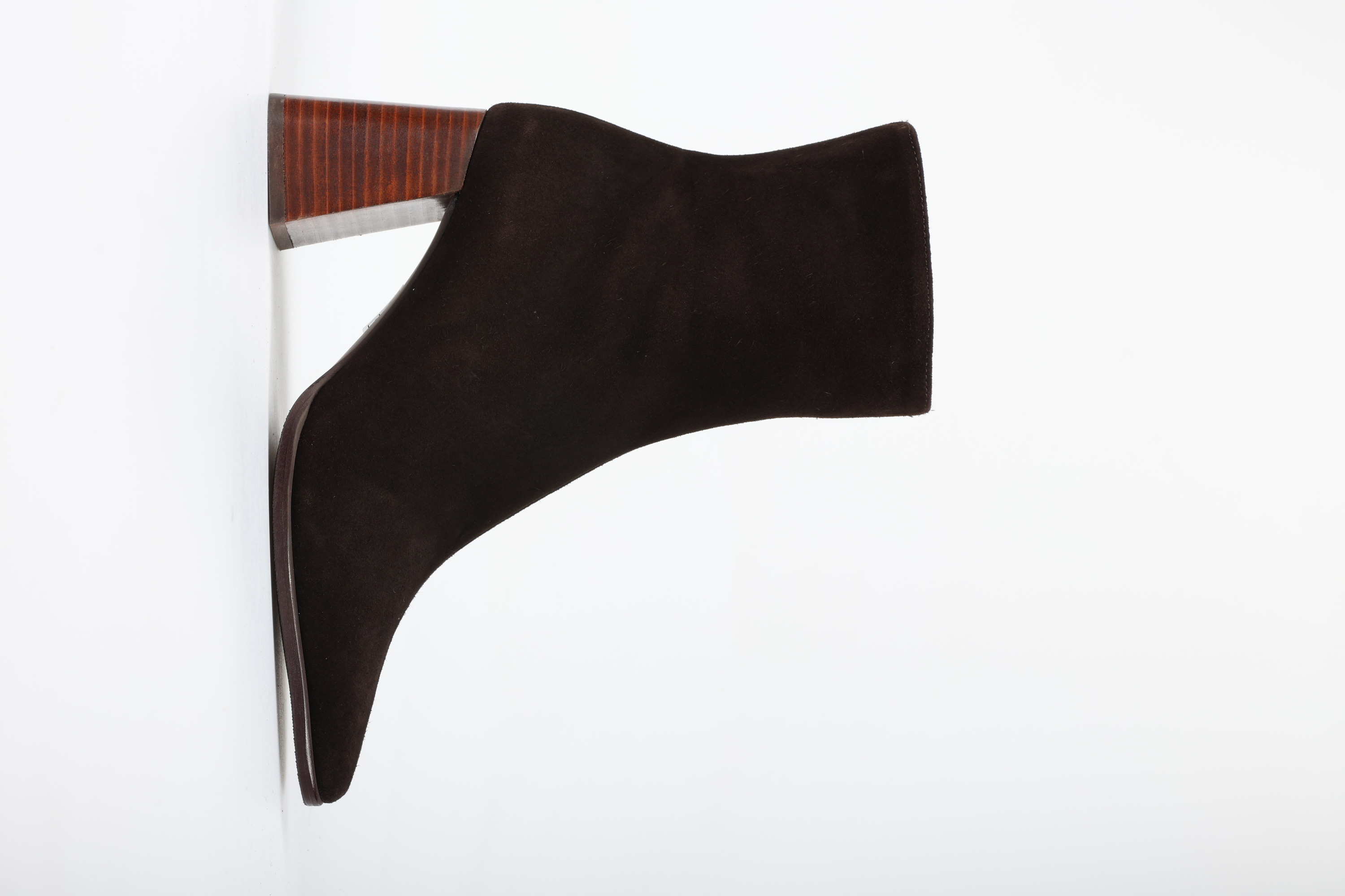 Zamszowe botki na rozszerzanym słupku. Wydłużone noski i zapięcie na suwak.