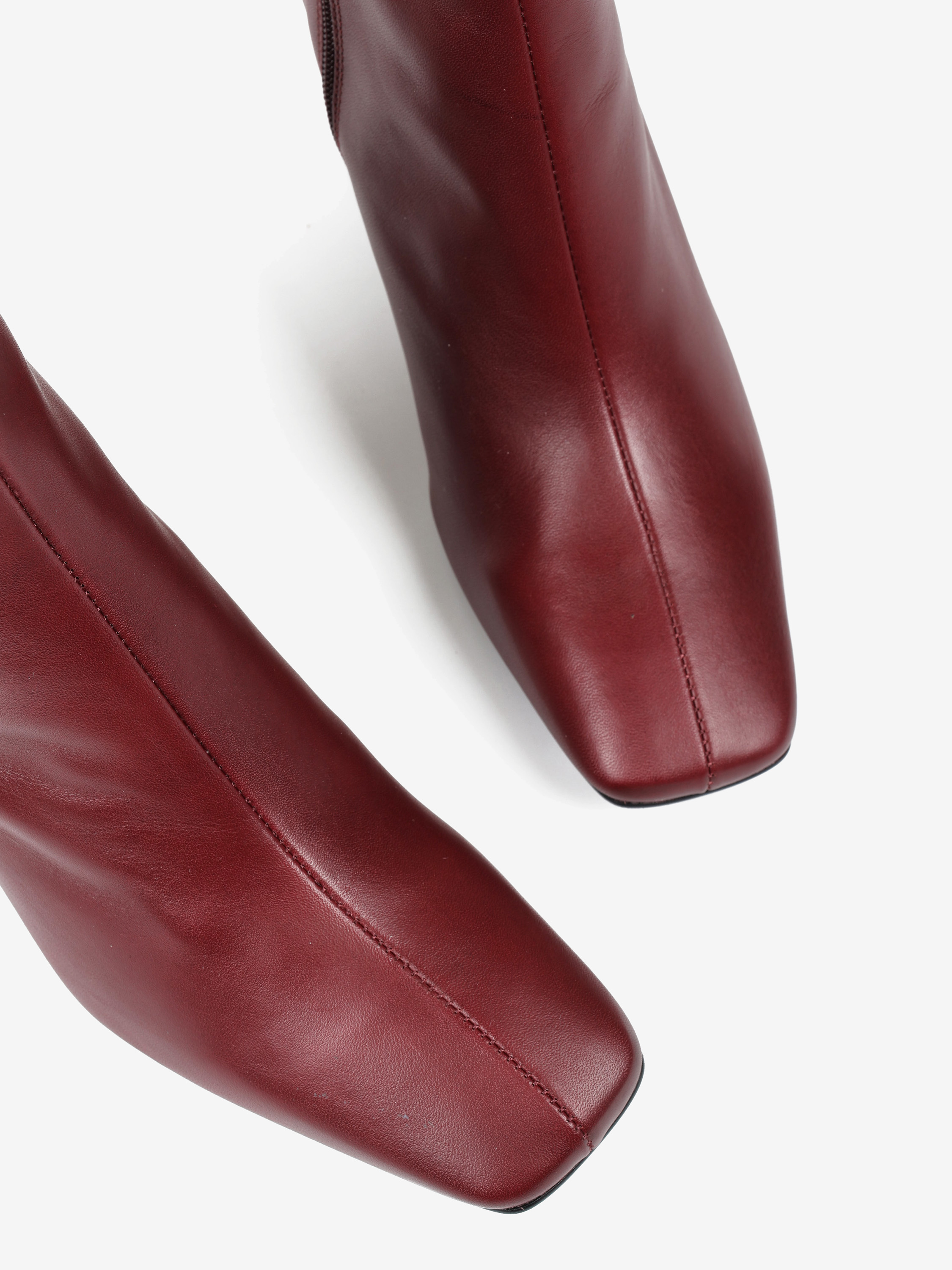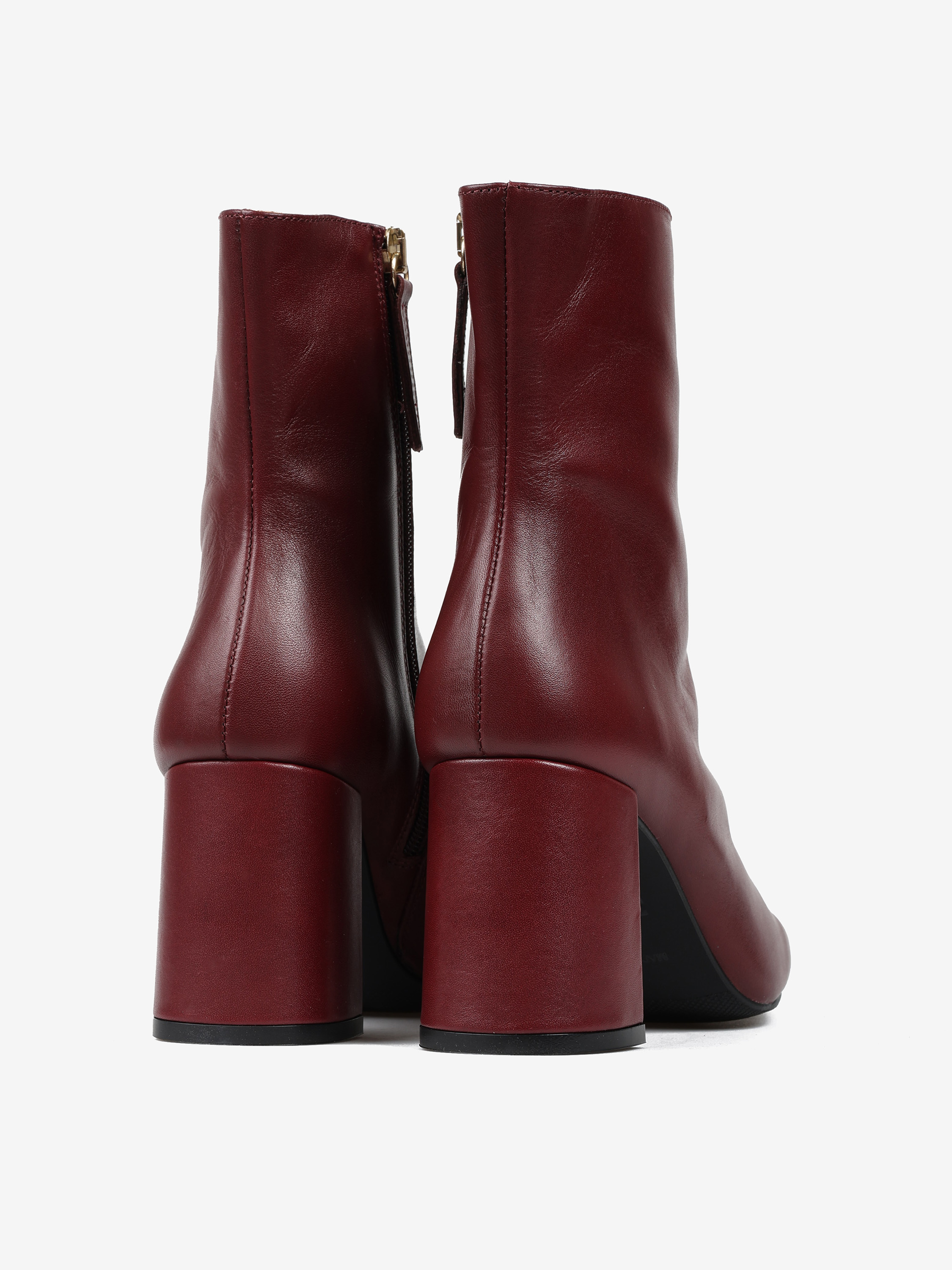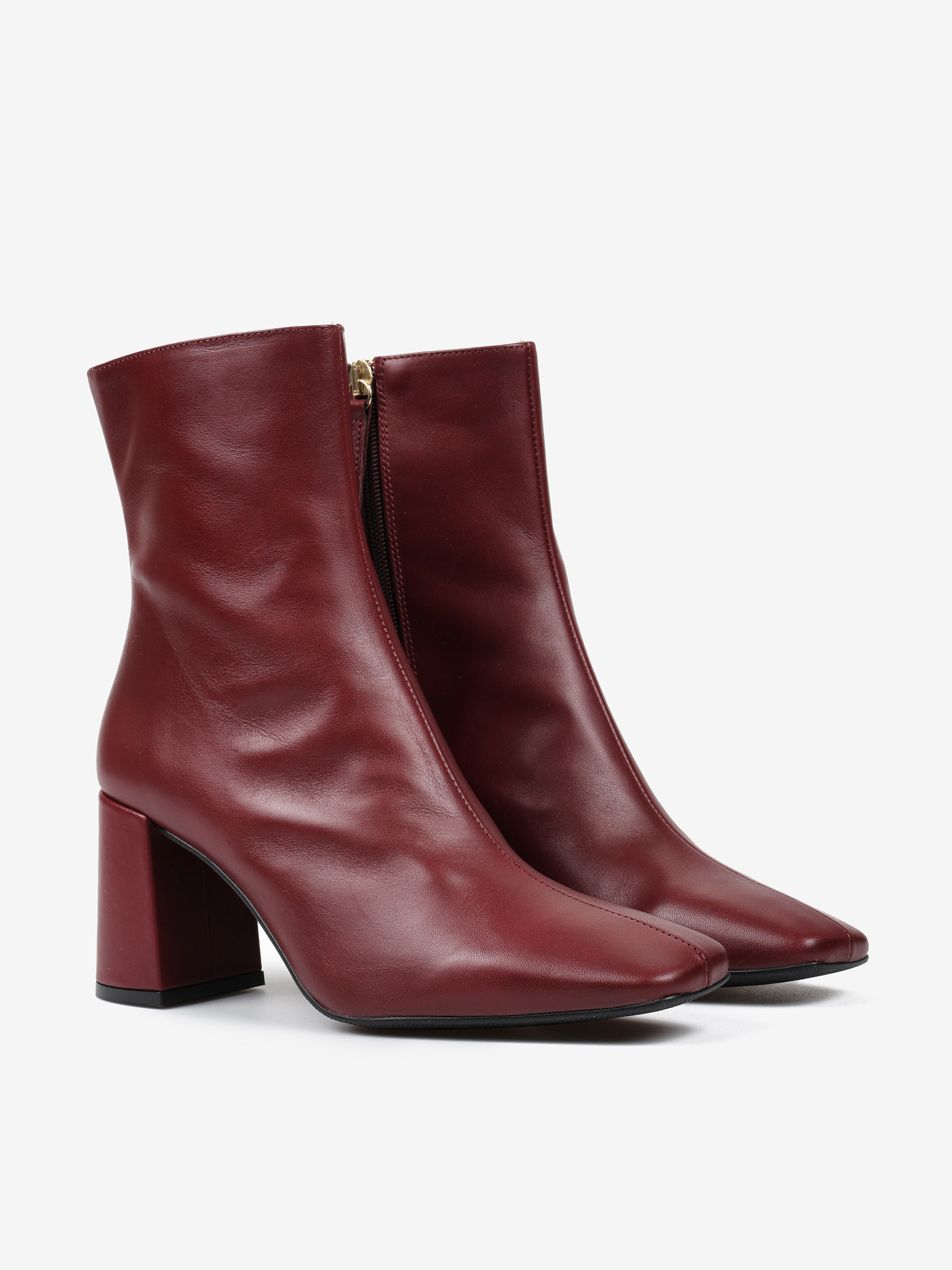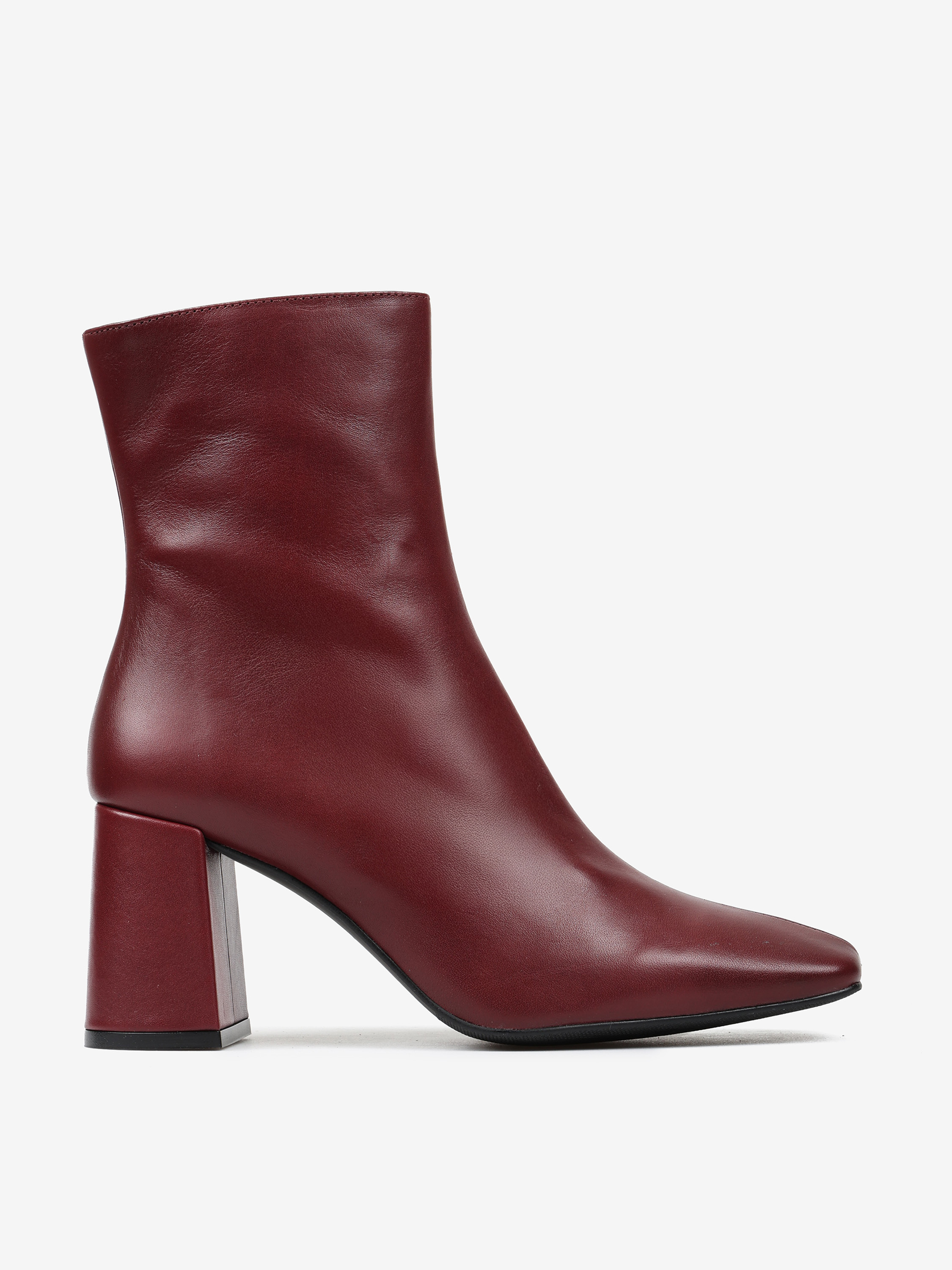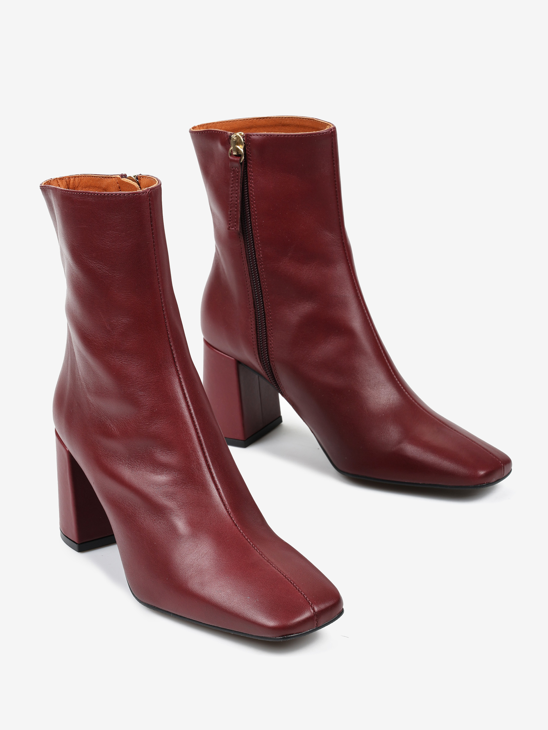 Bordowe botki na rozszerzanym słupku. Kwadratowe noski i zapięcie na suwak.