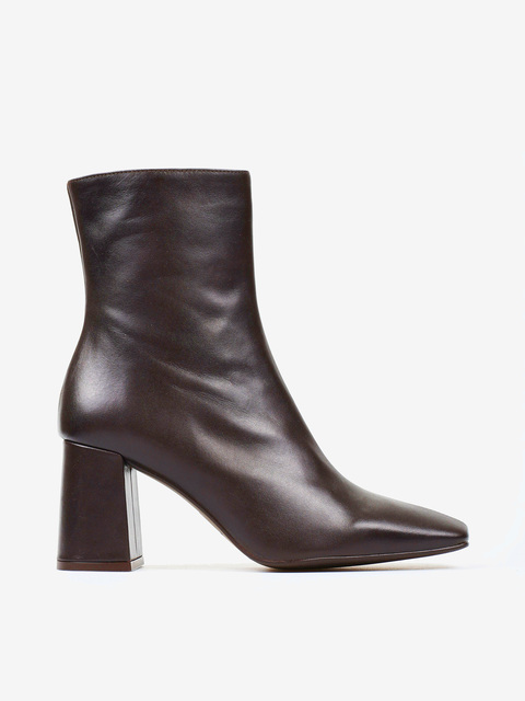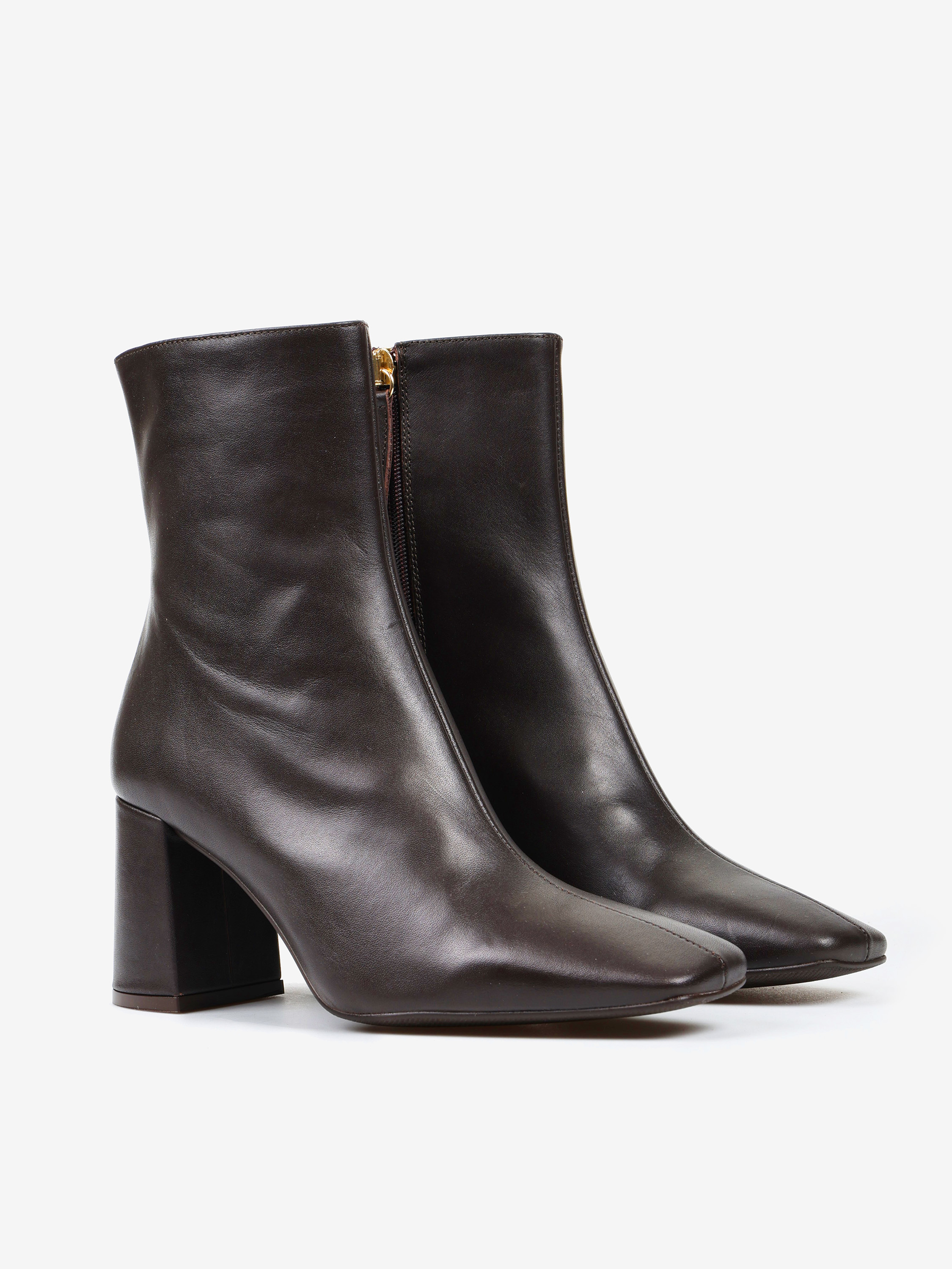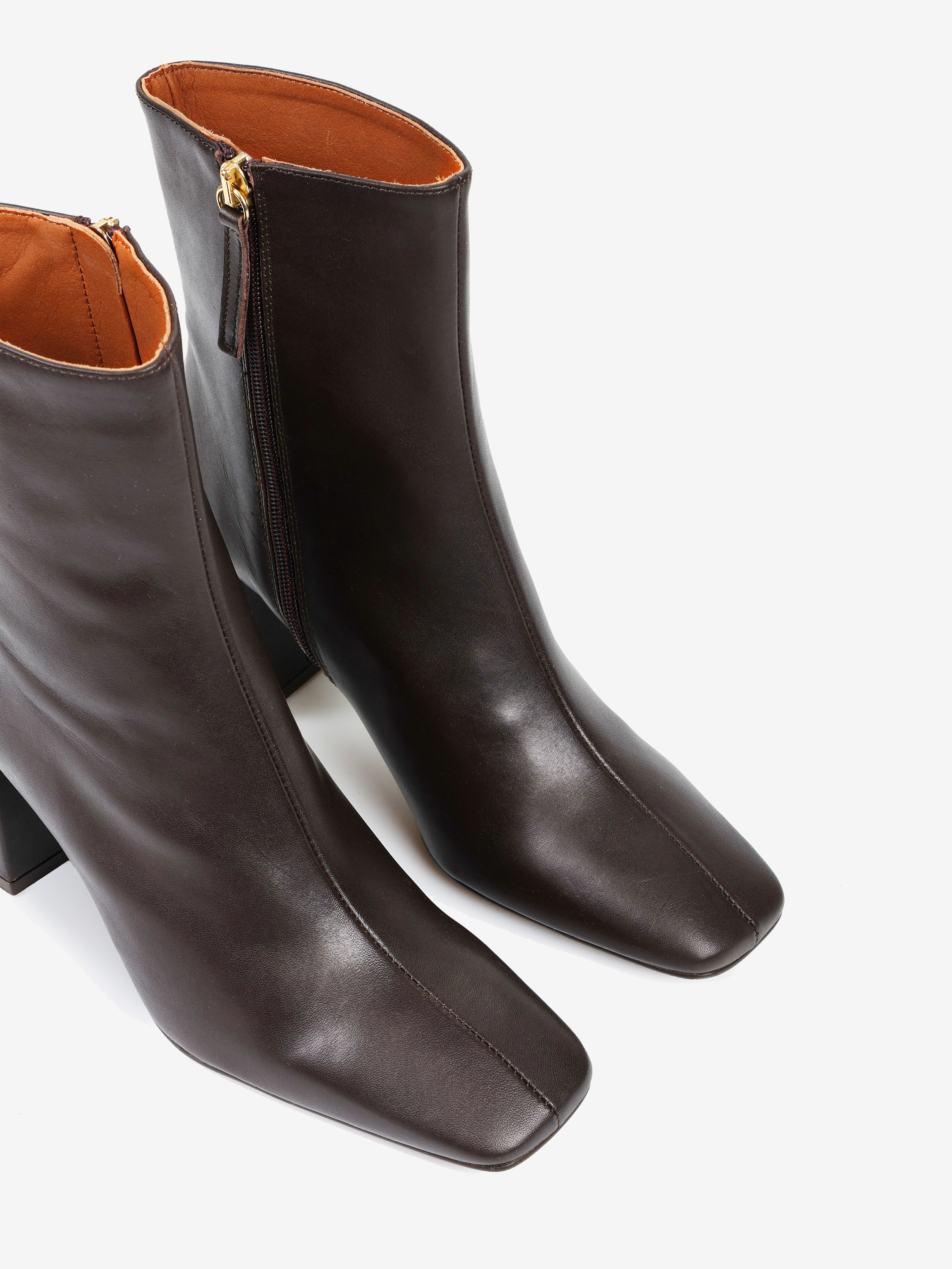 Brązowe botki na rozszerzanym słupku. Kwadratowe noski i zapięcie na suwak.