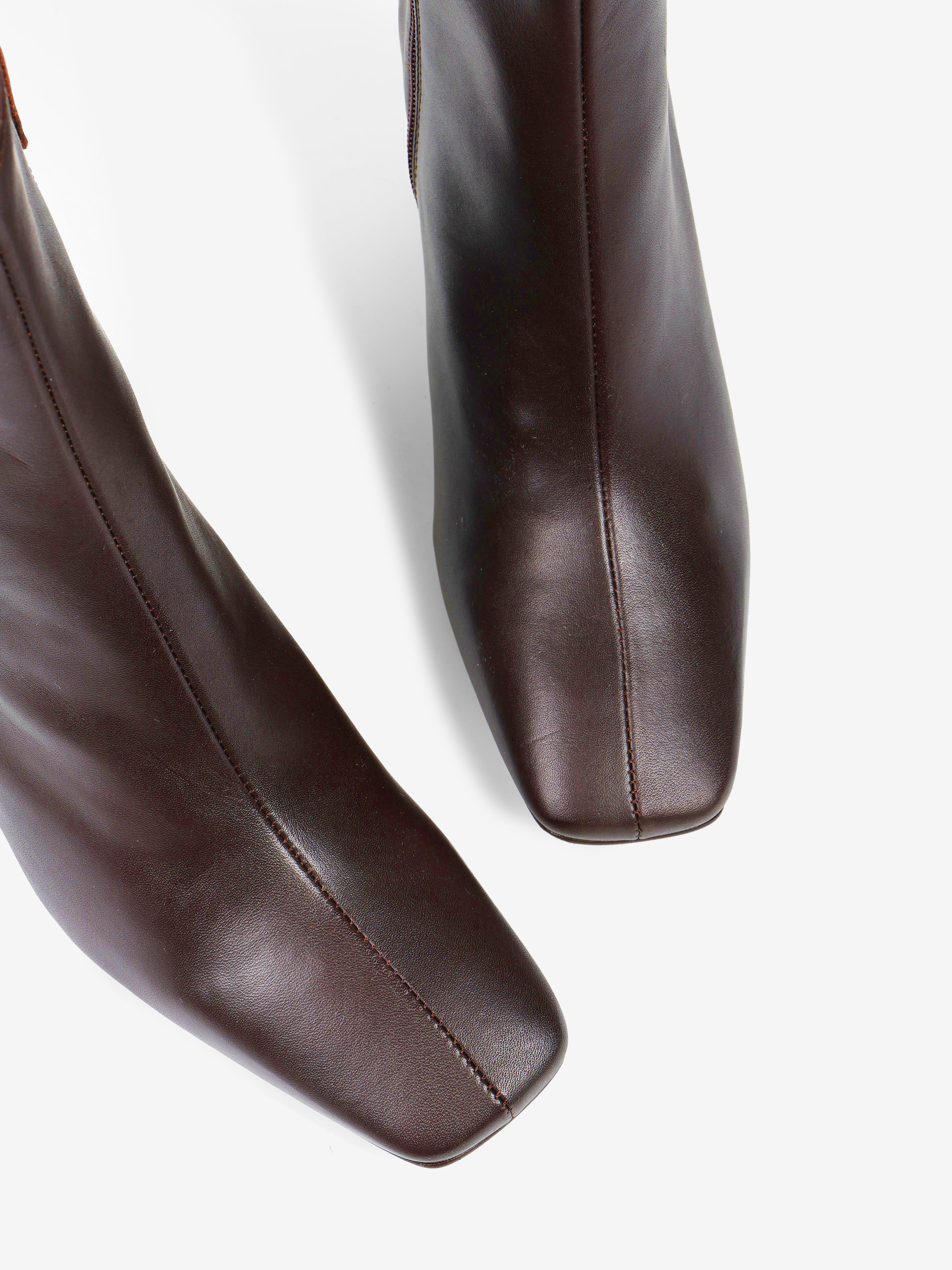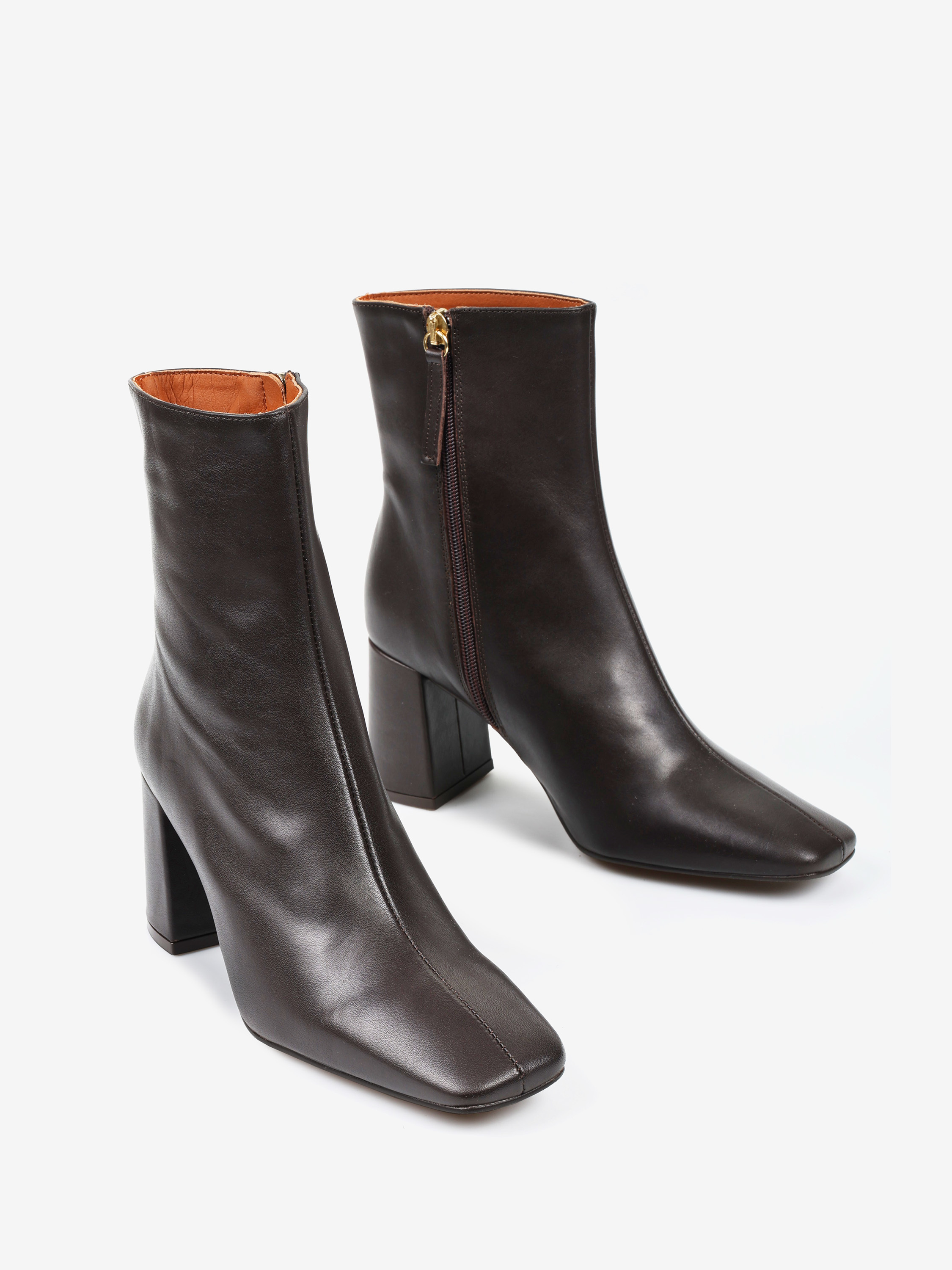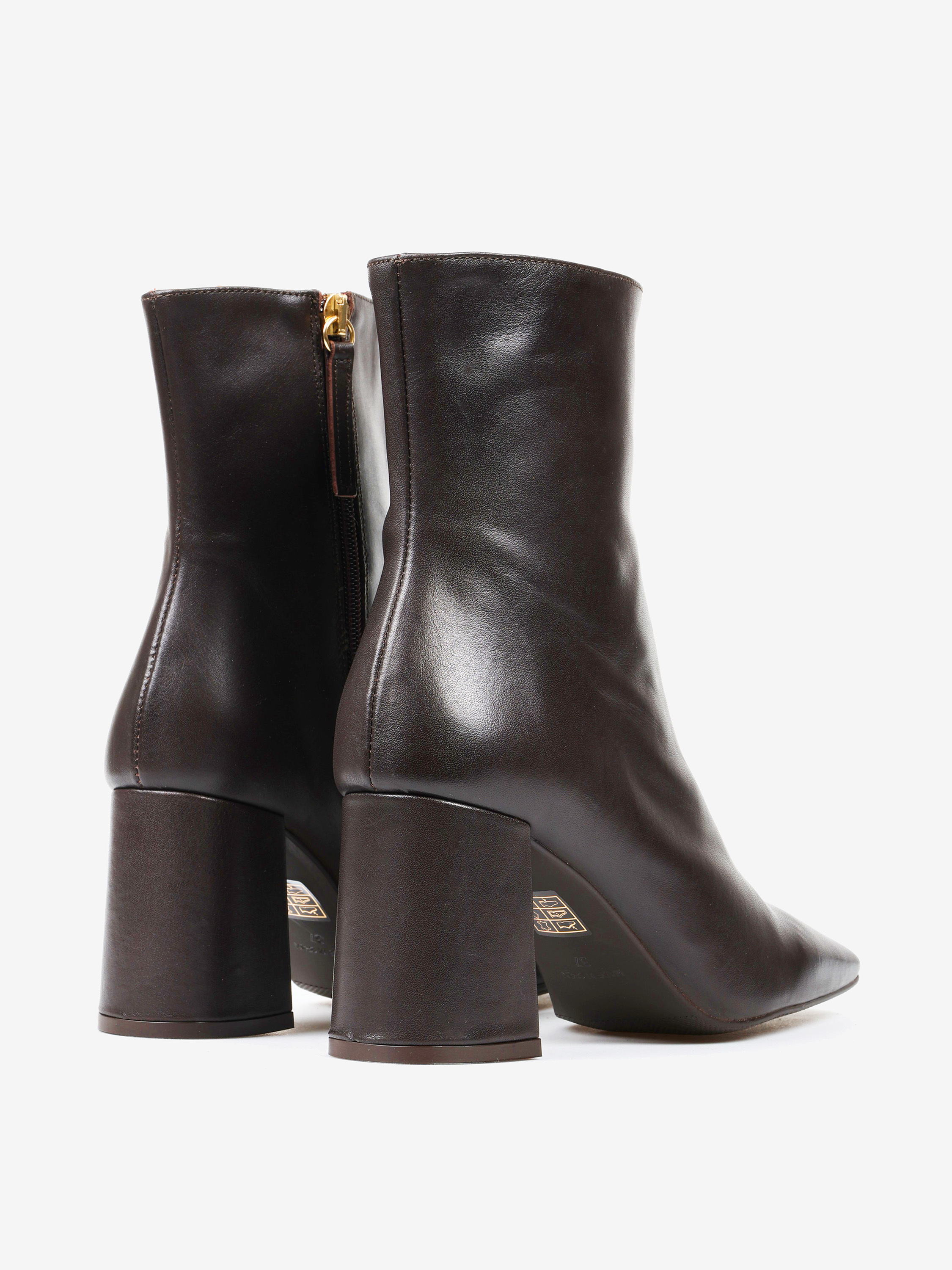 Brązowe botki na rozszerzanym słupku. Kwadratowe noski i zapięcie na suwak.