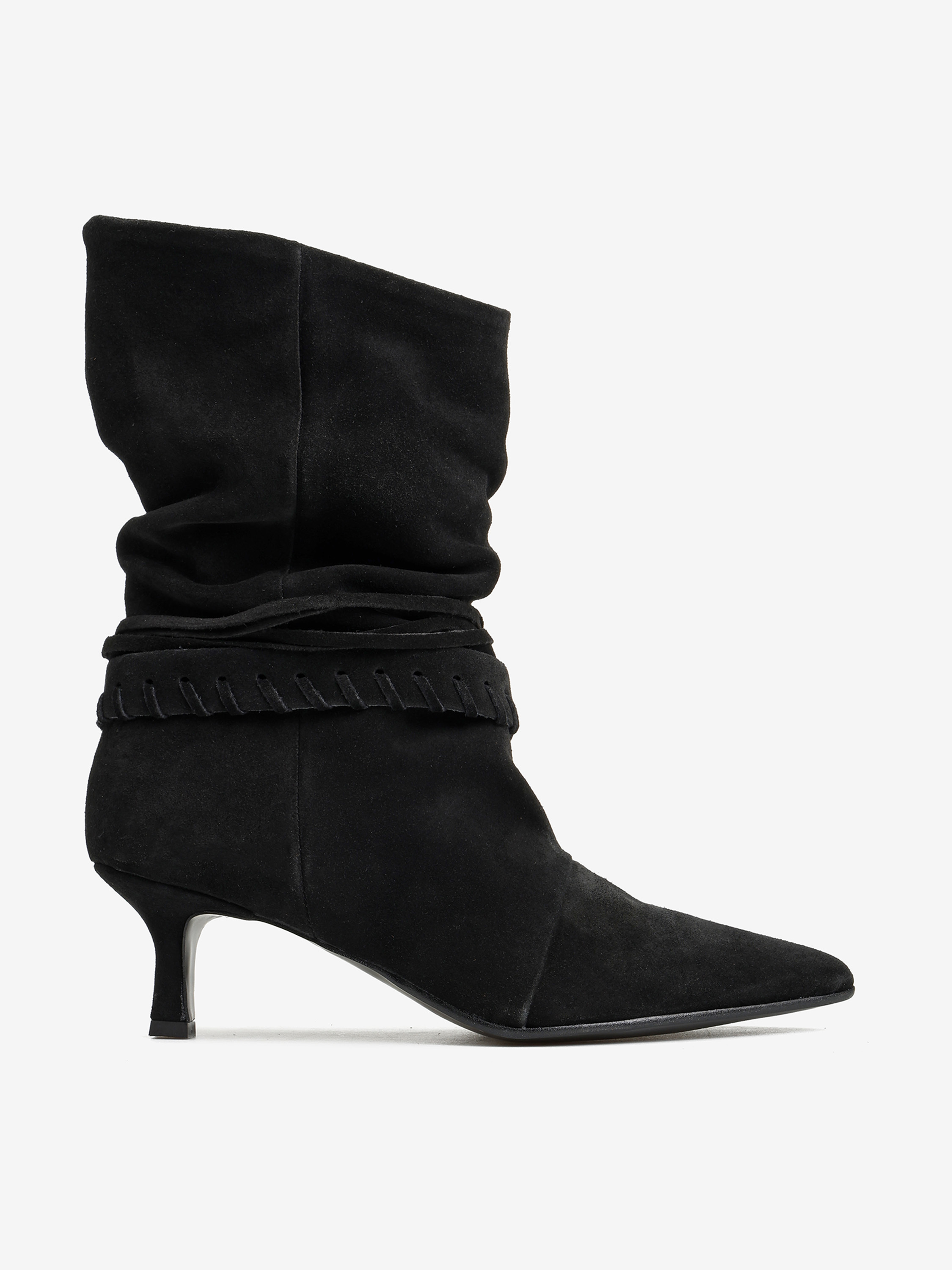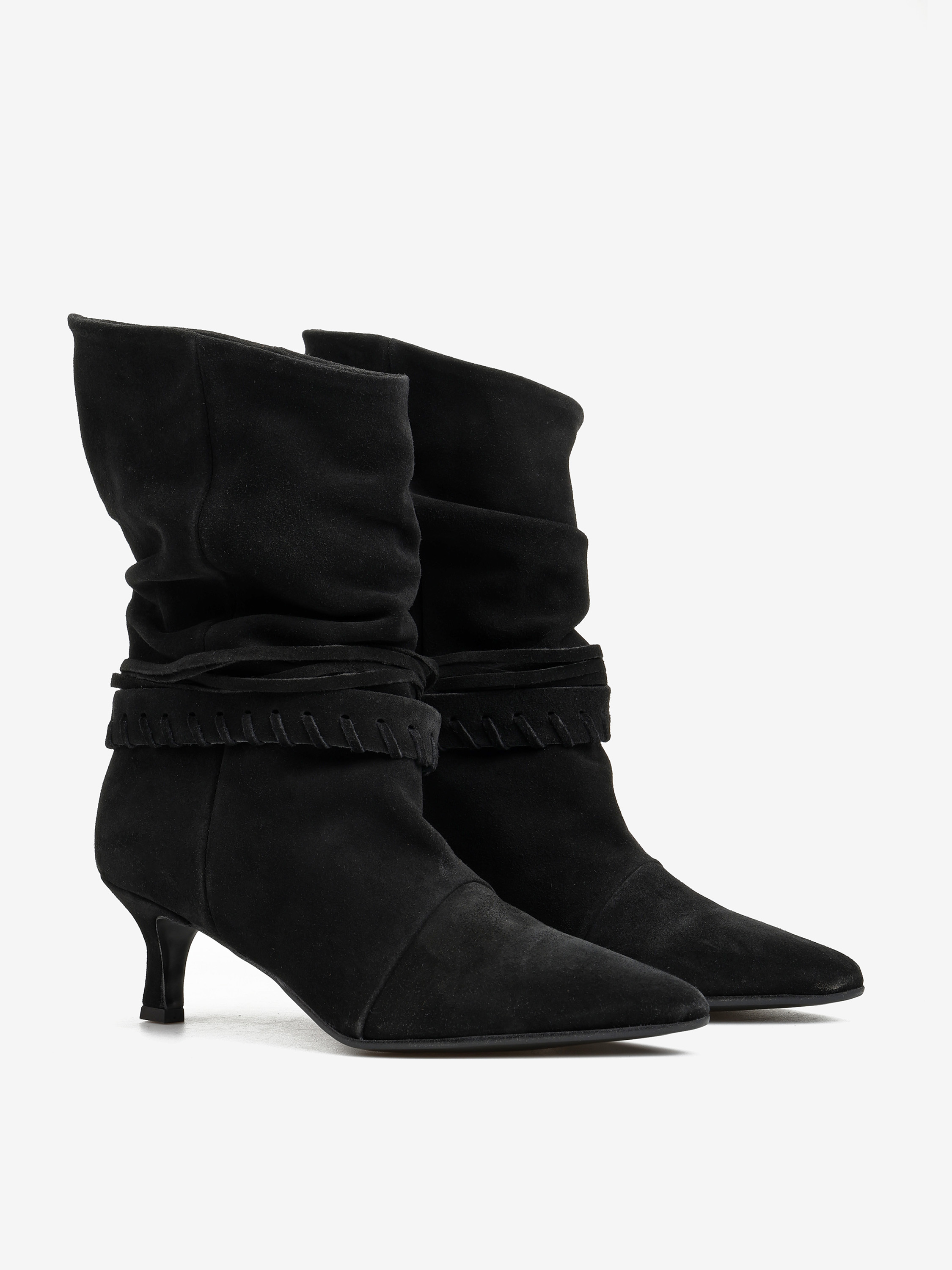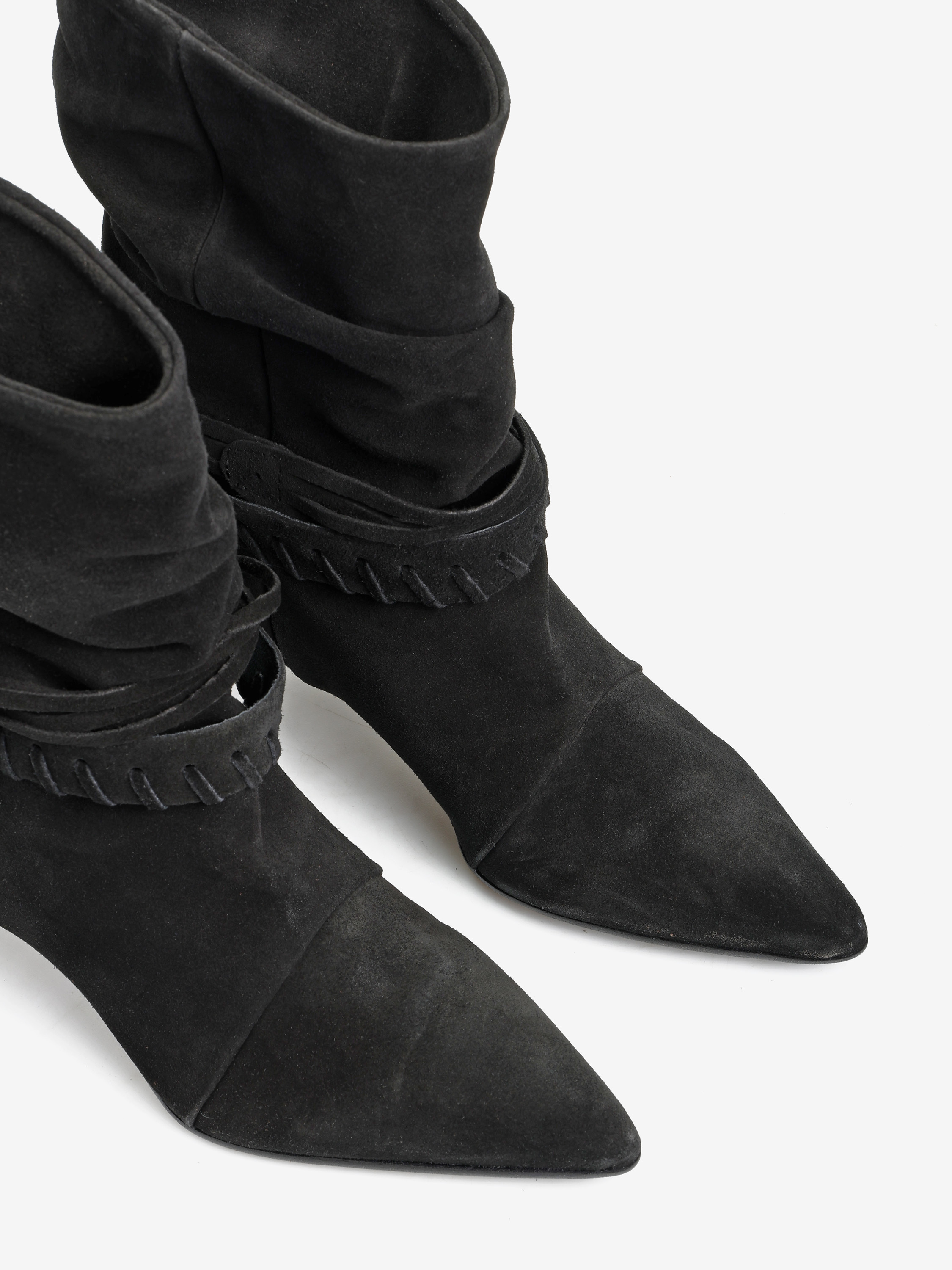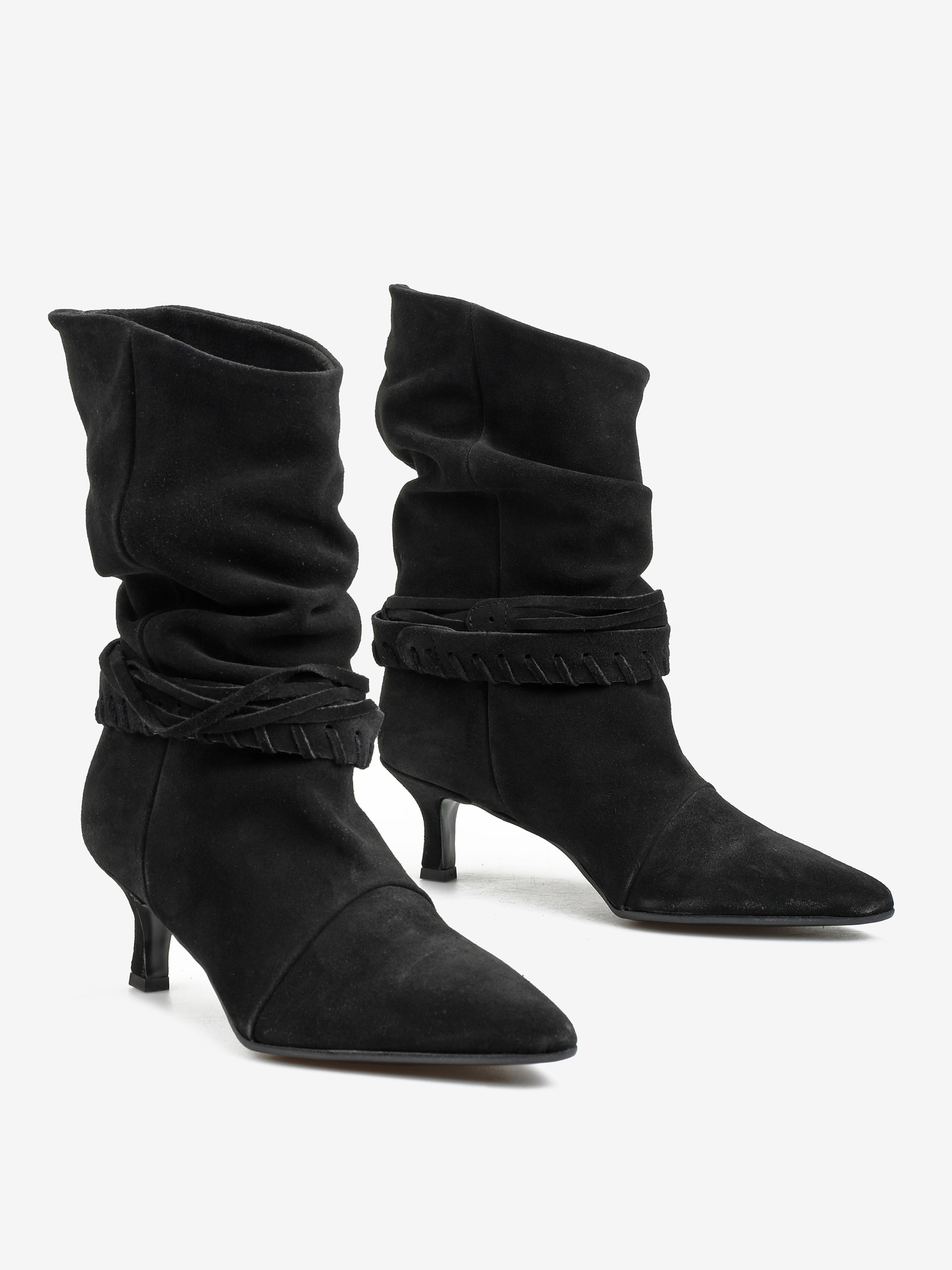 Zamszowe botki na szpilce. Noski w szpic i marszczona cholewa z ozdobnymi paskami.