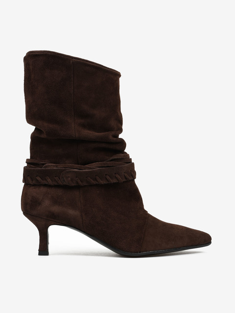 Zamszowe botki na szpilce. Noski w szpic i marszczona cholewa z ozdobnymi paskami.