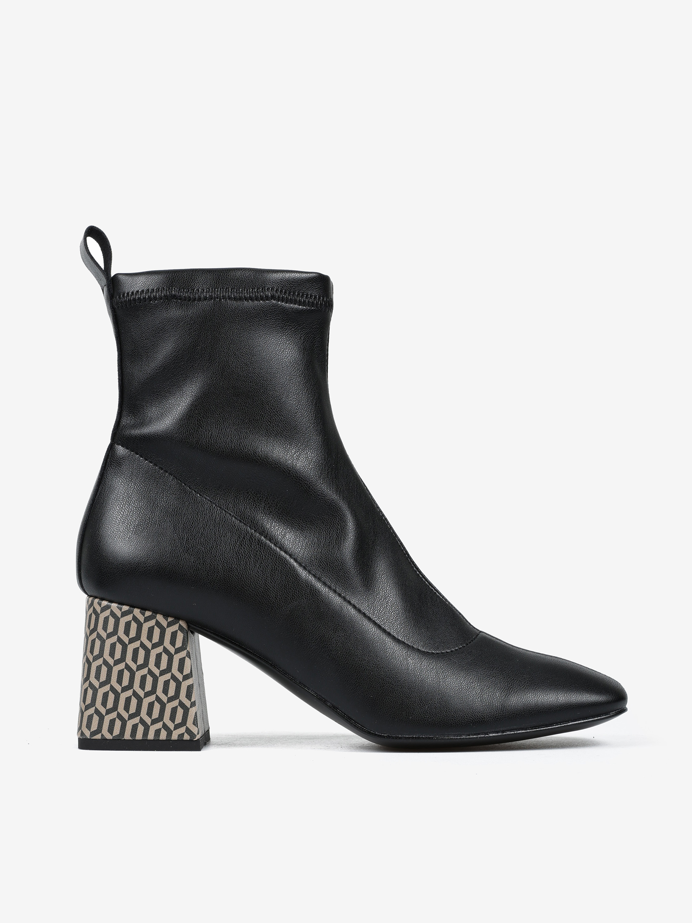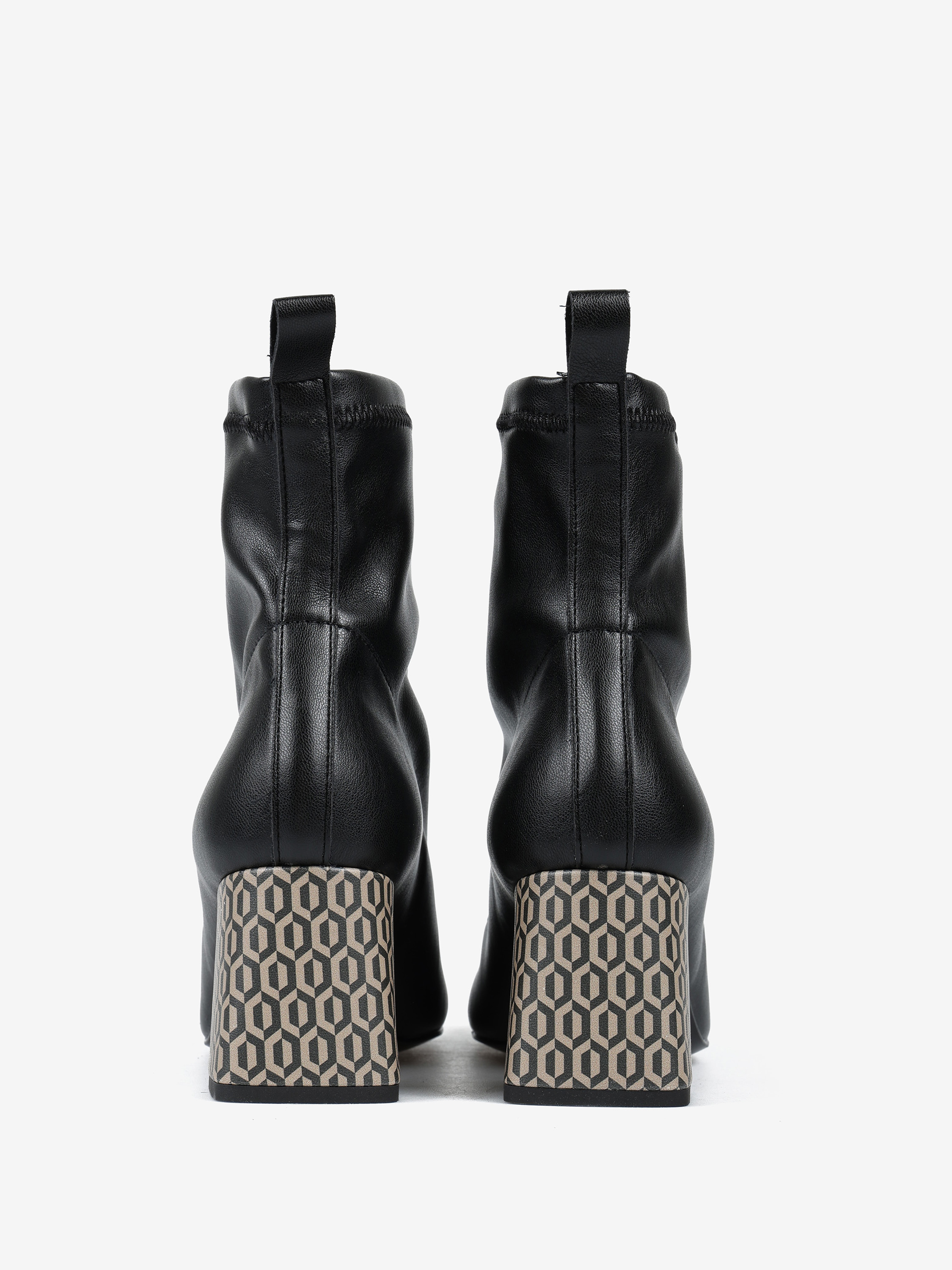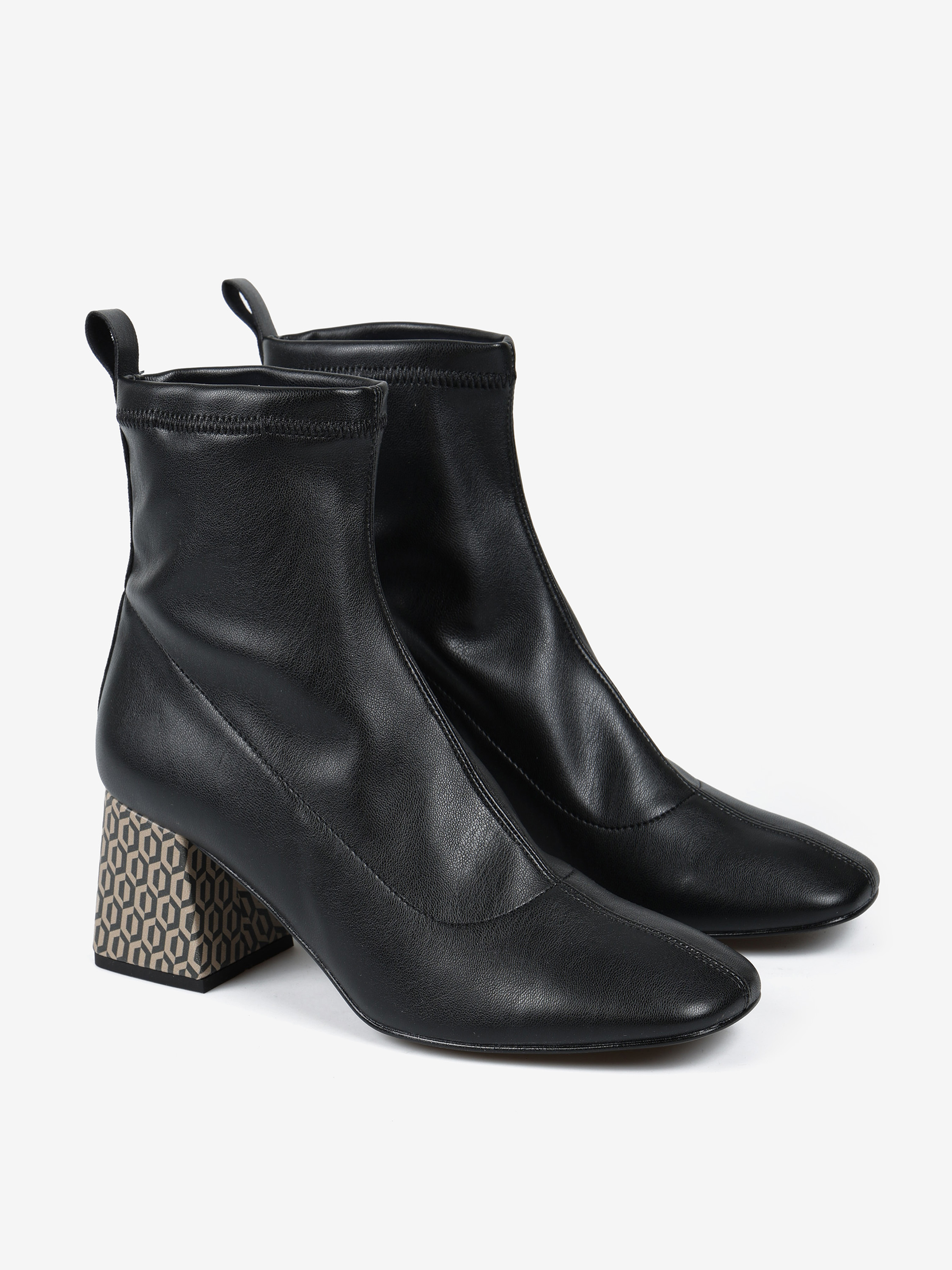 Wsuwane botki z kwadratowymi noskami. Efektowny słupek w geometryczny wzór.