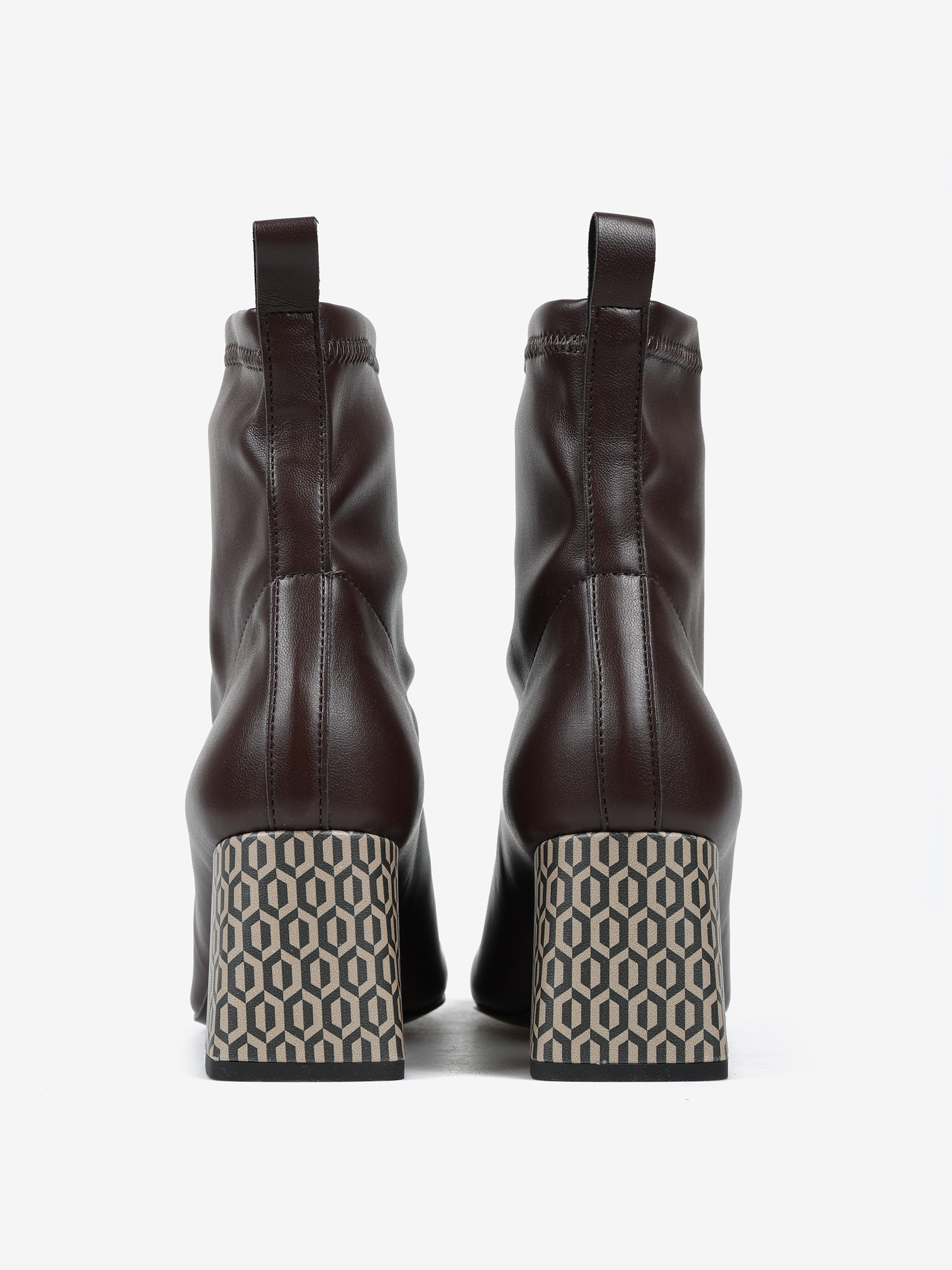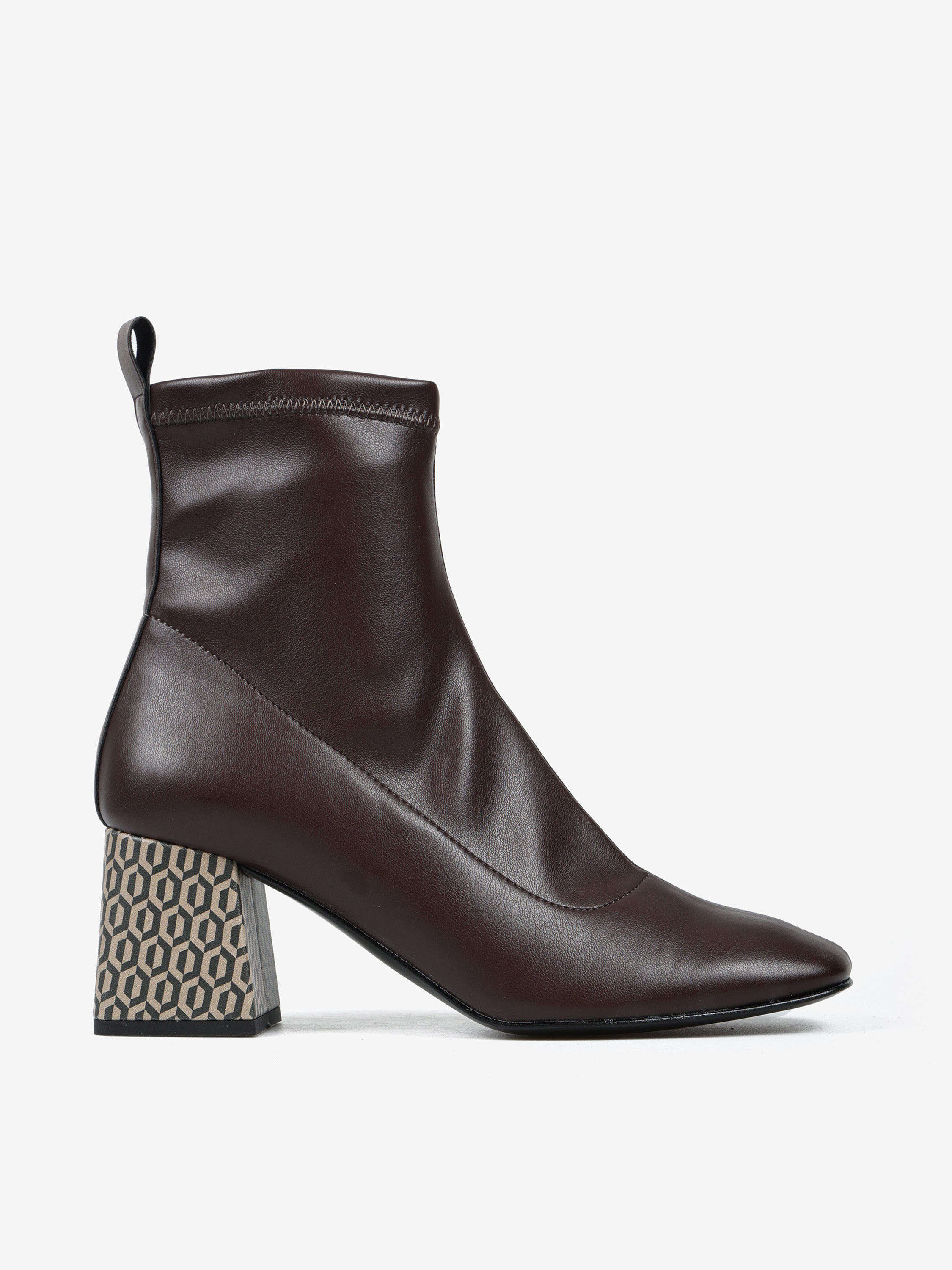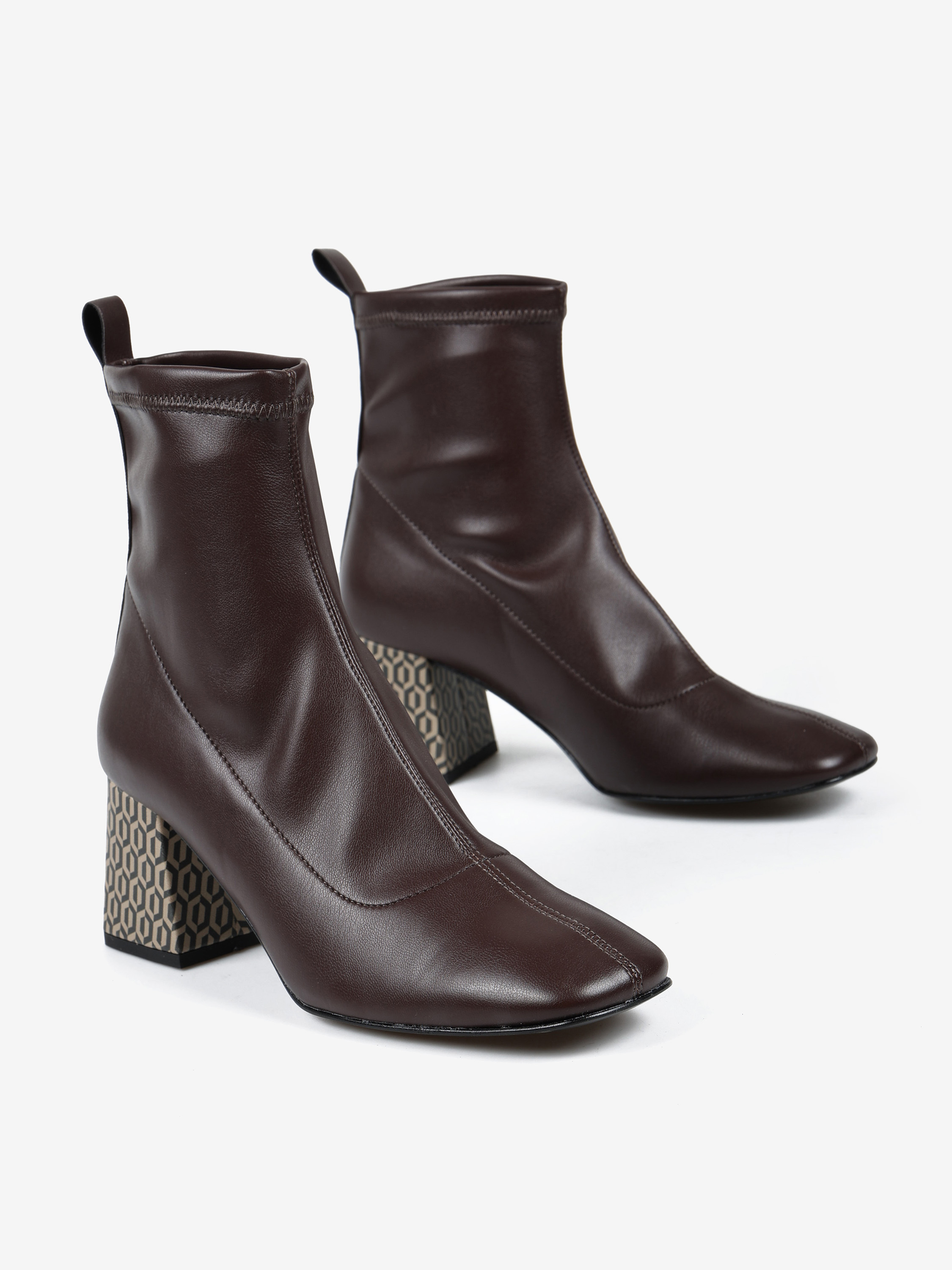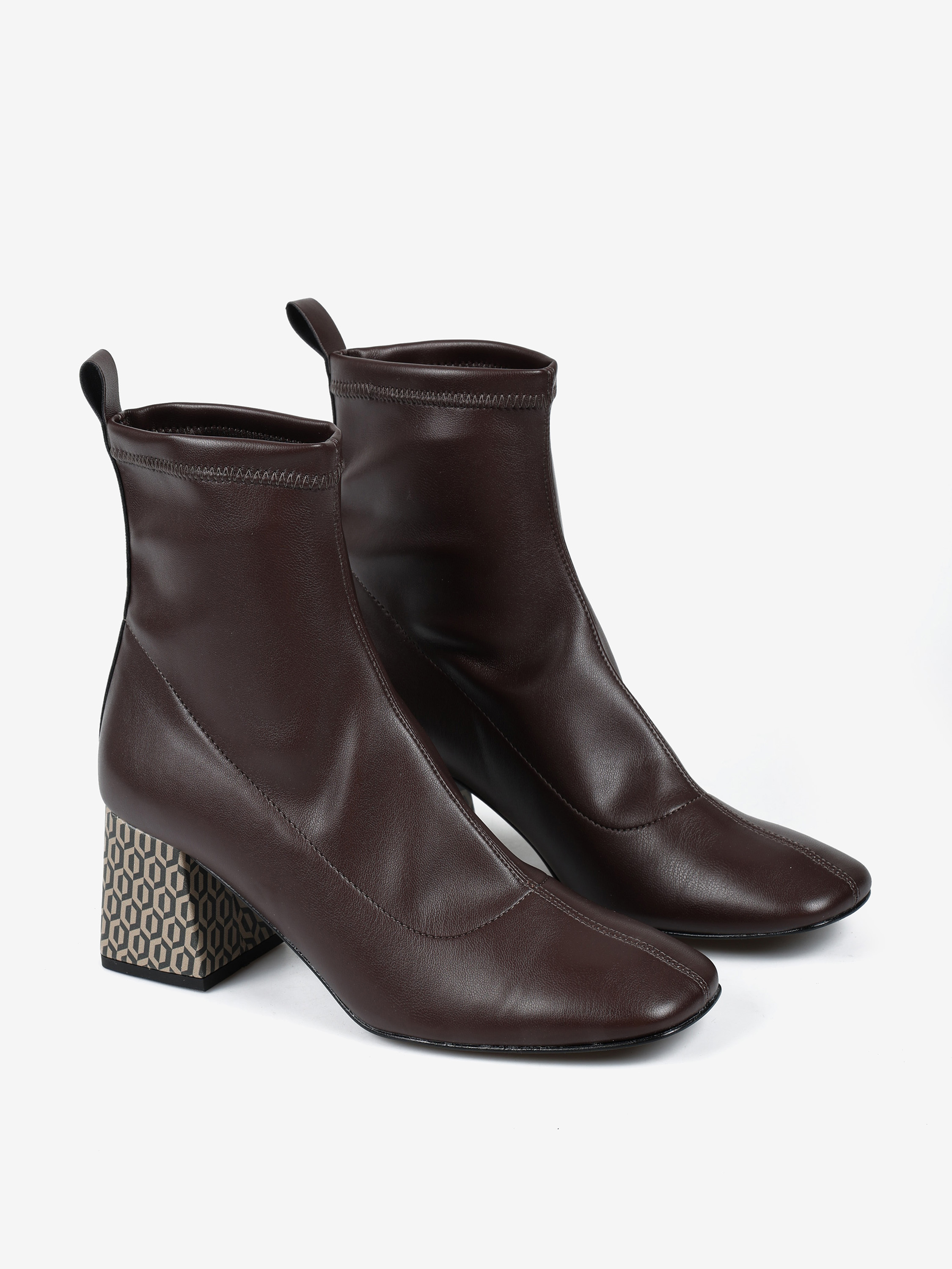 Wsuwane botki z kwadratowymi noskami. Efektowny słupek w geometryczny wzór.