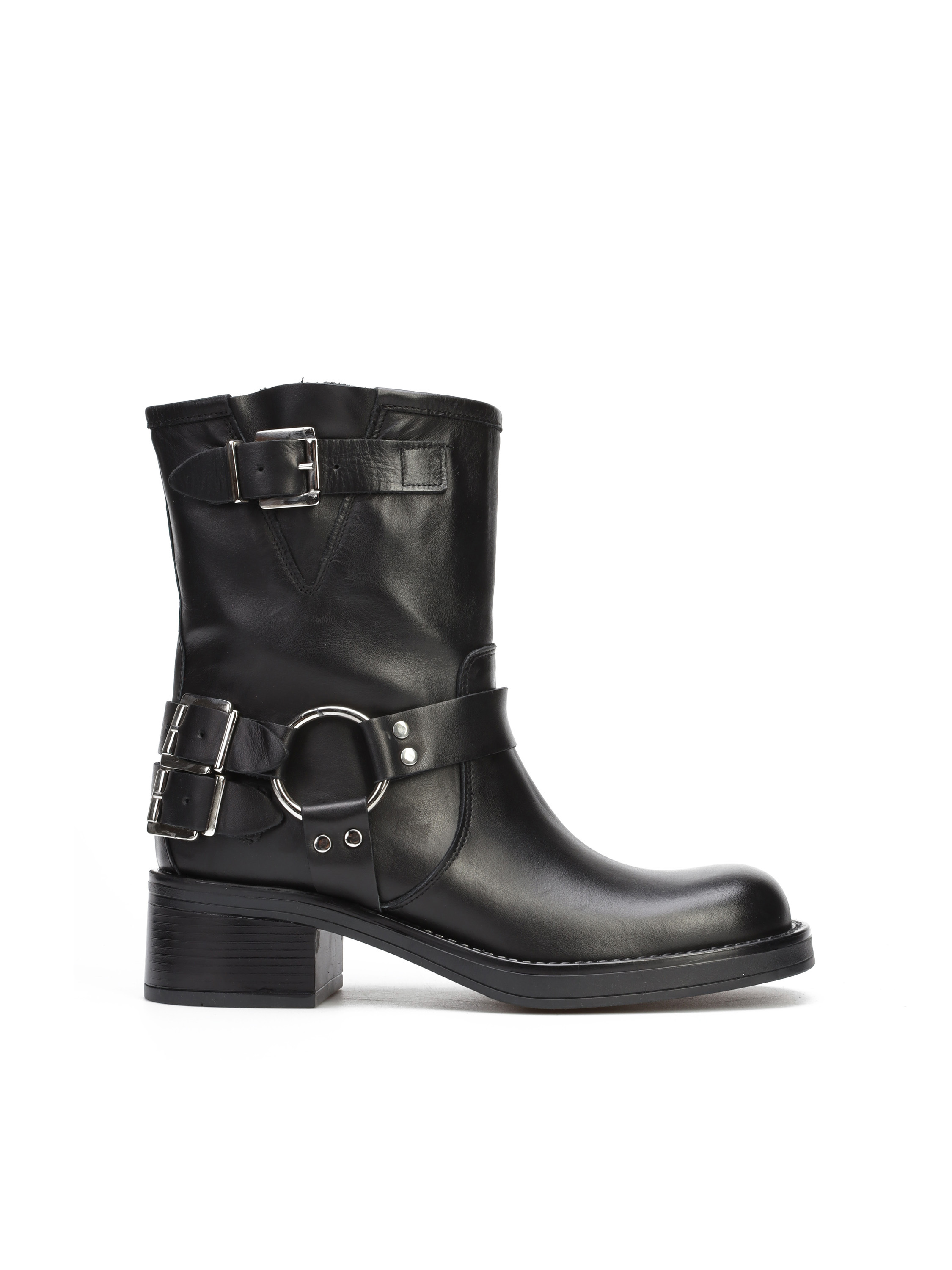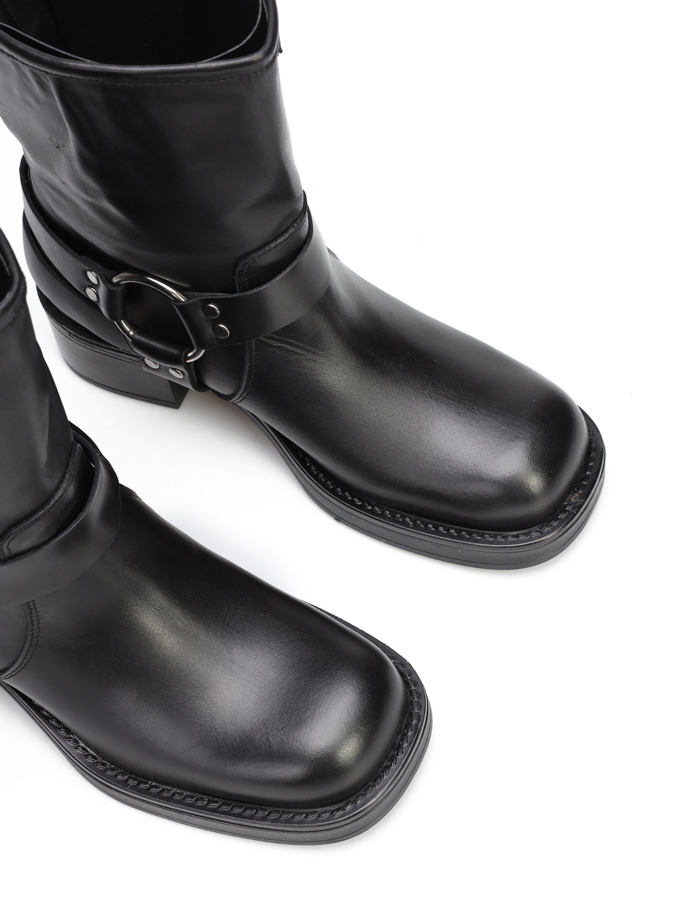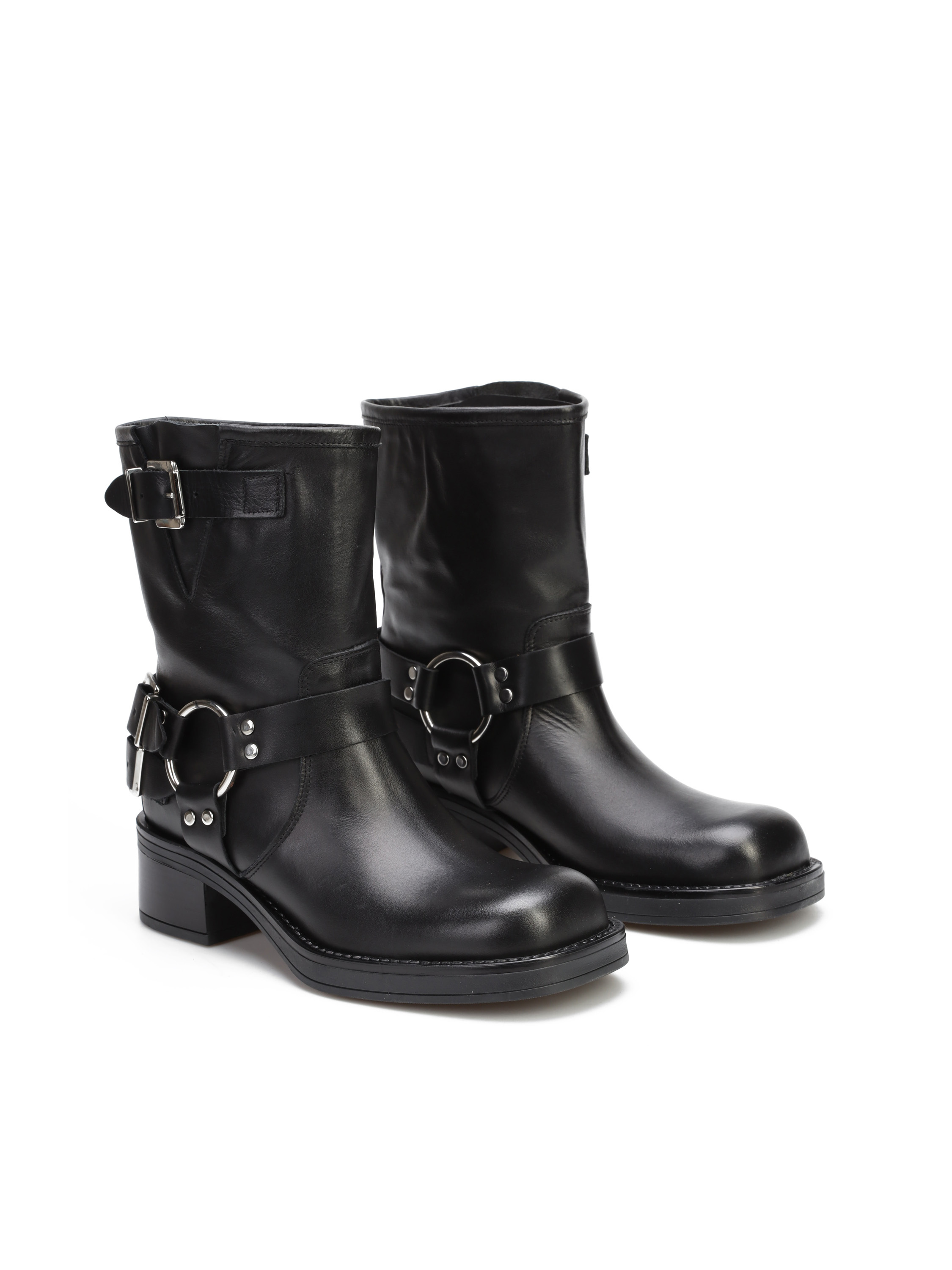 Wsuwane botki na słupku wykonane z naturalnej, włoskiej skóry. Klasyczny fason w czarnym kolorze posiada skórzane, regulowane paski wykończone srebrną klamrą. Model z kwadratowym noskiem i wystającą poza obrys buta podeszwą. Must have sezonu.